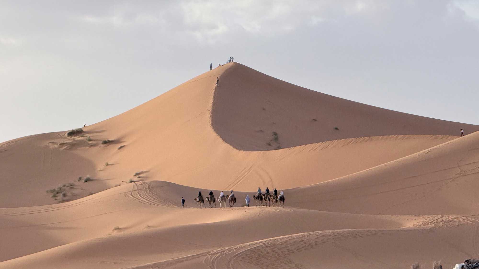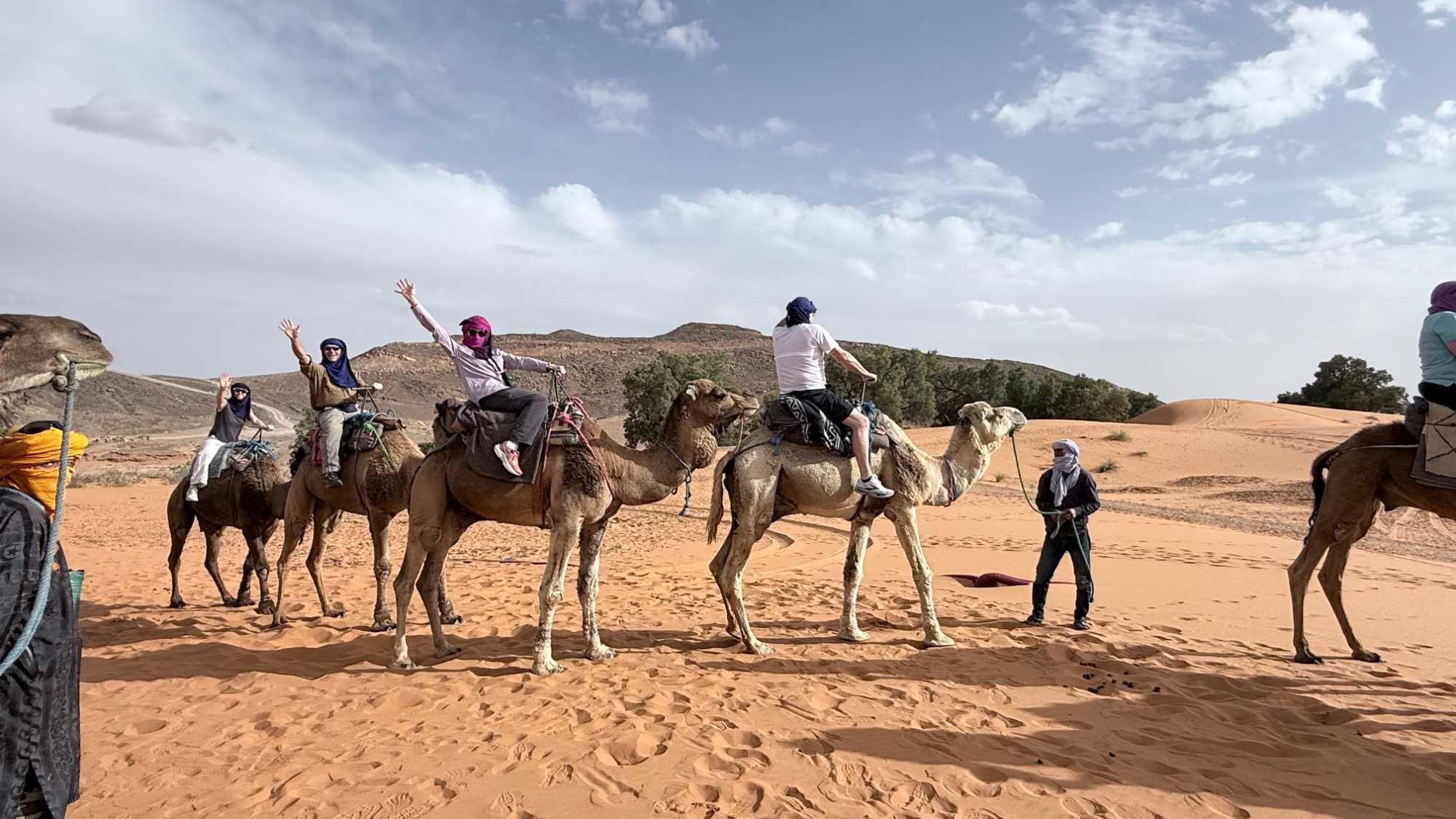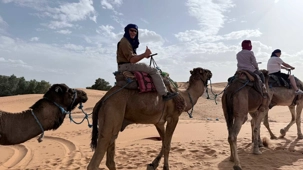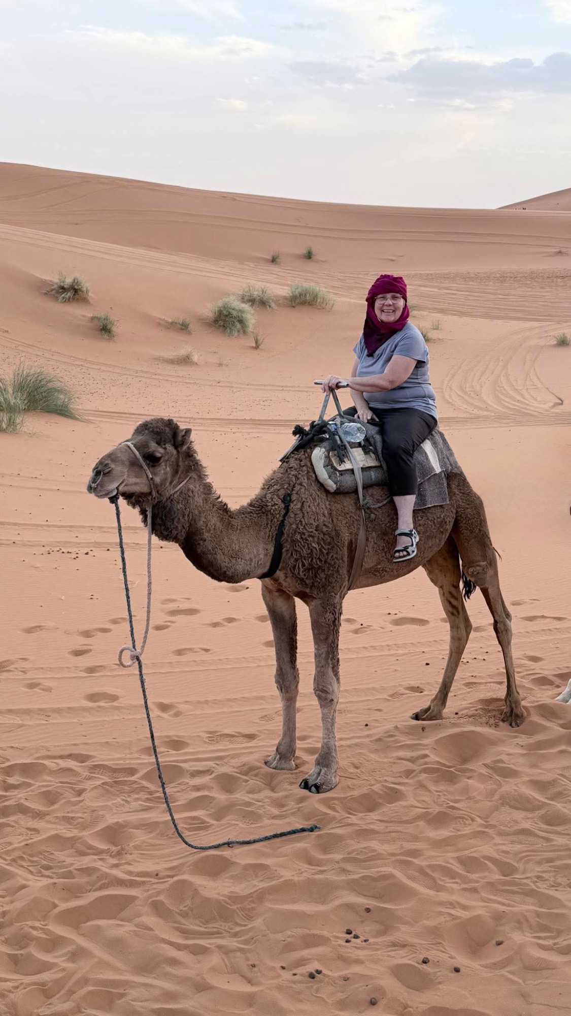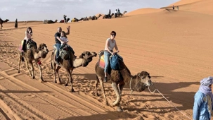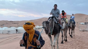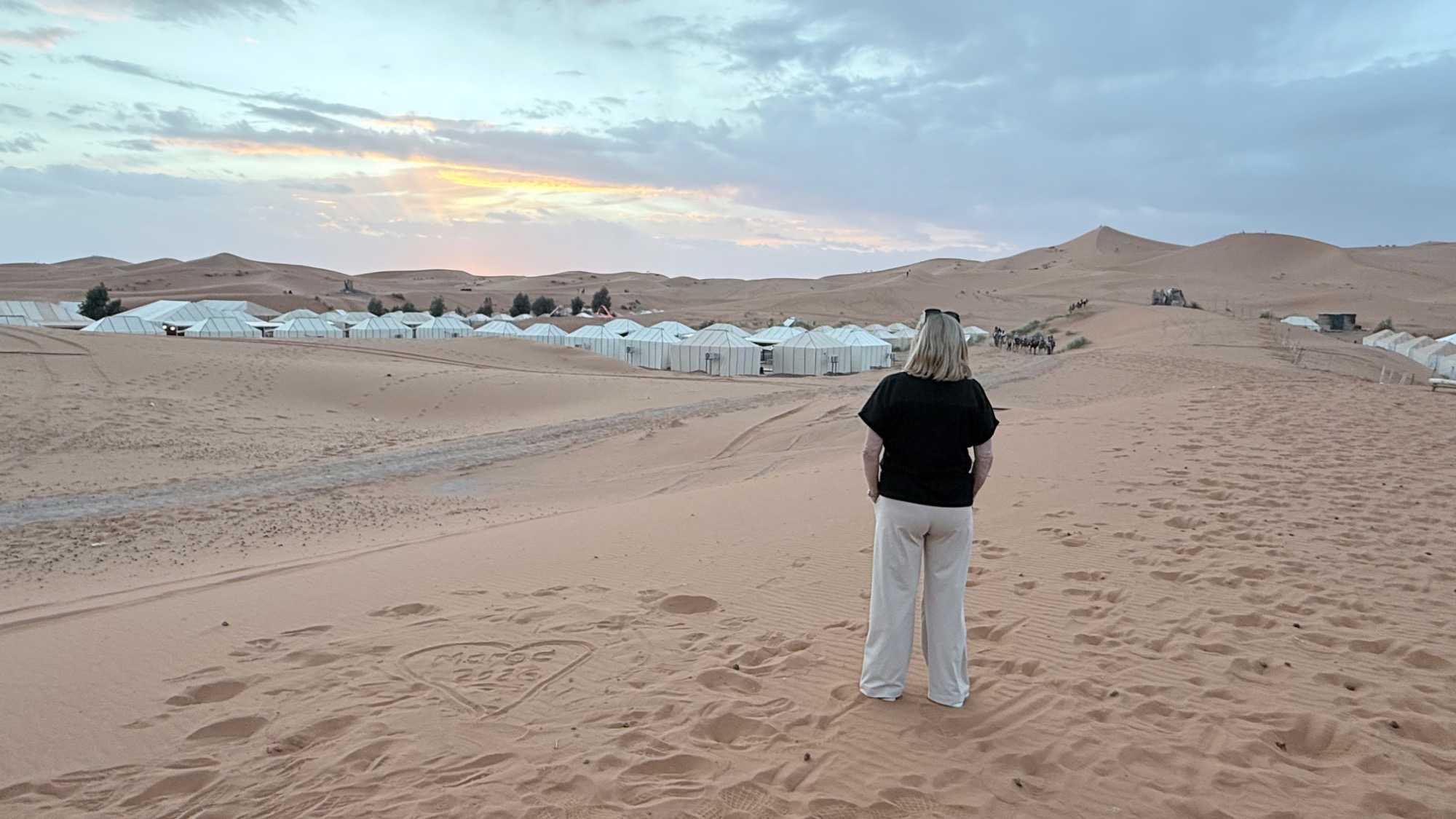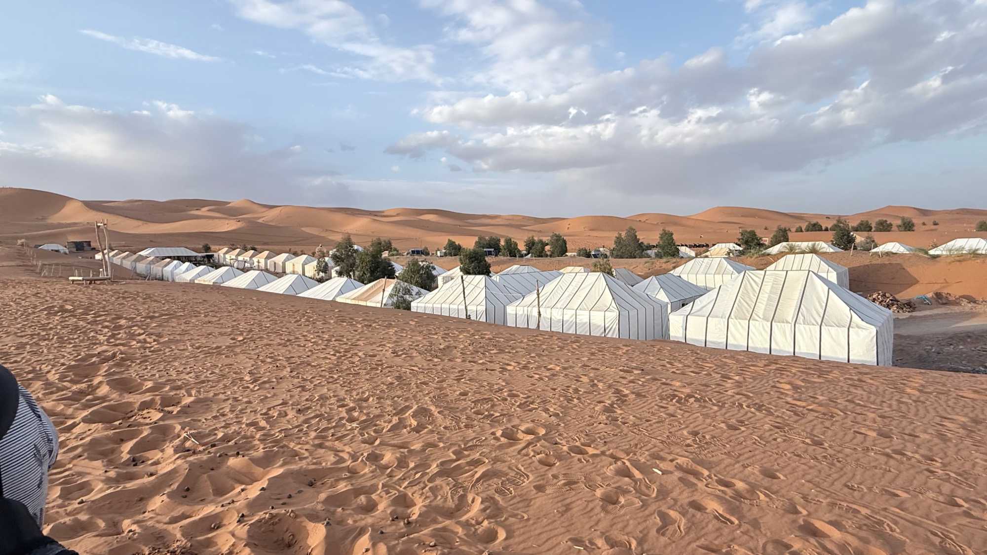À notre arrivée aux bivouacs, à peine le temps de nous installer que certains sont repartis, bercés par le pas lent des dromadaires, à la rencontre du soleil couchant au sommet des dunes. Ce soir-là, le ciel, légèrement voilé, a dessiné un coucher de soleil différent… plus discret, plus intime, comme un secret murmuré à l’horizon.