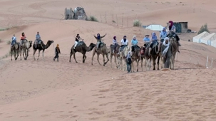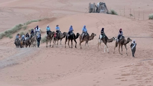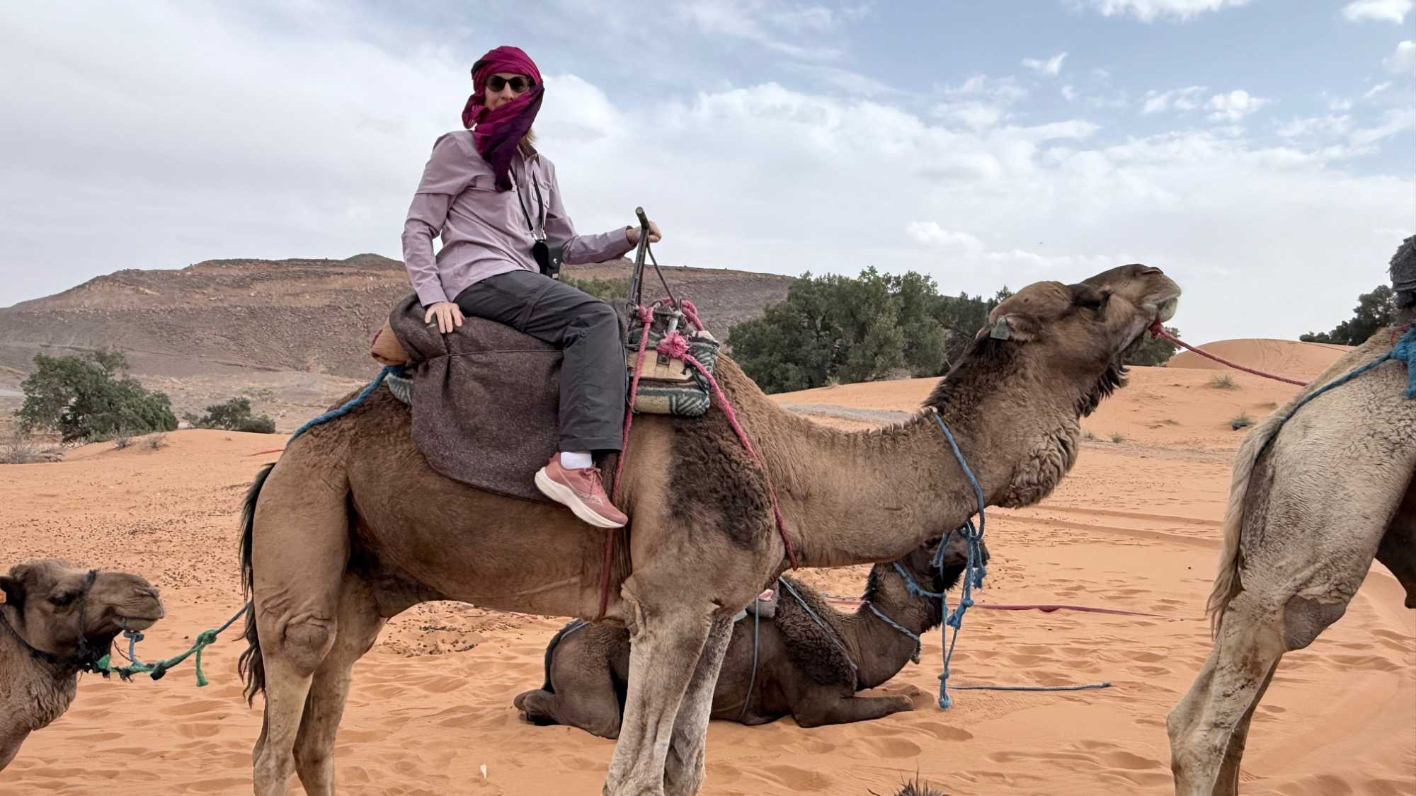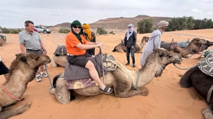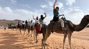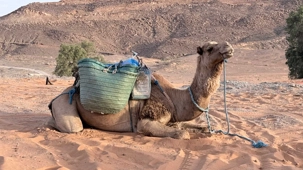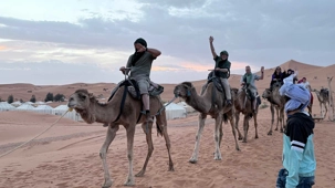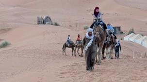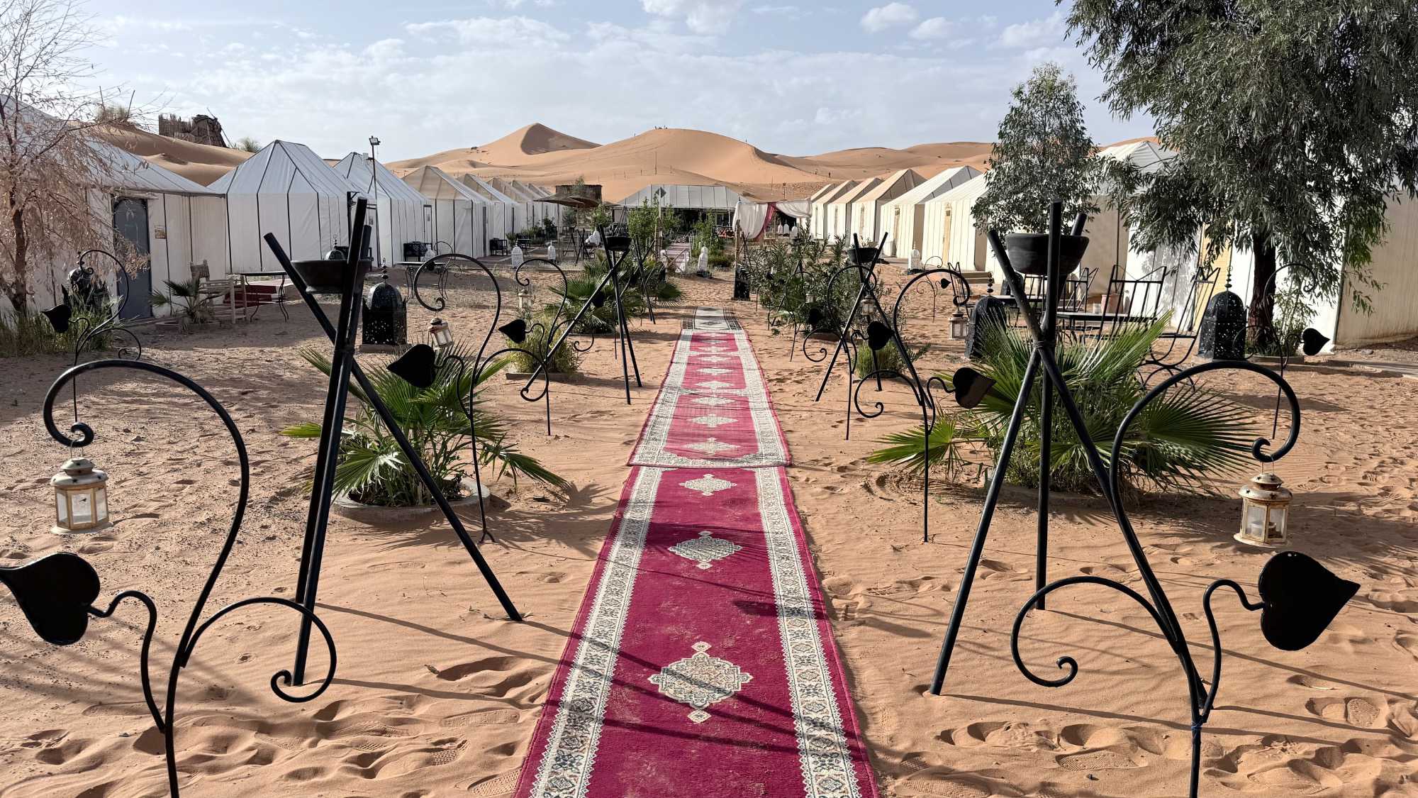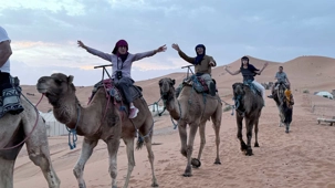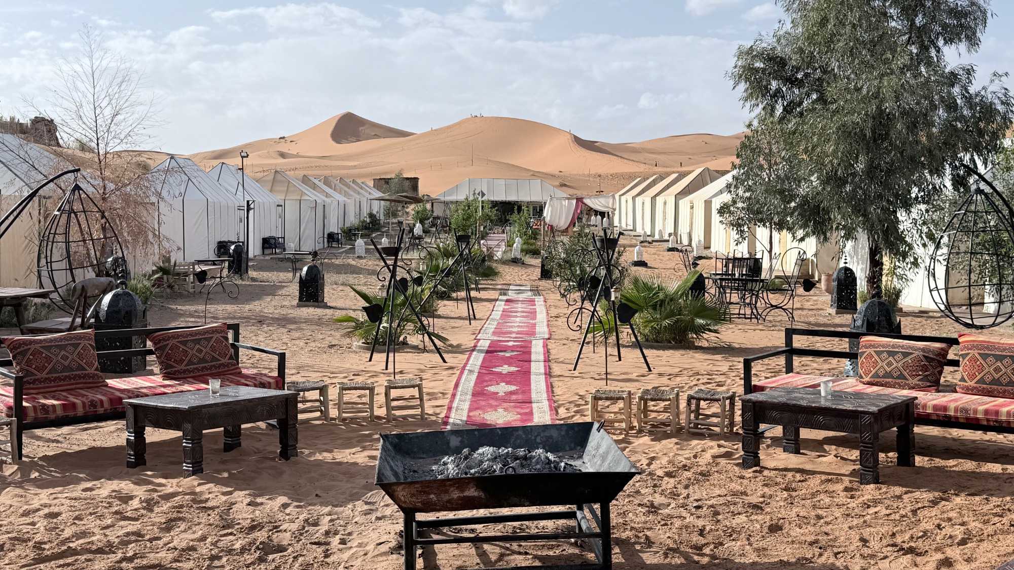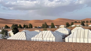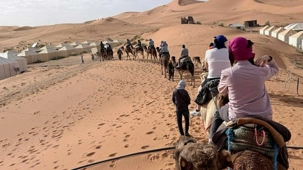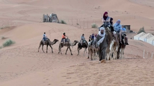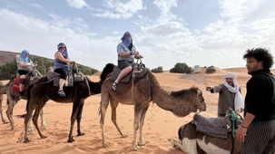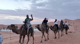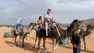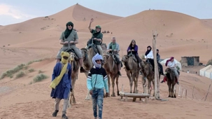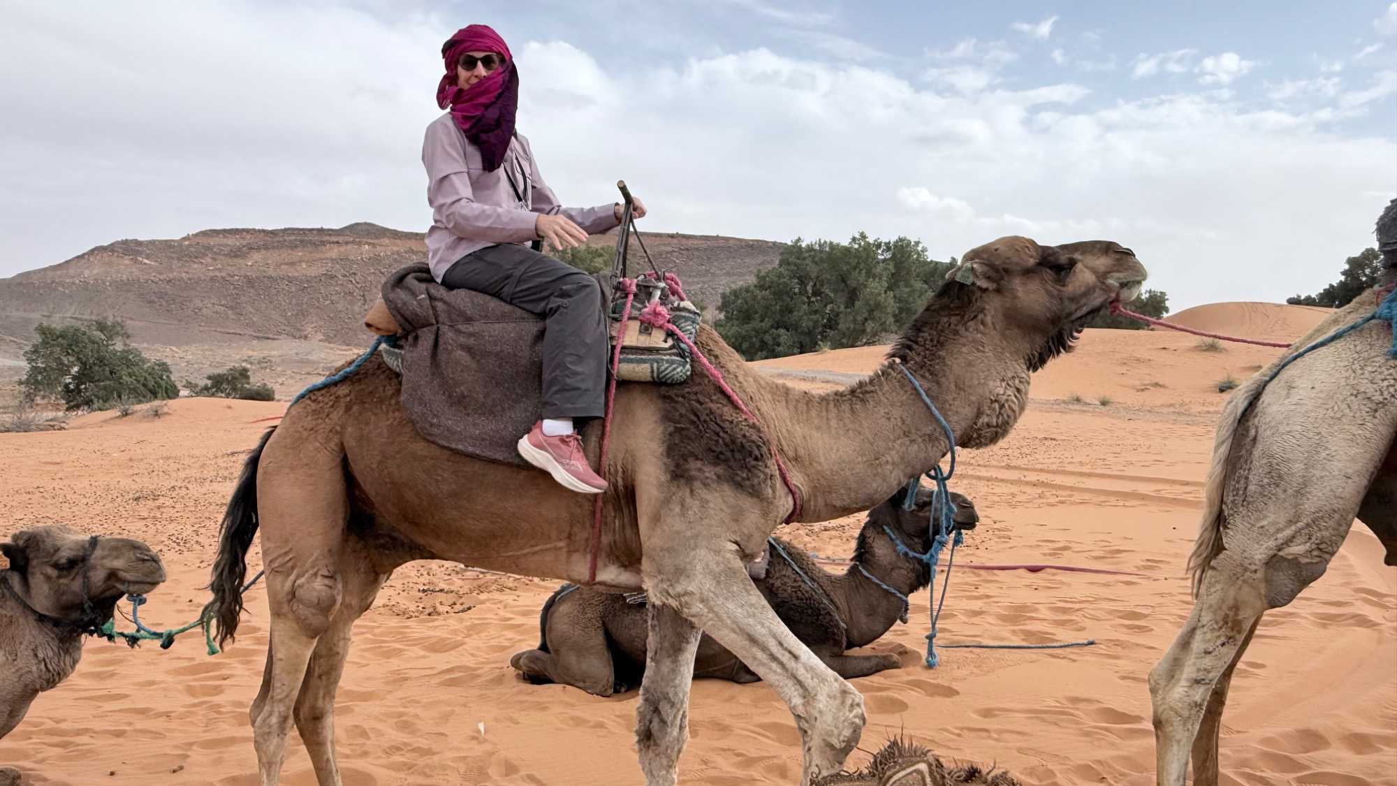 À notre arrivée aux bivouacs, à peine le temps de nous installer que certains sont repartis, bercés par le pas lent des dromadaires, à la rencontre du soleil couchant au sommet des dunes. Ce soir-là, le ciel, légèrement voilé, a dessiné un coucher de soleil différent… plus discret, plus intime, comme un secret murmuré à l’horizon.