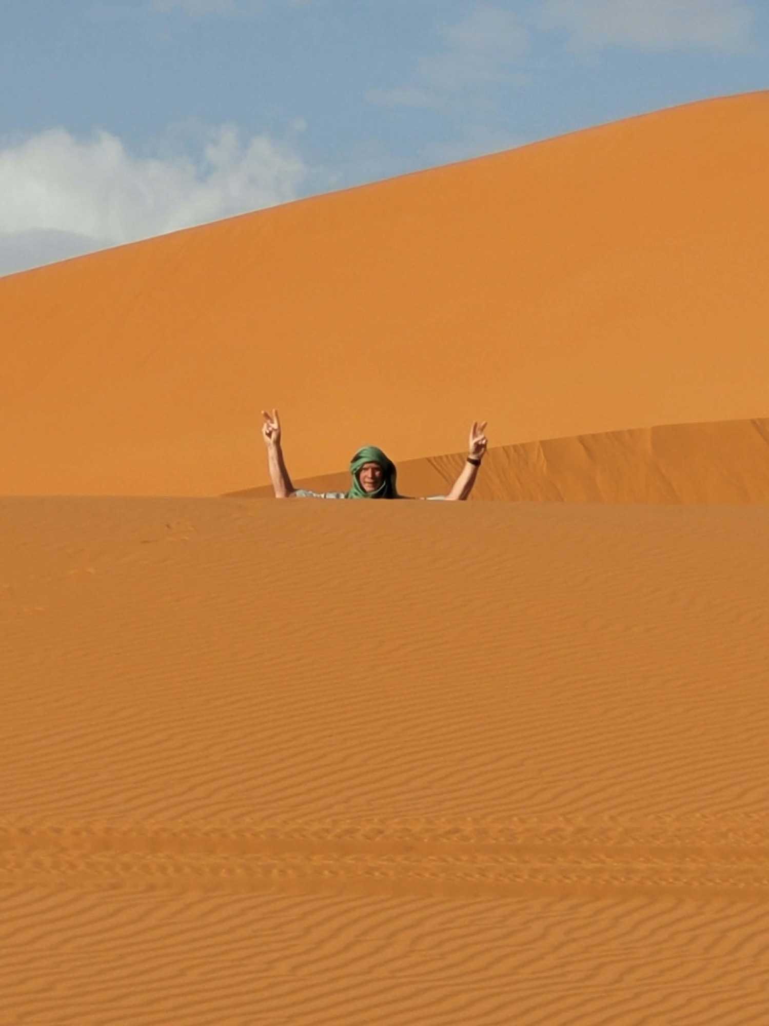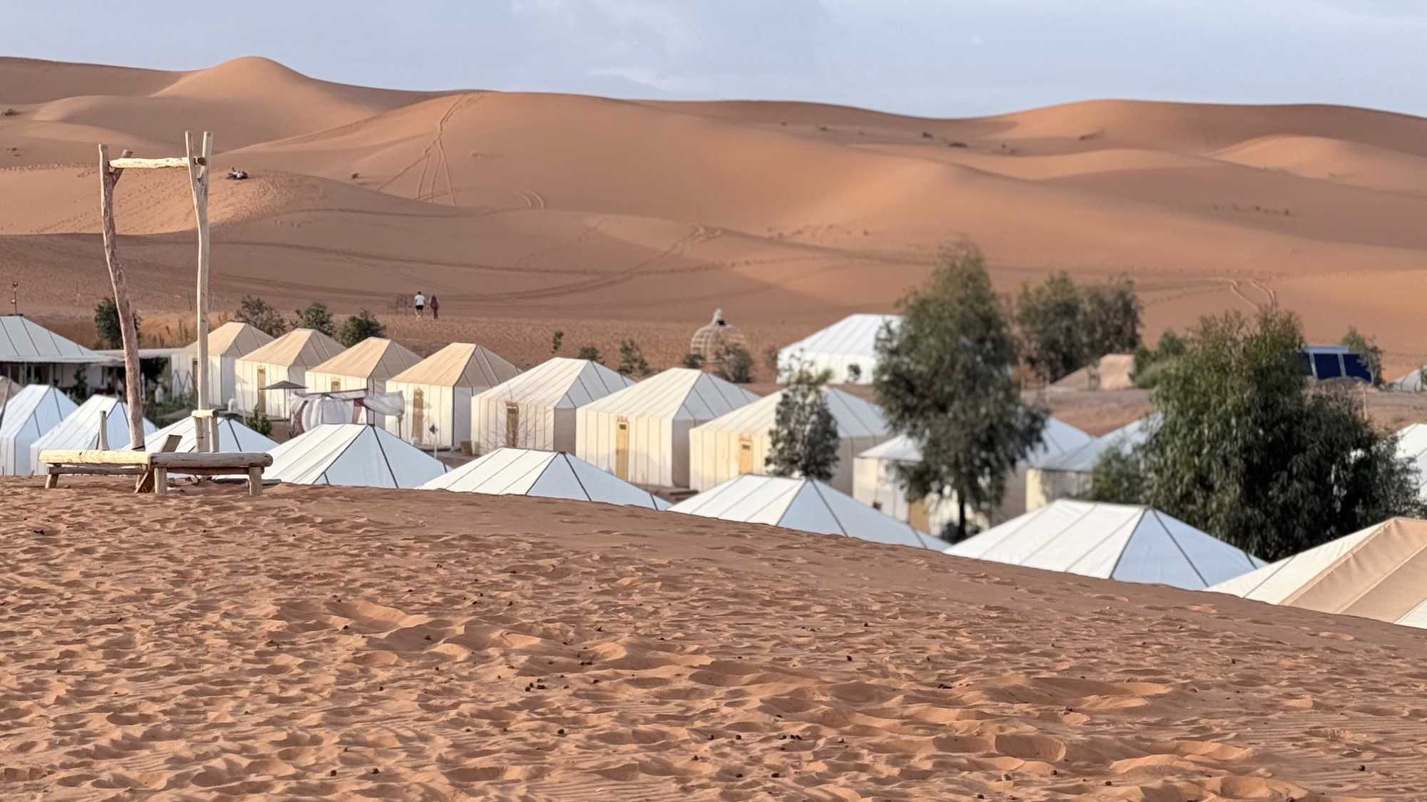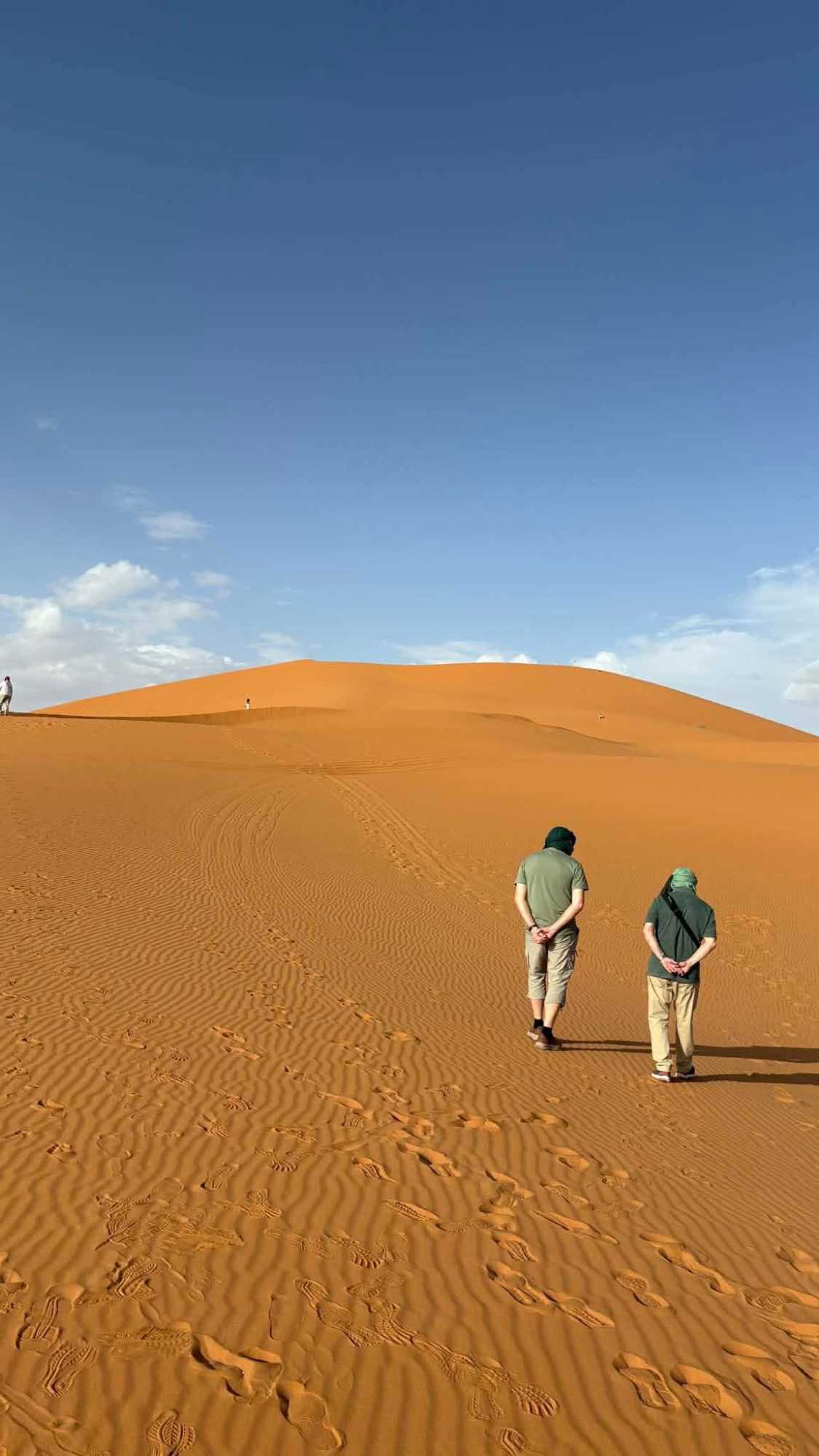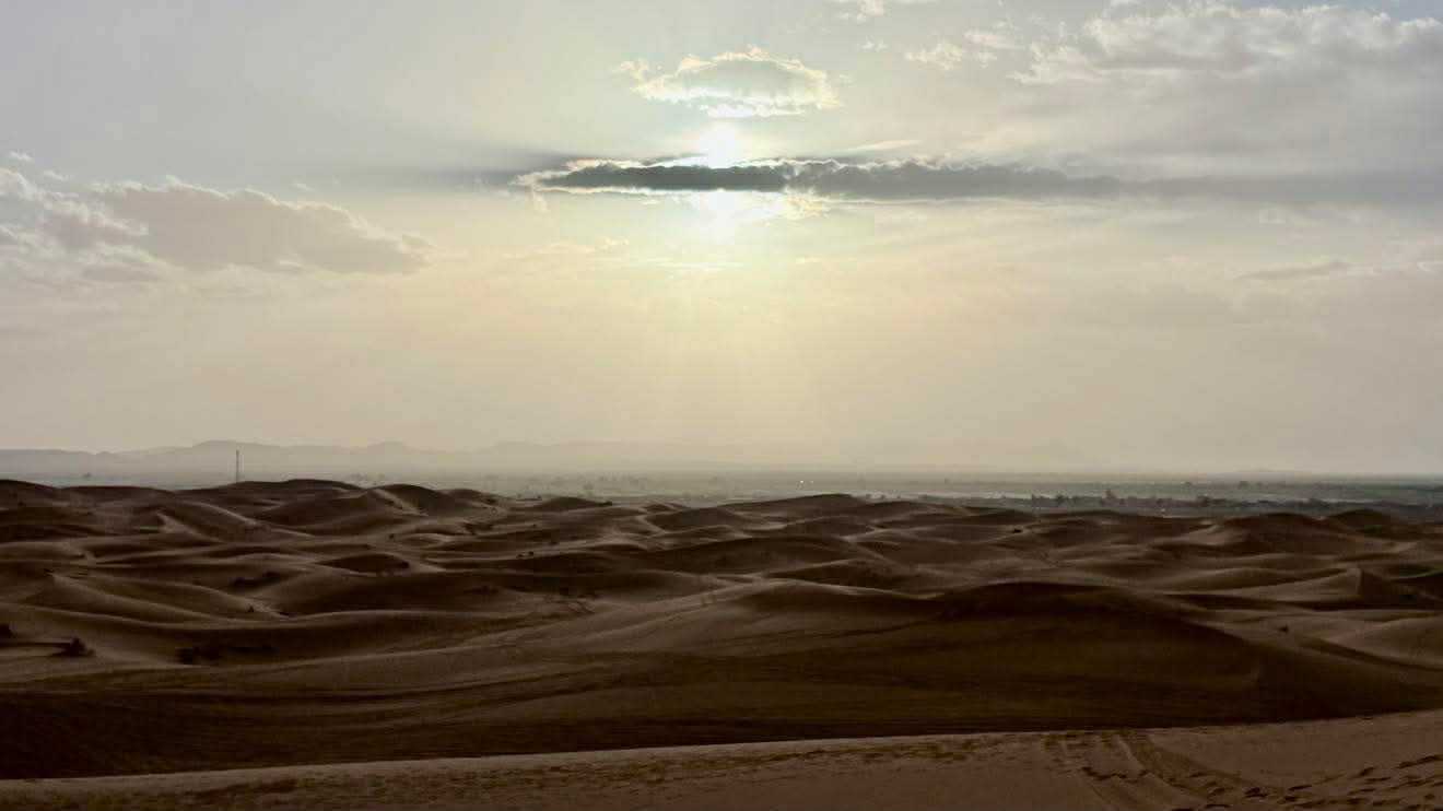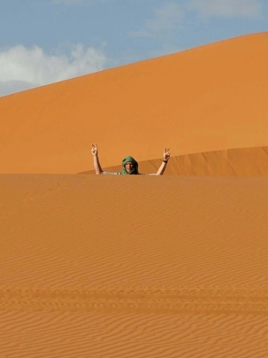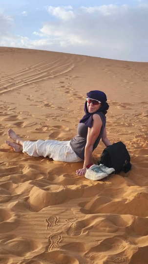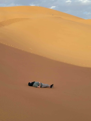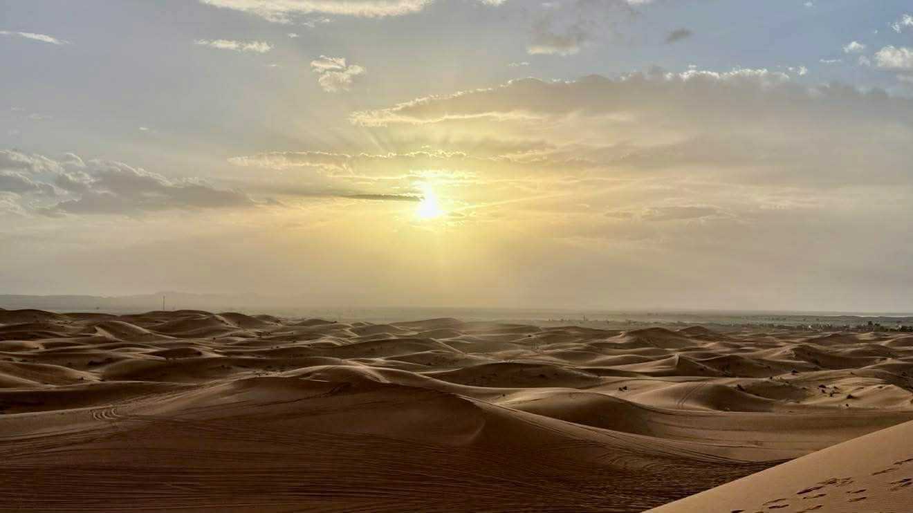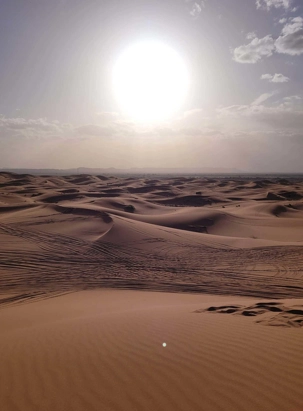 Puis la route nous a guidés jusqu’à Merzouga, où nous avons été accueillis avec chaleur pour le repas du midi. L’après-midi, baigné de soleil, nous a offert une parenthèse de douceur : les pieds dans l’eau, le corps au repos, l’esprit déjà tourné vers le désert.