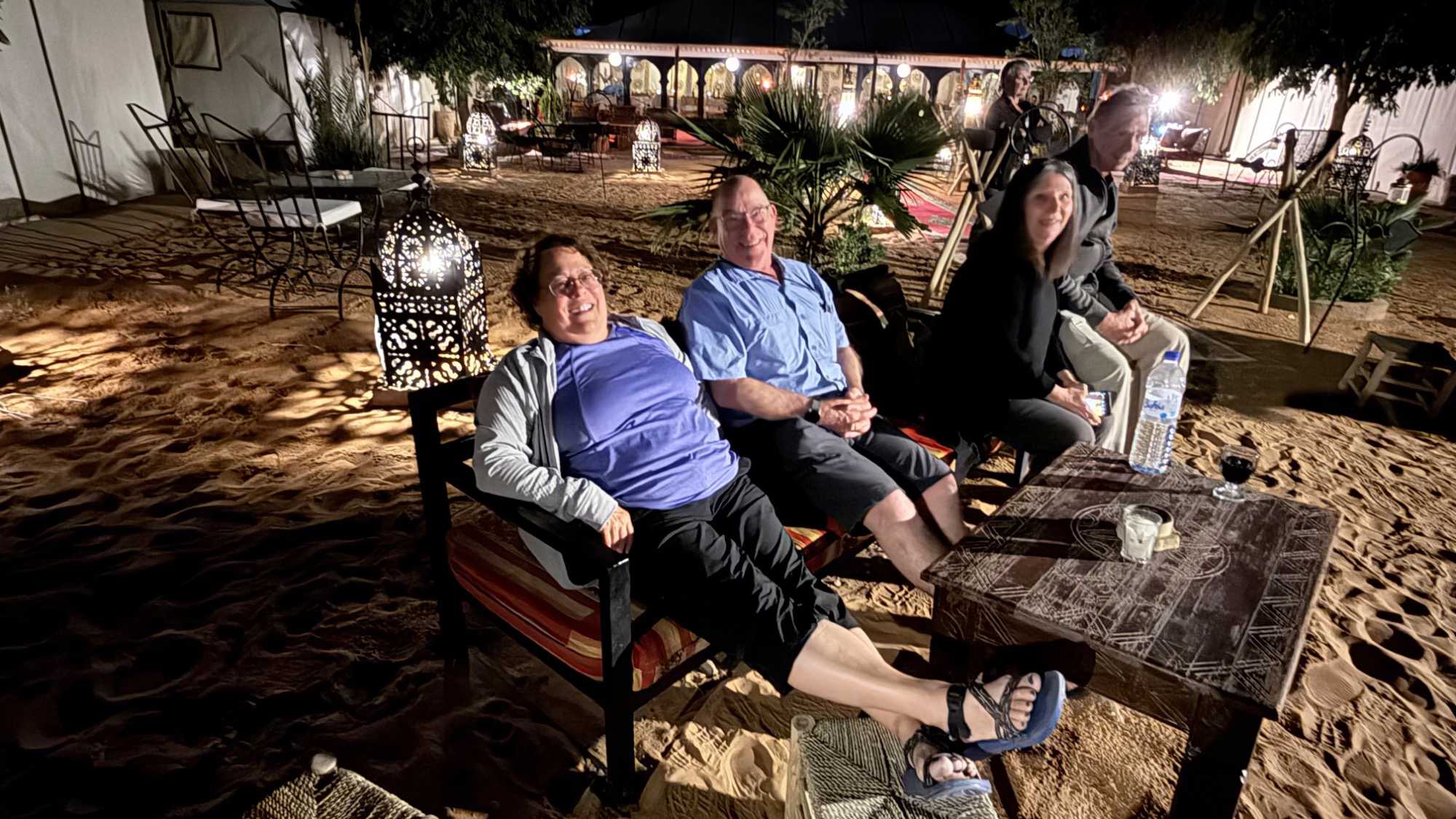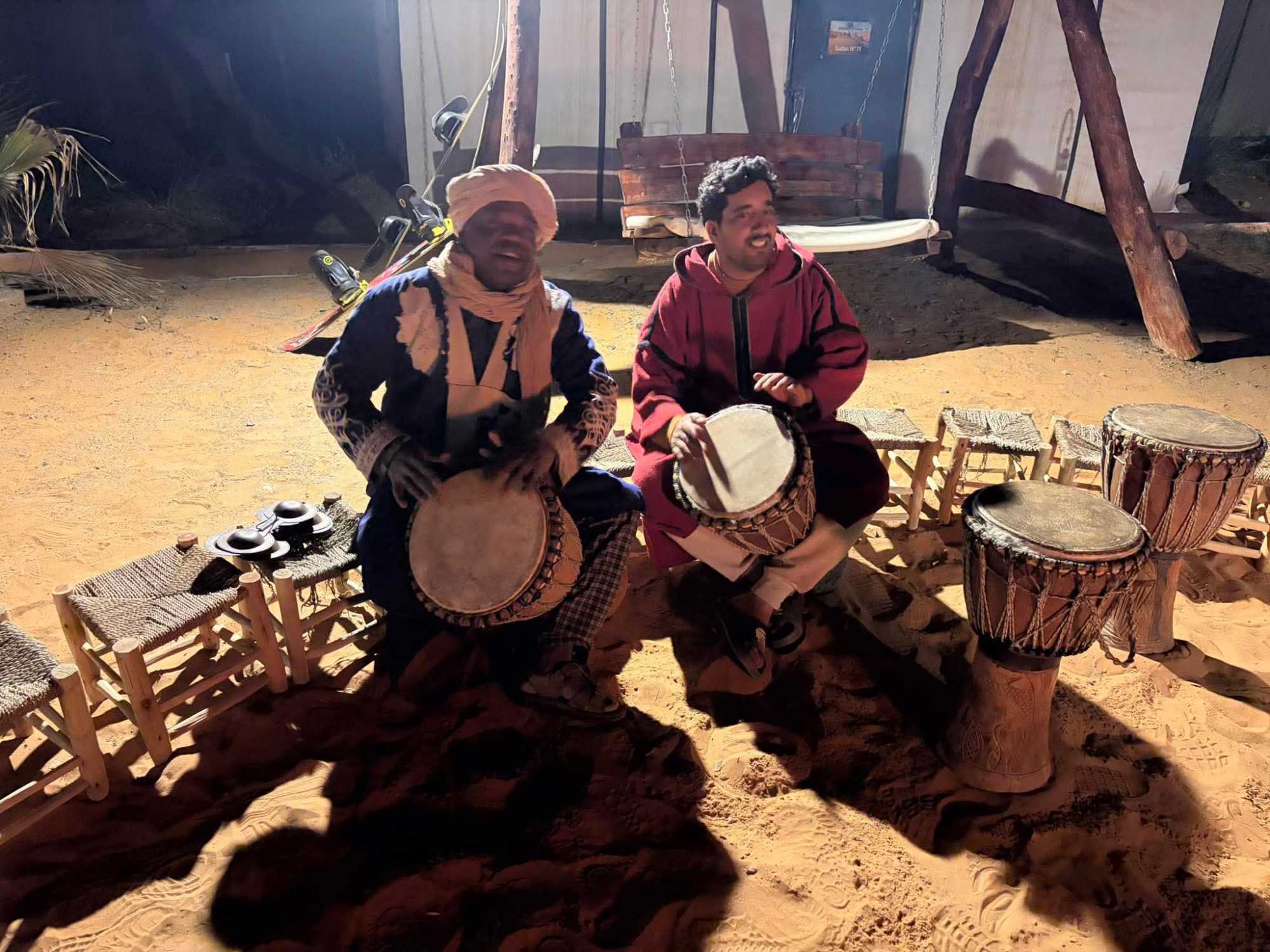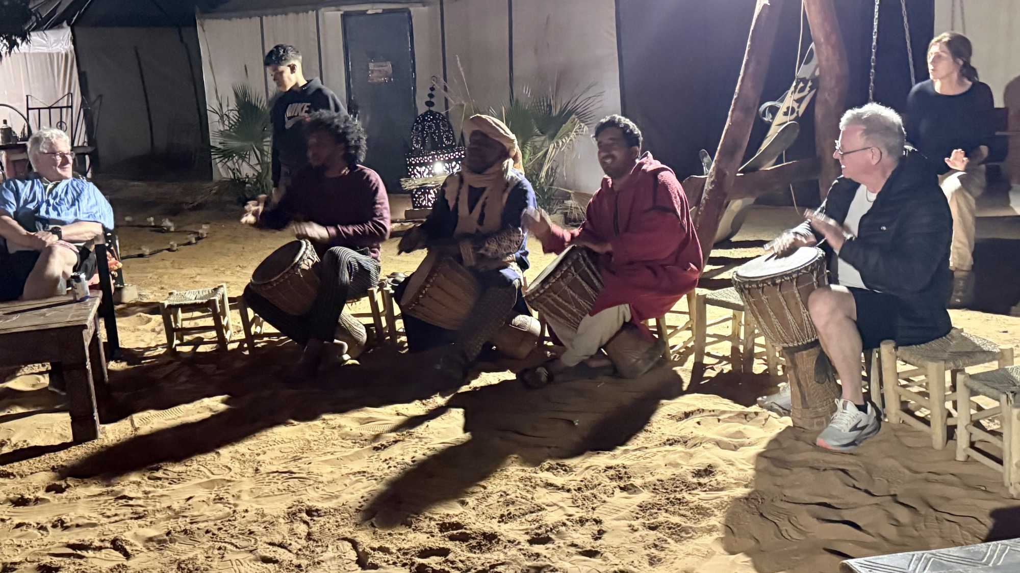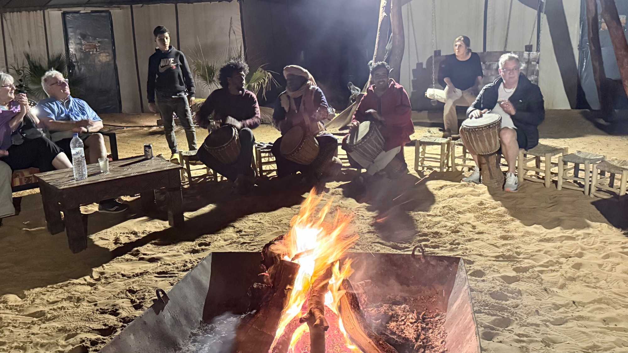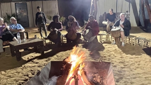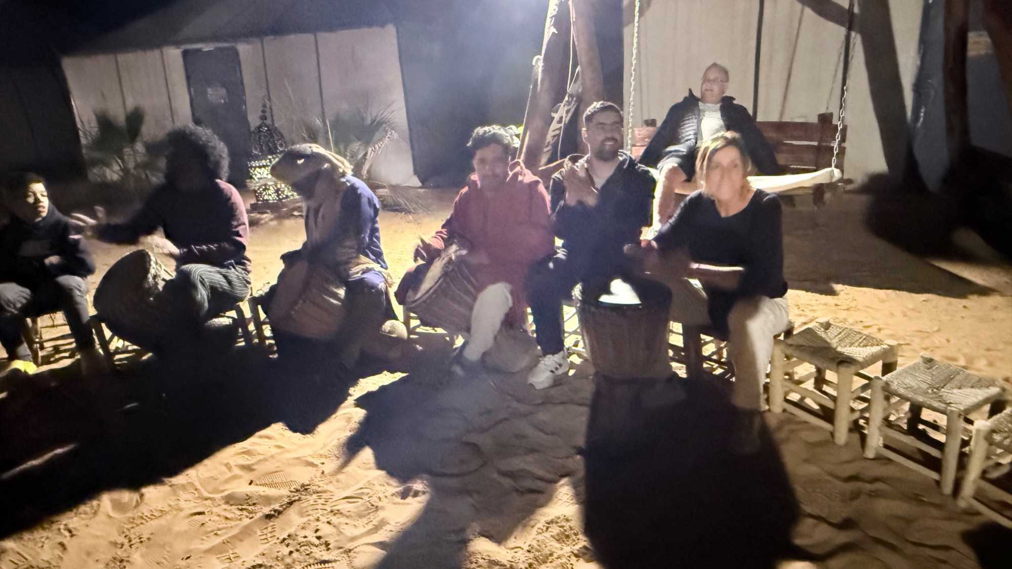 Puis vint le souper, festif et généreux, accompagné de vin également offert par Voyage Louise Drouin, ajoutant une touche conviviale à cette soirée déjà mémorable. La nuit s’est ensuite animée autour d’un feu de joie, où les rythmes berbères ont fait vibrer le désert. Les chants, les rires, les flammes dansantes… tout semblait hors du temps.