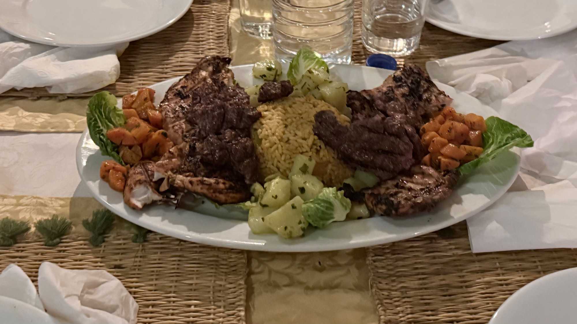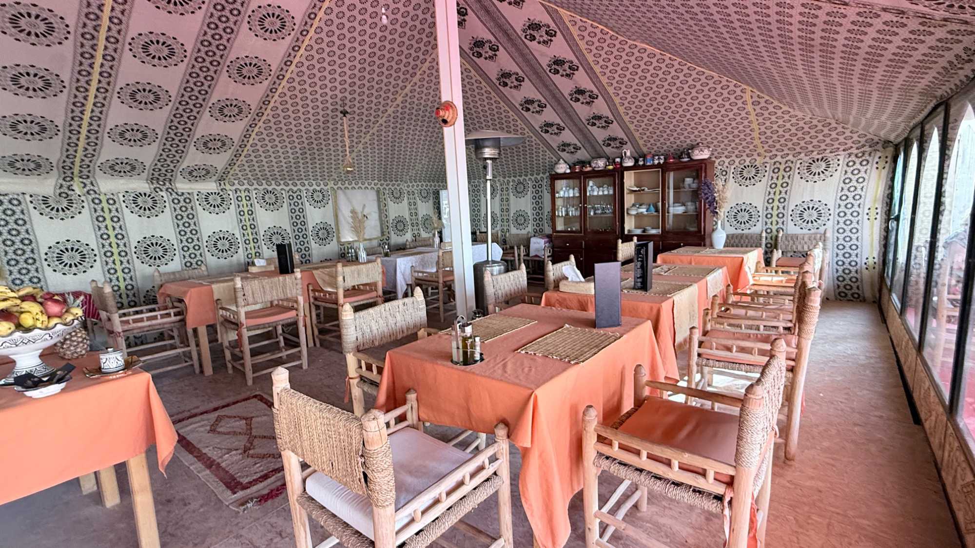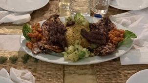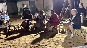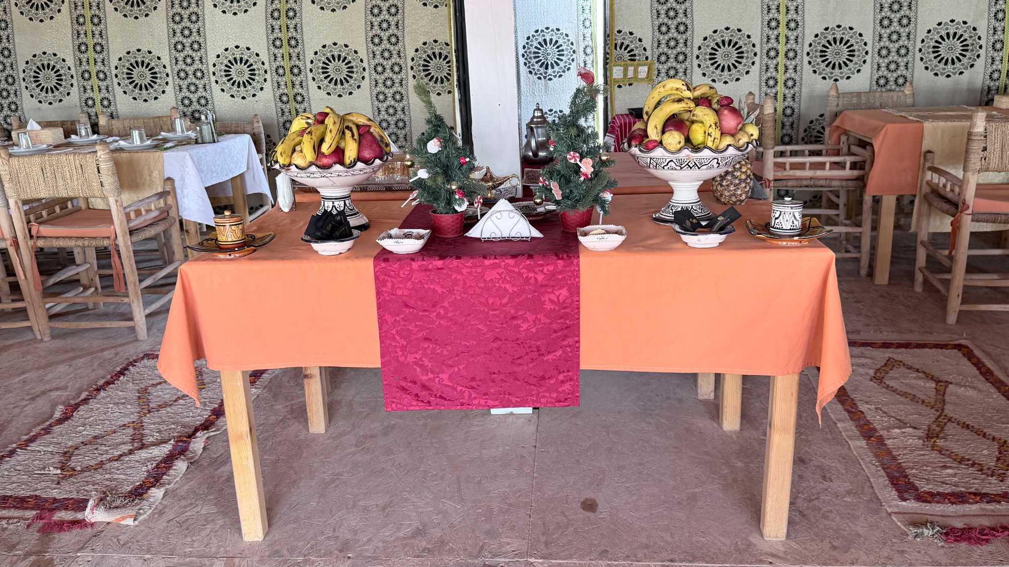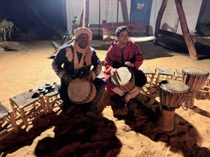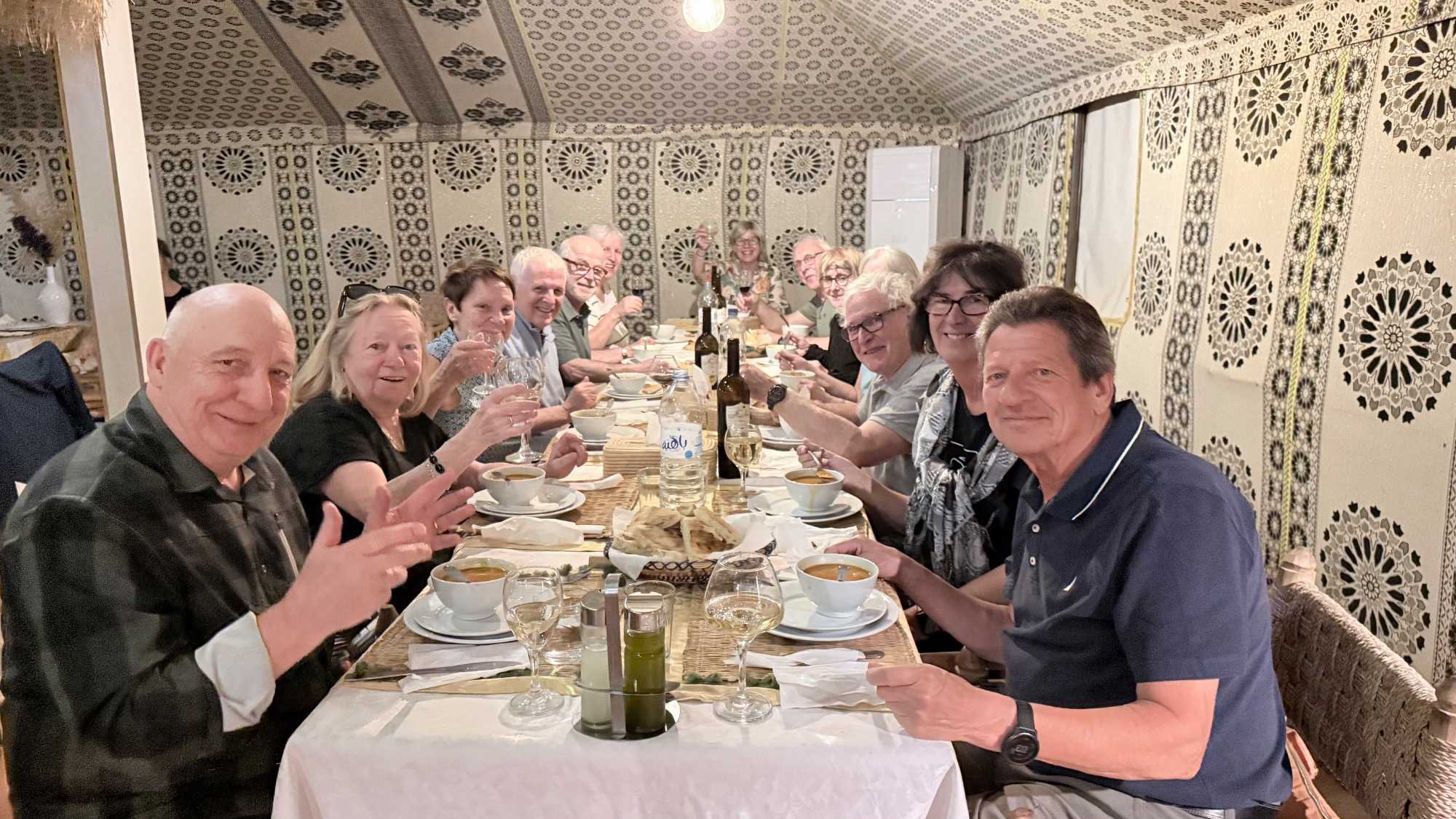Puis vint le souper, festif et généreux, accompagné de vin également offert par Voyage Louise Drouin, ajoutant une touche conviviale à cette soirée déjà mémorable. La nuit s’est ensuite animée autour d’un feu de joie, où les rythmes berbères ont fait vibrer le désert. Les chants, les rires, les flammes dansantes… tout semblait hors du temps.