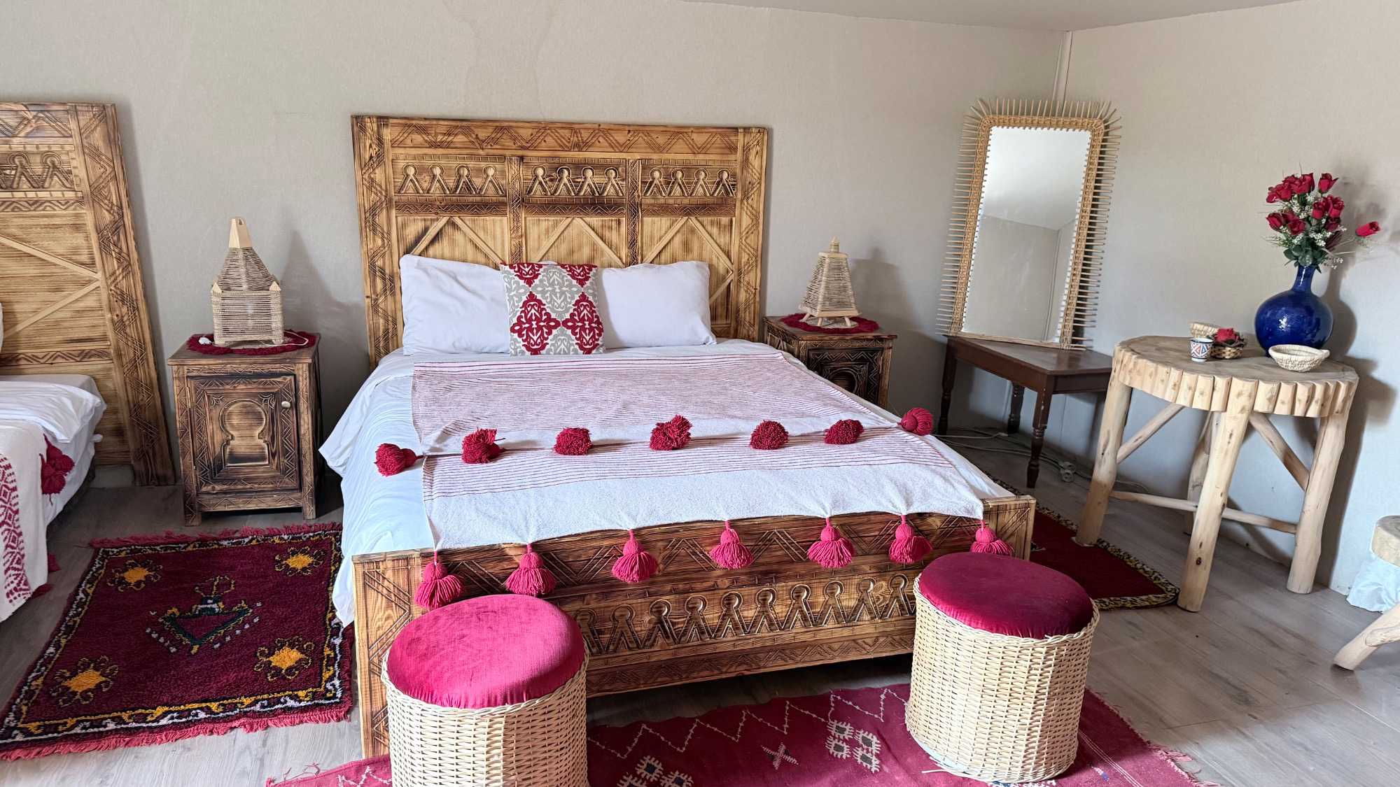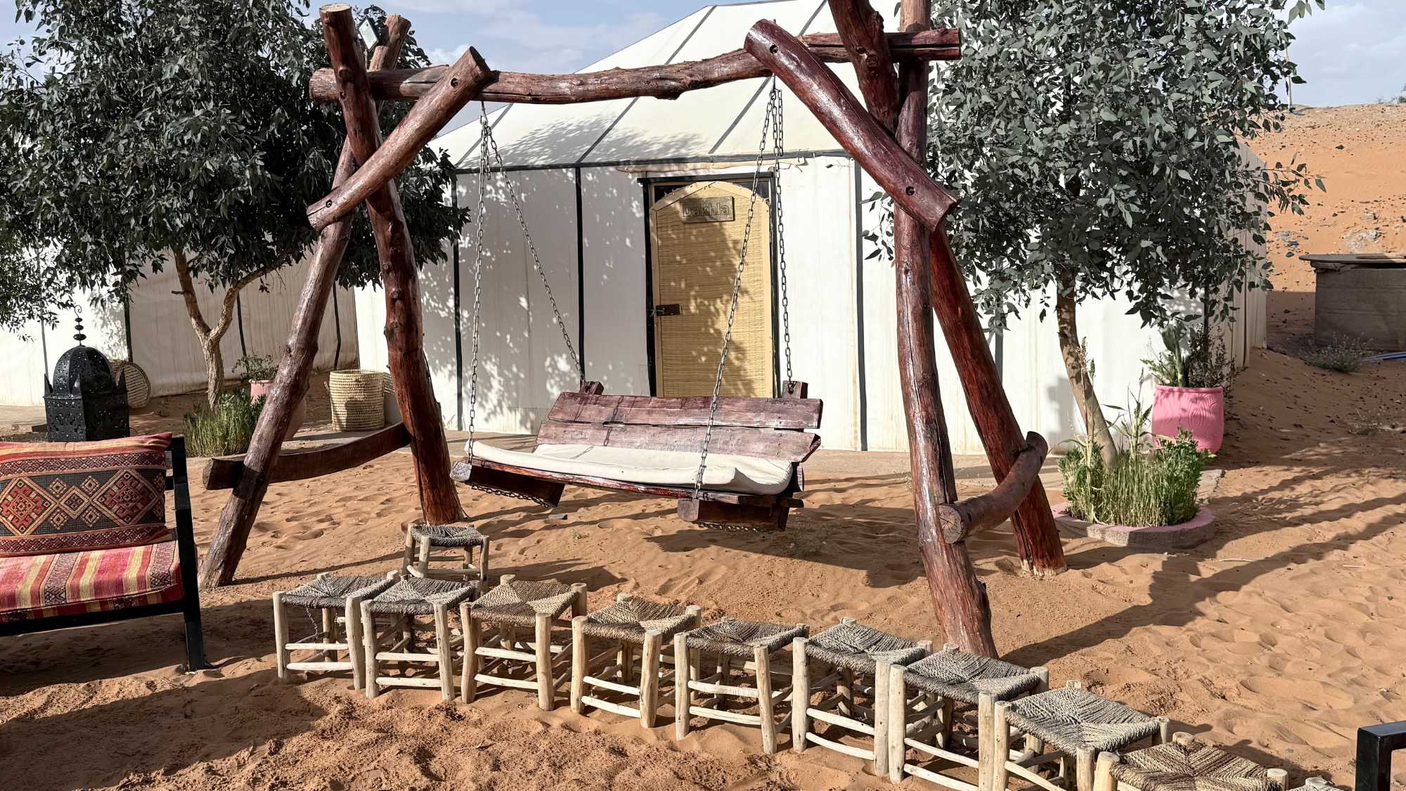 Sur le chemin, un arrêt inattendu devant un lac est venu suspendre le temps. Là, entre ciel et terre, nos chauffeurs nous ont délicatement installé un cheste, une attention offerte par Voyage Louise Drouin — toute la différence de voyager avec notre agence, qui sait ponctuer l’expérience de petites attentions ici et là — comme pour nous inviter encore un peu plus dans l’âme du désert.