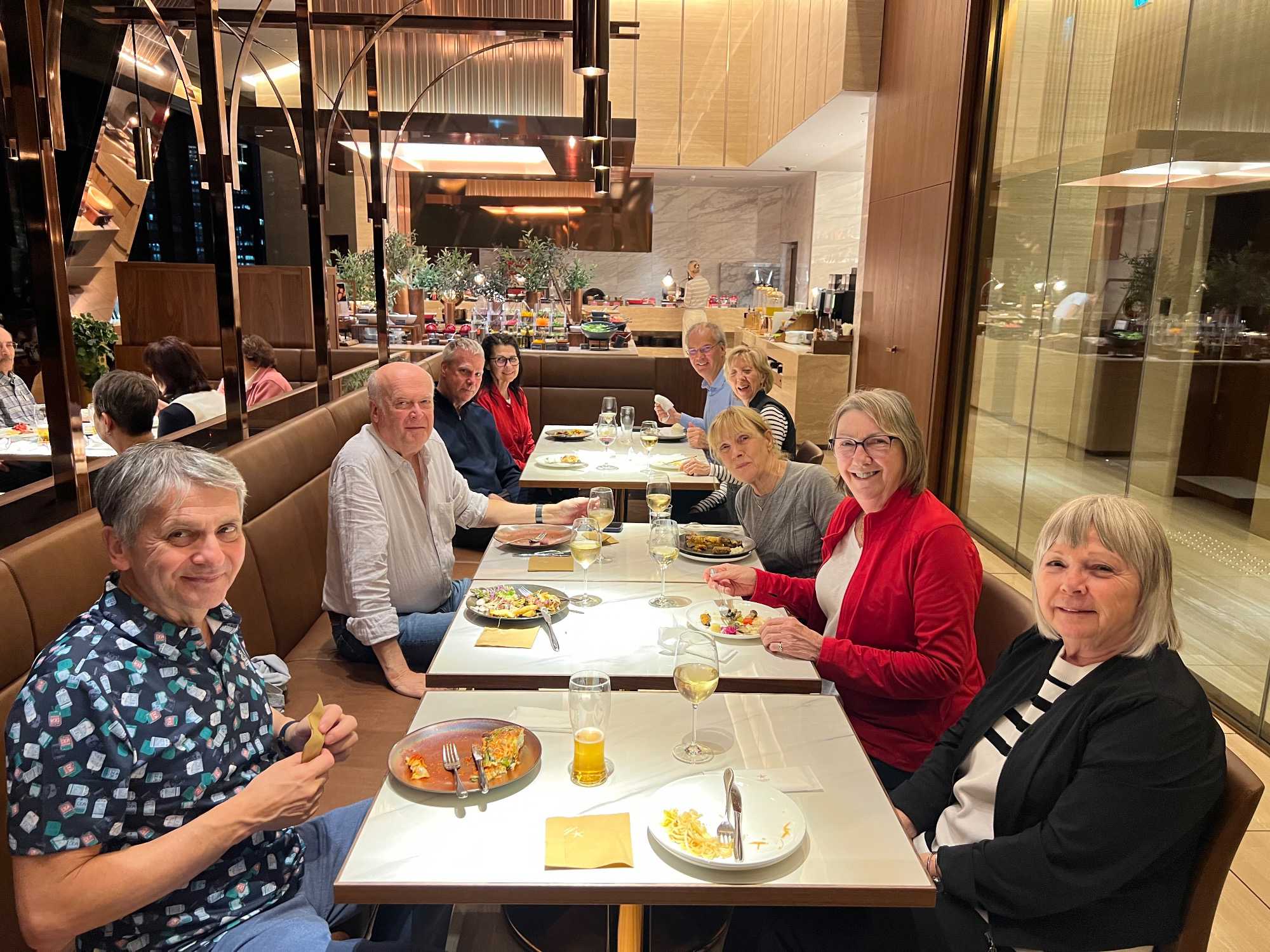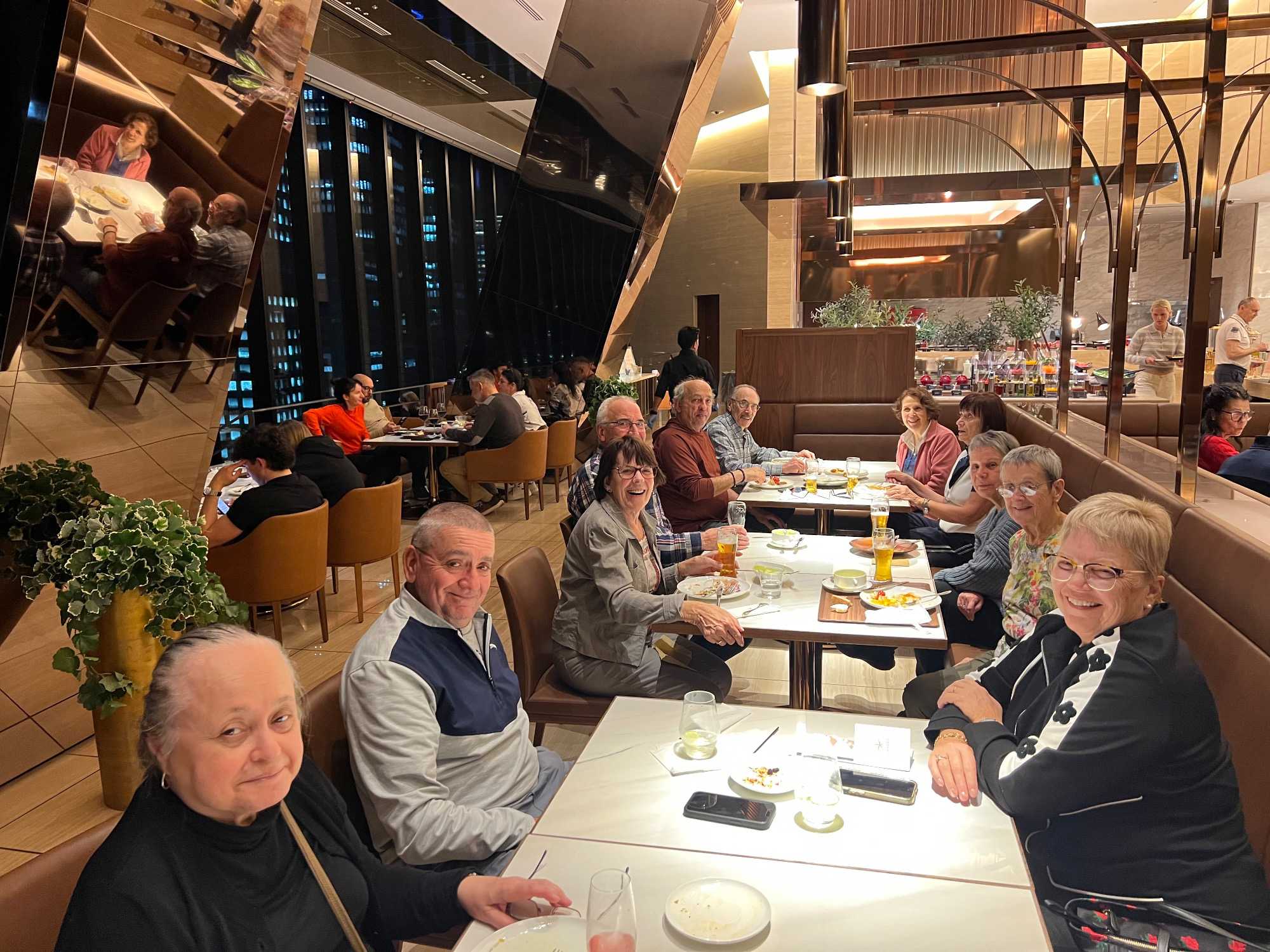 L’heure locale à notre arrivée à l’hôtel est environ 19h. La réception de notre hôtel se trouve au 17è étage! L’enregistrement se fait rapidement et nous prenons possession de nos chambres dès notre arrivée. Nous y serons pour 3 nuits. On se rejoint pour le souper. Un petit drink tous ensemble et un bon souper, ça nous fait du bien. Le décalage entre Osaka et Montréal est de + 13 heures en ce moment. C’est donc dire que tout le monde rejoint sa chambre assez rapidement après le souper.