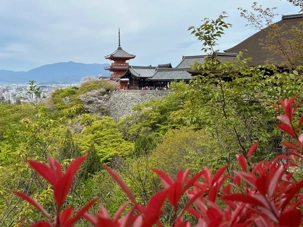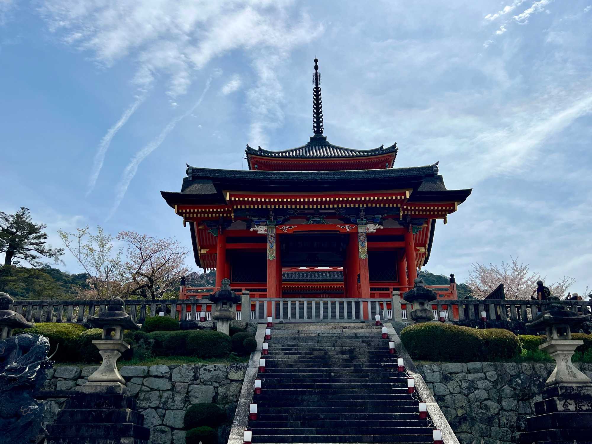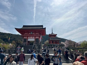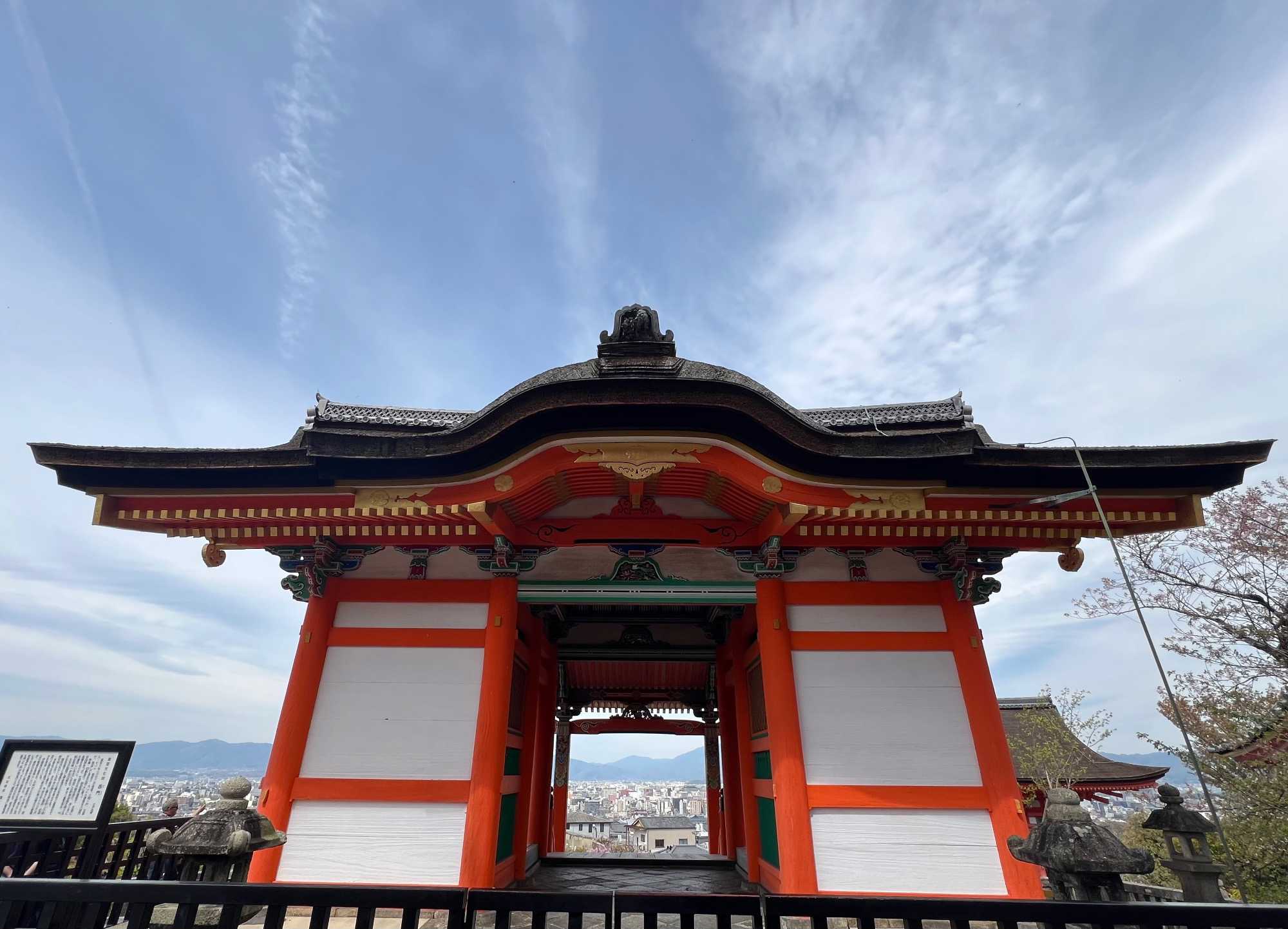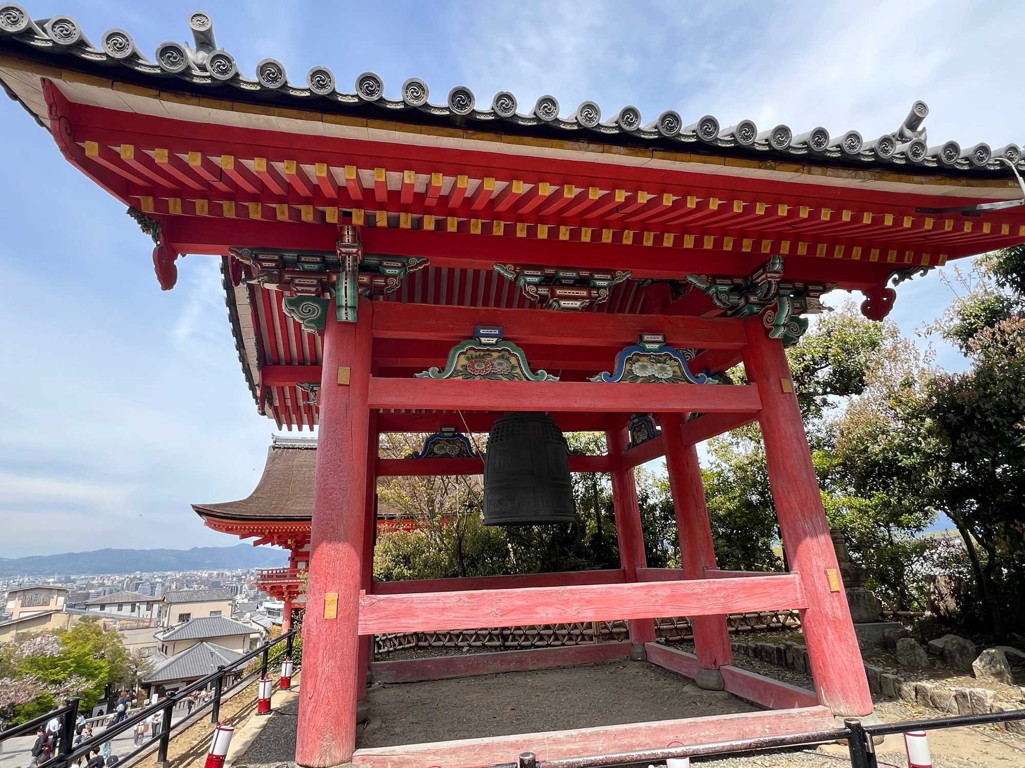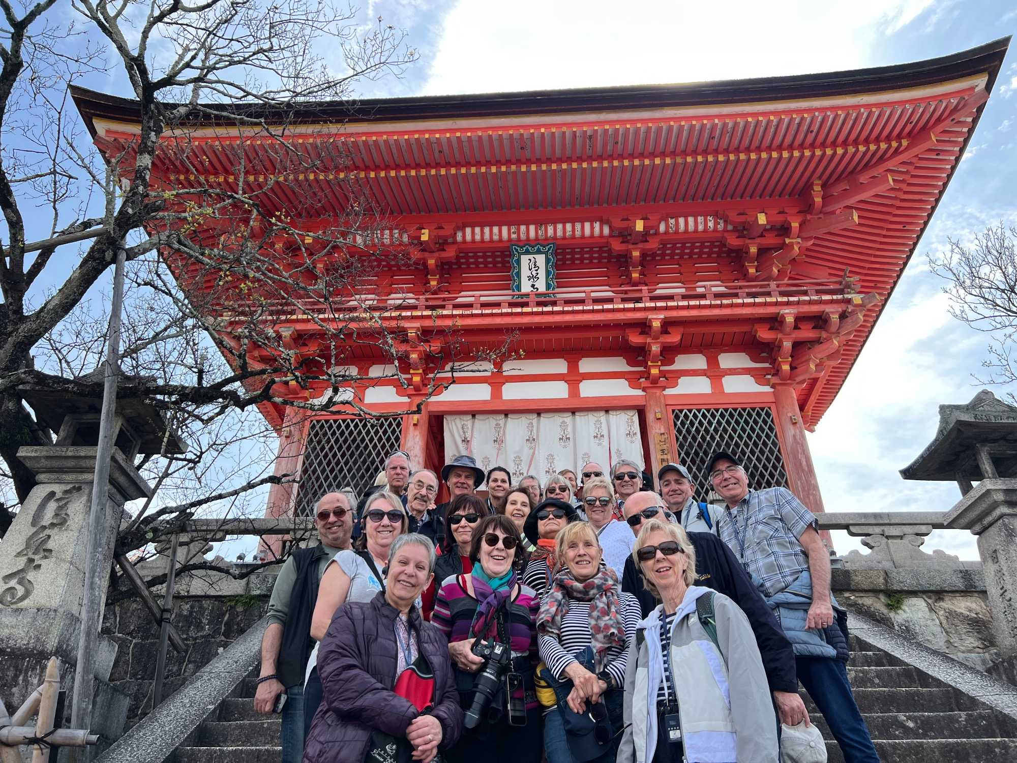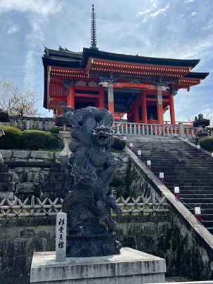 Nous débutons notre visite au spectaculaire temple Kiyomizu-dera (temple de l’eau pure), perché sur des pilotis de 15 mètres, un autre site classé au patrimoine mondial de l’UNESCO. C’est probablement le temple bouddhiste et shintoïste le plus célèbre de Kyoto. Il est dédié à la divinité de l’amour et des rencontres. Le complexe fut construit en 780, et rebâti en 1633 après les dégâts causés par un incendie. Après avoir trouvé notre chemin dans le dédale de petites rues marchandes et effectué l’ascension de la colline d’Higashiyama, à travers les rues commerçantes que sont la Ninenzaka et la Sannenzaka, notre récompense se trouve dans le rouge intense des détails de la porte, qui offre un contraste éclatant avec le blanc immaculé de ses murs. Il y a du monde, mais pas trop aujourd’hui. On se suit sans problème avec notre guide qui nous montre le chemin et moi qui ferme la marche. Arrivés au temple, nous prenons le temps d’admirer le paysage et de prendre plein de photos. Beaucoup de dames portent le kimono traditionnel et nous en profitons pour les photographier. Elles aiment bien cela. Les beaux bâtiments s’enchaînent avec la porte de l’ouest, qui dissimule une belle pagode à trois étages surmontée d’une flèche de métal forgé. Ce temple est surtout connu pour son estrade en bois qui s’élance de son hall principal, à 13 mètres au-dessus du flanc de la colline. La scène offre une belle vue sur les nombreux cerisiers et érables en contrebas, qui se parent d’une mer de couleurs au printemps et à l’automne, ainsi que sur la ville de Kyoto au loin.