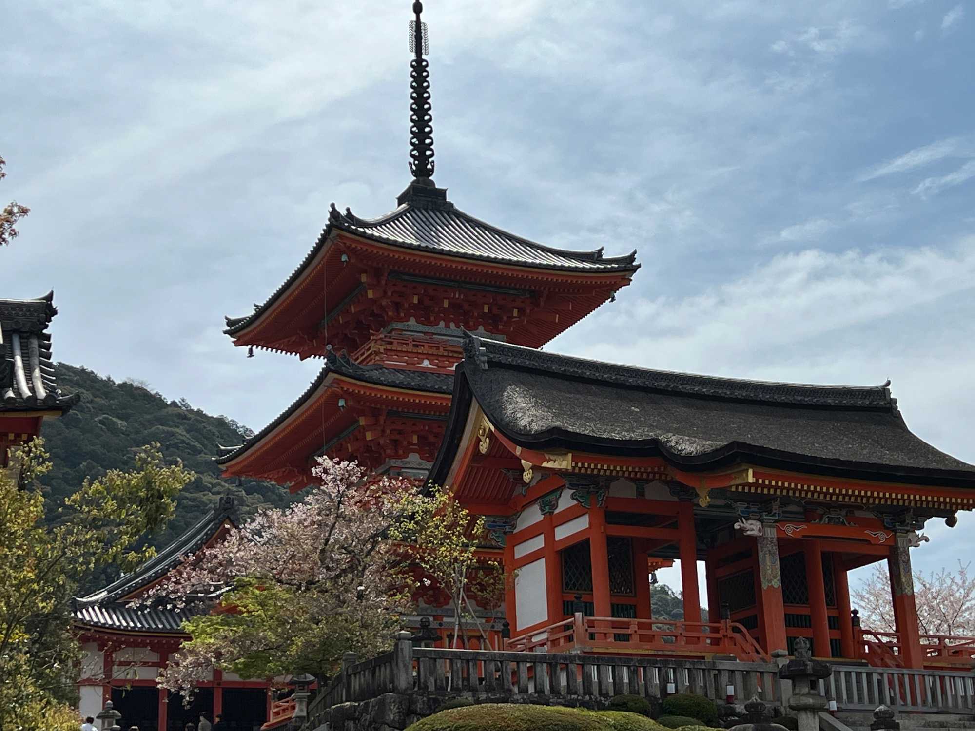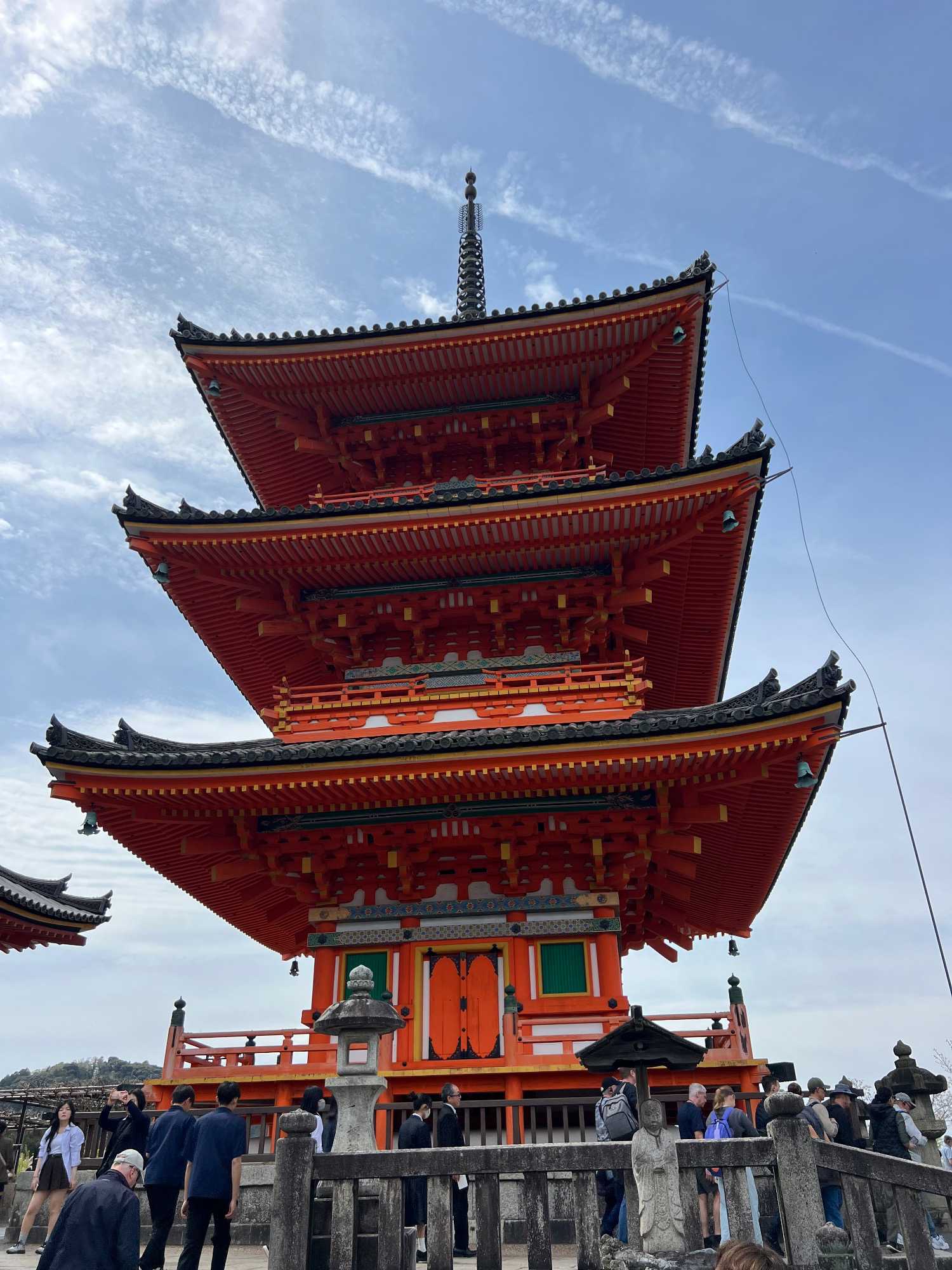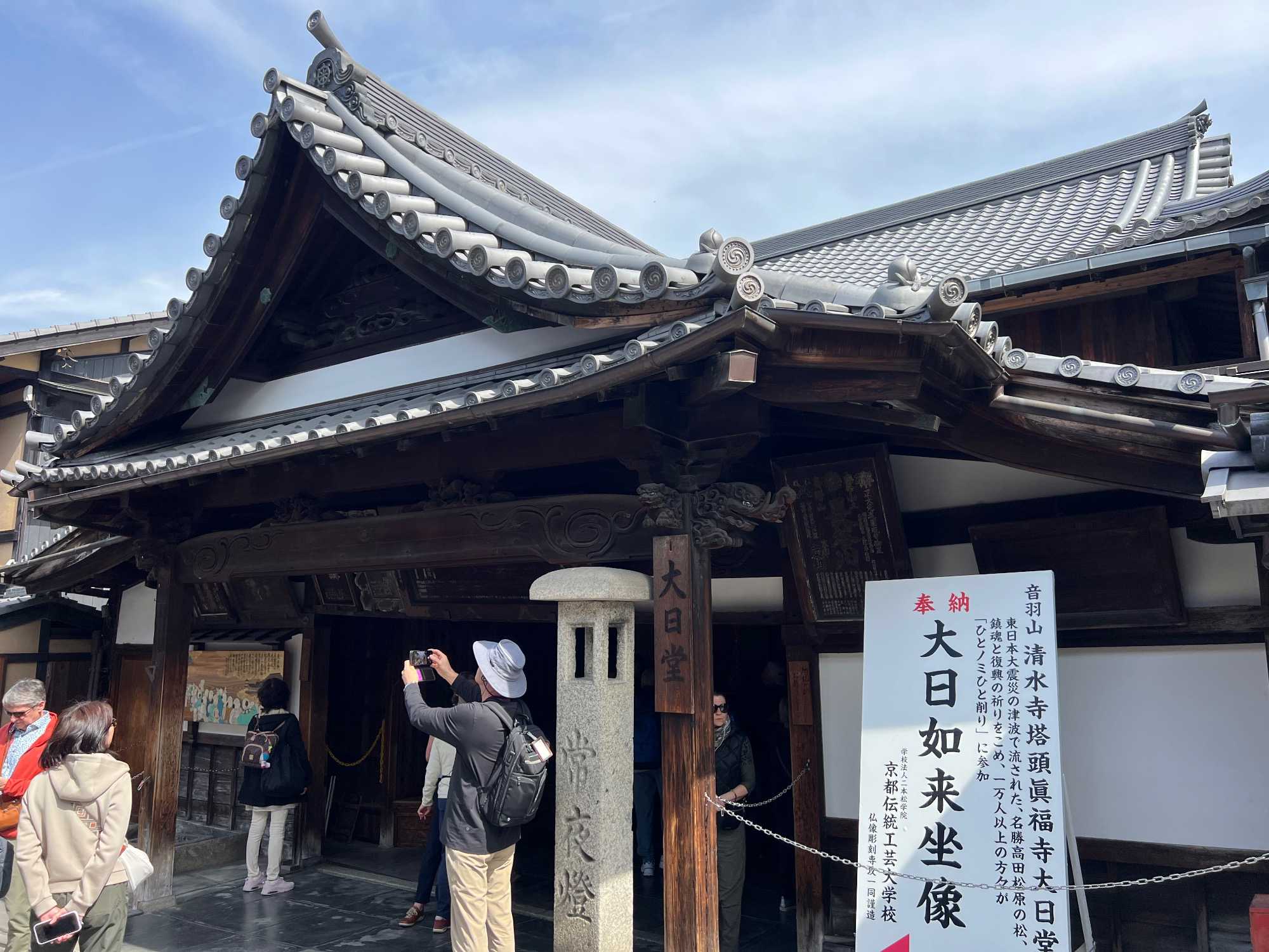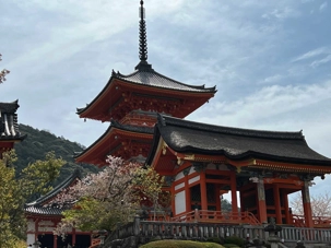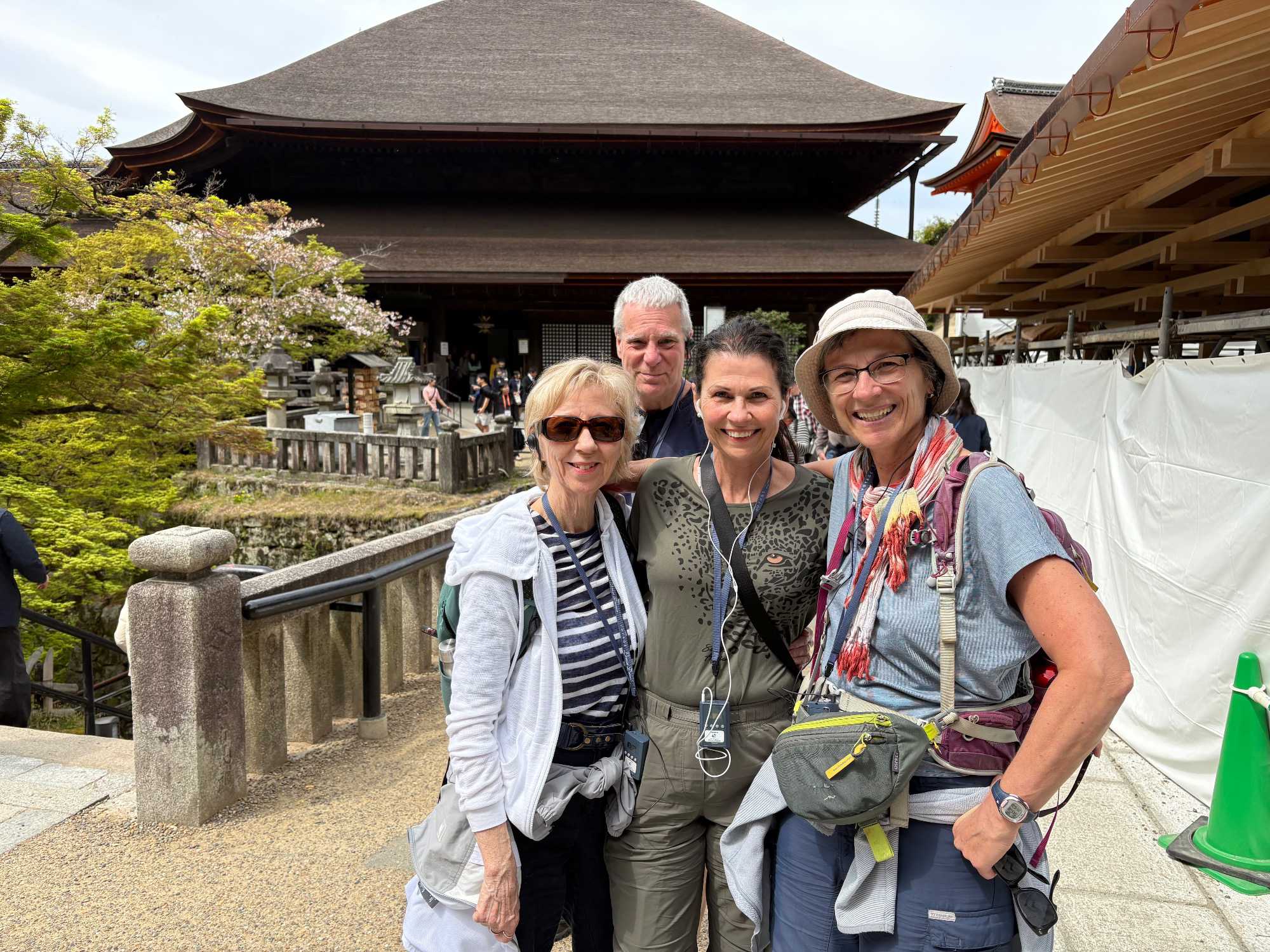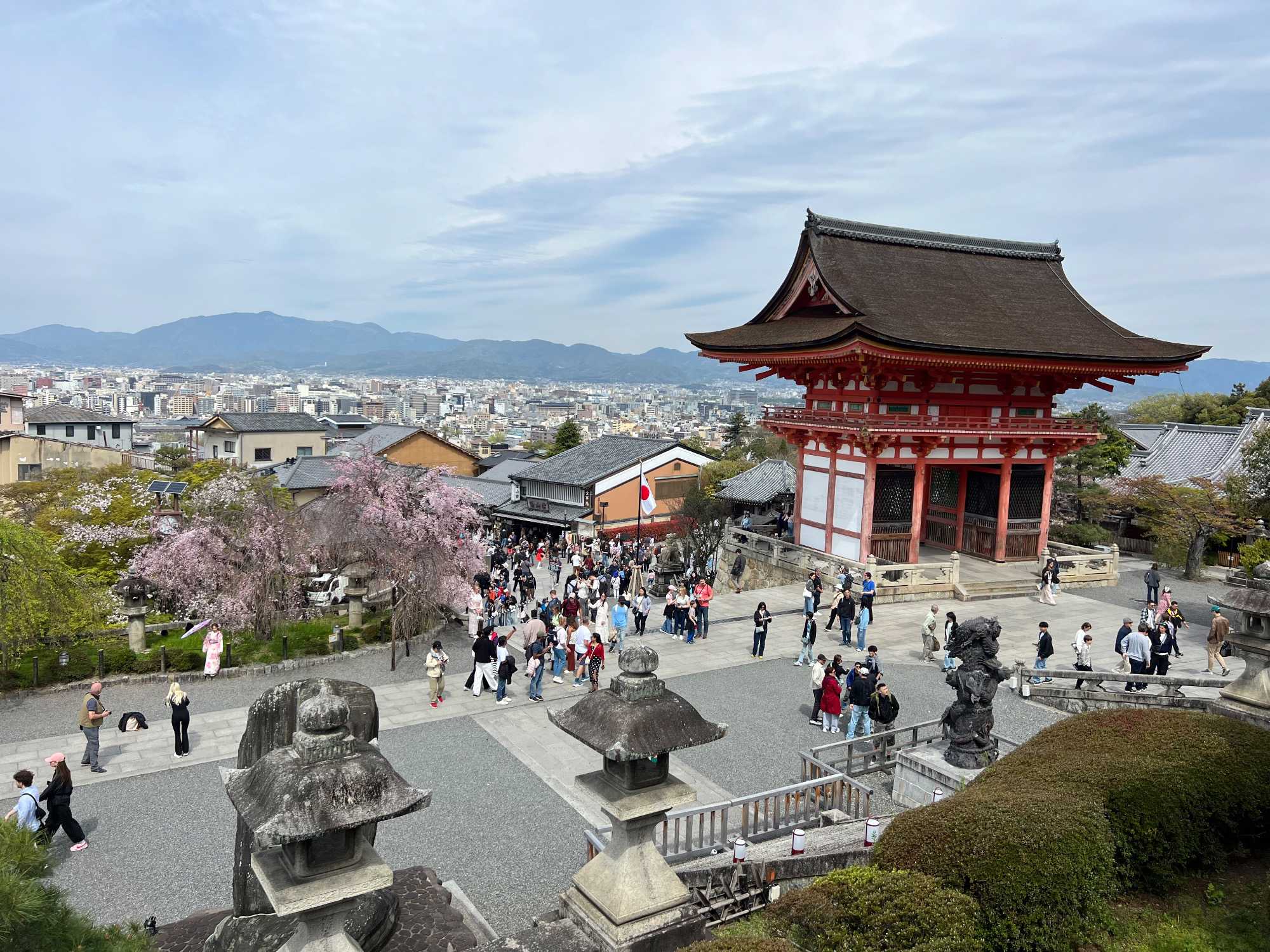 Nous débutons notre visite au spectaculaire temple Kiyomizu-dera (temple de l’eau pure), perché sur des pilotis de 15 mètres, un autre site classé au patrimoine mondial de l’UNESCO. C’est probablement le temple bouddhiste et shintoïste le plus célèbre de Kyoto. Il est dédié à la divinité de l’amour et des rencontres. Le complexe fut construit en 780, et rebâti en 1633 après les dégâts causés par un incendie. Après avoir trouvé notre chemin dans le dédale de petites rues marchandes et effectué l’ascension de la colline d’Higashiyama, à travers les rues commerçantes que sont la Ninenzaka et la Sannenzaka, notre récompense se trouve dans le rouge intense des détails de la porte, qui offre un contraste éclatant avec le blanc immaculé de ses murs. Il y a du monde, mais pas trop aujourd’hui. On se suit sans problème avec notre guide qui nous montre le chemin et moi qui ferme la marche. Arrivés au temple, nous prenons le temps d’admirer le paysage et de prendre plein de photos. Beaucoup de dames portent le kimono traditionnel et nous en profitons pour les photographier. Elles aiment bien cela. Les beaux bâtiments s’enchaînent avec la porte de l’ouest, qui dissimule une belle pagode à trois étages surmontée d’une flèche de métal forgé. Ce temple est surtout connu pour son estrade en bois qui s’élance de son hall principal, à 13 mètres au-dessus du flanc de la colline. La scène offre une belle vue sur les nombreux cerisiers et érables en contrebas, qui se parent d’une mer de couleurs au printemps et à l’automne, ainsi que sur la ville de Kyoto au loin.