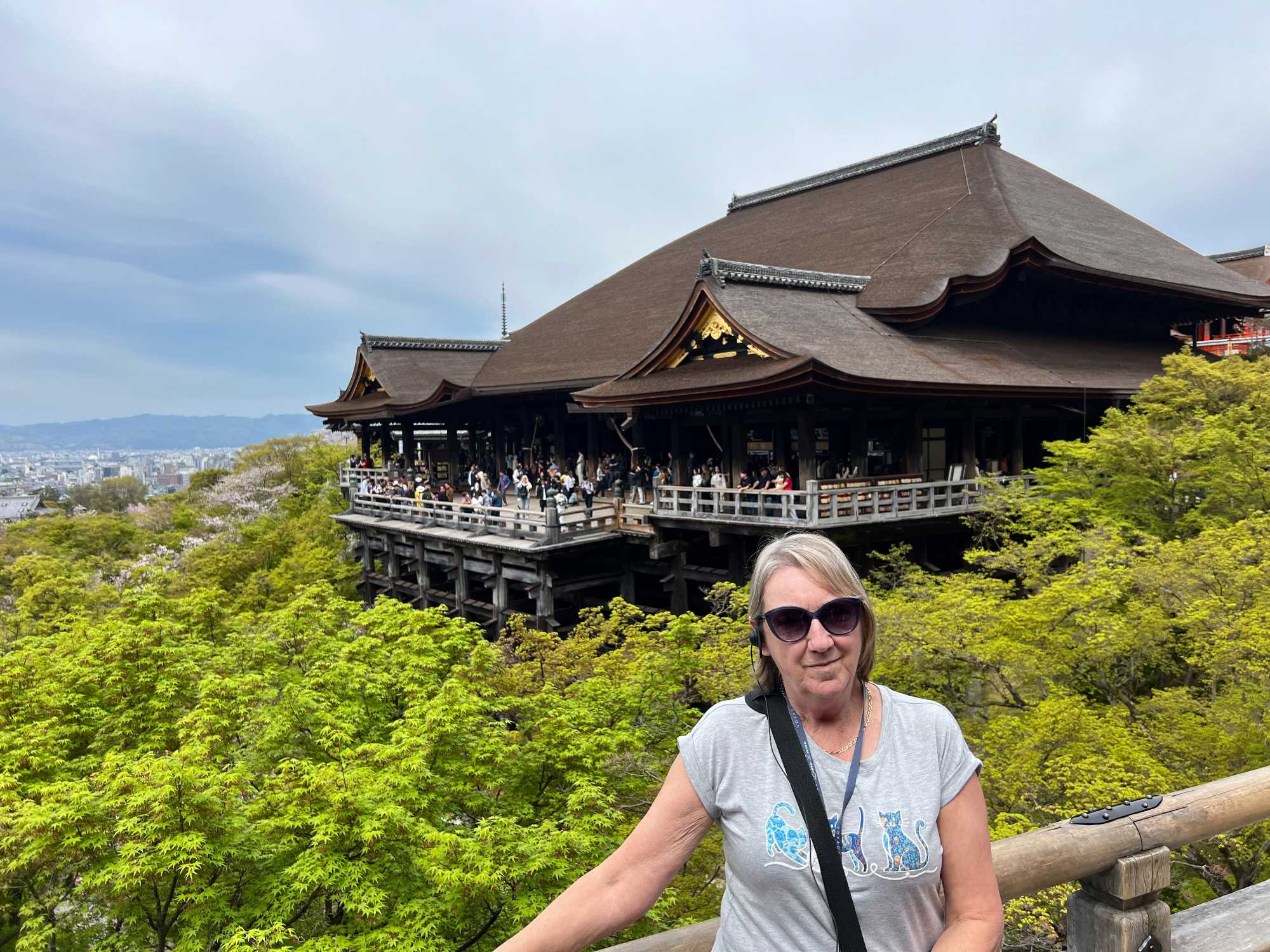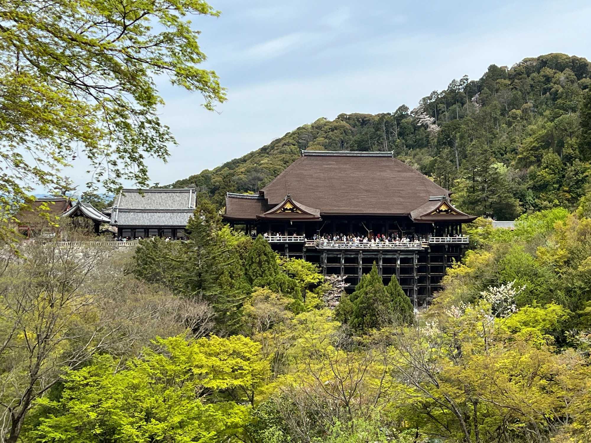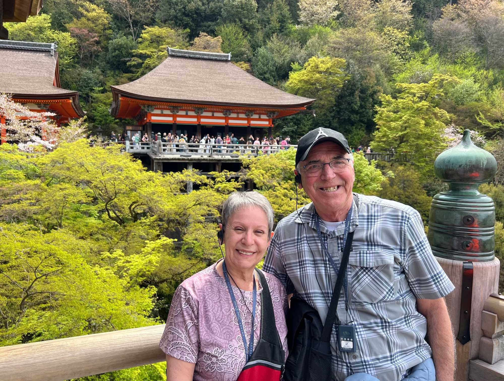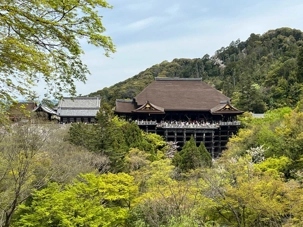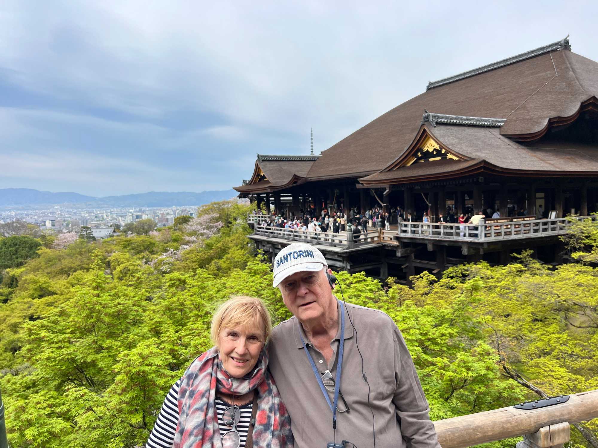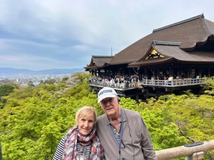 Nous débutons notre visite au spectaculaire temple Kiyomizu-dera (temple de l’eau pure), perché sur des pilotis de 15 mètres, un autre site classé au patrimoine mondial de l’UNESCO. C’est probablement le temple bouddhiste et shintoïste le plus célèbre de Kyoto. Il est dédié à la divinité de l’amour et des rencontres. Le complexe fut construit en 780, et rebâti en 1633 après les dégâts causés par un incendie. Après avoir trouvé notre chemin dans le dédale de petites rues marchandes et effectué l’ascension de la colline d’Higashiyama, à travers les rues commerçantes que sont la Ninenzaka et la Sannenzaka, notre récompense se trouve dans le rouge intense des détails de la porte, qui offre un contraste éclatant avec le blanc immaculé de ses murs. Il y a du monde, mais pas trop aujourd’hui. On se suit sans problème avec notre guide qui nous montre le chemin et moi qui ferme la marche. Arrivés au temple, nous prenons le temps d’admirer le paysage et de prendre plein de photos. Beaucoup de dames portent le kimono traditionnel et nous en profitons pour les photographier. Elles aiment bien cela. Les beaux bâtiments s’enchaînent avec la porte de l’ouest, qui dissimule une belle pagode à trois étages surmontée d’une flèche de métal forgé. Ce temple est surtout connu pour son estrade en bois qui s’élance de son hall principal, à 13 mètres au-dessus du flanc de la colline. La scène offre une belle vue sur les nombreux cerisiers et érables en contrebas, qui se parent d’une mer de couleurs au printemps et à l’automne, ainsi que sur la ville de Kyoto au loin.