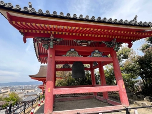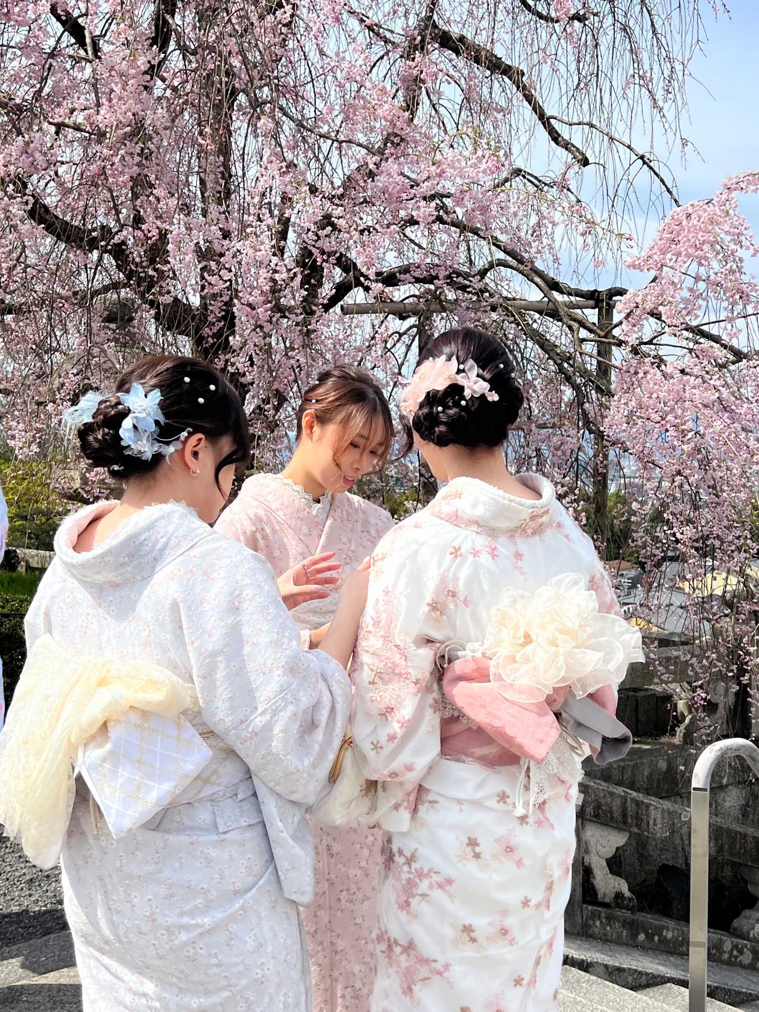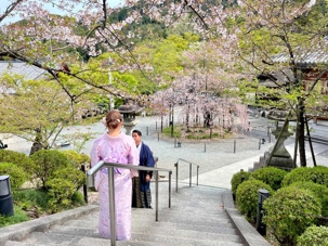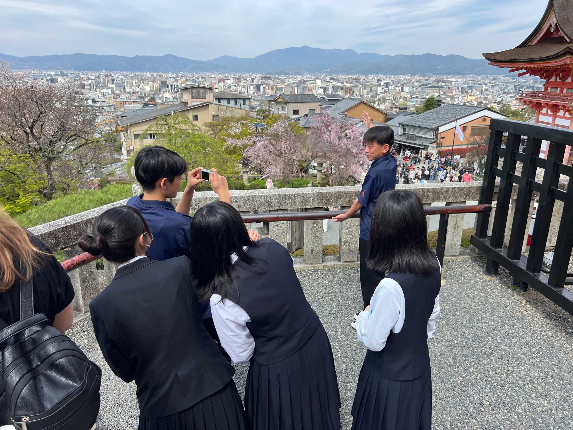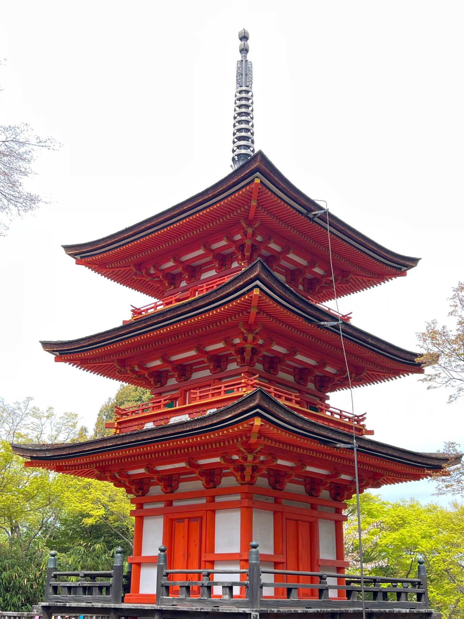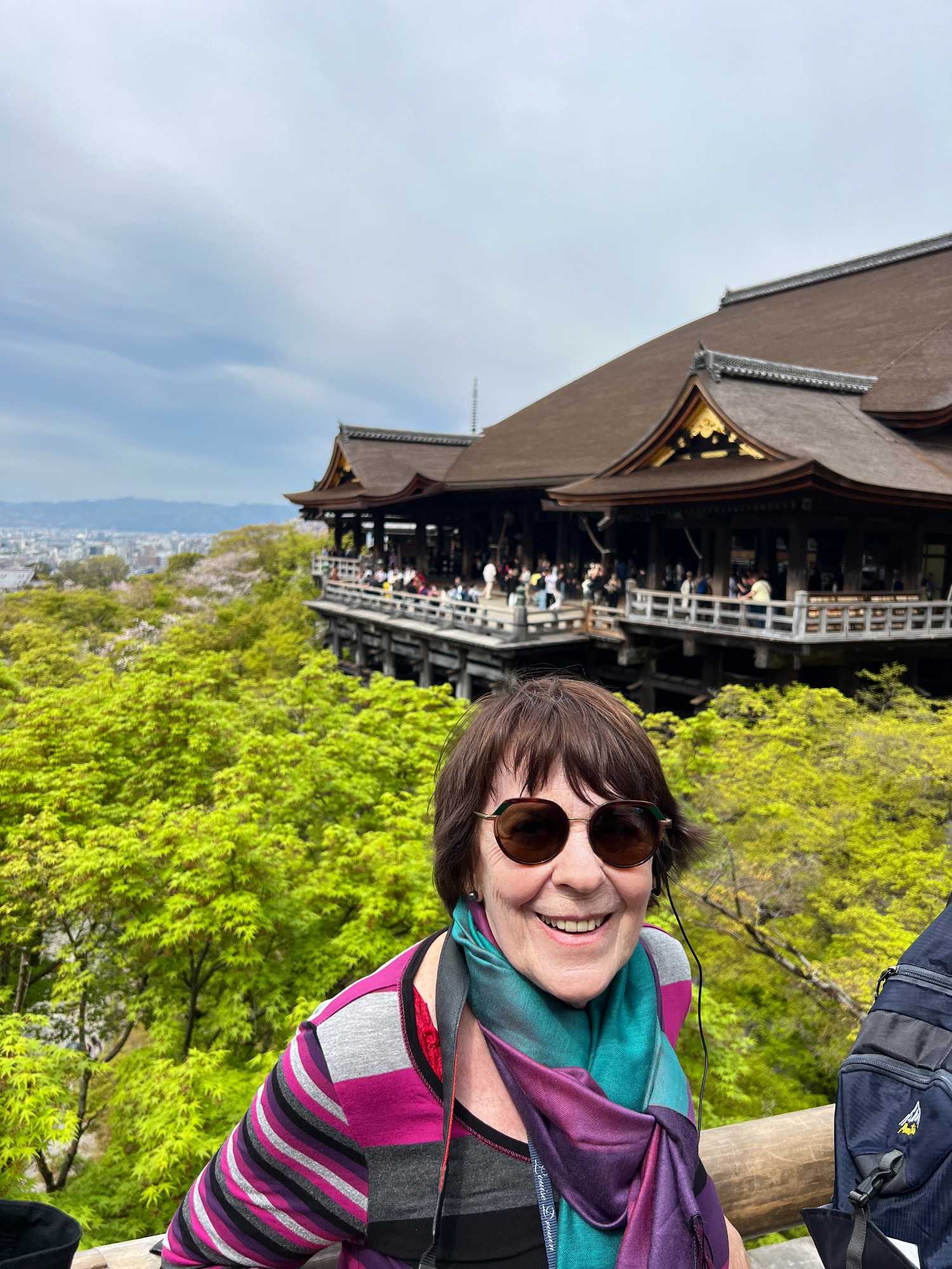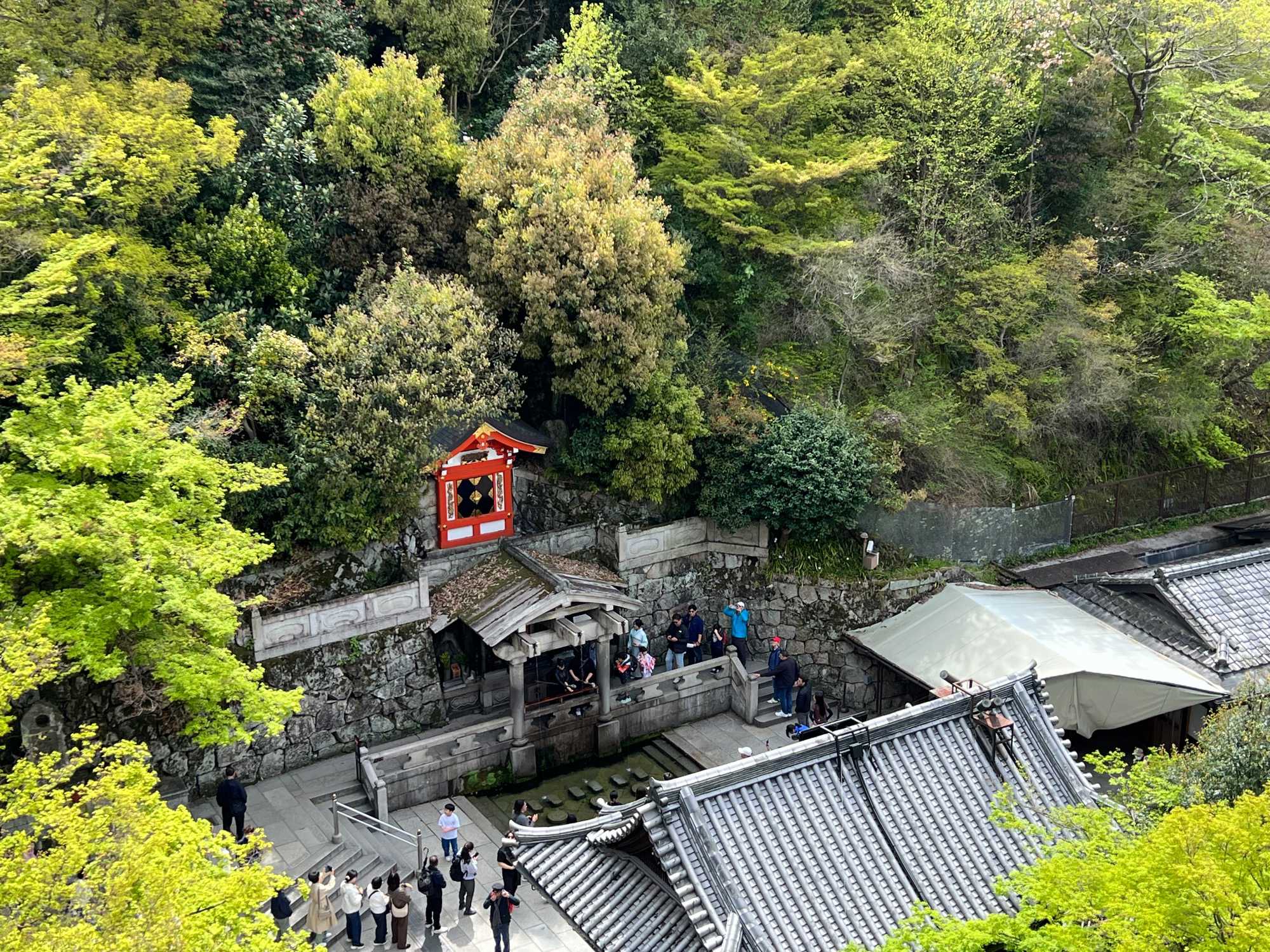 Nous débutons notre visite au spectaculaire temple Kiyomizu-dera (temple de l’eau pure), perché sur des pilotis de 15 mètres, un autre site classé au patrimoine mondial de l’UNESCO. C’est probablement le temple bouddhiste et shintoïste le plus célèbre de Kyoto. Il est dédié à la divinité de l’amour et des rencontres. Le complexe fut construit en 780, et rebâti en 1633 après les dégâts causés par un incendie. Après avoir trouvé notre chemin dans le dédale de petites rues marchandes et effectué l’ascension de la colline d’Higashiyama, à travers les rues commerçantes que sont la Ninenzaka et la Sannenzaka, notre récompense se trouve dans le rouge intense des détails de la porte, qui offre un contraste éclatant avec le blanc immaculé de ses murs. Il y a du monde, mais pas trop aujourd’hui. On se suit sans problème avec notre guide qui nous montre le chemin et moi qui ferme la marche. Arrivés au temple, nous prenons le temps d’admirer le paysage et de prendre plein de photos. Beaucoup de dames portent le kimono traditionnel et nous en profitons pour les photographier. Elles aiment bien cela. Les beaux bâtiments s’enchaînent avec la porte de l’ouest, qui dissimule une belle pagode à trois étages surmontée d’une flèche de métal forgé. Ce temple est surtout connu pour son estrade en bois qui s’élance de son hall principal, à 13 mètres au-dessus du flanc de la colline. La scène offre une belle vue sur les nombreux cerisiers et érables en contrebas, qui se parent d’une mer de couleurs au printemps et à l’automne, ainsi que sur la ville de Kyoto au loin.