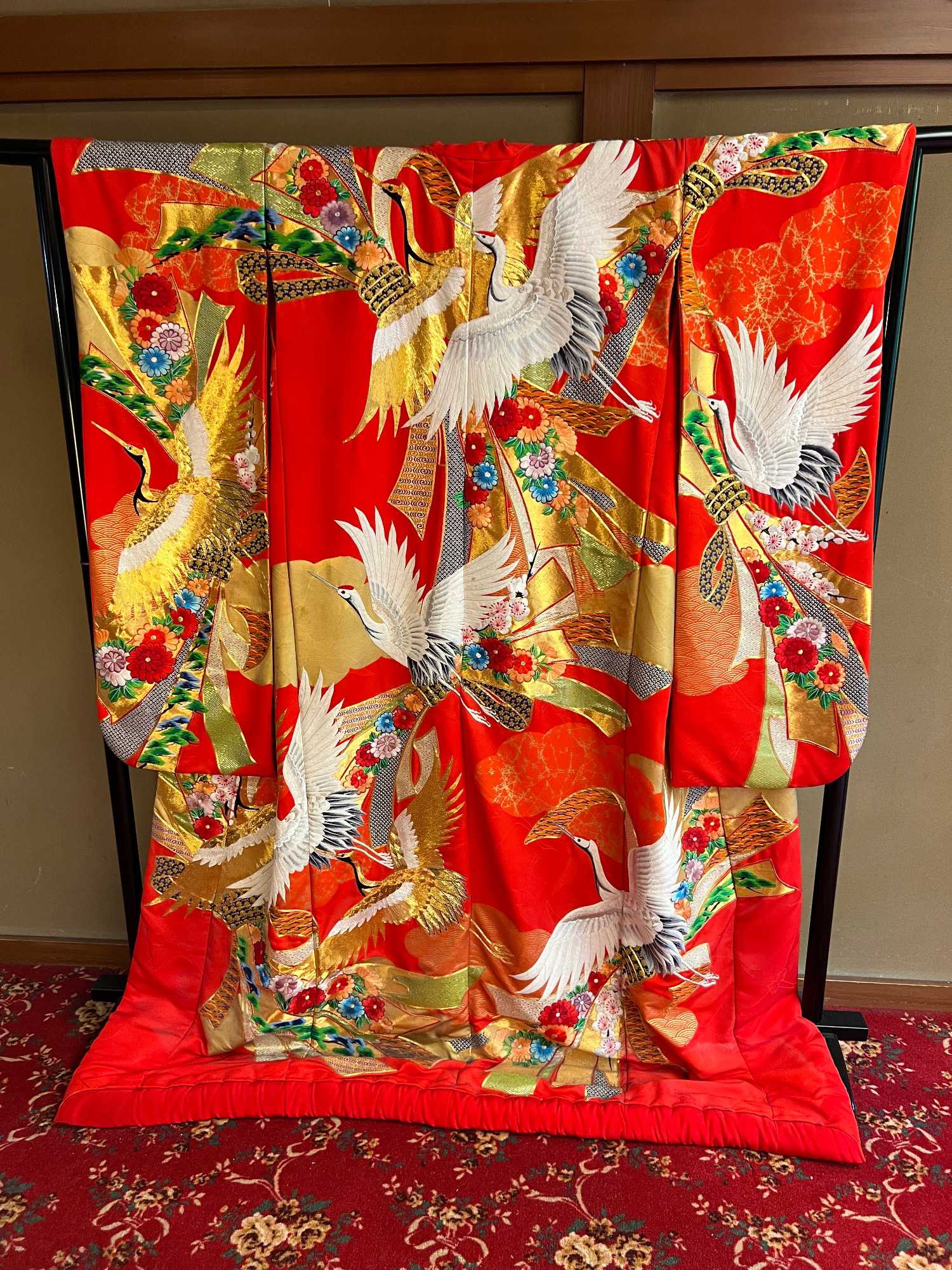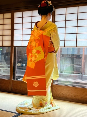 Le vêtement des geishas est un kimono de soie décolleté dans le dos, surnommé obebe dans le dialecte de Kyōto. Les couleurs du kimono se choisissent selon la saison, mais aussi selon l’âge de la porteuse : les jeunes femmes portent des couleurs vives tandis que les geishas de plus de trente ans choisissent des couleurs plus discrètes. Le kimono est plus ou moins épais selon la saison : le kimono d’été, ro, est en simple gaze de soie; le kimono d’automne ou hitoe est en soie non doublée. Enfin, le kimono d’hiver, awase, est doublé de crêpe. Le kimono est noué dans le dos par une large ceinture de soie, nommée obi. Cette obi se noue différemment selon l’âge de la geisha : les femmes mûres le portent en « noeud de tambour », mais les maikos le portent « en traîne », avec un noeud qui remonte jusqu’aux omoplates, le bout de l’obi traînant presque par terre. Un tel noeud nécessite une obi de plusieurs mètres de long. Ce noeud geishas dans le dos distingue les geishas des autres prostituées, qui nouaient leur obi sur le devant pour pouvoir l’enlever et le remettre plusieurs fois au cours d’une soirée. Enfiler un kimono et nouer une obi est une opération complexe, d’autant plus que, les kimonos étant tous de la même longueur quelle que soit la taille de la porteuse, il est généralement nécessaire de replier le tissu du kimono sous l’obi, sauf pour une geisha très grande. C’est pourquoi les geishas font souvent appel aux services d’un « habilleur » professionnel. Les kimonos sont fabriqués et peints à la main, ce qui les rend très chers: entre 8000 et 10 000$ CAD pour un bon kimono.