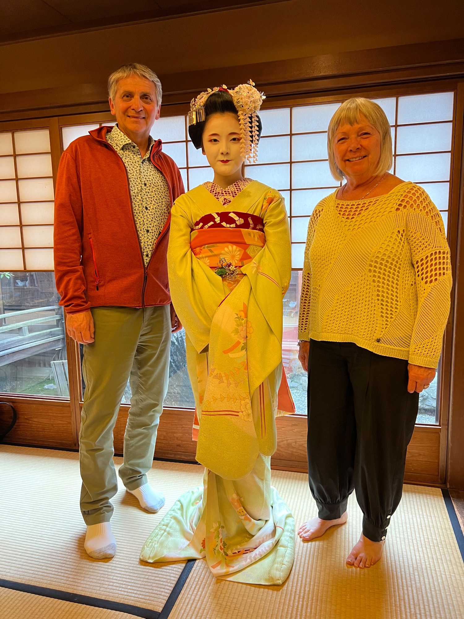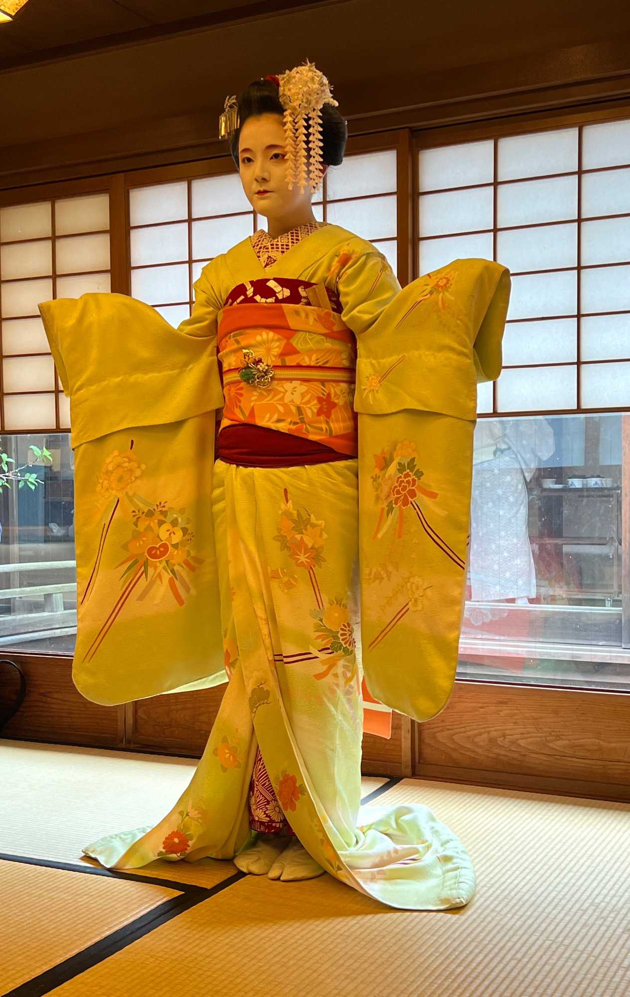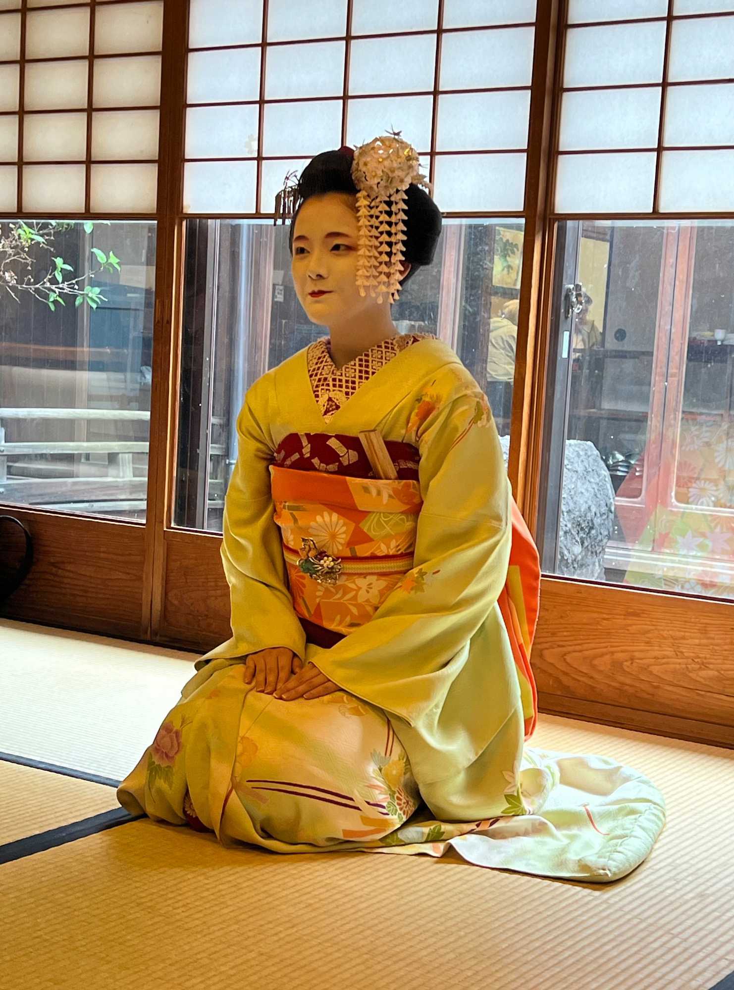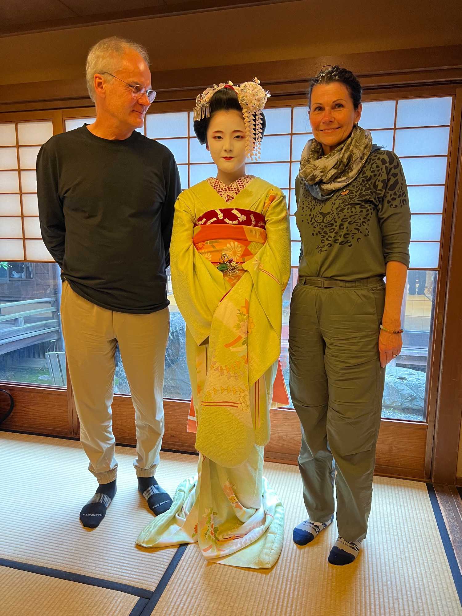 Nous avons la chance de prendre notre repas dans un restaurant traditionnel pour goûter à la cuisine japonaise, constituée de plusieurs petits plats. On n’en fini plus de nous apporter des plats différents, et pour la plupart, que nous n’avons jamais goûté. Tout le monde adore l’expérience. Après avoir mangé, nous avons la chance d’admirer un spectacle de danse japonaise donné par une maiko, c’est le nom donné aux apprenties geishas. Nous admirons l’élégance et la grâce de la maiko dansant au son de la musique traditionnelle, une expérience unique et d’une rareté pour nous, étrangers au Japon. De plus, après le spectacle, nous saisissons l’occasion pour poser nos questions à la maiko pendant que notre guide fait la traduction. C’est avec générosité que la maiko répond sans hésitation à chacune de nos questions.