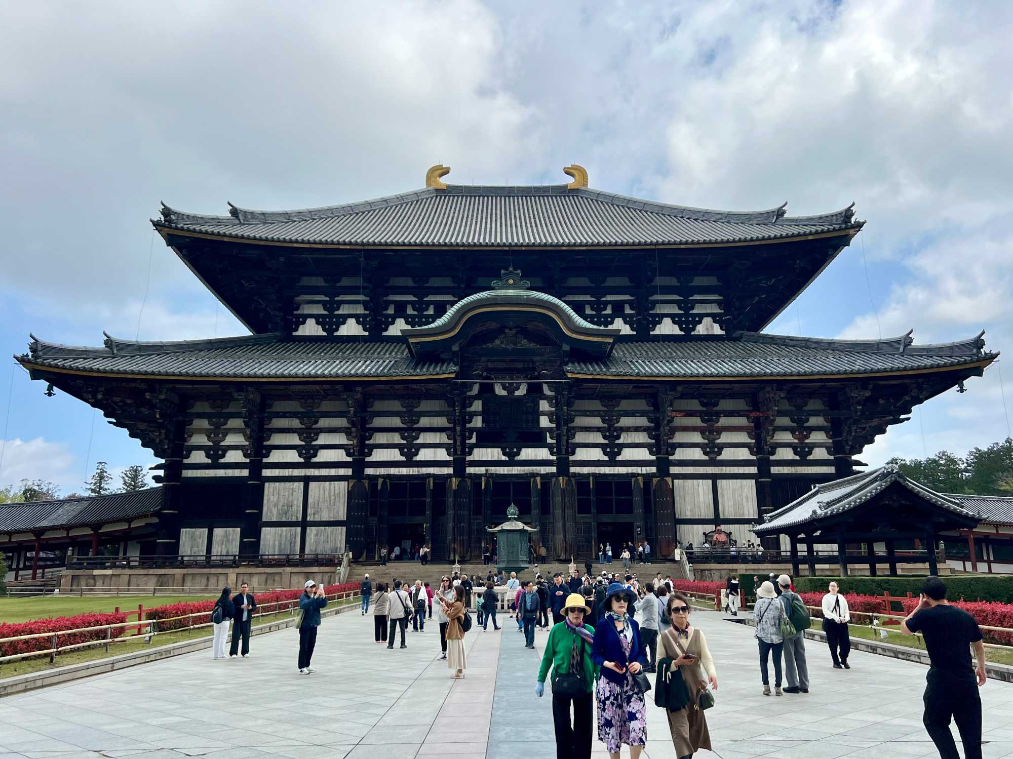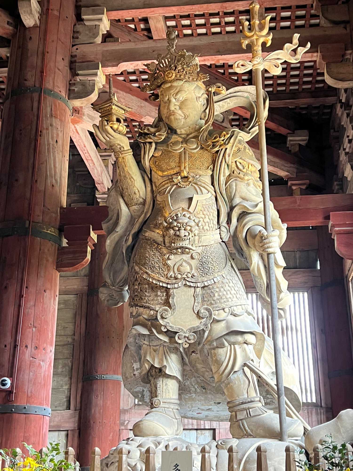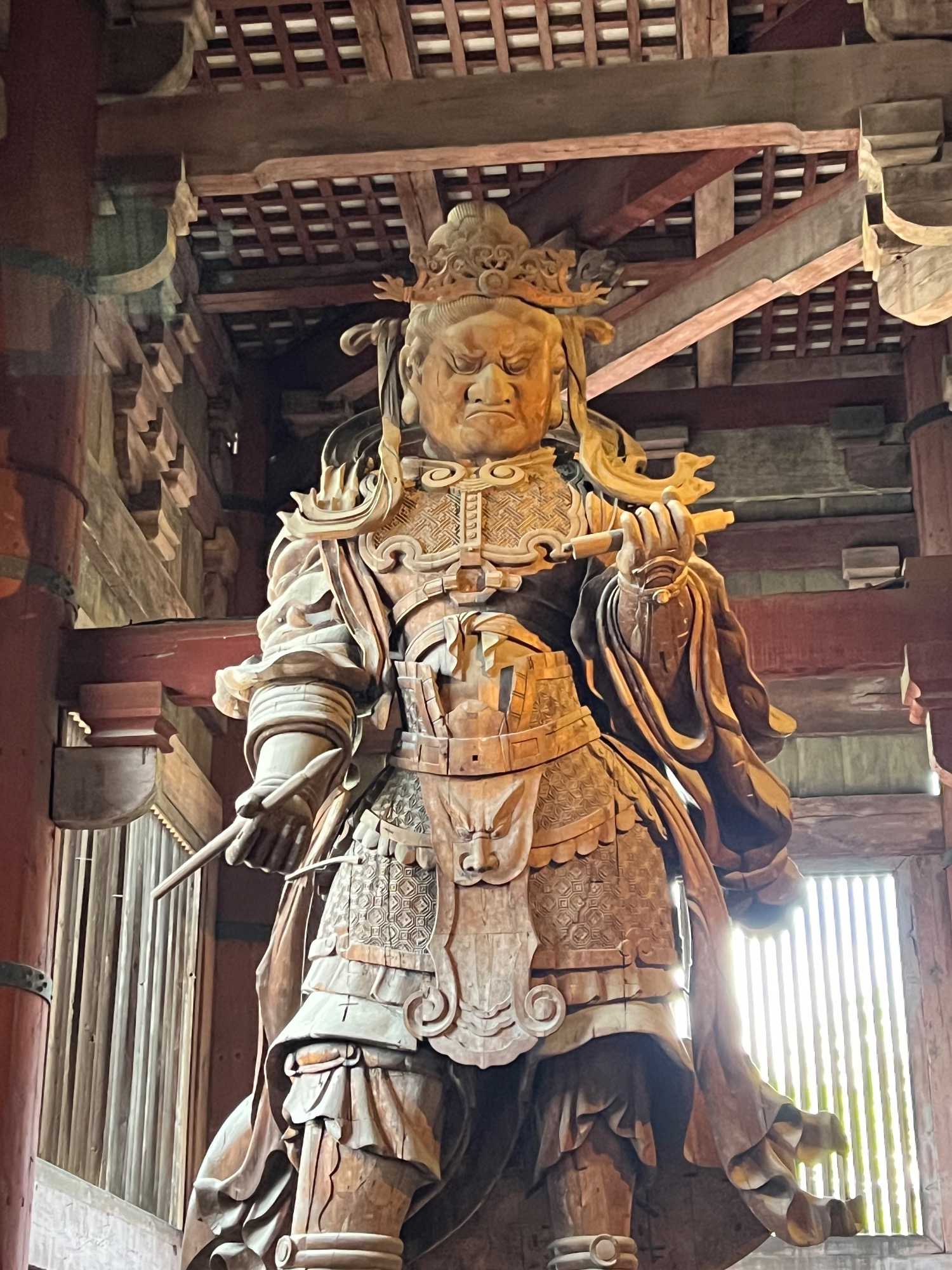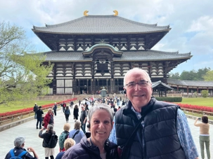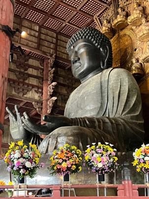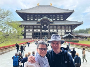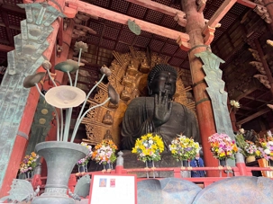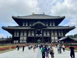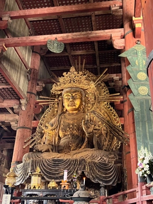 Nous débutons notre visite par le temple Todai-ji datant du 8è siècle. Ce temple est considéré comme le plus grand bâtiment de bois au monde et abrite une immense statue de bouddha de bronze de 437 tonnes et 16,2 mètres de haut, ce qui en fait la plus grande statue en bronze au monde. Nous sommes tous ébahis par la dimension du bâtiment et des statues. On constate qu’ici au Japon, la religion est pratiquée par les jeunes et les moins jeunes.