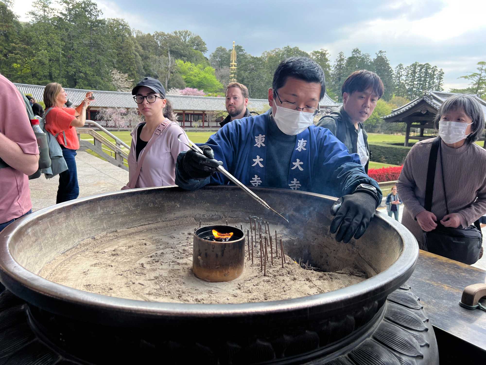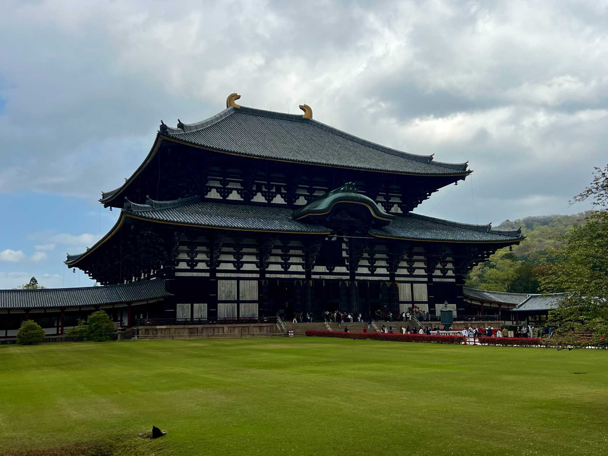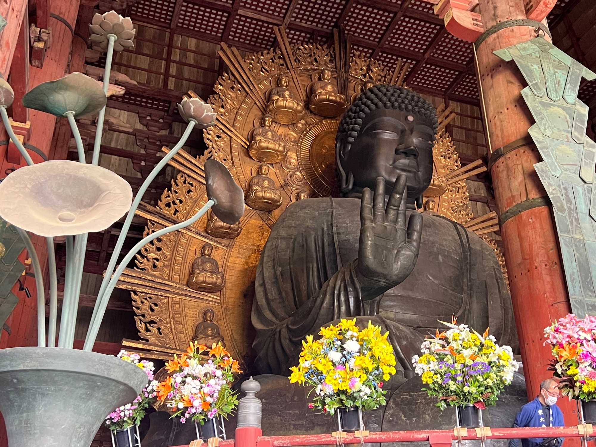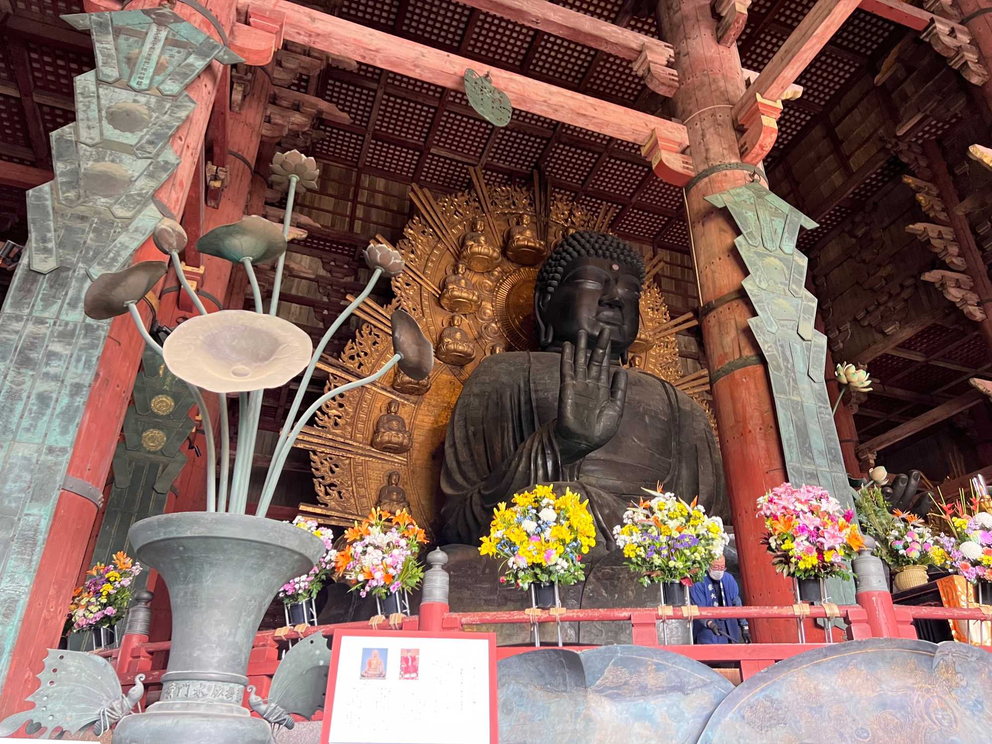 Nous débutons notre visite par le temple Todai-ji datant du 8è siècle. Ce temple est considéré comme le plus grand bâtiment de bois au monde et abrite une immense statue de bouddha de bronze de 437 tonnes et 16,2 mètres de haut, ce qui en fait la plus grande statue en bronze au monde. Nous sommes tous ébahis par la dimension du bâtiment et des statues. On constate qu’ici au Japon, la religion est pratiquée par les jeunes et les moins jeunes.