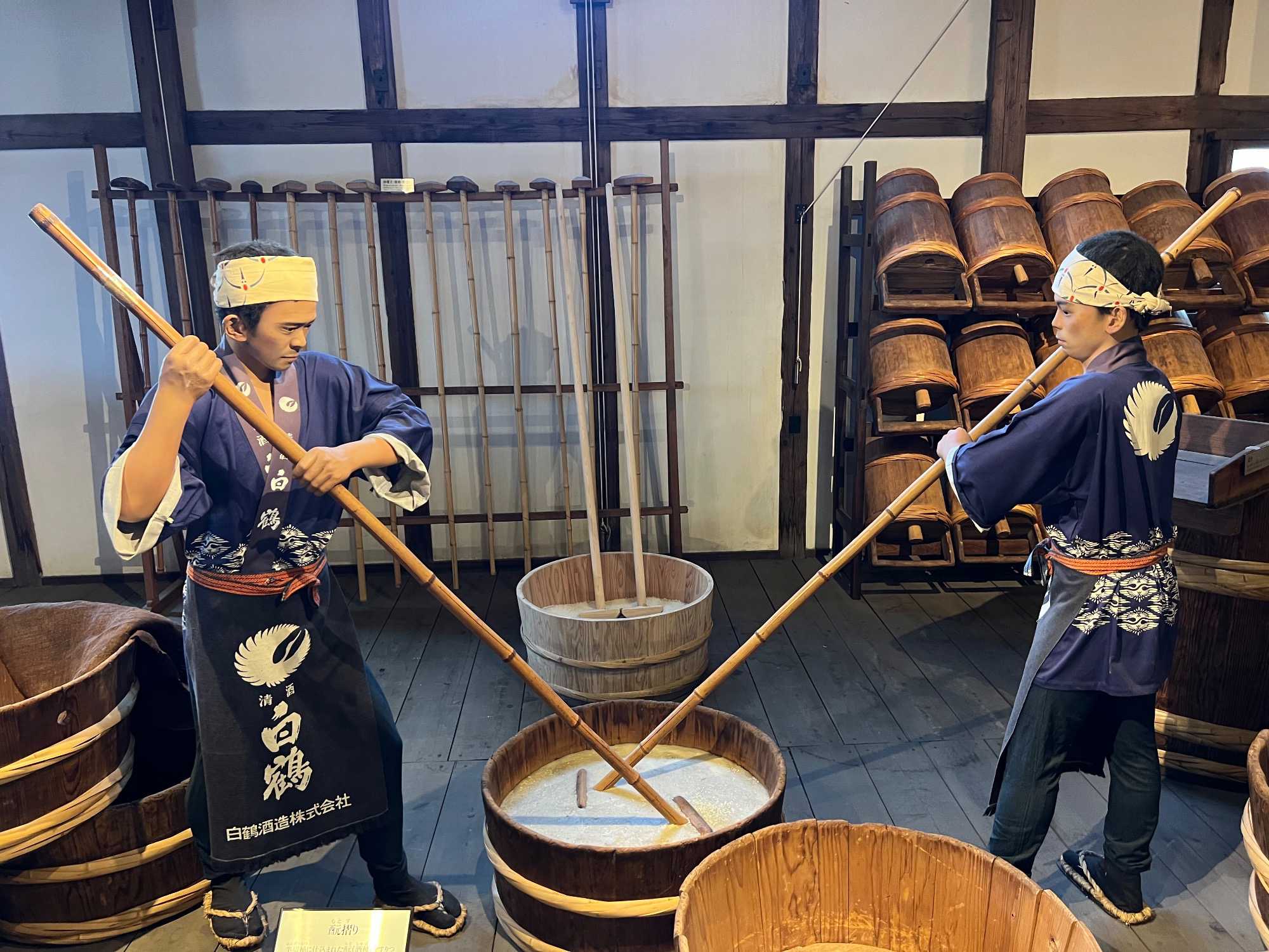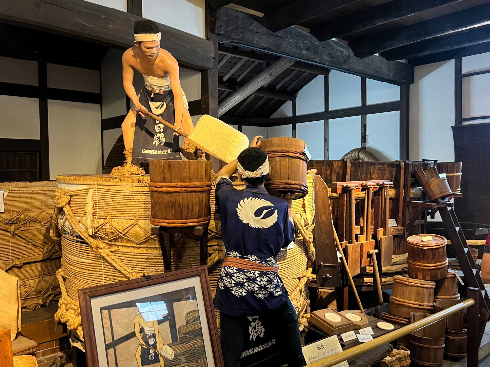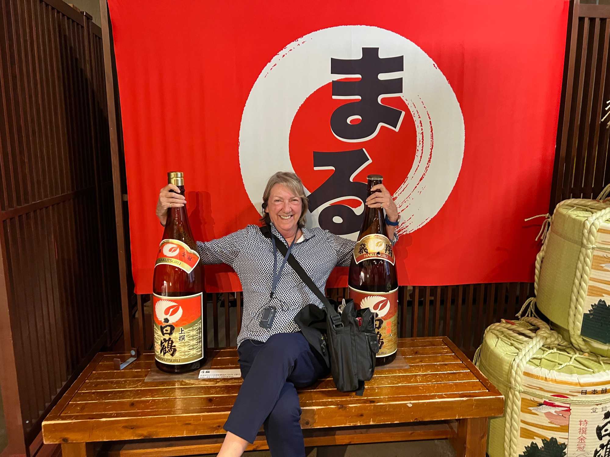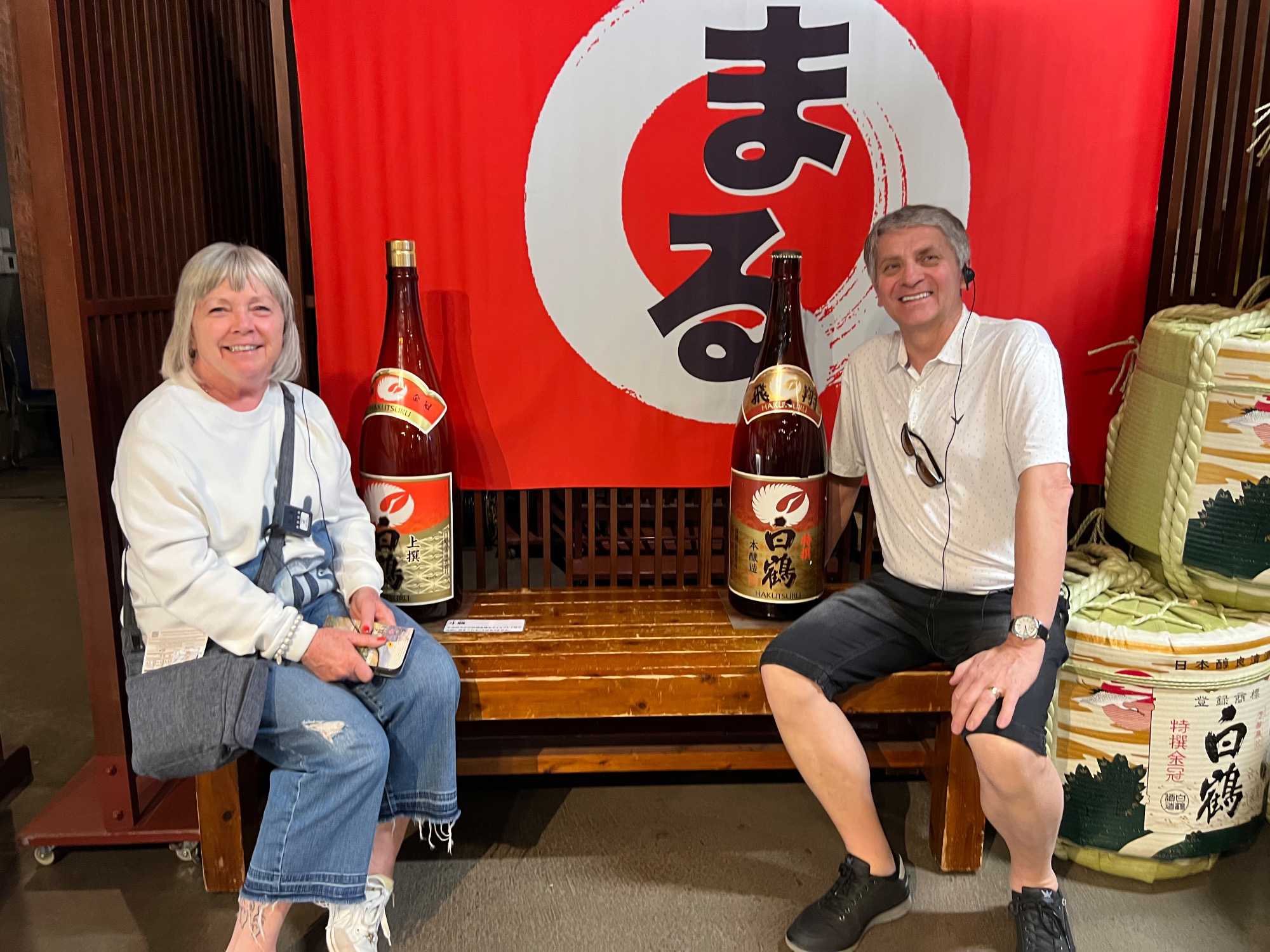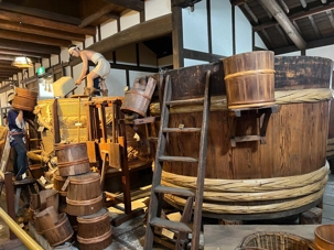 Après le dîner, nous retournons vers Kobe, où une visite du musée du saké Hakutsuru nous attend. On y voit la façon traditionnelle de fabriquer du saké… et une petite dégustation est de mise! Fondée en 1743 à Kobe, Hakutsuru est l'une des plus anciennes et plus grandes brasseries de saké au Japon. Elle produit des sakés élégants, souvent frais et fruités, utilisant l'eau pure du Mont Rokko. Étant donné que la qualité de l’eau utilisée dans le processus de brassage influence la qualité et la saveur du saké, l’utilisation d’une eau aussi pure vise à garantir une boisson au goût supérieur. La visite commence dans l'espace musée, où Jean nous apprend l'histoire et les bases de la fabrication du saké, ainsi que les différentes variétés. Heureusement qu’il nous a donné une bonne formation dans le bus, cela nous permet d’apprécier pleinement la découverte du lieu. Pour tous ceux qui s'intéressent au saké, c'est un aperçu fascinant de la boisson et de la façon dont elle est produite.