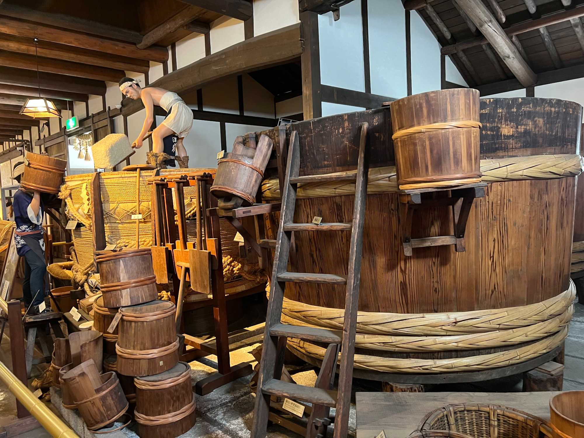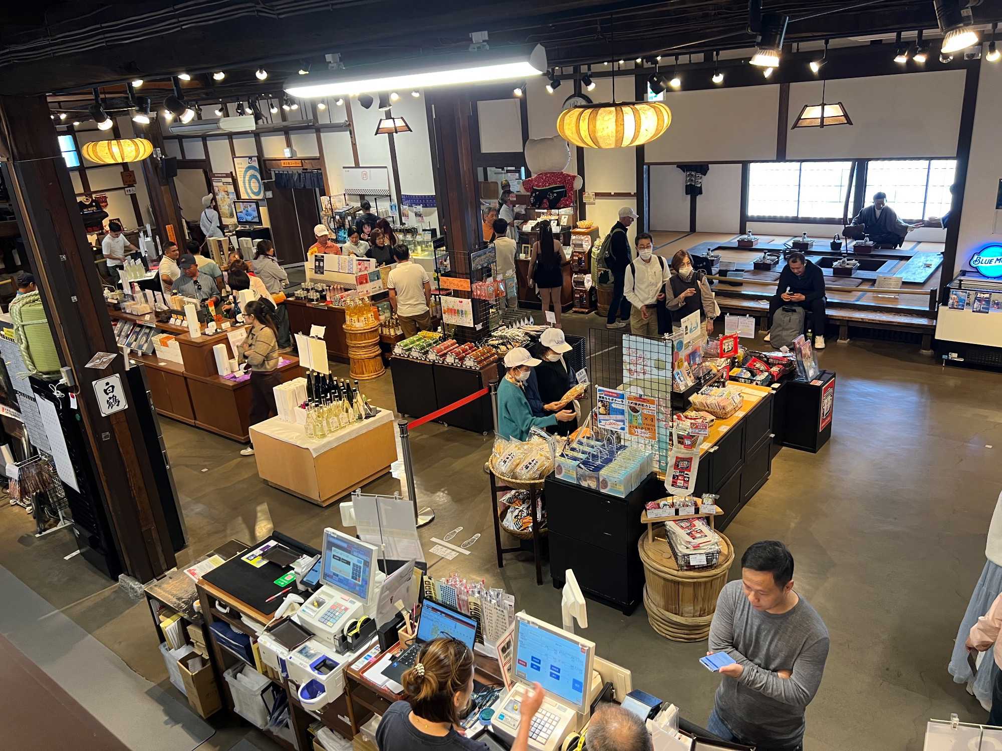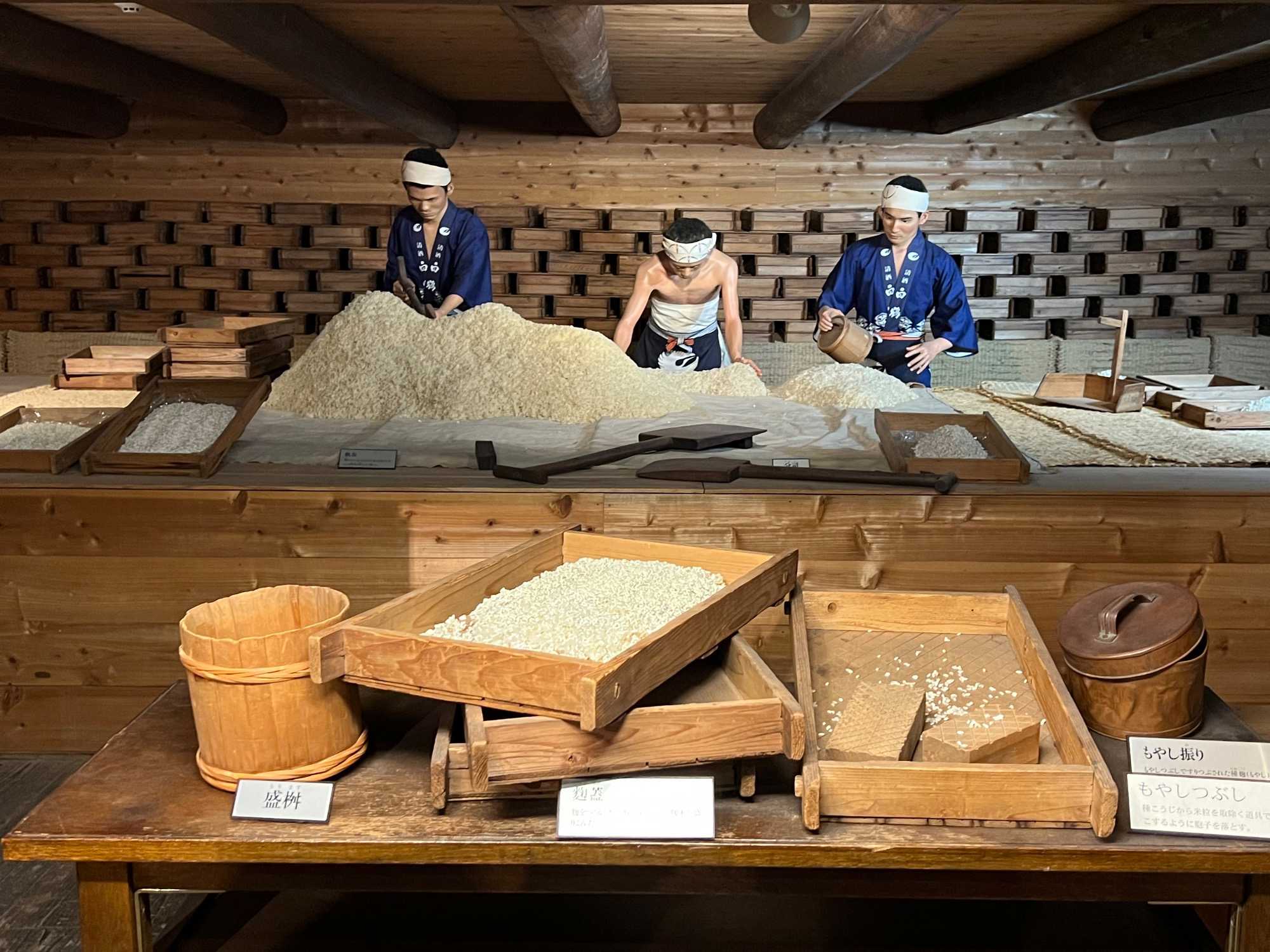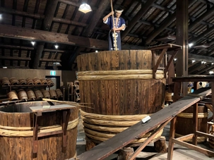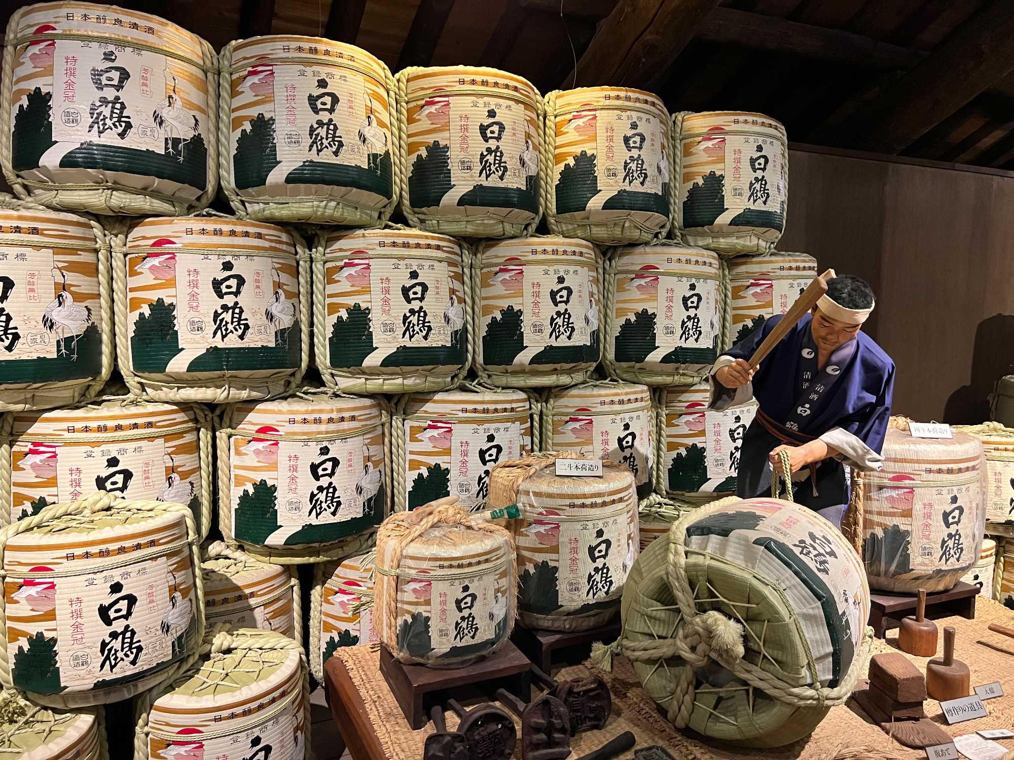 Après le dîner, nous retournons vers Kobe, où une visite du musée du saké Hakutsuru nous attend. On y voit la façon traditionnelle de fabriquer du saké… et une petite dégustation est de mise! Fondée en 1743 à Kobe, Hakutsuru est l'une des plus anciennes et plus grandes brasseries de saké au Japon. Elle produit des sakés élégants, souvent frais et fruités, utilisant l'eau pure du Mont Rokko. Étant donné que la qualité de l’eau utilisée dans le processus de brassage influence la qualité et la saveur du saké, l’utilisation d’une eau aussi pure vise à garantir une boisson au goût supérieur. La visite commence dans l'espace musée, où Jean nous apprend l'histoire et les bases de la fabrication du saké, ainsi que les différentes variétés. Heureusement qu’il nous a donné une bonne formation dans le bus, cela nous permet d’apprécier pleinement la découverte du lieu. Pour tous ceux qui s'intéressent au saké, c'est un aperçu fascinant de la boisson et de la façon dont elle est produite.