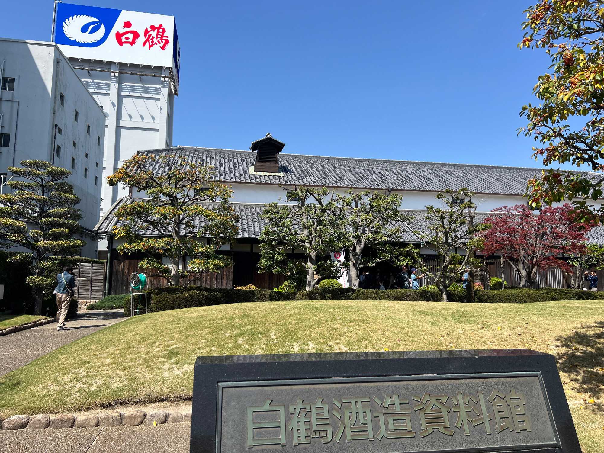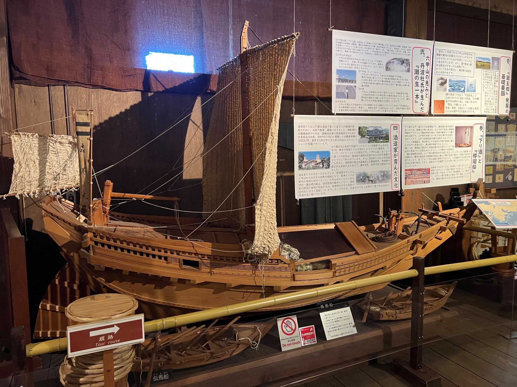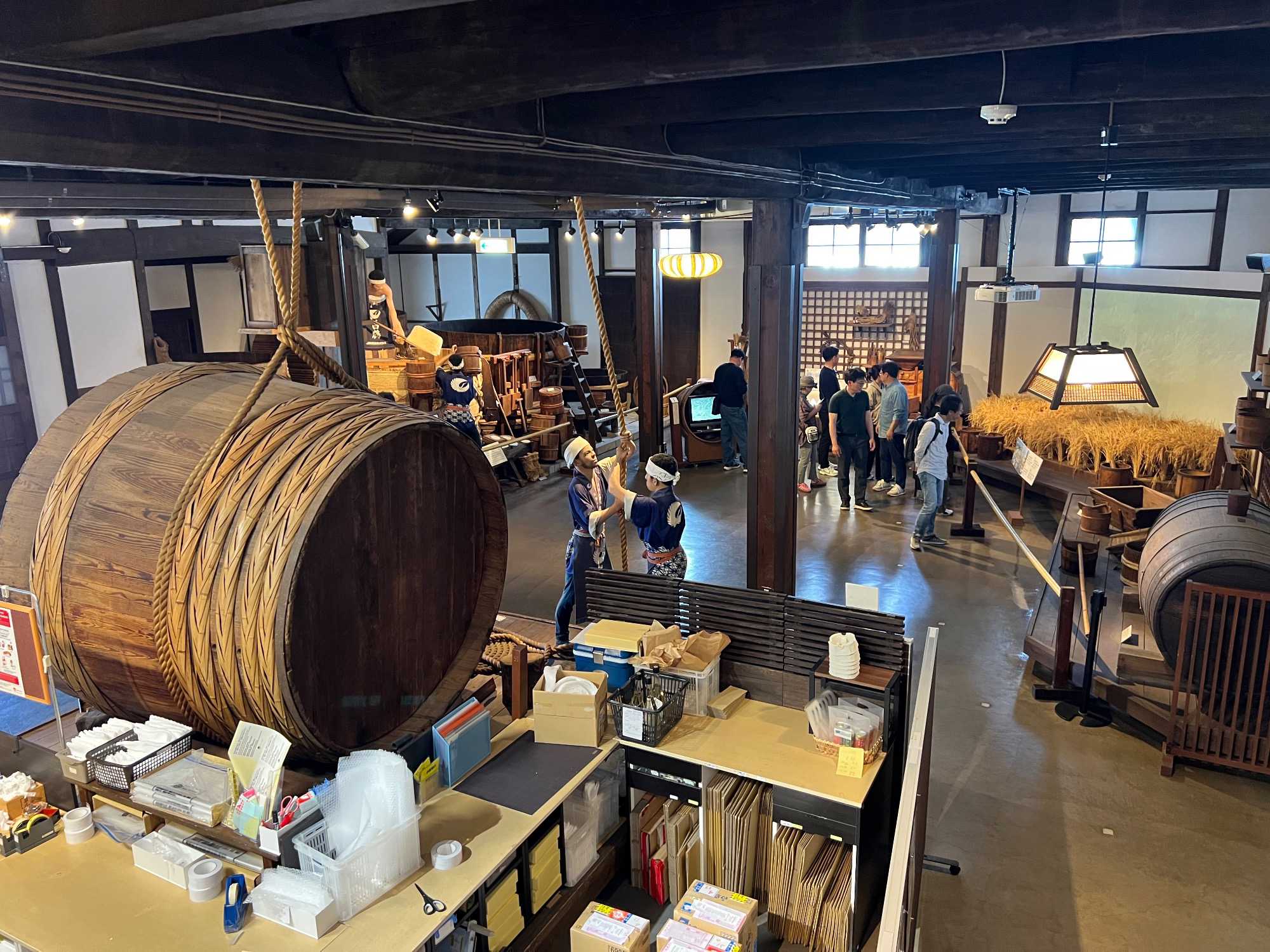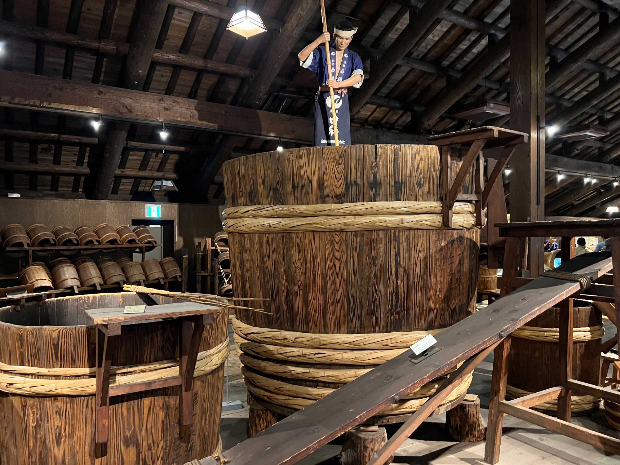 Après le dîner, nous retournons vers Kobe, où une visite du musée du saké Hakutsuru nous attend. On y voit la façon traditionnelle de fabriquer du saké… et une petite dégustation est de mise! Fondée en 1743 à Kobe, Hakutsuru est l'une des plus anciennes et plus grandes brasseries de saké au Japon. Elle produit des sakés élégants, souvent frais et fruités, utilisant l'eau pure du Mont Rokko. Étant donné que la qualité de l’eau utilisée dans le processus de brassage influence la qualité et la saveur du saké, l’utilisation d’une eau aussi pure vise à garantir une boisson au goût supérieur. La visite commence dans l'espace musée, où Jean nous apprend l'histoire et les bases de la fabrication du saké, ainsi que les différentes variétés. Heureusement qu’il nous a donné une bonne formation dans le bus, cela nous permet d’apprécier pleinement la découverte du lieu. Pour tous ceux qui s'intéressent au saké, c'est un aperçu fascinant de la boisson et de la façon dont elle est produite.