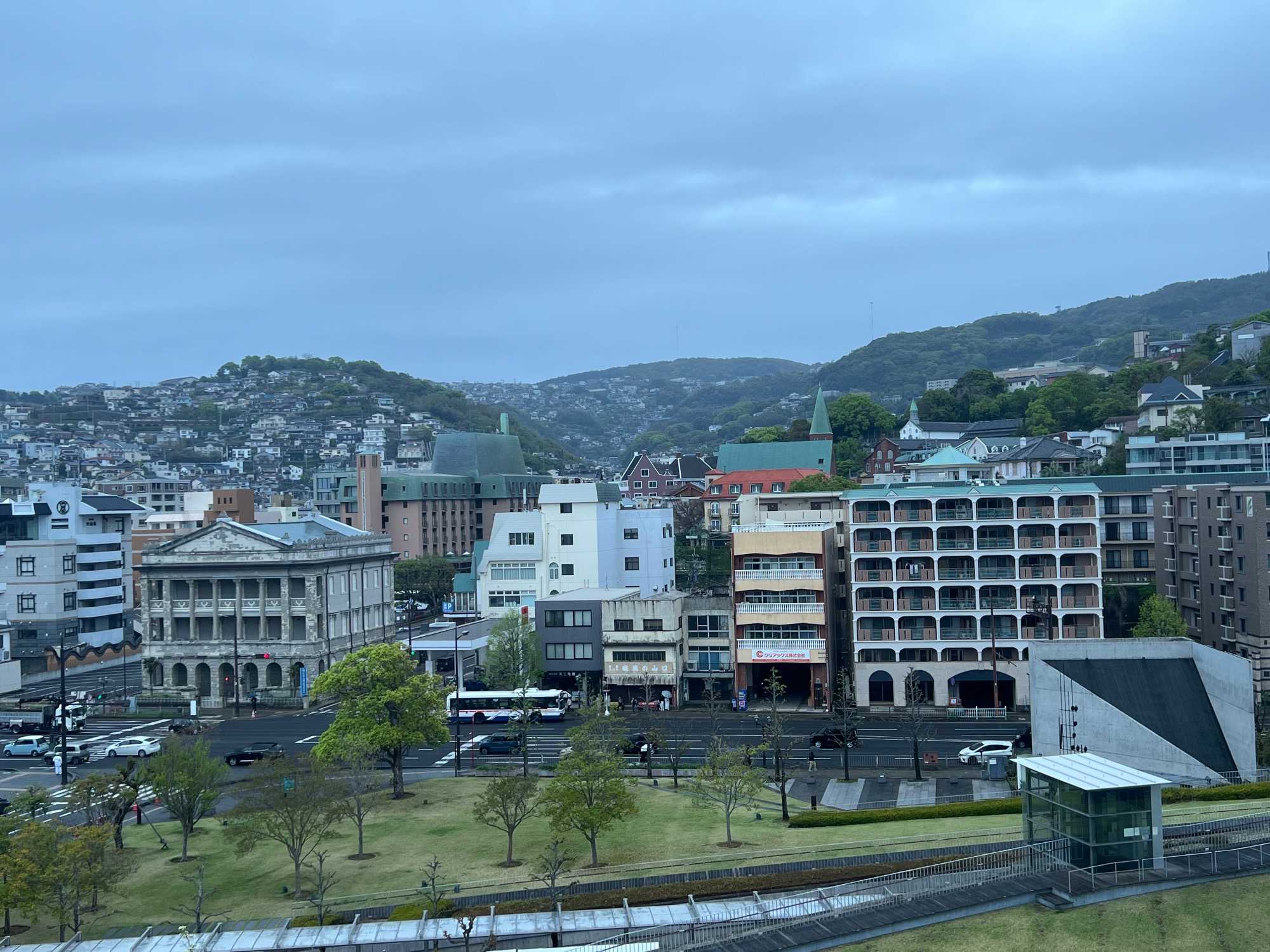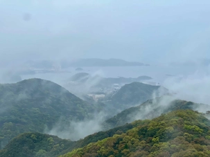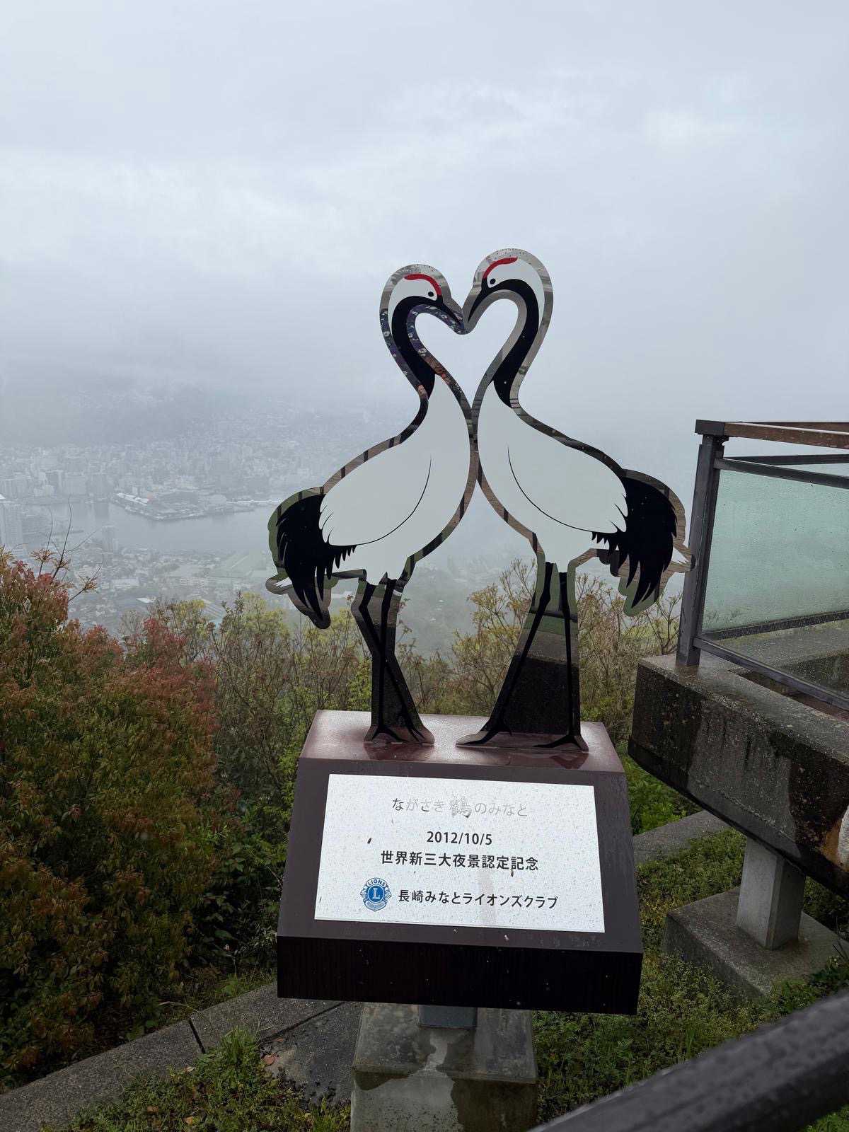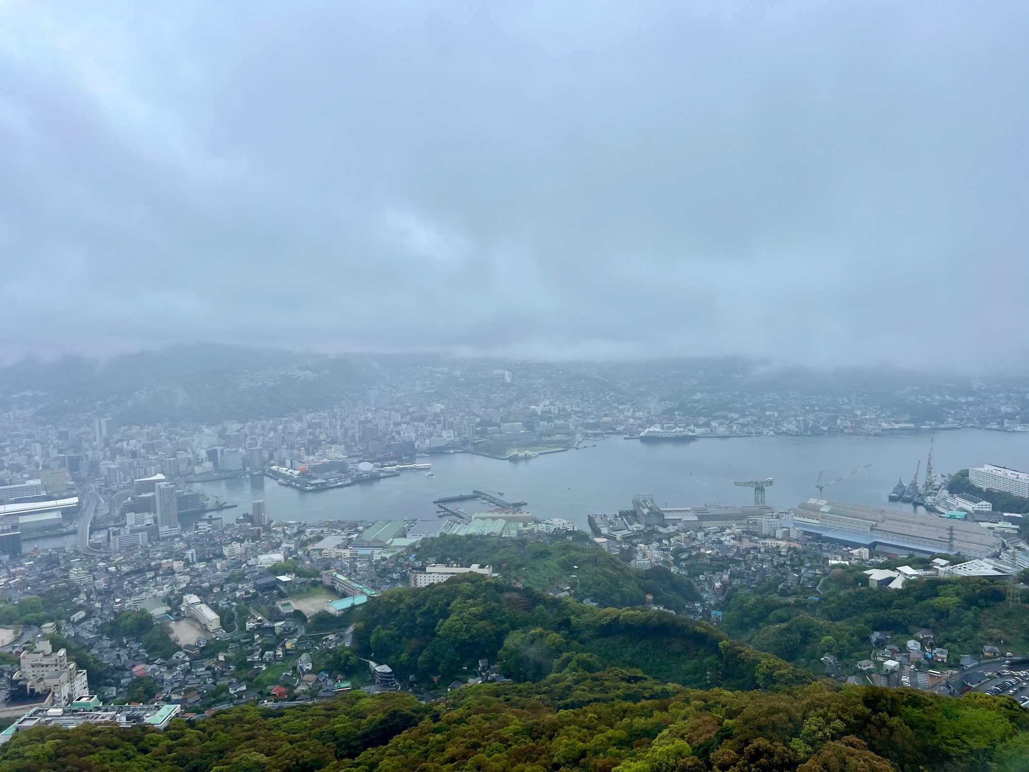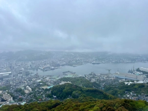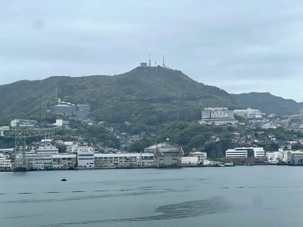 La visite prend ensuite de la hauteur avec l’ascension en téléphérique vers le mont Inasa. De là-haut, le regard s’ouvre sur un panorama exceptionnel à 360 degrés : la ville de Nagasaki, son port en forme d’amphithéâtre naturel, ses collines verdoyantes et son front de mer animé forment un tableau très joli. Les nuages et la brume étaient de la partie, mais on a quand même pu avoir un bel aperçu.