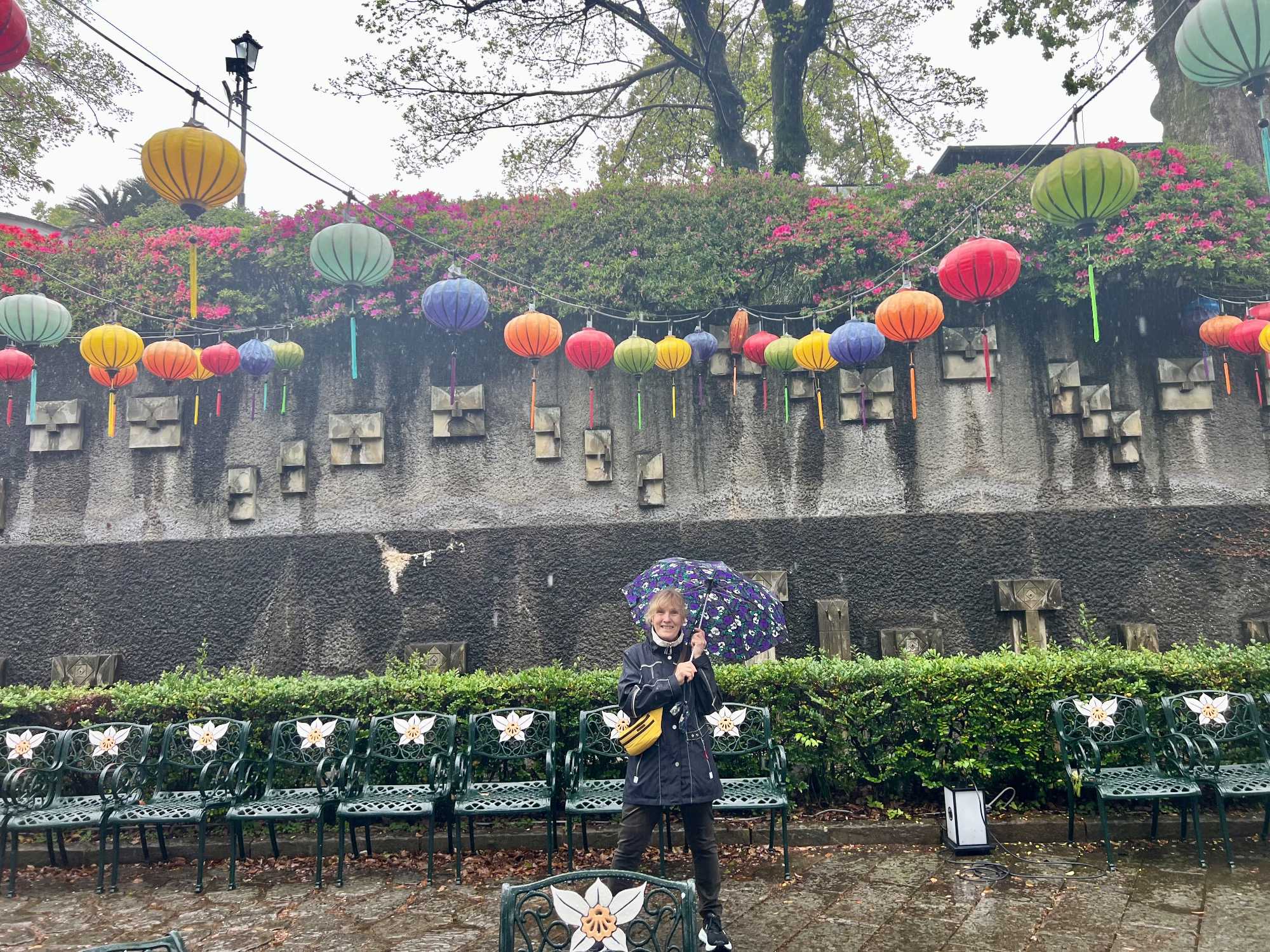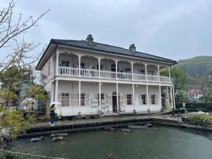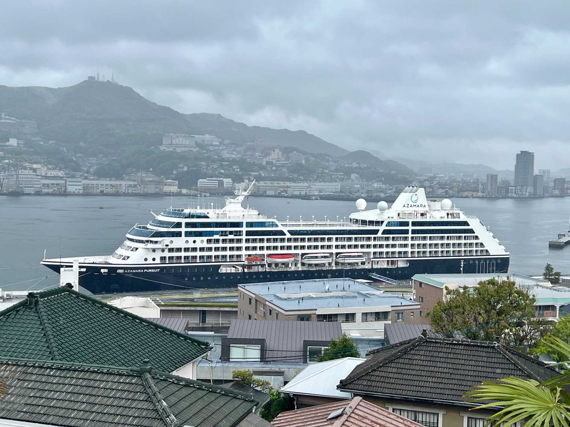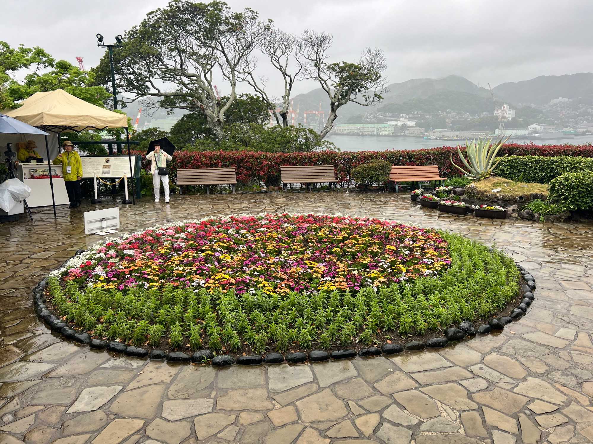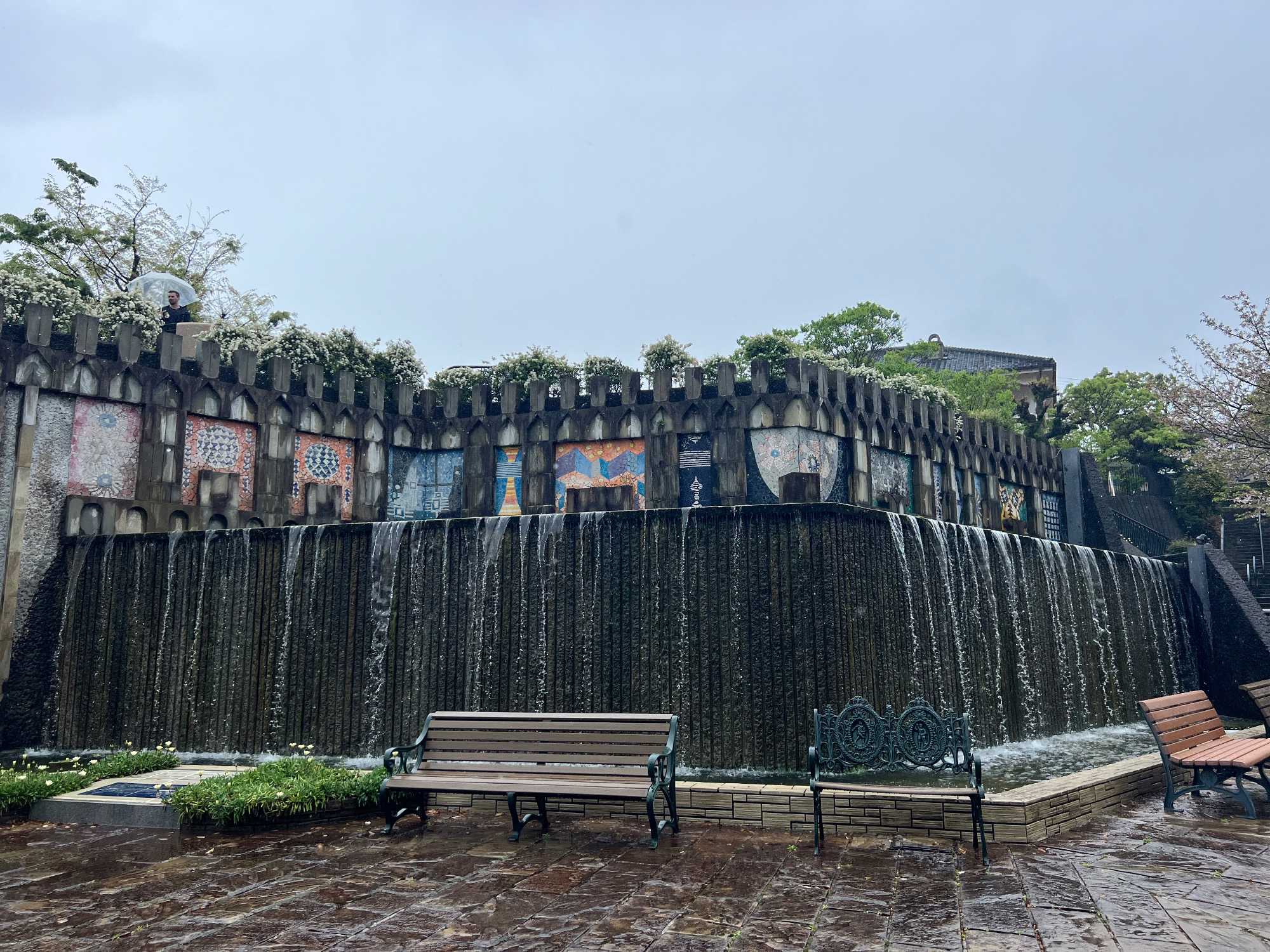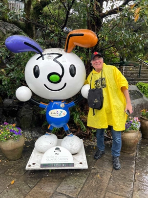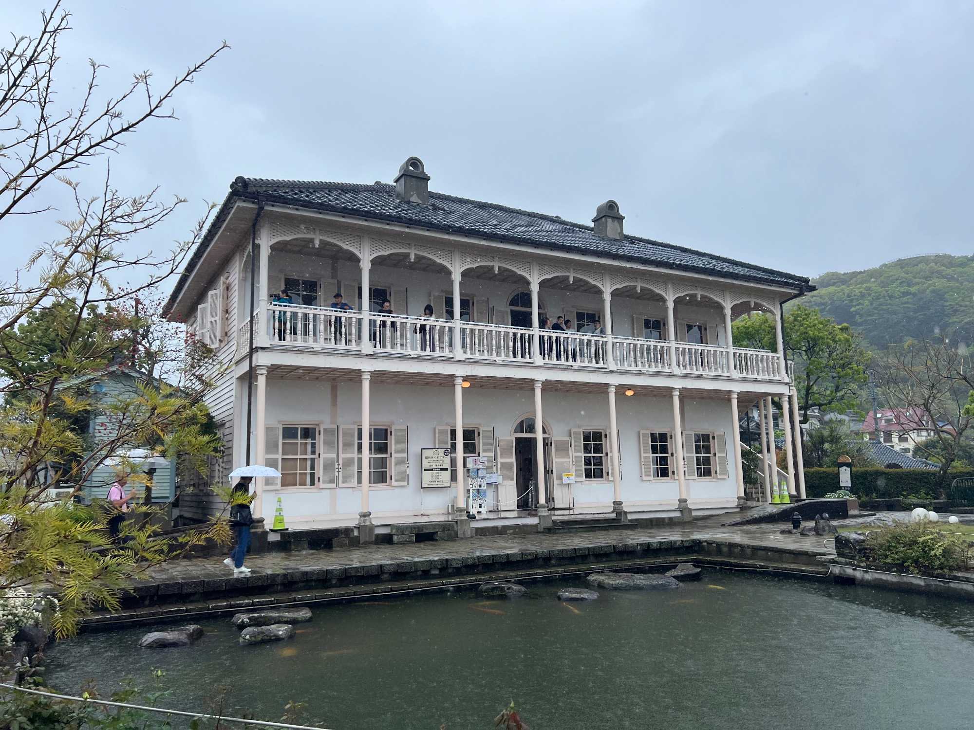 La découverte se poursuit pour les autres au jardin Glover, véritable havre de paix et d’histoire. Ce parc enchanteur abrite neuf maisons coloniales européennes du XIXè siècle, témoins du passé international de Nagasaki, dont la Résidence Glover, une maison de style occidental, la plus ancienne au Japon et importante attraction touristique. Devenu un musée d'architecture à ciel ouvert, ces résidences, admirablement conservées, évoquent l’époque où la ville était l’un des rares ports japonais ouverts au commerce étranger. Le jardin est vraiment magnifique mais nous passons assez rapidement, la pluie étant de plus en plus forte. Après la visite, nous perdons encore d’autres joueurs qui retournent manger sur le navire.