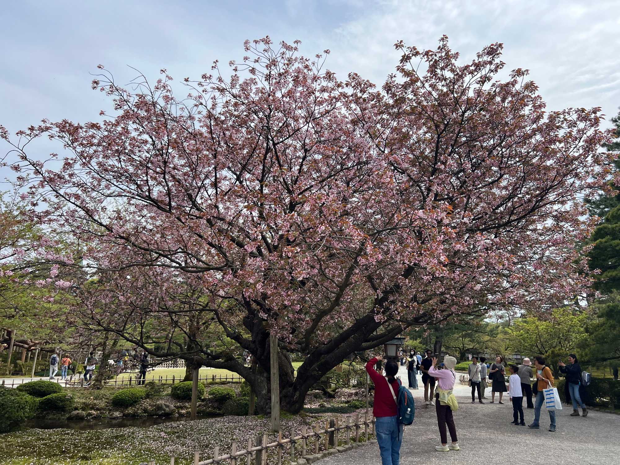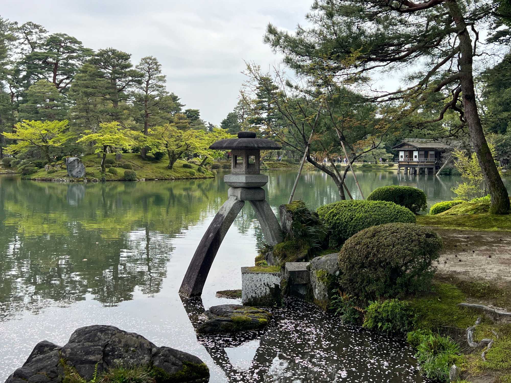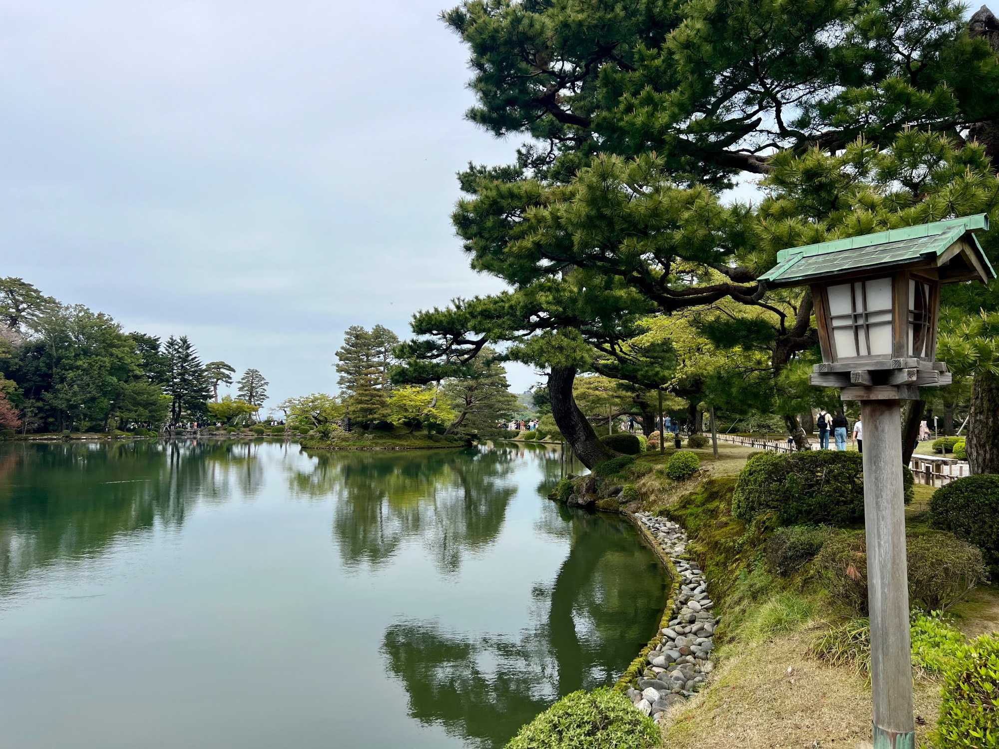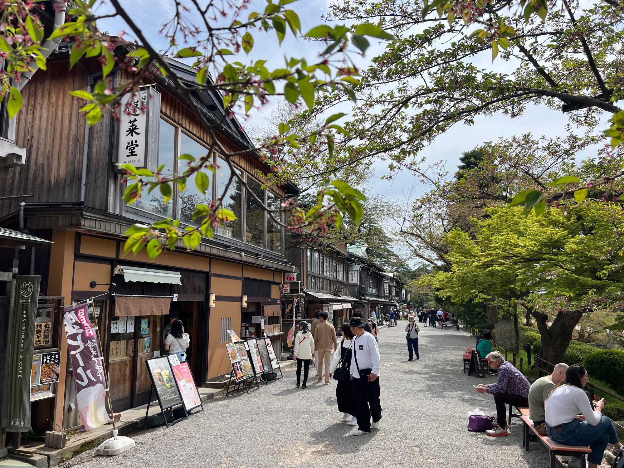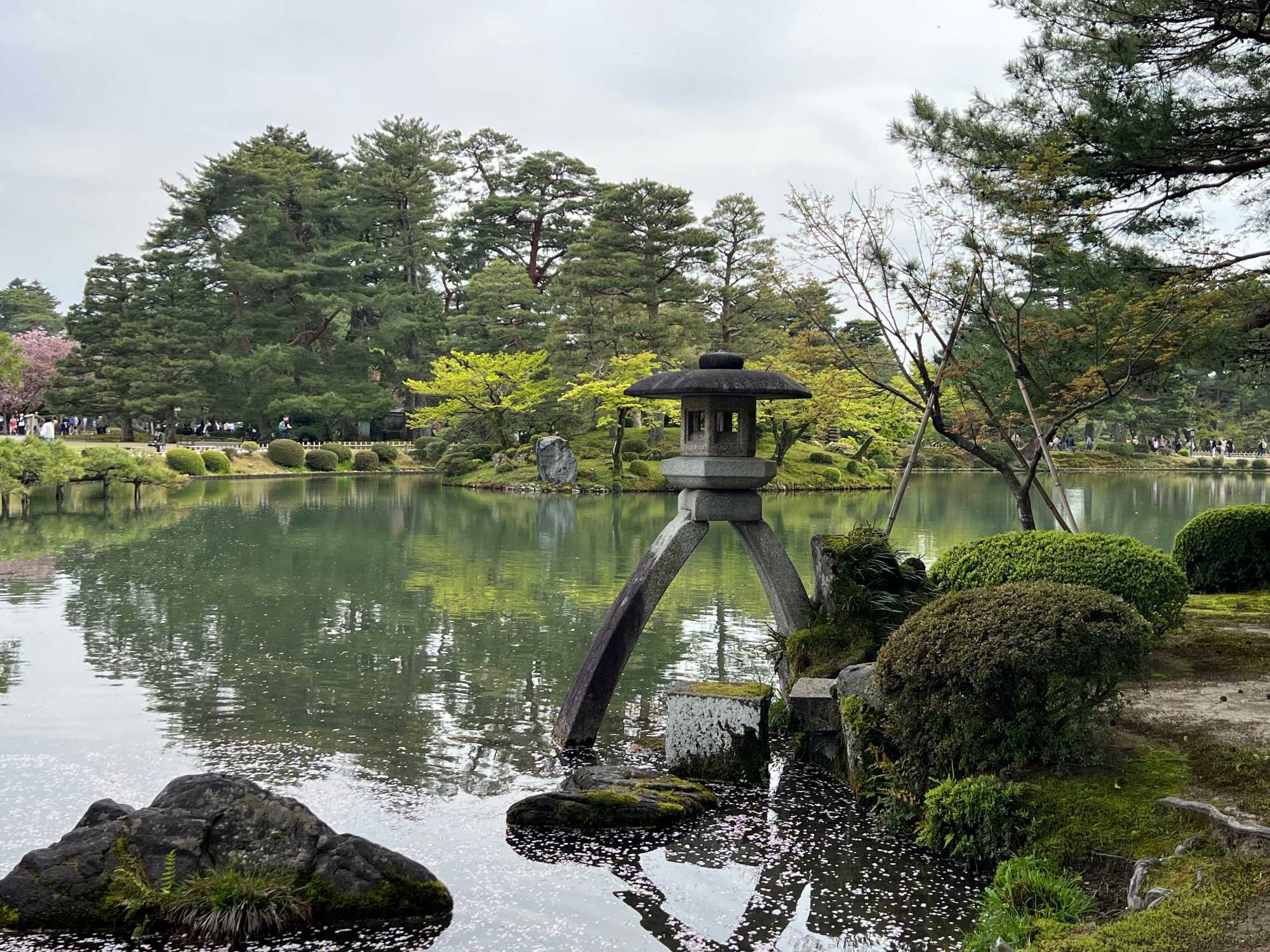 Il ne fallait surtout pas manquer la visite de l’un des 3 plus beaux jardins du Japon, celui de Kenrokuen. Niché au coeur de Kanazawa, il jouit d’une histoire prestigieuse façonnée sur plusieurs siècles par la famille Maeda. Le parc, situé sur une colline, est un vrai havre de paix malgré la présence de plusieurs touristes. Sous le nom évocateur de « jardin combinant six caractéristiques », Kenrokuen incarne l’espace, la quiétude, l’artifice, l’ancienneté, les points d’eau et les panoramas. Rares sont les jardins à rassembler ces six éléments, mais Kenrokuen en fait la démonstration. Parmi les points d’intérêt incontournables, on distingue le symbole du jardin, la lanterne Kotojitoro, aux deux pieds caractéristiques. L’ensemble des éléments d’un jardin japonais traditionnel y sont présents : étangs, lanternes, chemins en pierre, cascades, ponts, ruisseaux, salons de thé et collines artificielles. Chaque saison révèle un visage nouveau à Kenrokuen. Nous avons la chance de voir encore de magnifiques cerisiers en fleurs. Nous passons un excellent moment dans ce jardin avec du temps libre pour se promener à notre guise.