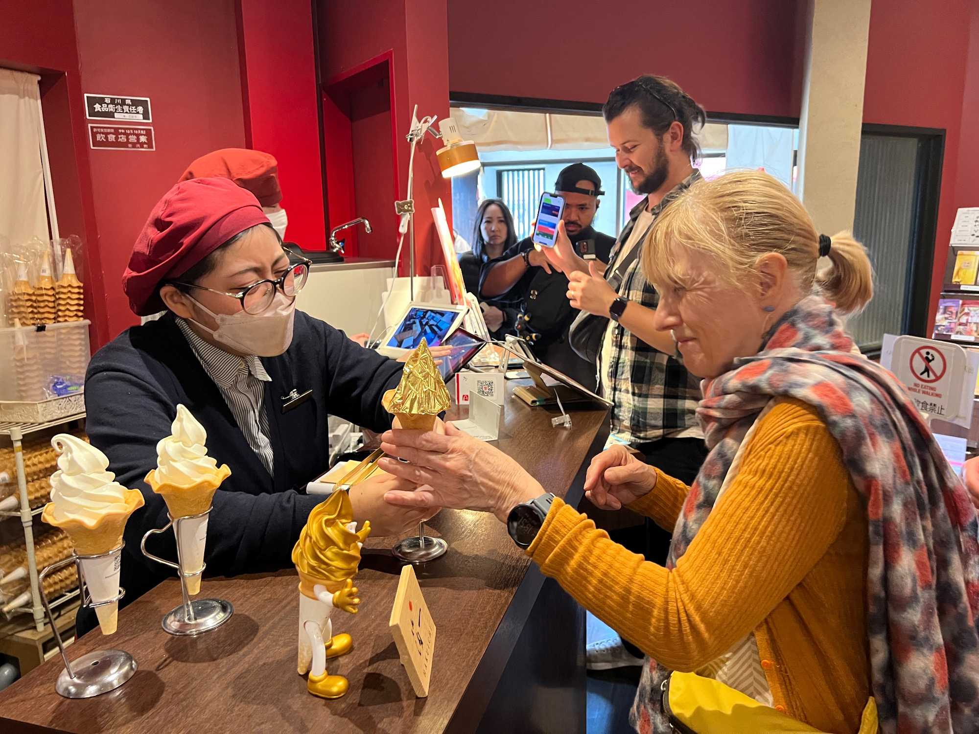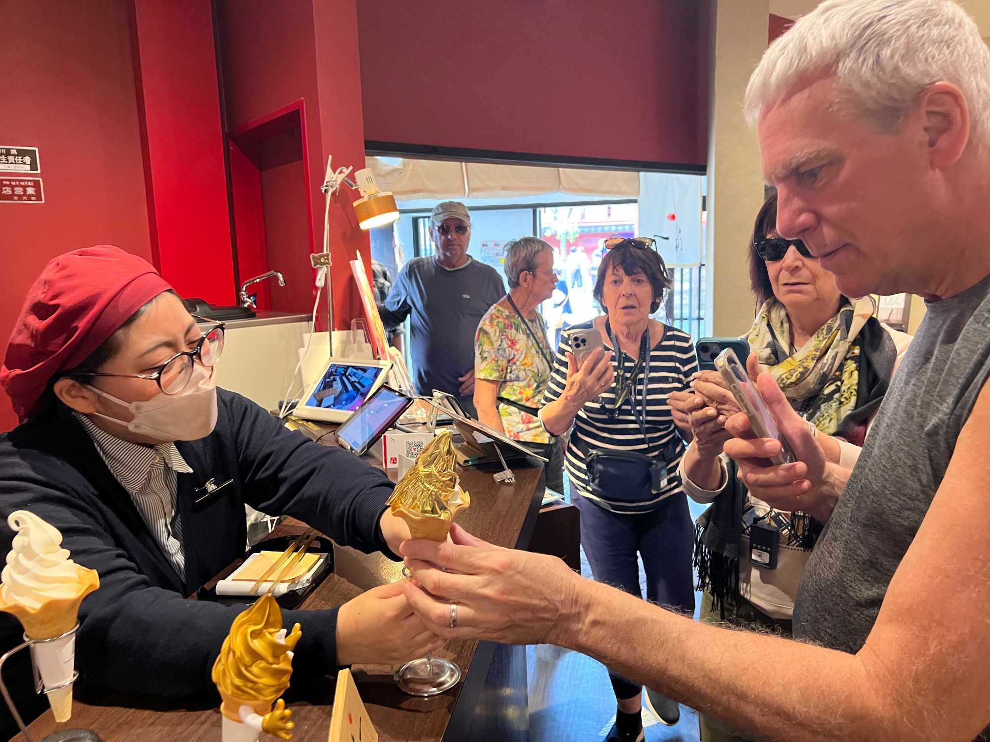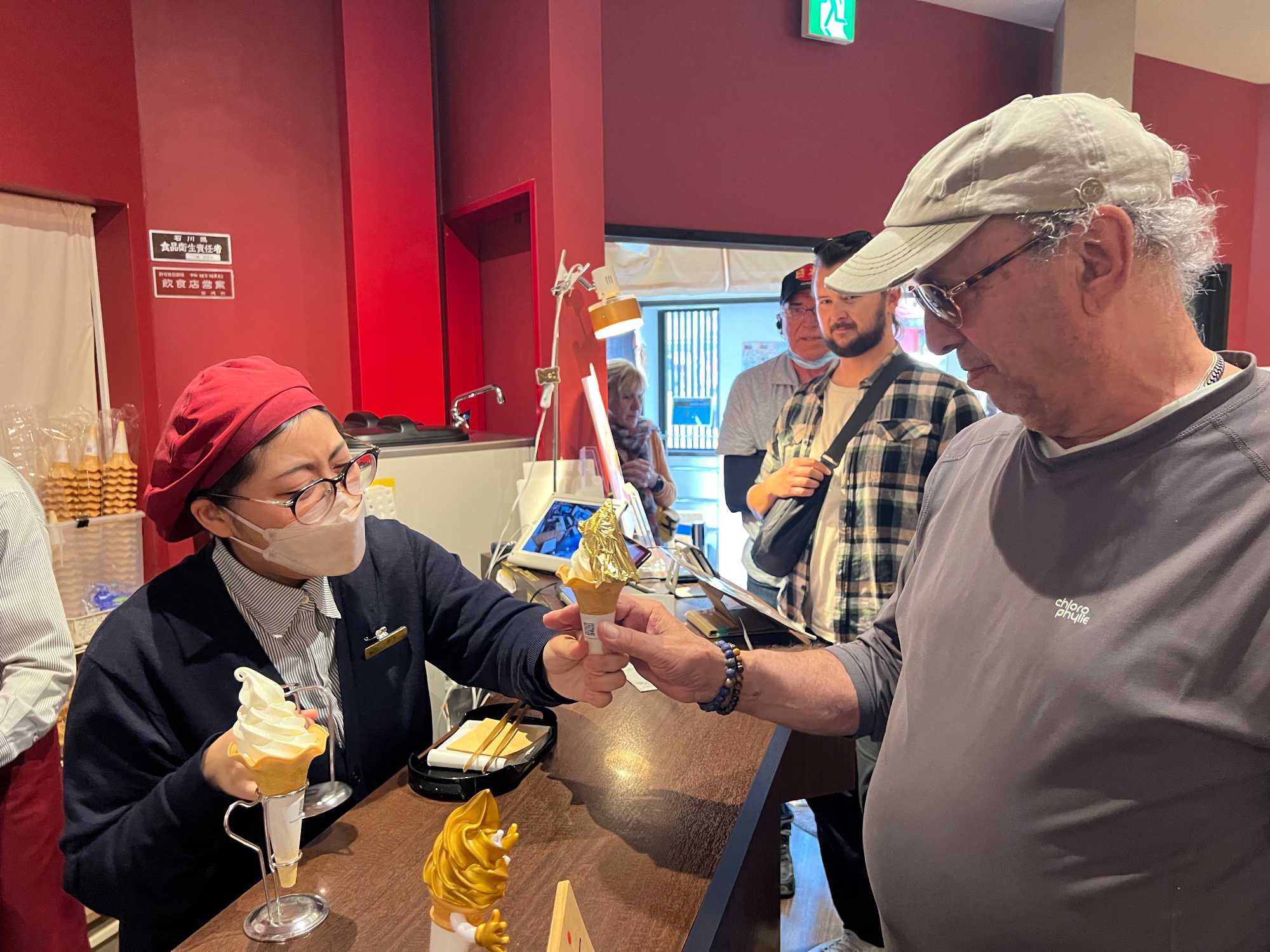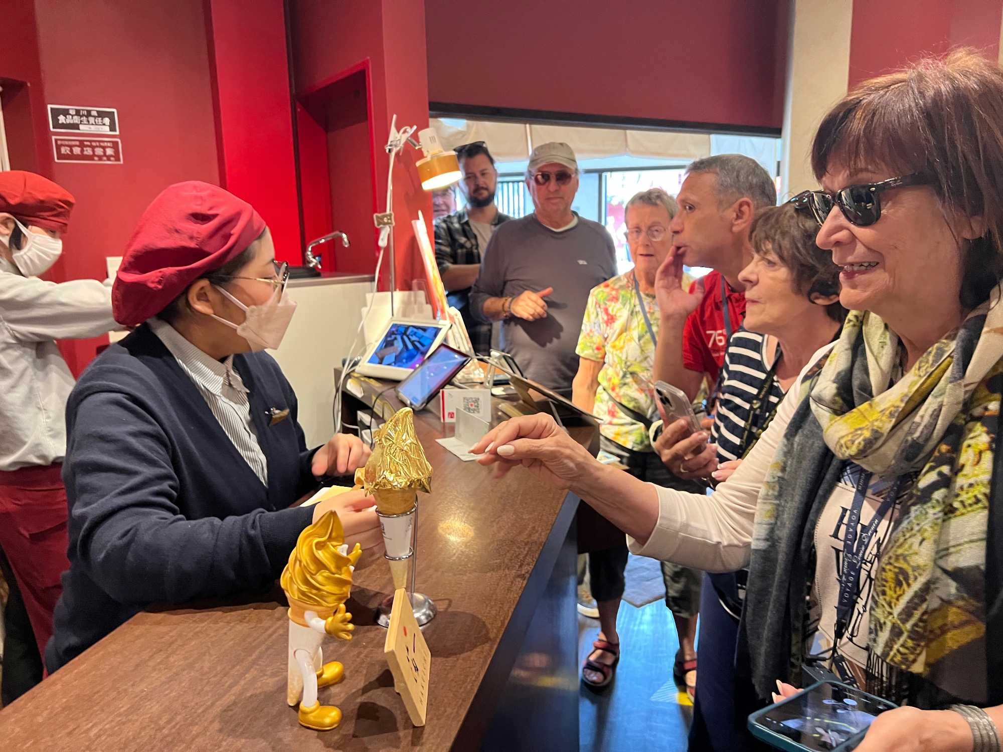 Kanazawa est connue aussi pour sa technique de feuilles en or très fines qui remonte à la fin du 16è siècle et au début du 17è siècle. On retrouve même à Kanazawa des crèmes glacées molles sur lesquelles on met de l’or comestible… Jean nous dit que de manger cette glace, c’est comme manger de la poutine lorsque l’on visite le Québec: un incontournable! Alors il ne m’en faut pas plus pour offrir une crème glacée en or à tous mes voyageurs! Ce fut délicieux et ils ont bien apprécié.
