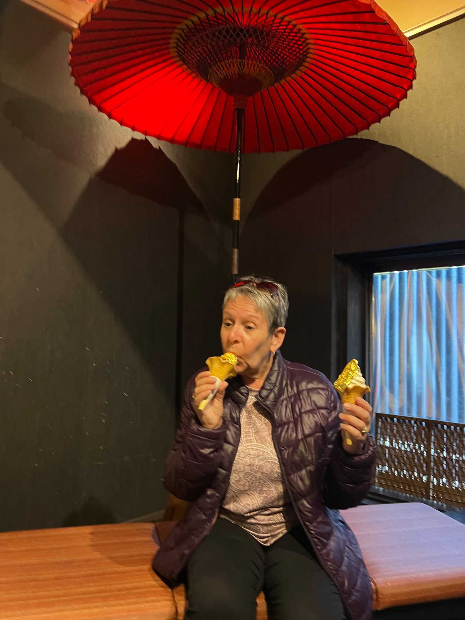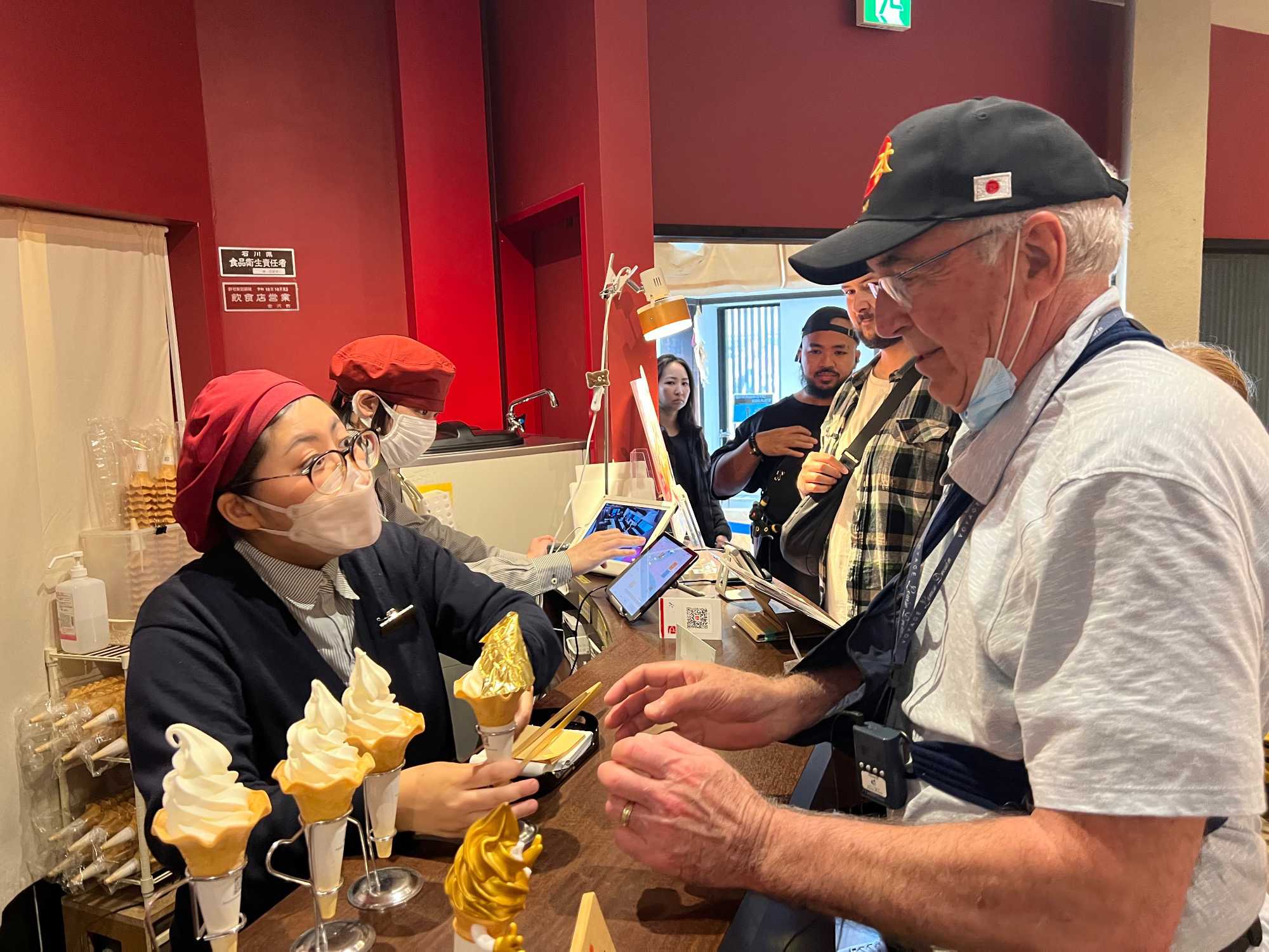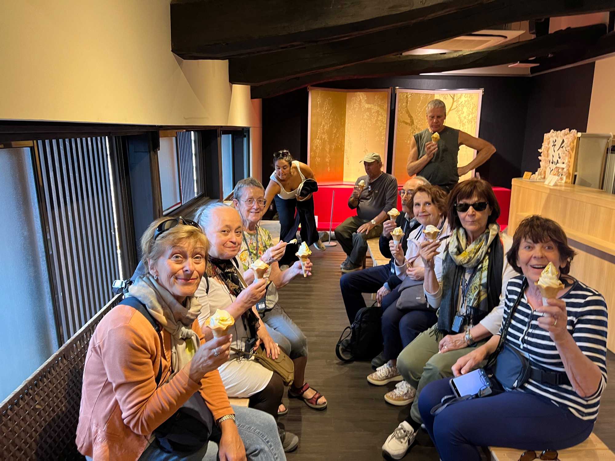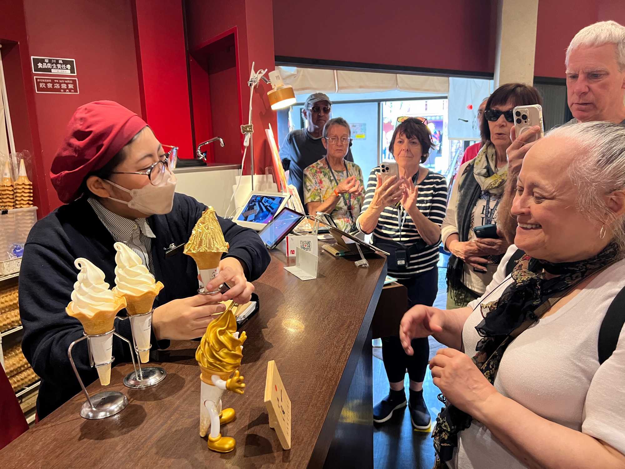 Kanazawa est connue aussi pour sa technique de feuilles en or très fines qui remonte à la fin du 16è siècle et au début du 17è siècle. On retrouve même à Kanazawa des crèmes glacées molles sur lesquelles on met de l’or comestible… Jean nous dit que de manger cette glace, c’est comme manger de la poutine lorsque l’on visite le Québec: un incontournable! Alors il ne m’en faut pas plus pour offrir une crème glacée en or à tous mes voyageurs! Ce fut délicieux et ils ont bien apprécié.