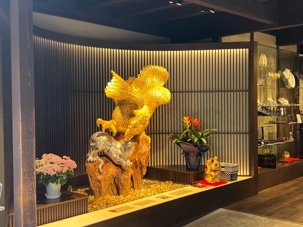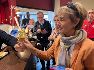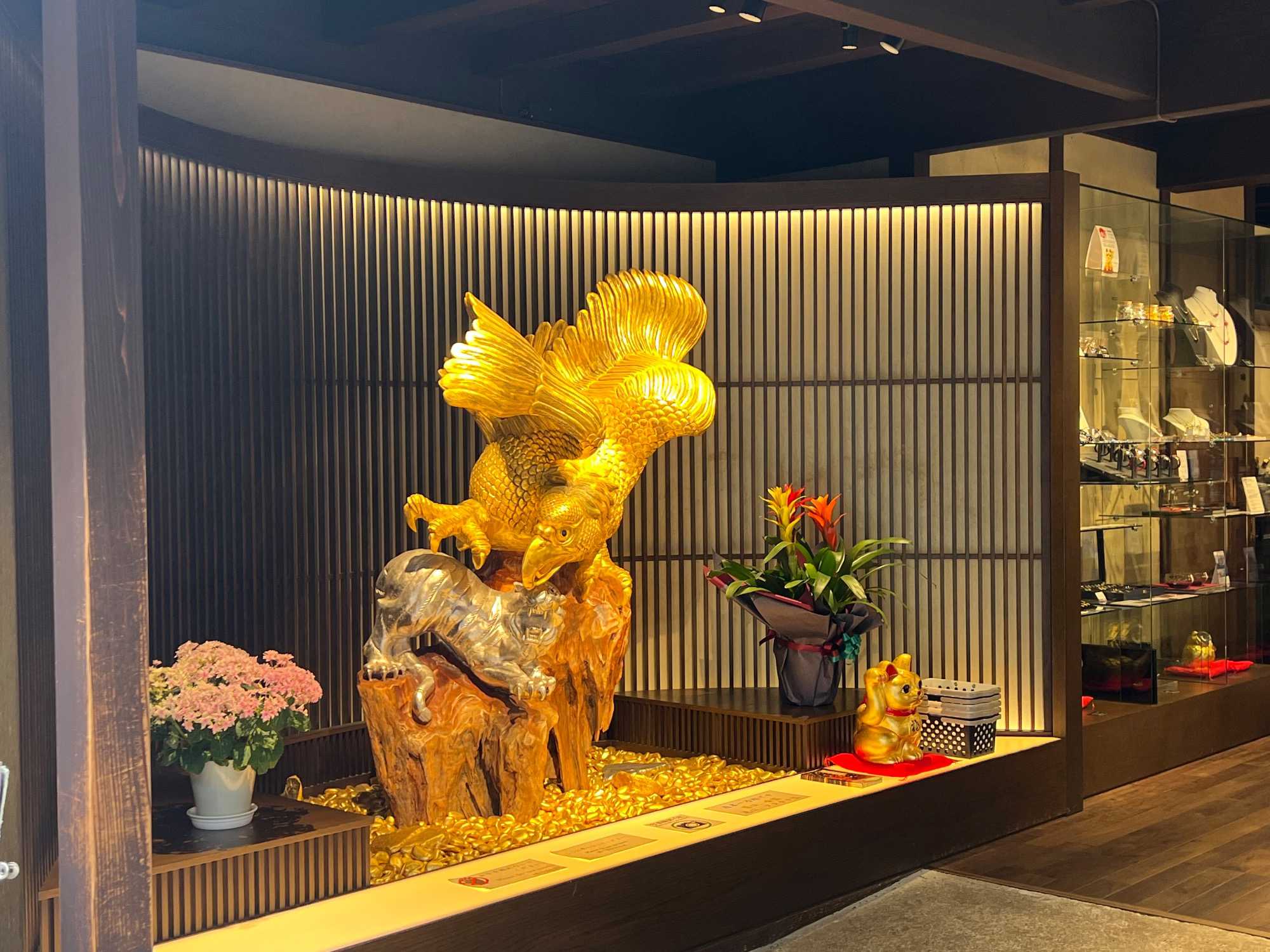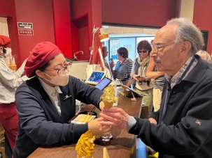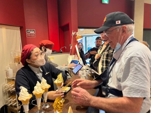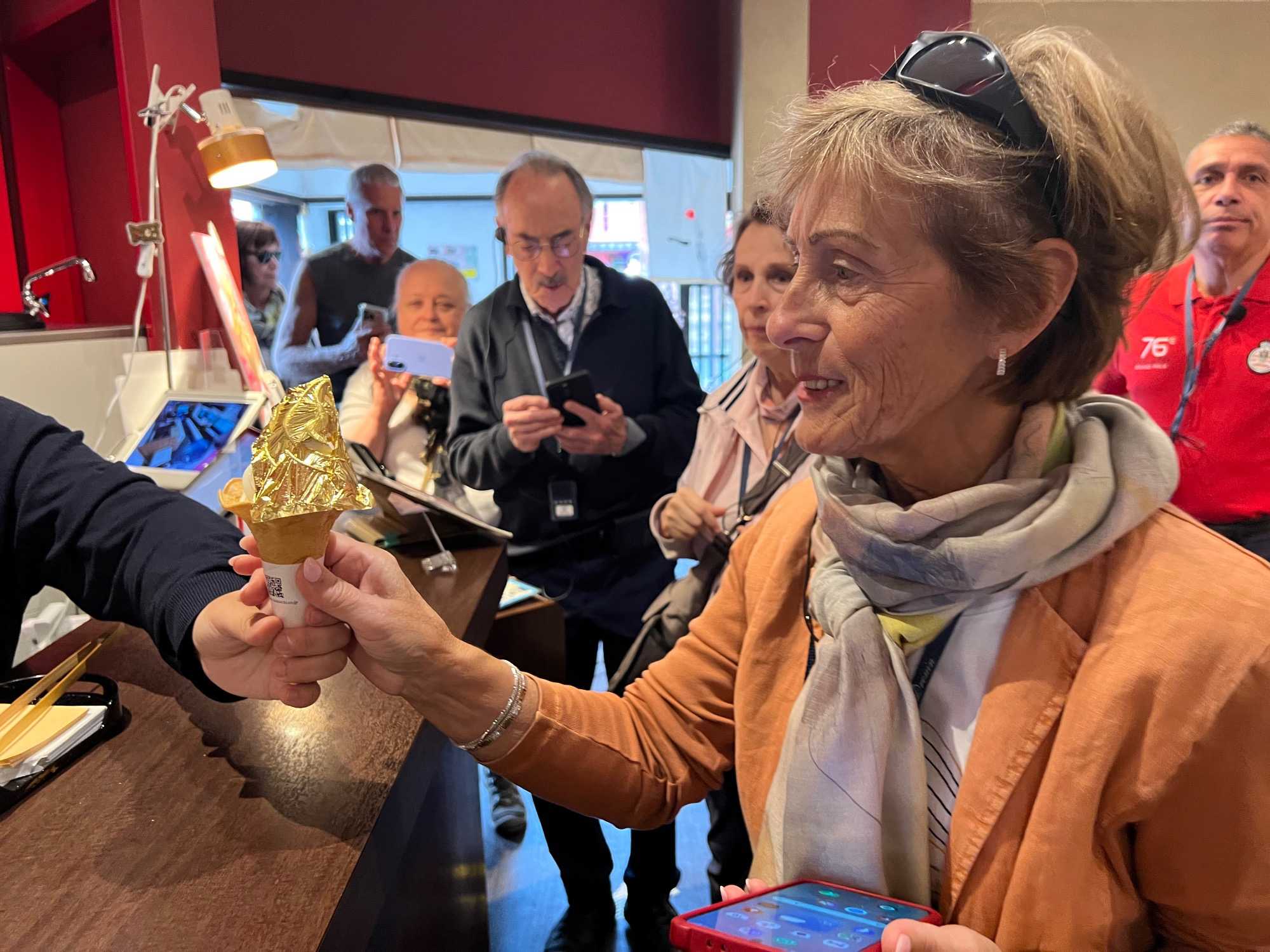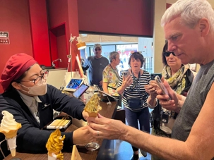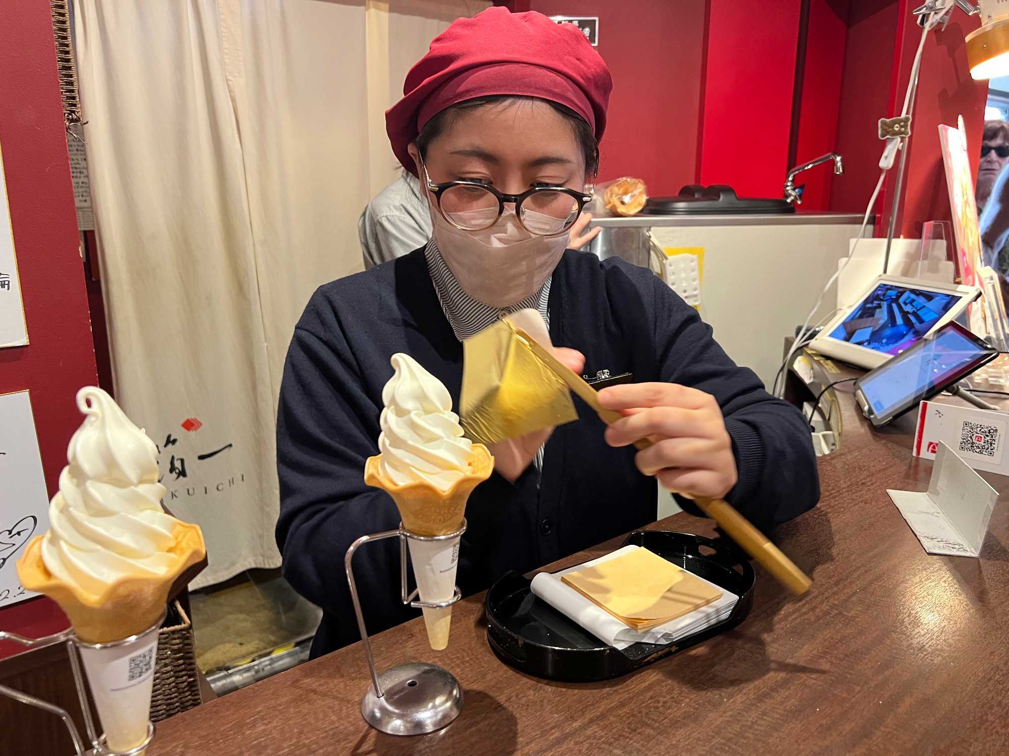 Kanazawa est connue aussi pour sa technique de feuilles en or très fines qui remonte à la fin du 16è siècle et au début du 17è siècle. On retrouve même à Kanazawa des crèmes glacées molles sur lesquelles on met de l’or comestible… Jean nous dit que de manger cette glace, c’est comme manger de la poutine lorsque l’on visite le Québec: un incontournable! Alors il ne m’en faut pas plus pour offrir une crème glacée en or à tous mes voyageurs! Ce fut délicieux et ils ont bien apprécié.