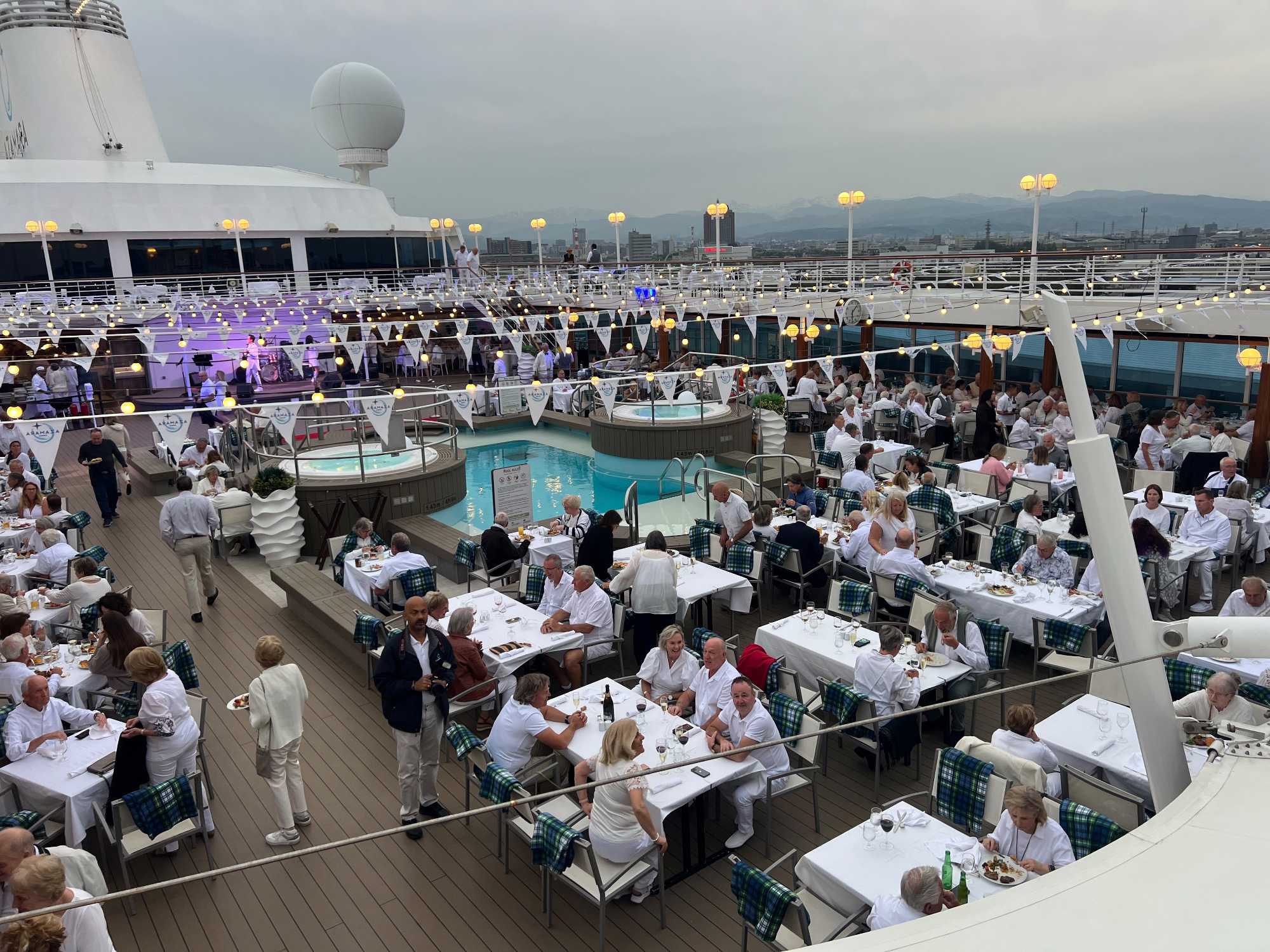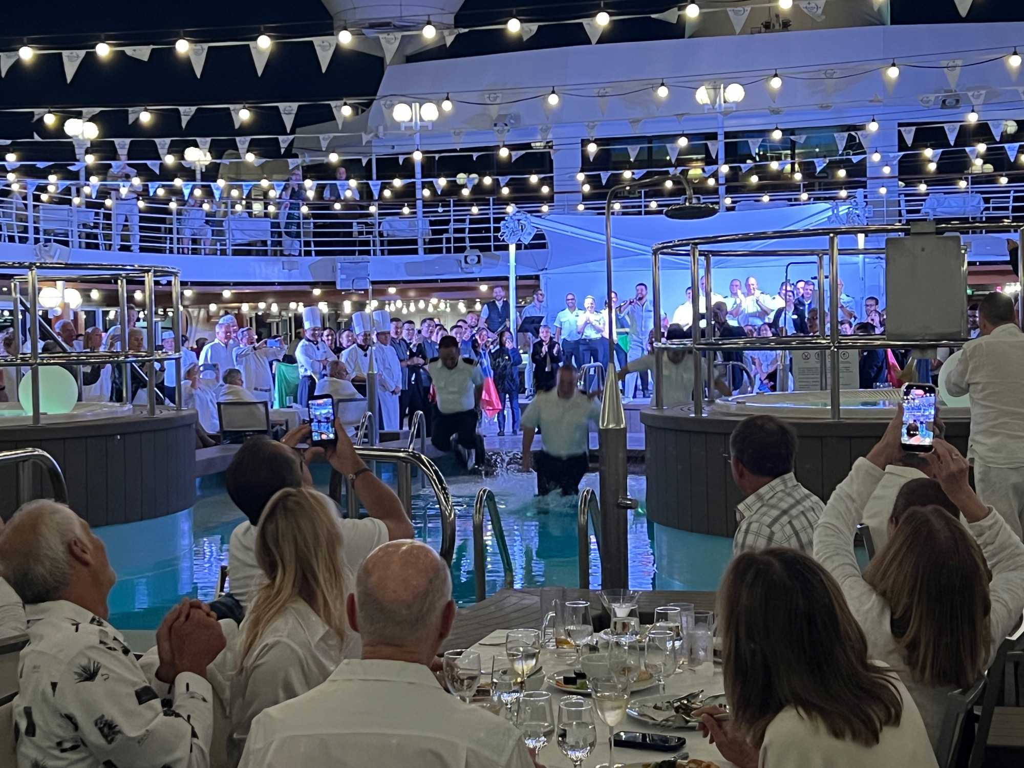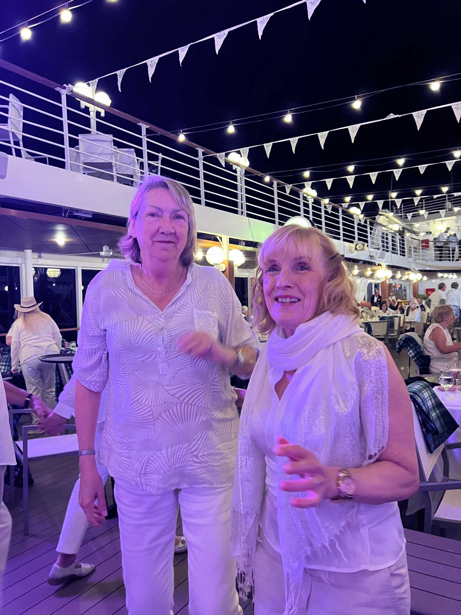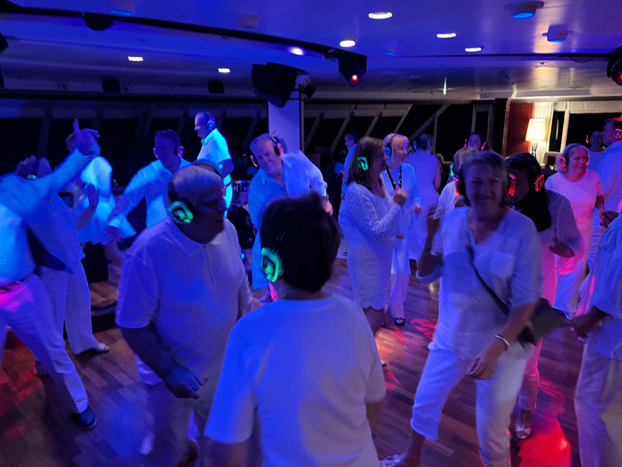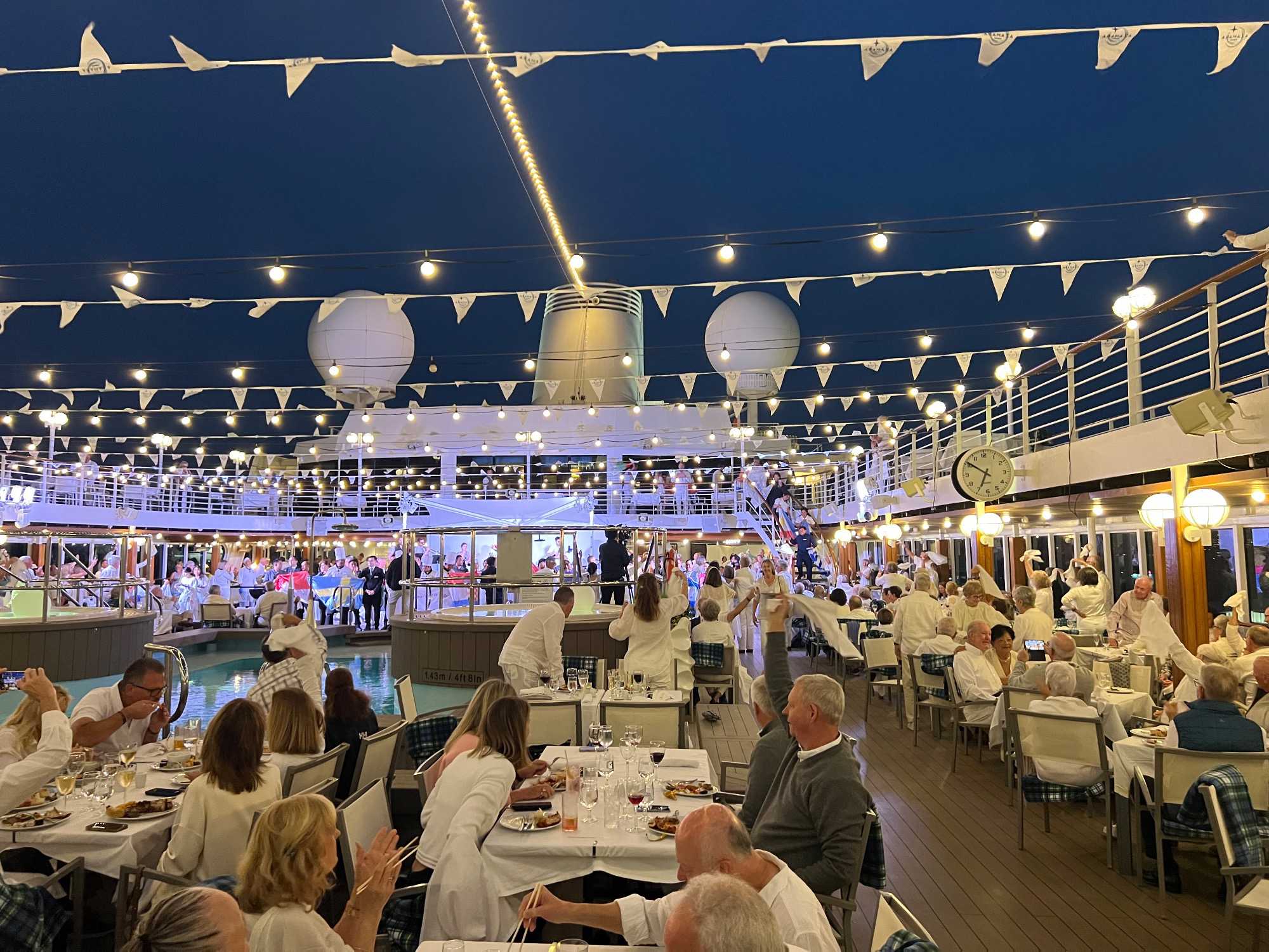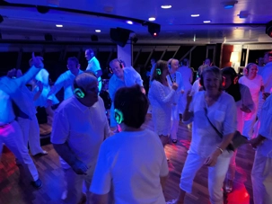 Nous retournons au navire pour une soirée très spéciale. En effet, ce soir, c’est une soirée en blanc. BBQ et musique: tout se passe sur le pont extérieur où se trouve la piscine. Les employés ont travaillé sans relâche pour nous offrir une magnifique soirée. Tout le monde est habillé en blanc, ça fait très joli. Tous les employés du navire ont contribué au festin: même le capitaine du navire était attitré aux crêpes suzettes! La musique nous a fait dansé (du moins Marie, Louise C et moi). La soirée ne se terminait pas ainsi: à 20h30, nous avions une disco silencieuse. C’est très drôle: chacun a un écouteur sur les oreilles et il y a trois postes de musiques différentes, donc chacun danse et chante sur son choix de musique. En plus de Marie et Louise C, j’ai eu d’autres supporteurs qui sont venus danser avec moi: Anne, Louise P, Jeanne, Denis et pour un bref instant, Mario. On a eu beaucoup de plaisirs… Ouf! Quelle superbe journée! On en profite au maximum!