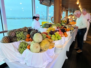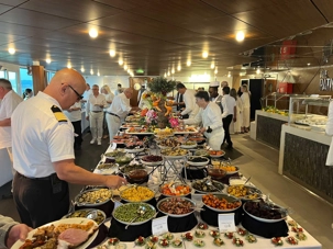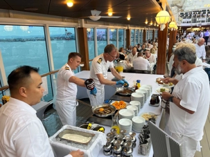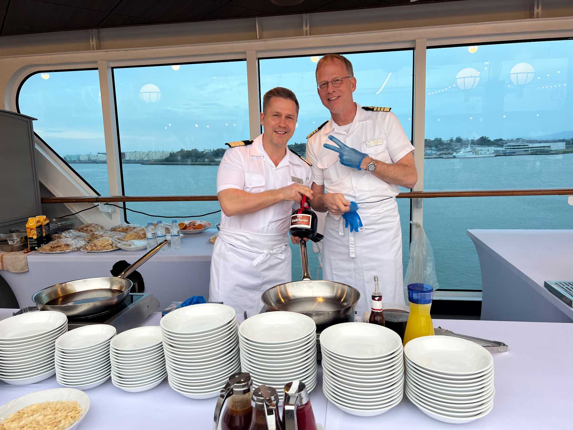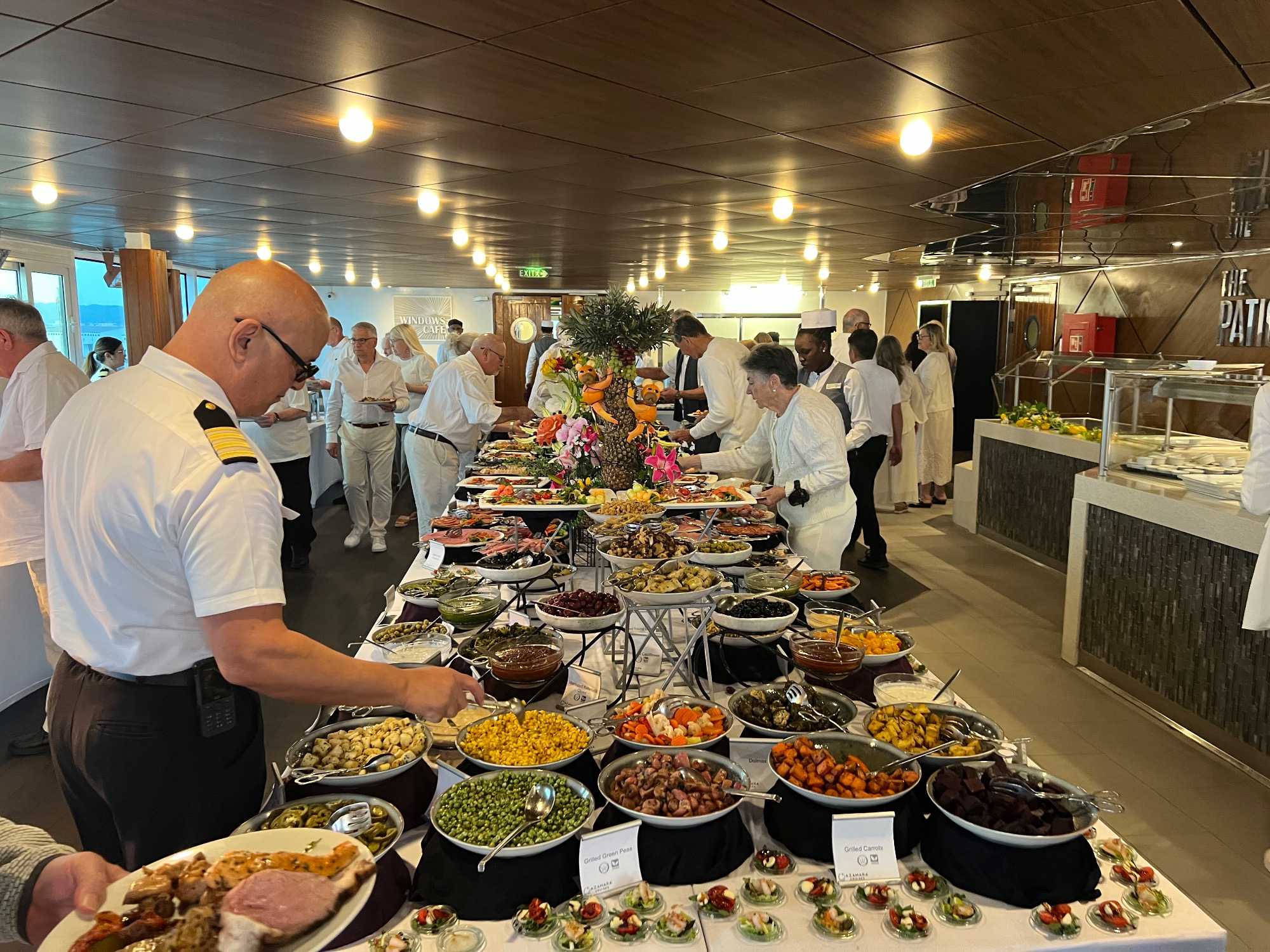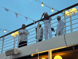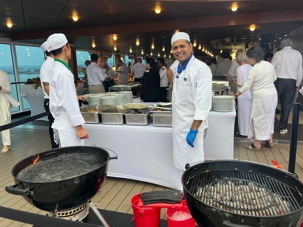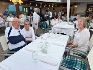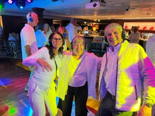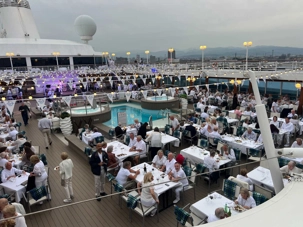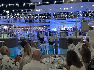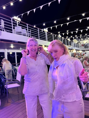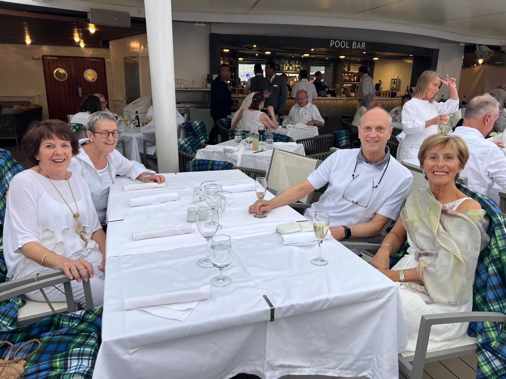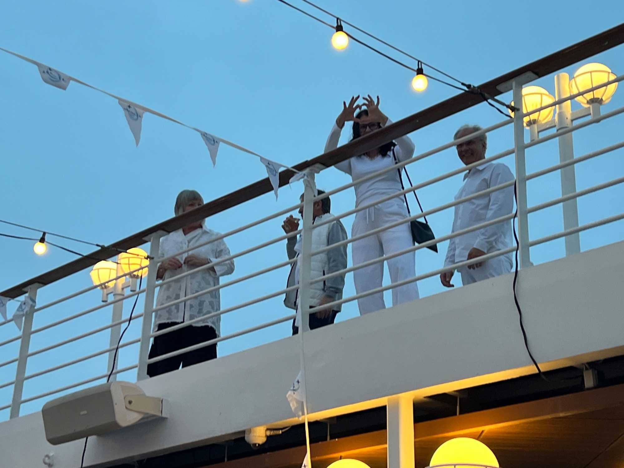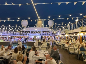 Nous retournons au navire pour une soirée très spéciale. En effet, ce soir, c’est une soirée en blanc. BBQ et musique: tout se passe sur le pont extérieur où se trouve la piscine. Les employés ont travaillé sans relâche pour nous offrir une magnifique soirée. Tout le monde est habillé en blanc, ça fait très joli. Tous les employés du navire ont contribué au festin: même le capitaine du navire était attitré aux crêpes suzettes! La musique nous a fait dansé (du moins Marie, Louise C et moi). La soirée ne se terminait pas ainsi: à 20h30, nous avions une disco silencieuse. C’est très drôle: chacun a un écouteur sur les oreilles et il y a trois postes de musiques différentes, donc chacun danse et chante sur son choix de musique. En plus de Marie et Louise C, j’ai eu d’autres supporteurs qui sont venus danser avec moi: Anne, Louise P, Jeanne, Denis et pour un bref instant, Mario. On a eu beaucoup de plaisirs… Ouf! Quelle superbe journée! On en profite au maximum!