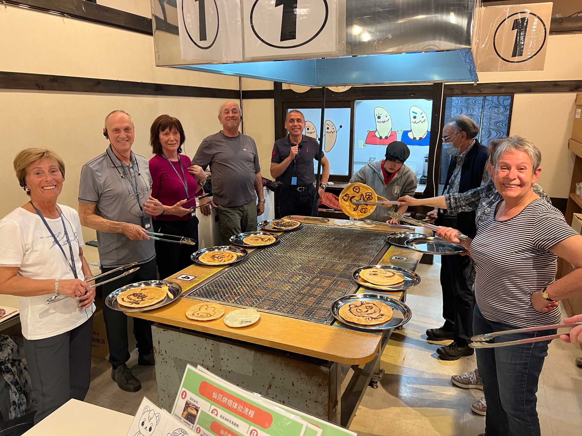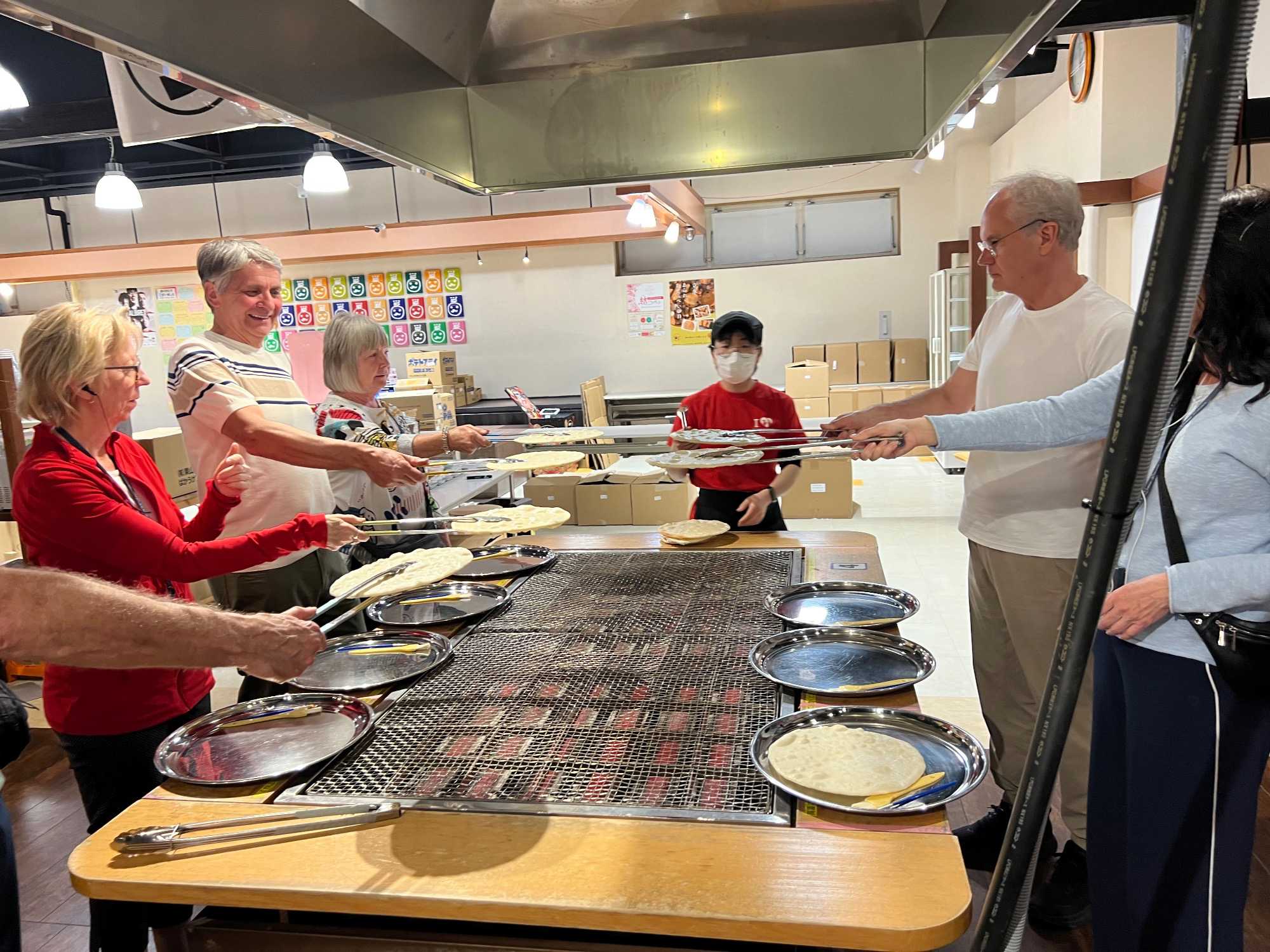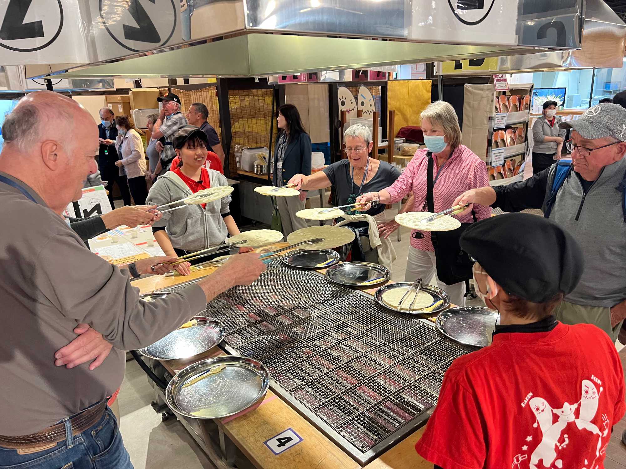 En après-midi, nous avons une activité pas mal le fun: la fabrication des célèbres galettes de riz, les senbei. Quel plaisir nous avons à créer nos propres galettes et de les personnaliser avec le plus grand art qui sommeille en chacun de nous 🤣. Le four est à 400 degrés Celsius: il fait très chaud tout autour. Après la cuisson et la décoration, on fait sécher nos galettes puis on nous les remet dans une jolie boîte. Mais puisque personne ne veut mettre ça dans sa valise pour le retour à la maison, on réussi à faire des heureux en arrivant au navire: une troupe de musiciens se préparent à entrer sur notre bateau pour le spectacle de 16h15. On en profite pour leur faire de jolis cadeaux!