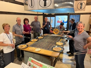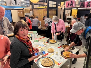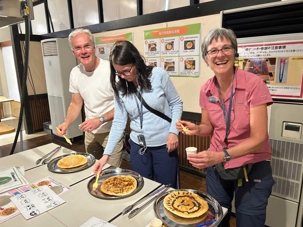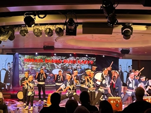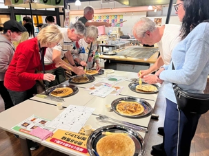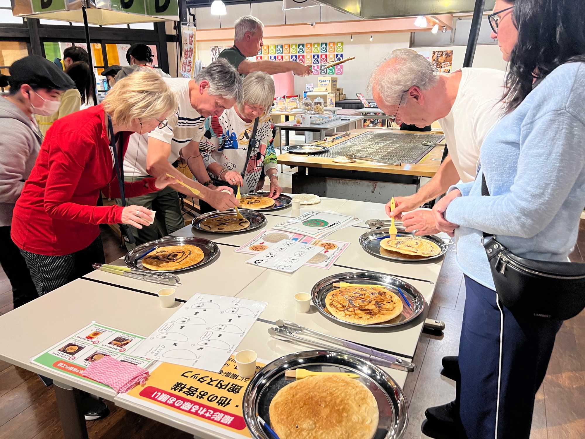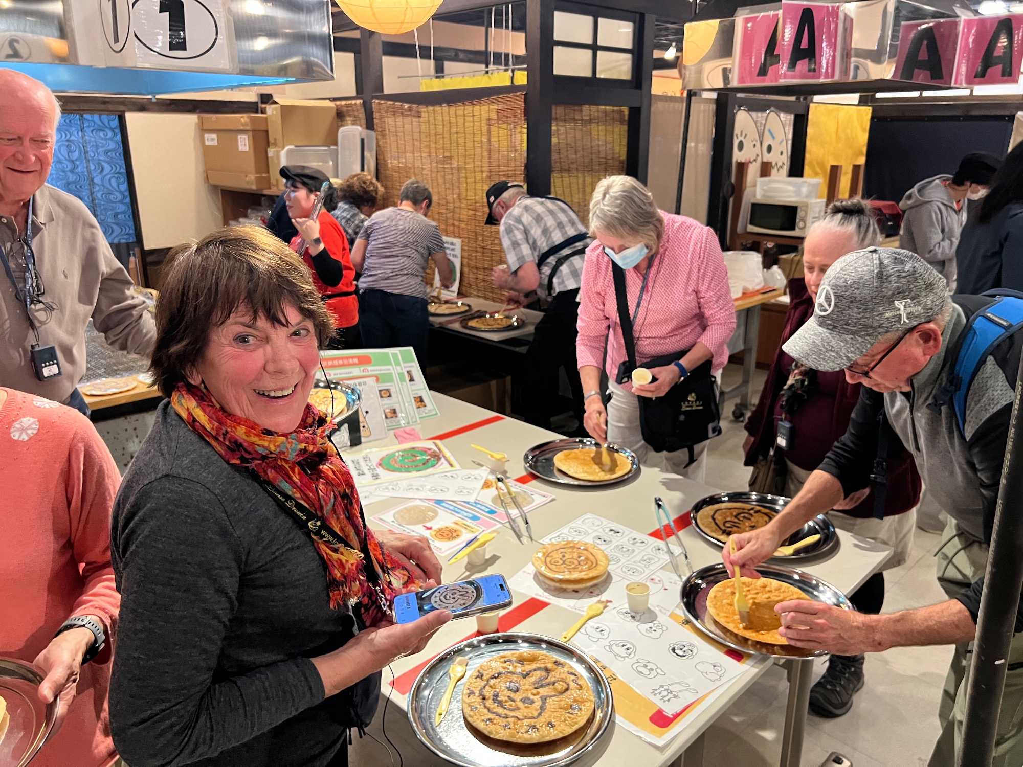 En après-midi, nous avons une activité pas mal le fun: la fabrication des célèbres galettes de riz, les senbei. Quel plaisir nous avons à créer nos propres galettes et de les personnaliser avec le plus grand art qui sommeille en chacun de nous 🤣. Le four est à 400 degrés Celsius: il fait très chaud tout autour. Après la cuisson et la décoration, on fait sécher nos galettes puis on nous les remet dans une jolie boîte. Mais puisque personne ne veut mettre ça dans sa valise pour le retour à la maison, on réussi à faire des heureux en arrivant au navire: une troupe de musiciens se préparent à entrer sur notre bateau pour le spectacle de 16h15. On en profite pour leur faire de jolis cadeaux!