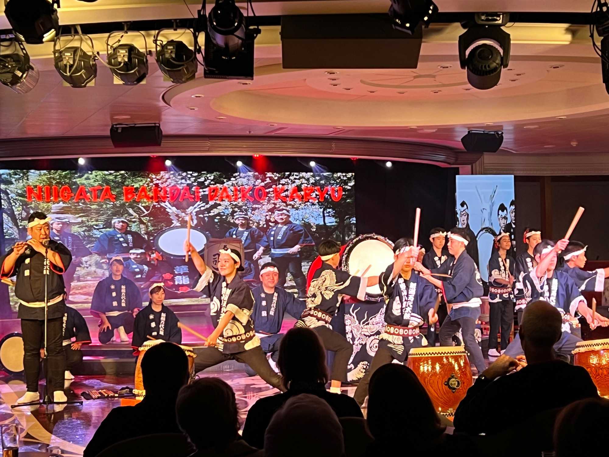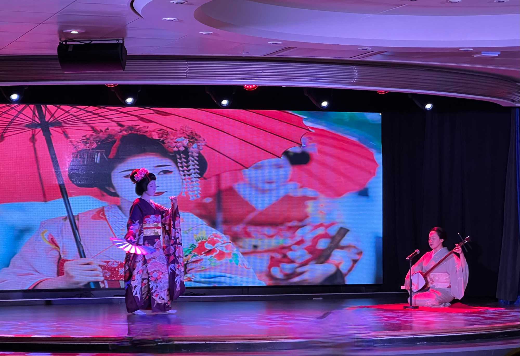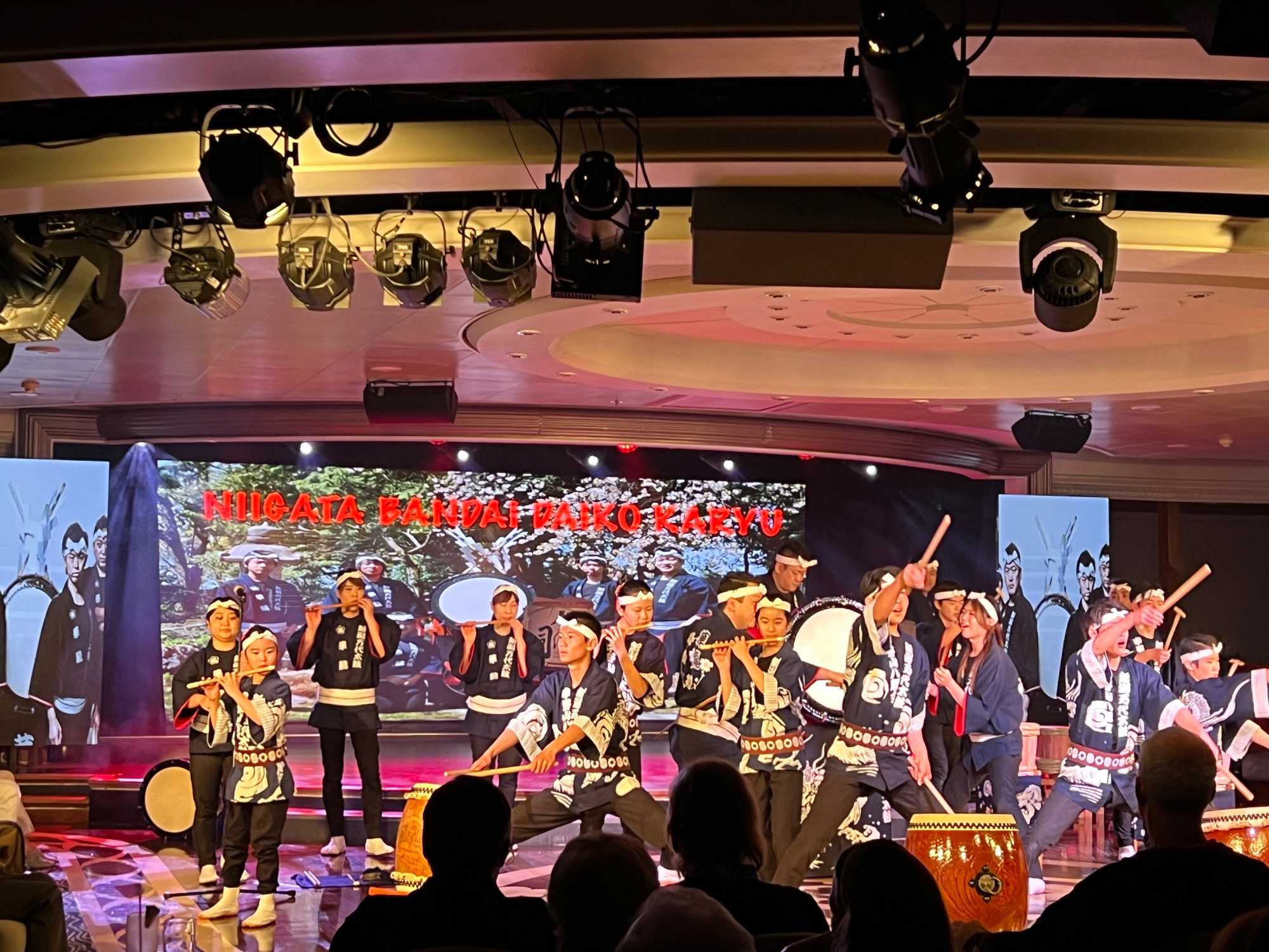 On arrive assez tôt sur le bateau pour en profiter un peu. Plusieurs vont au spectacle de Daiko (tambours et flûtes) au théâtre et c’est suivi par une surprise… Une geisha et une maïko ont été invité à bord pour nous faire une petite démonstration de chant, danse et musique. Quel raffinement! Nous sommes bien chanceux de pouvoir assister à cette prestation.