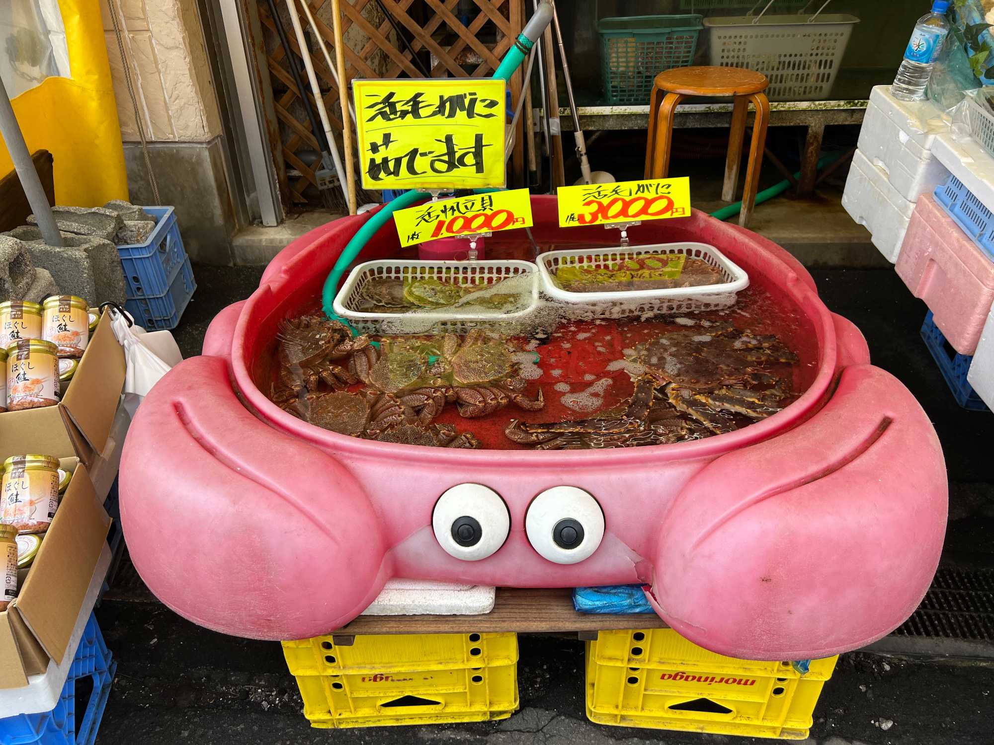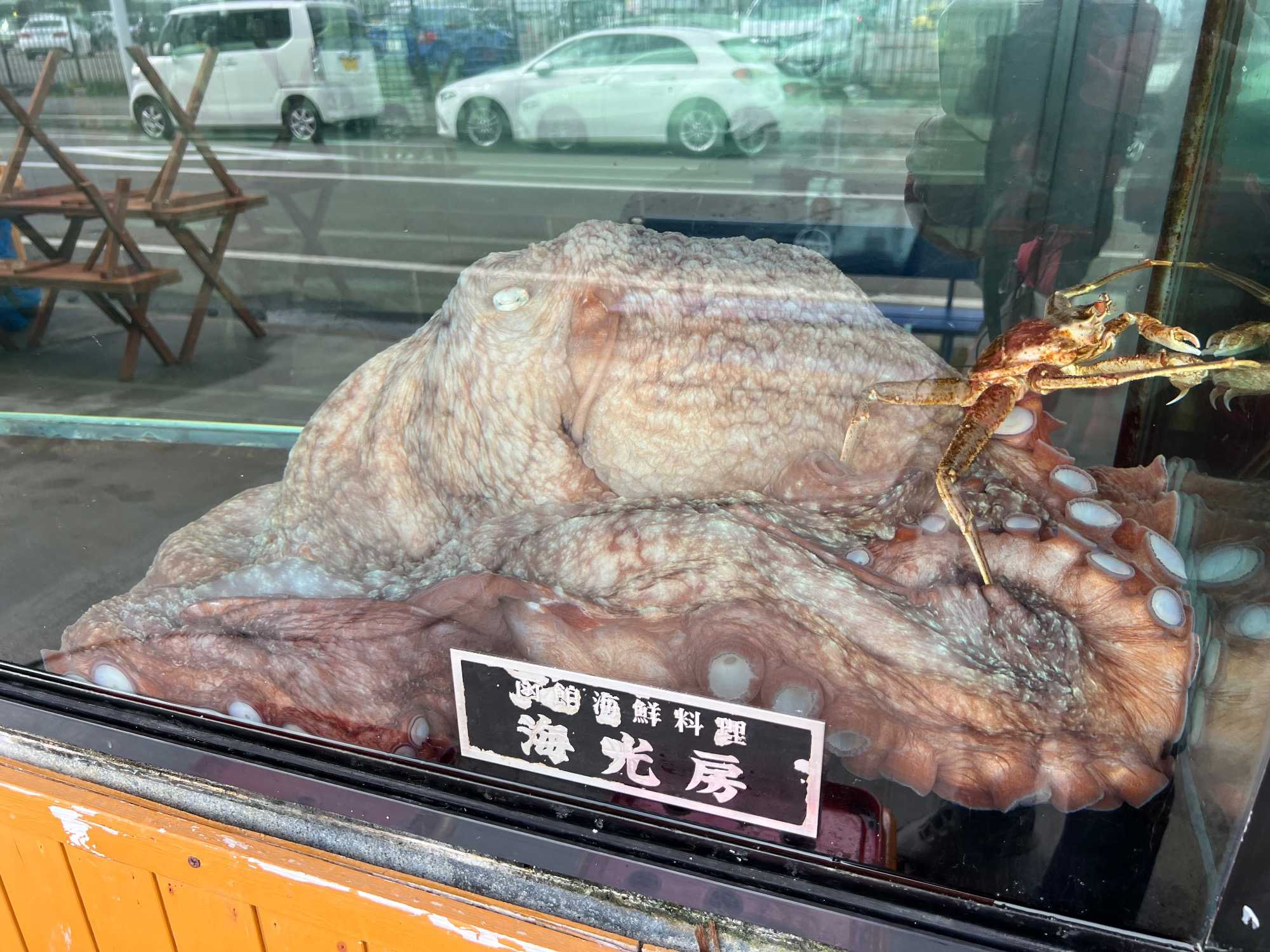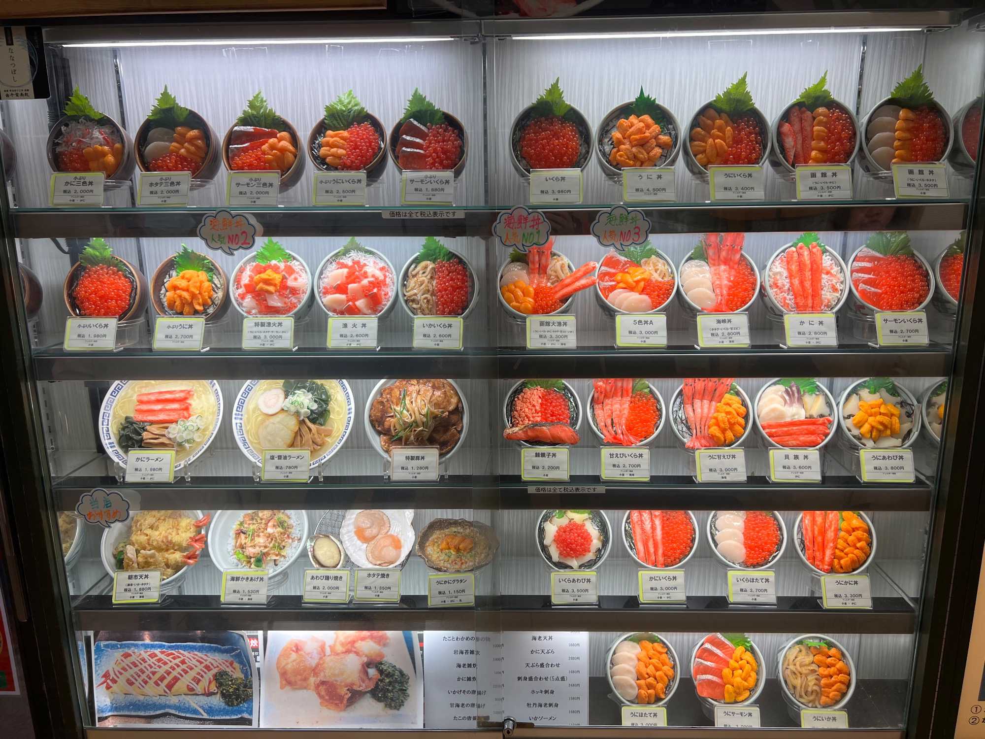 Notre premier arrêt du matin est le marché appelé « Hakodate Morning Market Square », qui est situé tout près du port. Le marché ouvre à six heures du matin et est divisé en dizaines de vendeurs. Les environs du marché sont remplis de petites boutiques et restaurants avec des étalages de fruits de mer. Certains magasins ont des panneaux en japonais et en anglais disant : « Vous pouvez manger ici » ! Pratiquement tous ont une ou plusieurs tables à l’arrière où l’on peut déguster un donburi de fruits de mer (un bol de riz blanc recouvert d’une ou plusieurs sortes de fruits de mer).