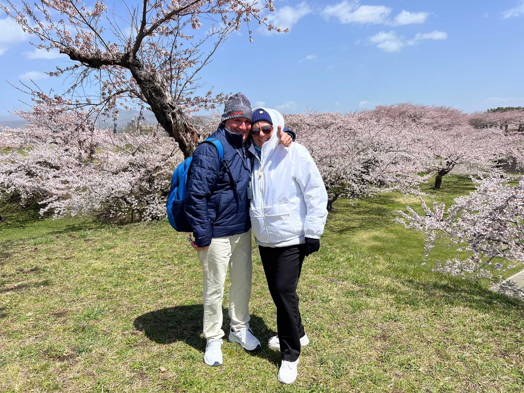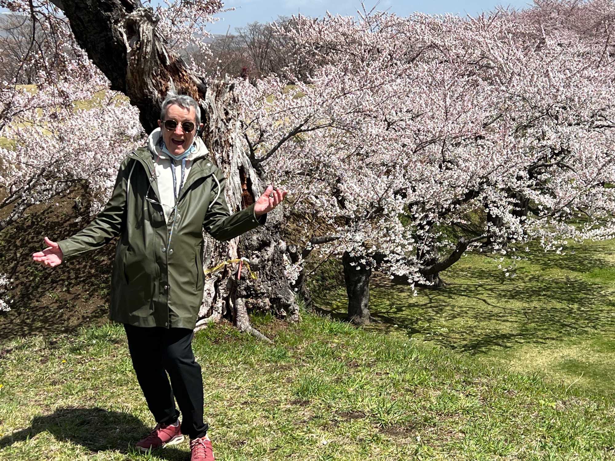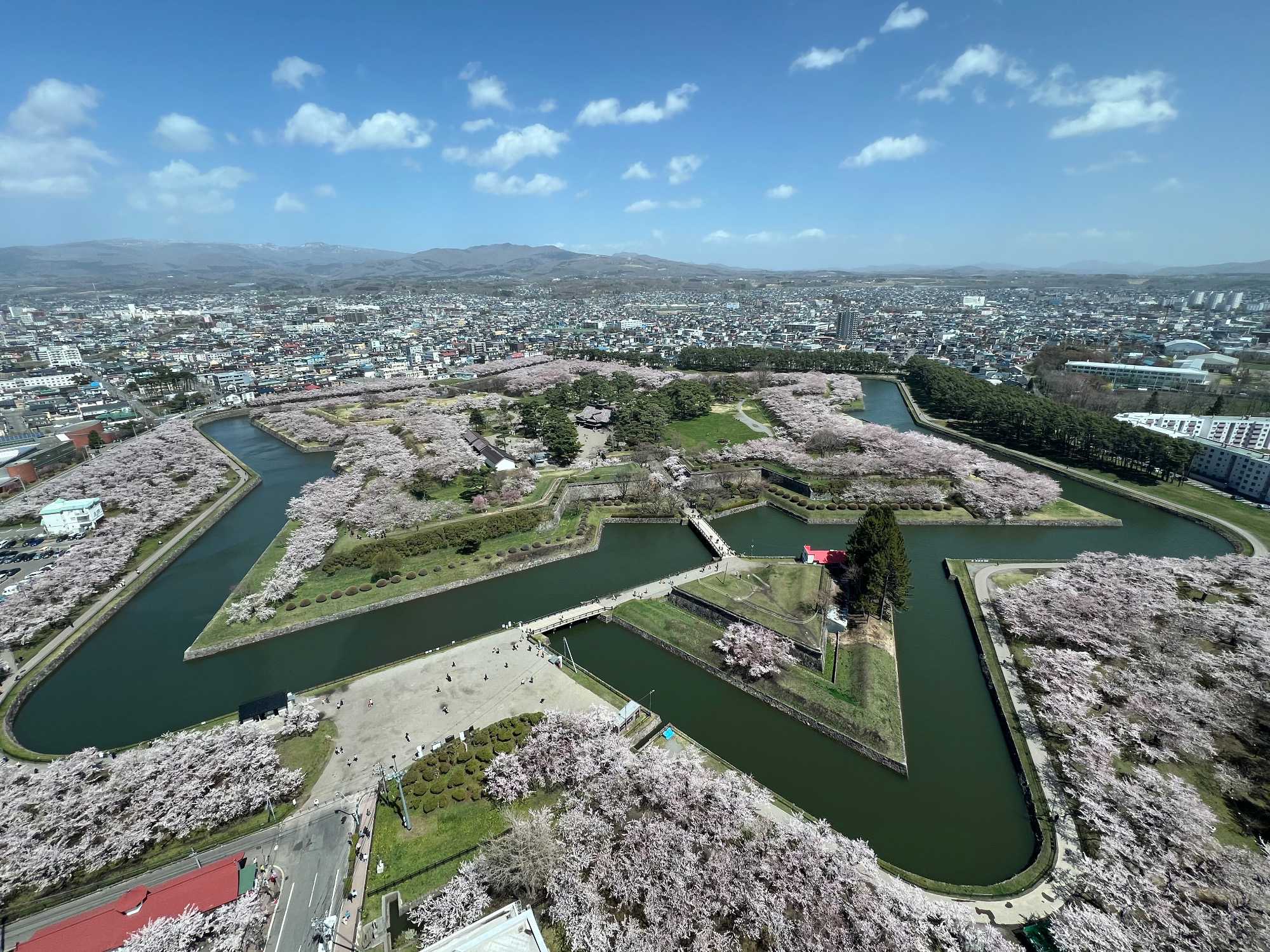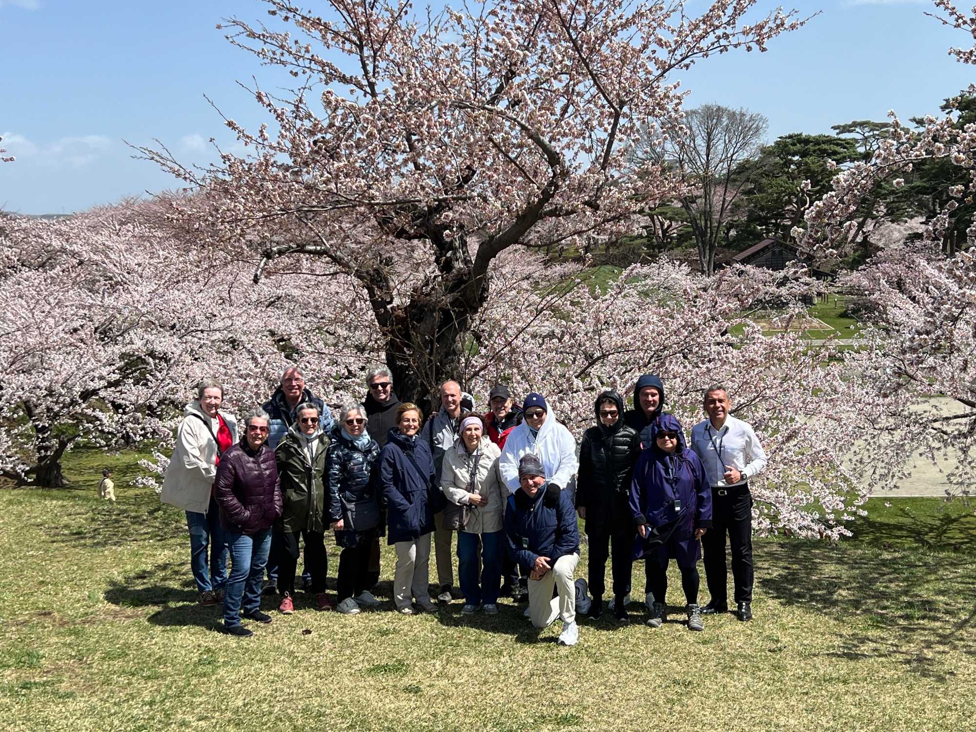 Nous poursuivons notre visite en nous rendant au parc Goryokaku. Nous débutons par monter tout en haut de la tour de Goryokaku, qui permet d’observer de haut la belle forme en étoile de la forteresse. Depuis les hauteurs, une vue panoramique s’ouvre sur l’ensemble de la forteresse, révélant toute la beauté géométrique de son étoile au sol. Et là, nous avons toute une surprise, car les cerisiers tout en bas sont tous en fleurs!!! Nous réalisons le travail fait en 1914, où des jardiniers ont planté des milliers de cerisiers dans l’enceinte de la forteresse. Il reste aujourd’hui 1600 de ces arbres, qui fleurissent chaque printemps. Quelle immense chance nous avons d’arriver alors que les fleurs viennent juste d’éclore! Même notre guide Jean n’en revient pas de notre chance car lui-même n’a jamais pu voir ces cerisiers en fleurs avant aujourd’hui. Ce spectacle naturel étonnant transforme littéralement les lieux pour un ravissement des yeux. Probablement la nouvelle de la floraison ne s’est pas propagée car il y a relativement peu de monde. Le superlatif choisi par mes voyageurs aujourd’hui est « enleVENT » car il vente tellement! Mais « hallucinant » a aussi été nommé.