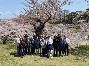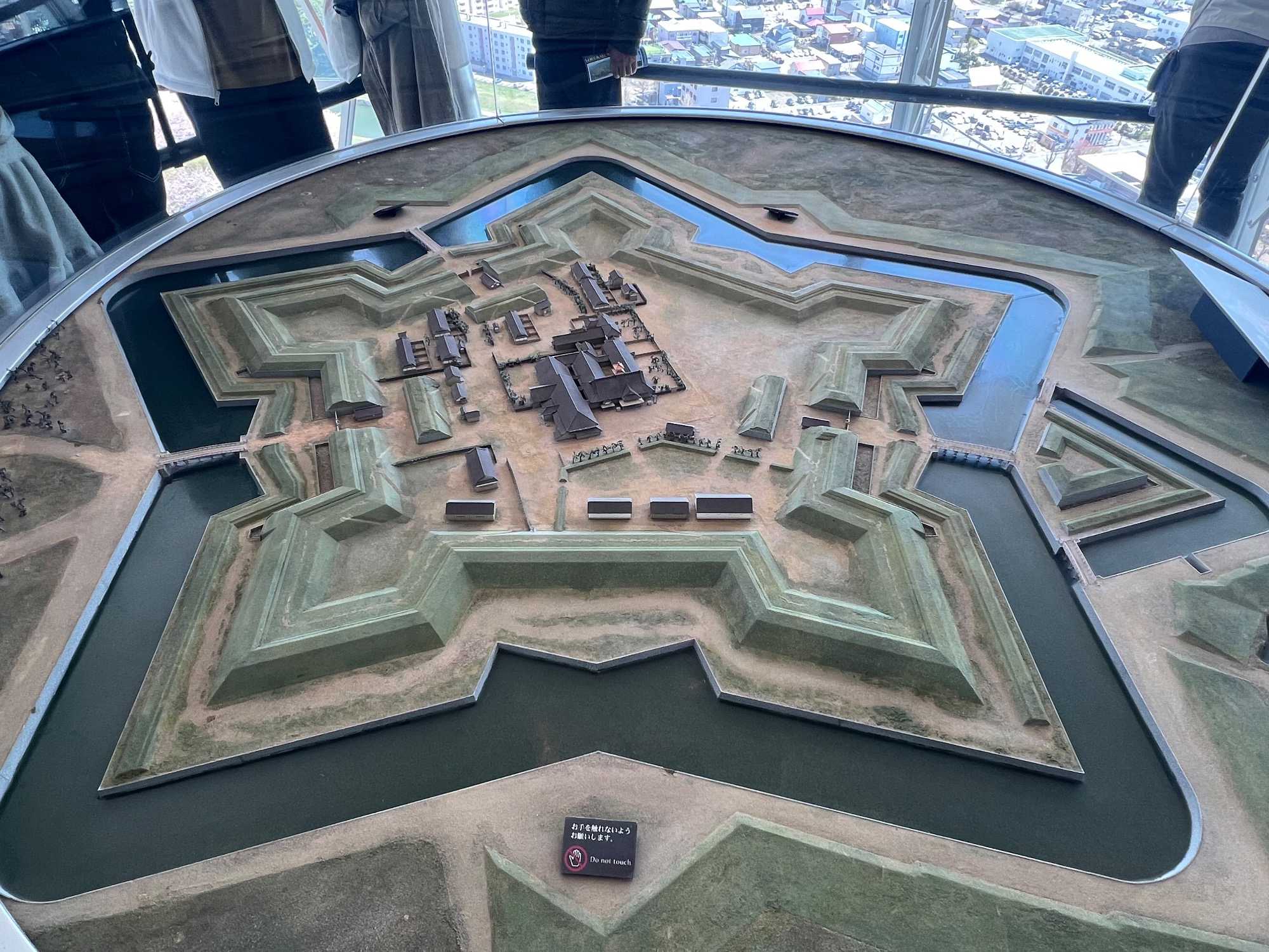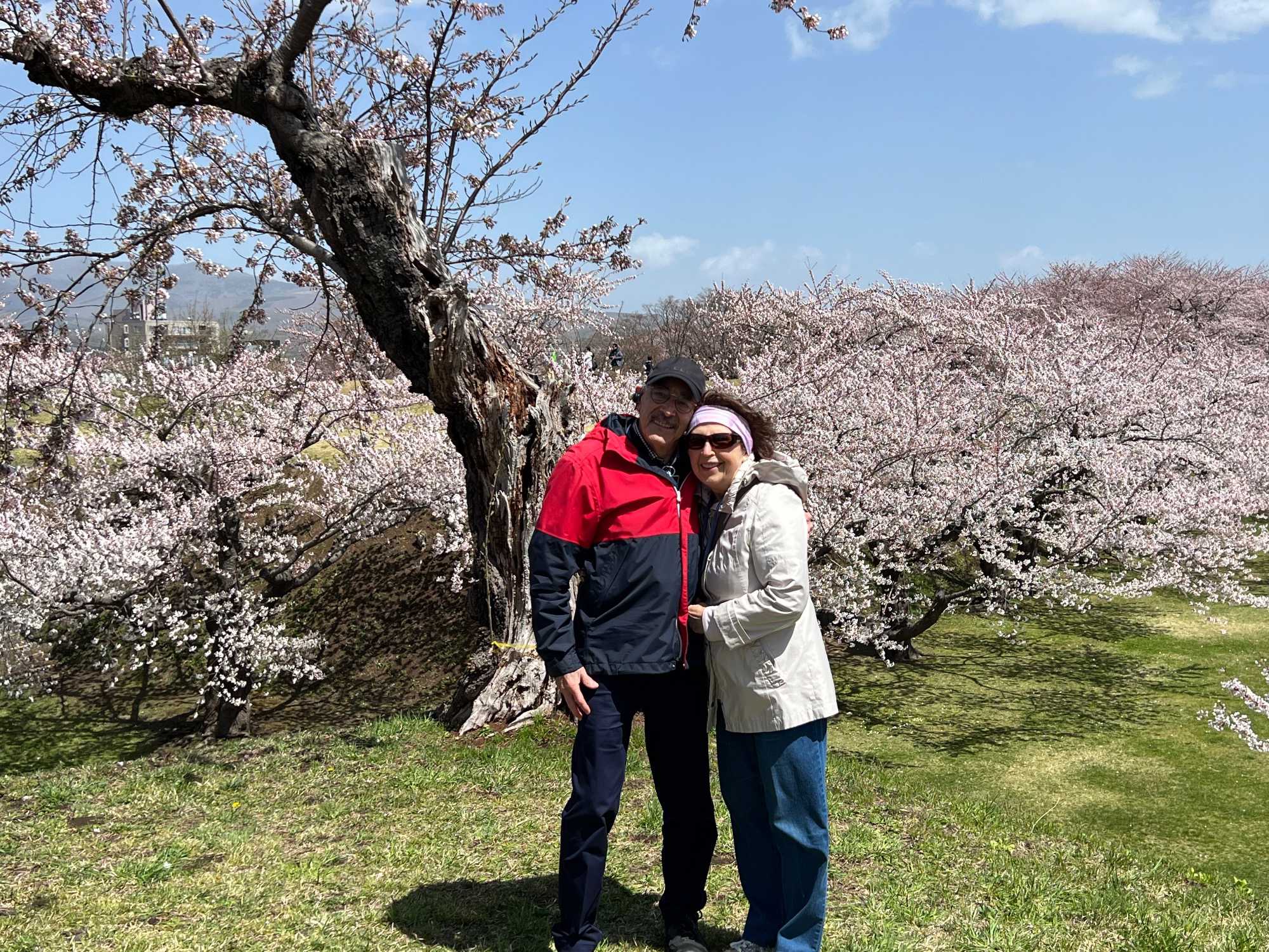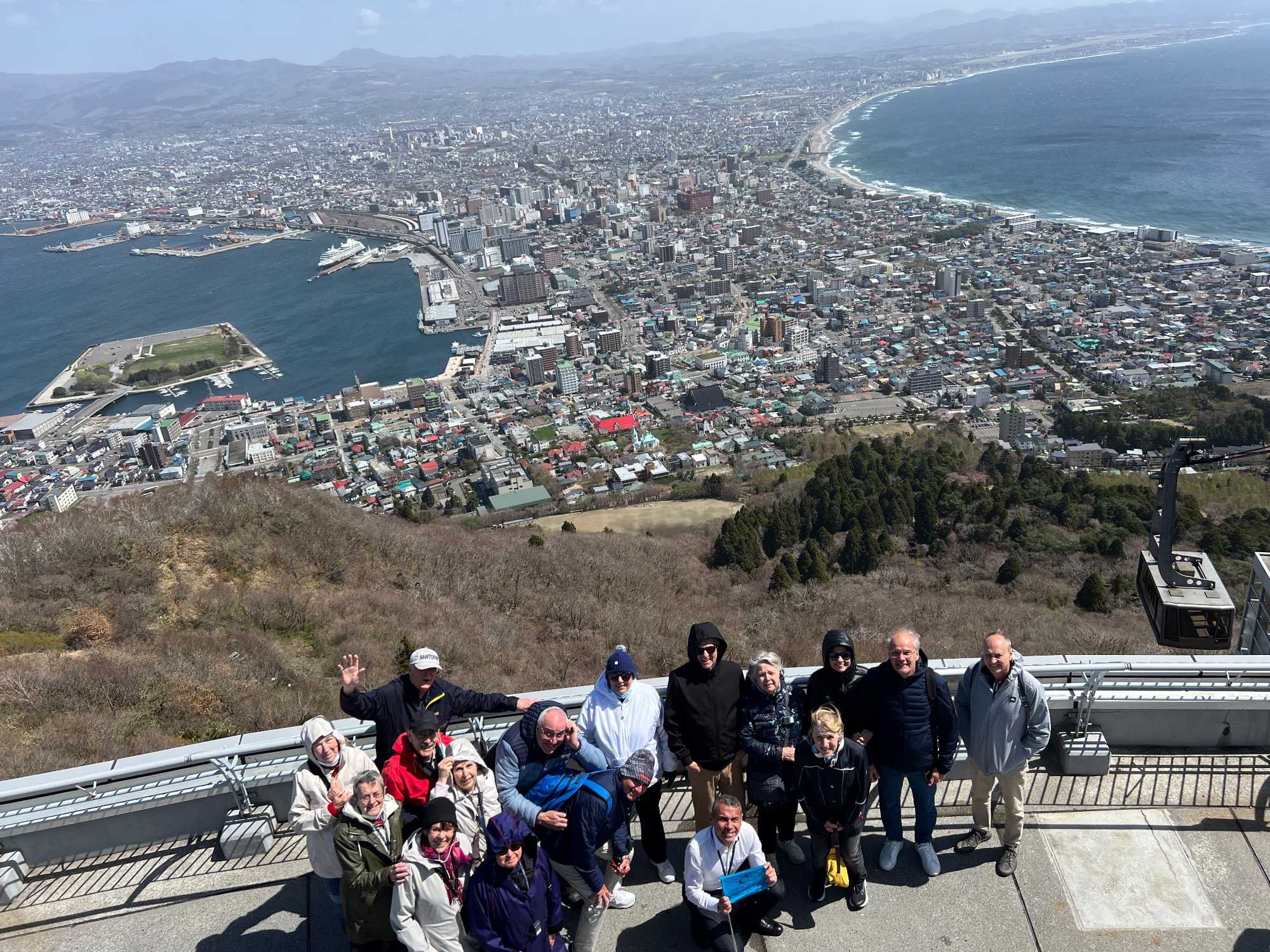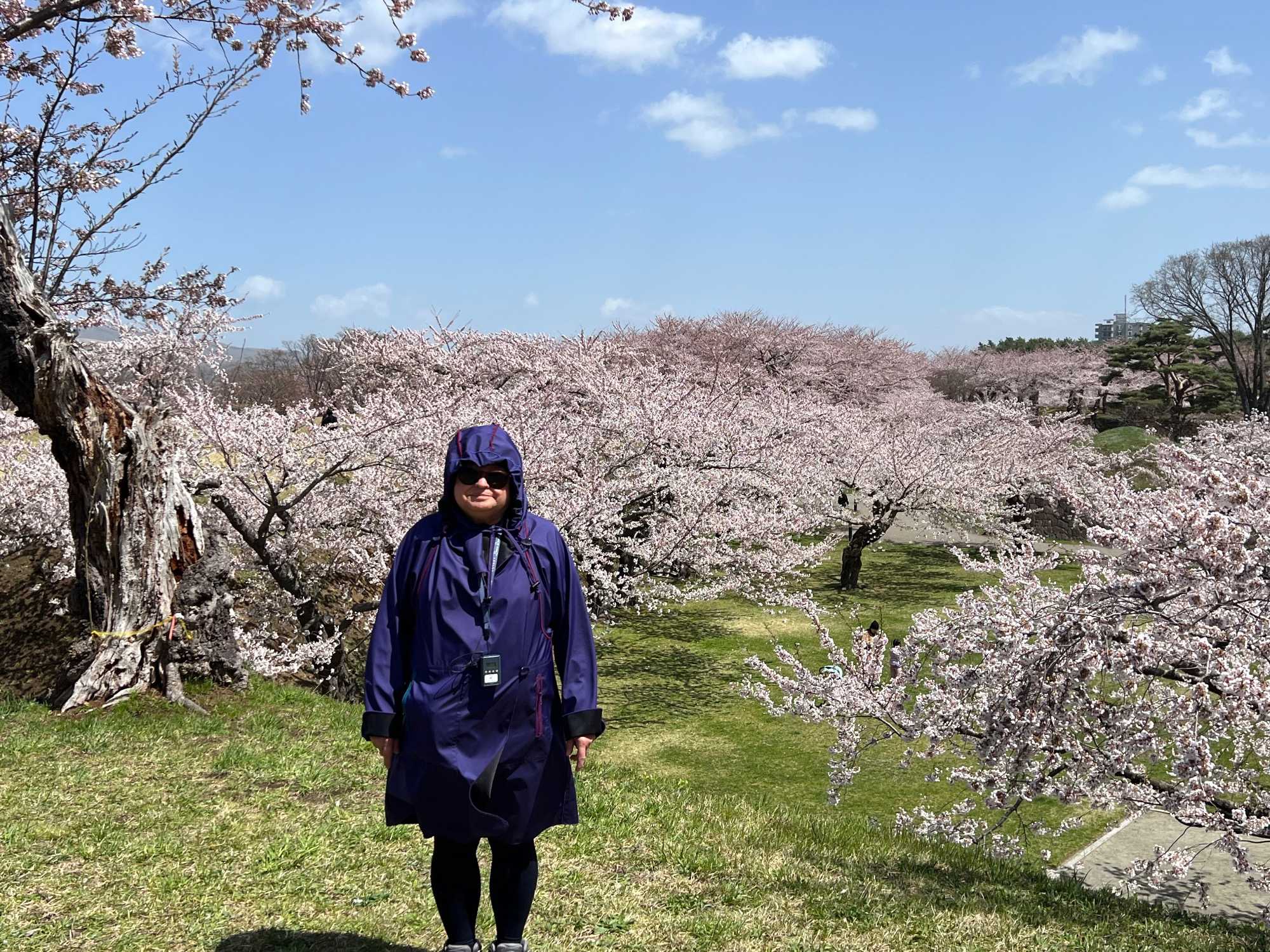 Nous poursuivons notre visite en nous rendant au parc Goryokaku. Nous débutons par monter tout en haut de la tour de Goryokaku, qui permet d’observer de haut la belle forme en étoile de la forteresse. Depuis les hauteurs, une vue panoramique s’ouvre sur l’ensemble de la forteresse, révélant toute la beauté géométrique de son étoile au sol. Et là, nous avons toute une surprise, car les cerisiers tout en bas sont tous en fleurs!!! Nous réalisons le travail fait en 1914, où des jardiniers ont planté des milliers de cerisiers dans l’enceinte de la forteresse. Il reste aujourd’hui 1600 de ces arbres, qui fleurissent chaque printemps. Quelle immense chance nous avons d’arriver alors que les fleurs viennent juste d’éclore! Même notre guide Jean n’en revient pas de notre chance car lui-même n’a jamais pu voir ces cerisiers en fleurs avant aujourd’hui. Ce spectacle naturel étonnant transforme littéralement les lieux pour un ravissement des yeux. Probablement la nouvelle de la floraison ne s’est pas propagée car il y a relativement peu de monde. Le superlatif choisi par mes voyageurs aujourd’hui est « enleVENT » car il vente tellement! Mais « hallucinant » a aussi été nommé.
