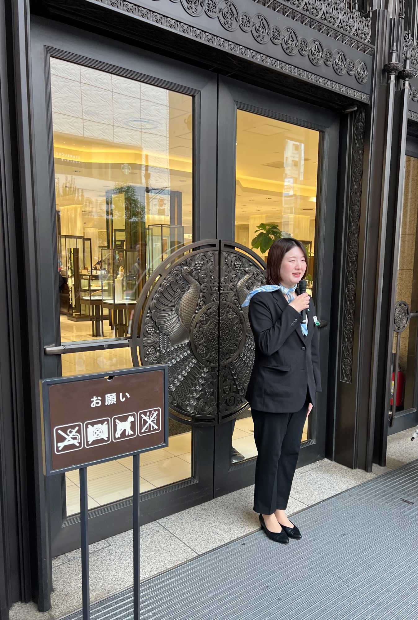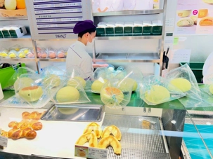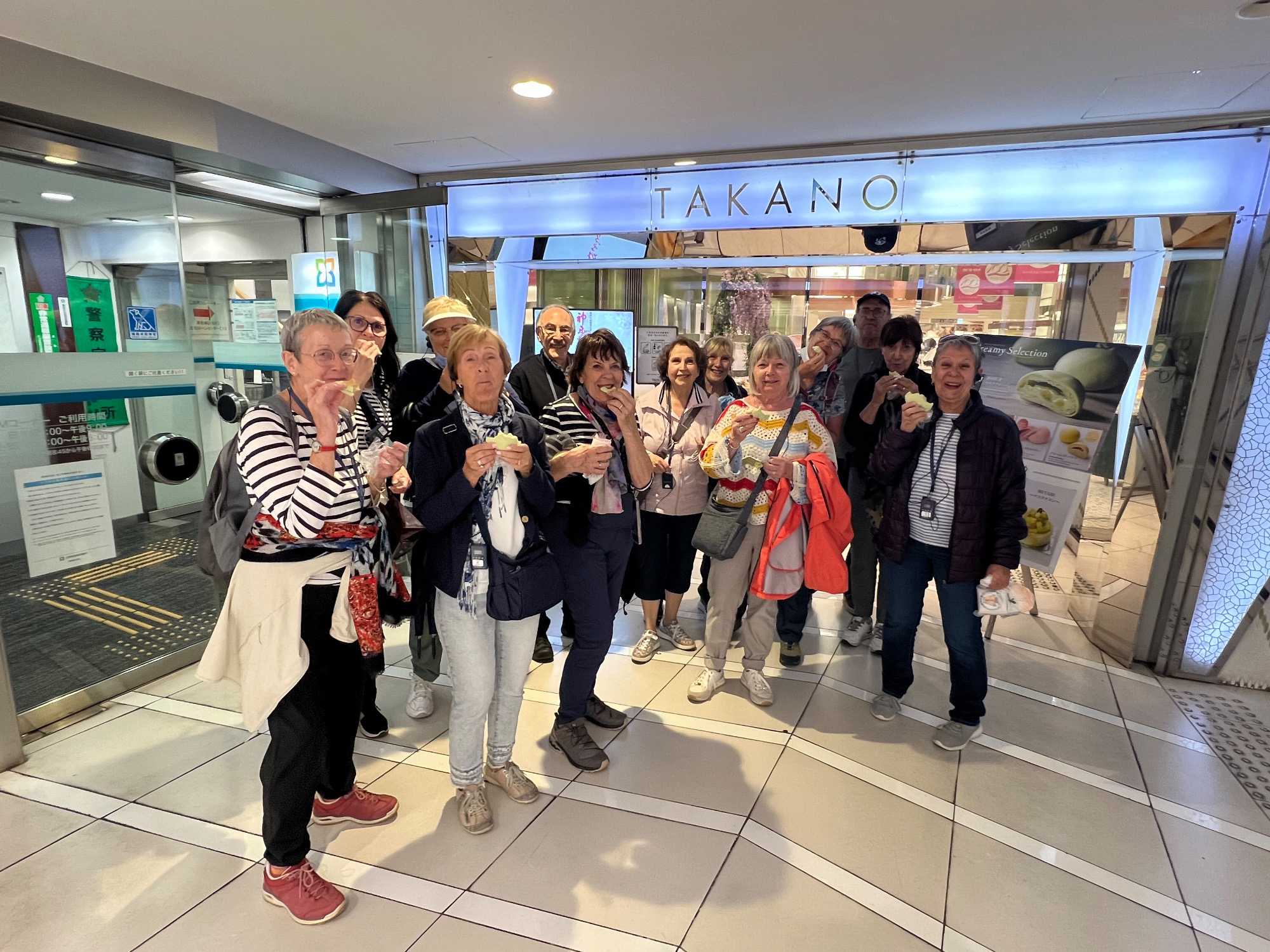 Nous repartons pour la visite de la boutique de fruits exceptionnels Takano ouverte depuis 1885. C’est un plaisir pour les yeux et aussi pour le palais. C’est incroyable de découvrir ce monde fascinant de la gastronomie et des coutumes japonaises. Nous sommes surpris des prix affichés pour les fins produites de luxe que nous découvrons à Takano. Ce n’est pas rare de payer une mangue plus de 50$. Une fraise blanche à 13$. Un melon à… 162$ !! Oui oui, vous avez bien lu, pas en yens mais en équivalent de dollars canadiens. Quel luxe et quelle beauté que ces lieux où nous nous laissons tenter par leurs spécialités culinaires en dégustant leurs petits pains farcis. Celui à la crème de melon, gracieusement offerts par Voyage Louise Drouin, nous a conquis. Jean nous parle de tout cela et nous explique ce que les Japonais aiment et à qui s’adresse ces produits exceptionnels. Toute une découverte, avant de continuer vers notre restaurant pour le lunch.