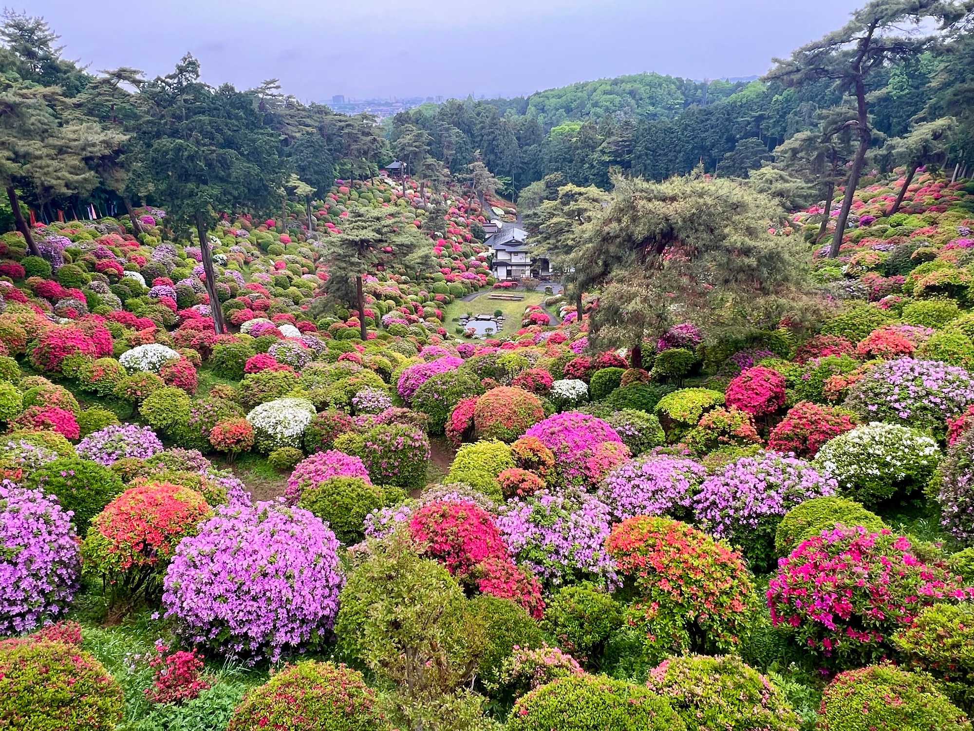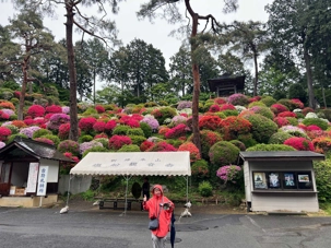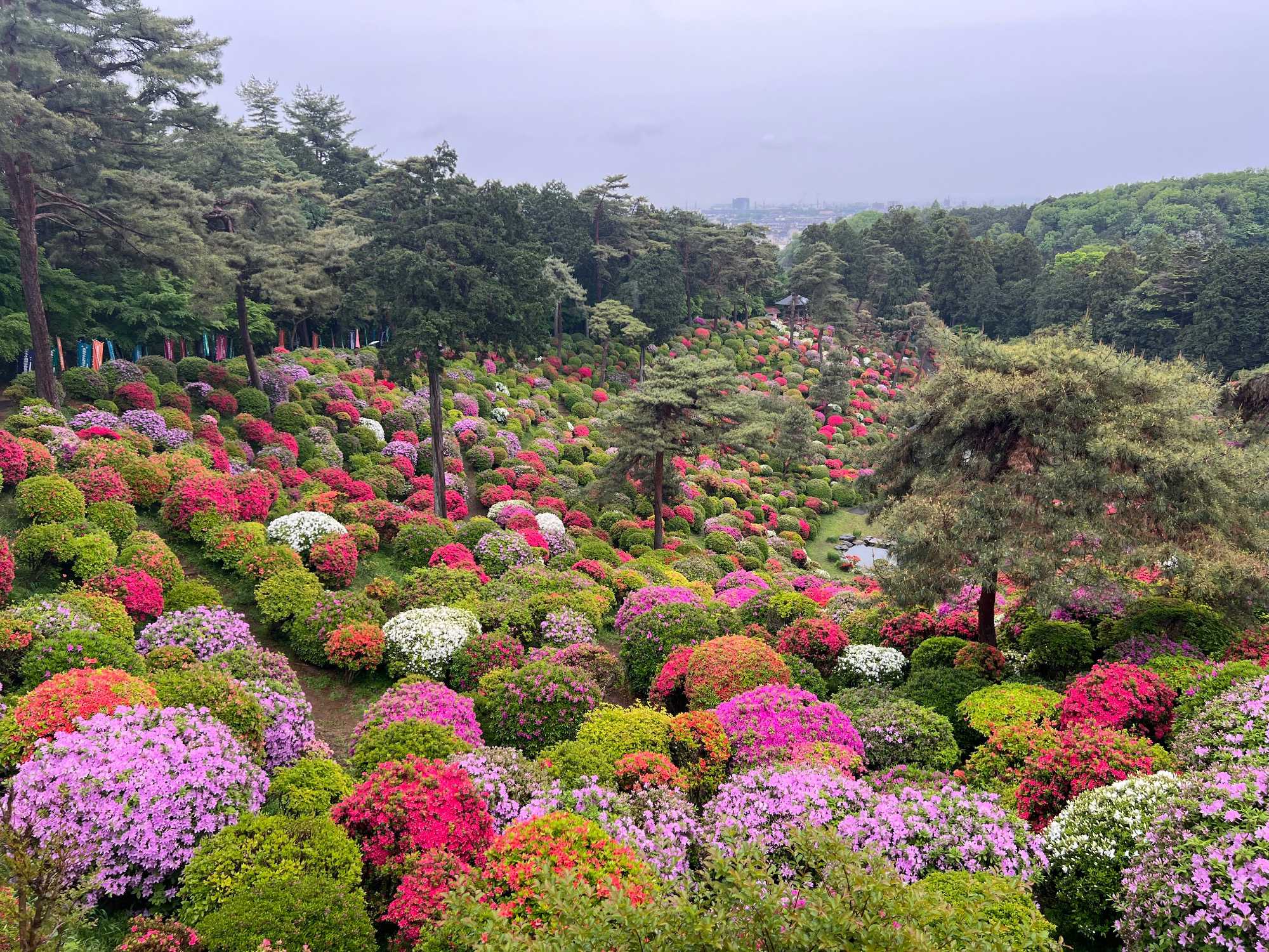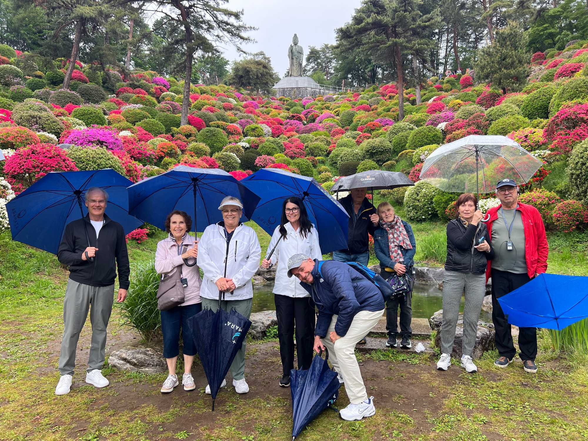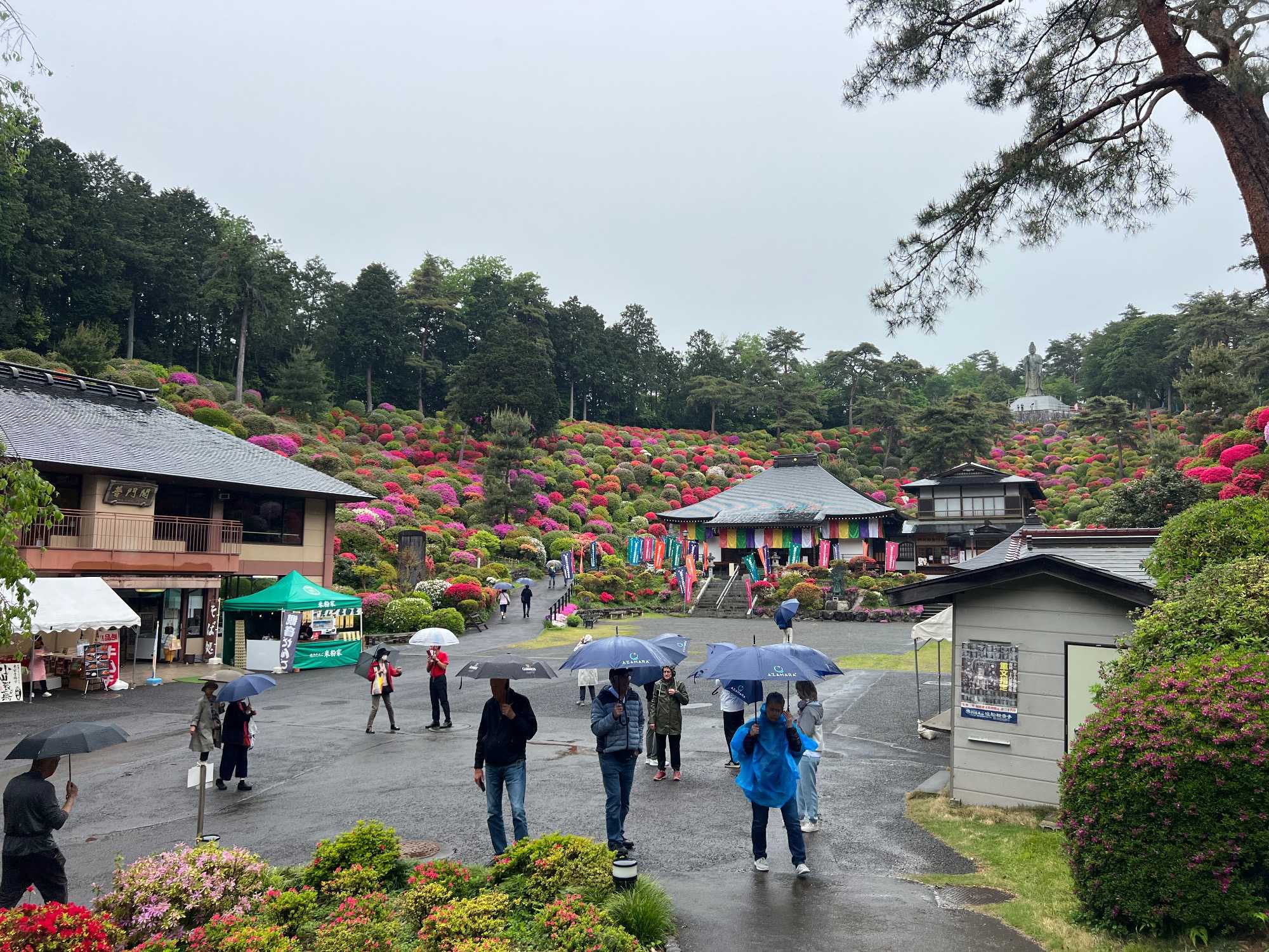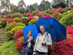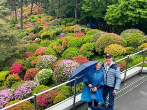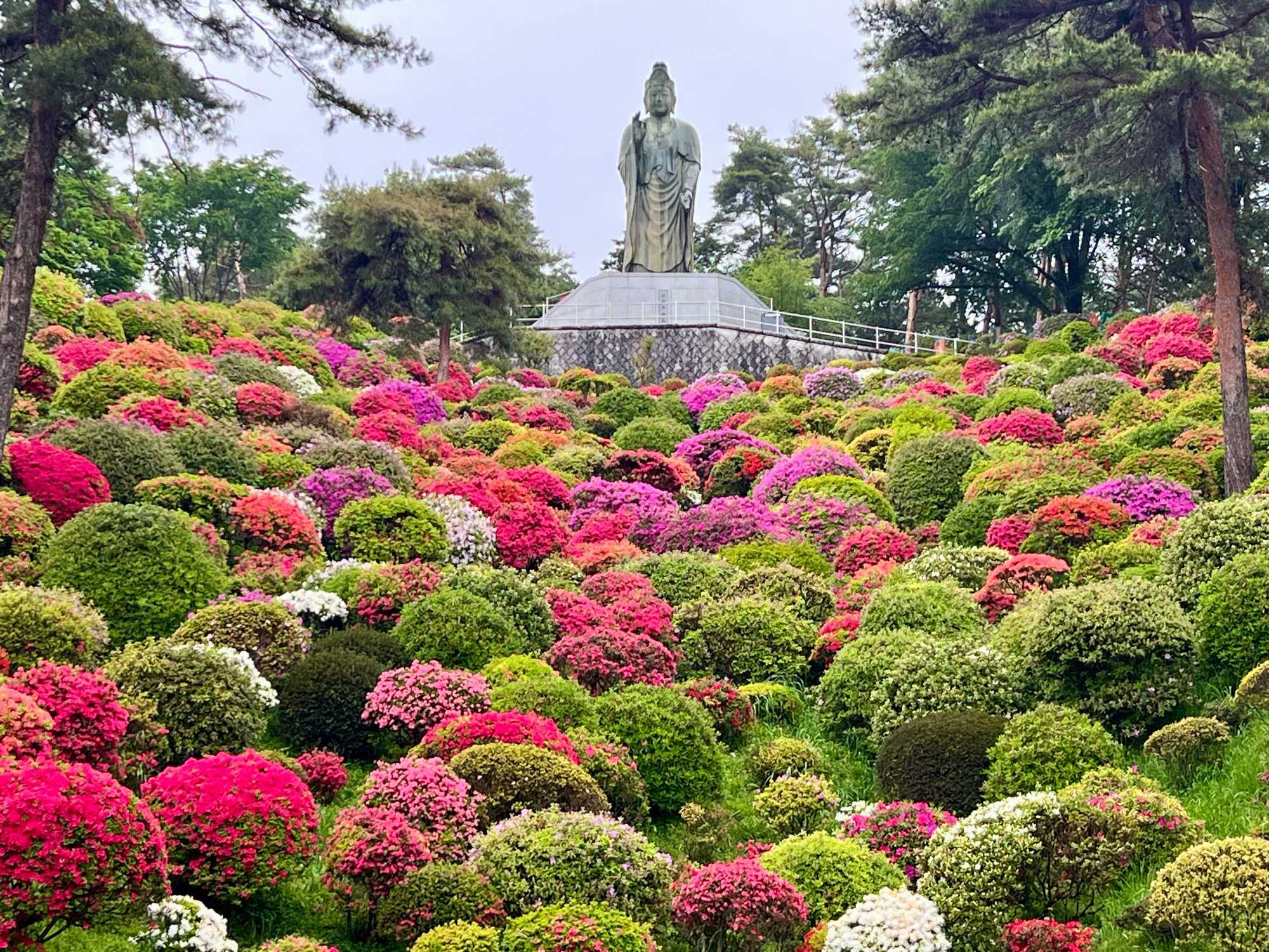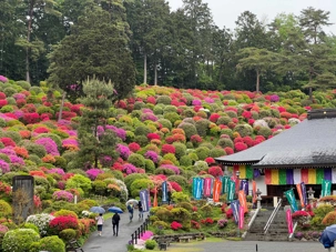 Puis nous prenons la route vers Oume pour la visite du temple bouddhiste Shiofune Kannon-ji. Nous avons une pluie légère qui nous accompagnera tout l’après-midi, mais rien de méchant. Mais bon, nous avons bien profité du soleil jusqu’à maintenant. Nous sommes tous prêts pour la visite de ce jardin qui se trouve à environ 1 heure de route de Tokyo. Nous arrivons à Oume et nous sommes presque les seuls touristes étrangers qui viennent aujourd’hui visiter ce site magnifique. Le site, vieux de 1 300 ans, est réputé pour ses myriades d’azalées et rhododendrons multicolores qui fleurissent en masse de la mi-avril au début mai. Ce n’est donc pas un hasard si nous sommes ici à cette période de l’année. Beau travail de planification de la part de Mme Drouin! Nous en profitons pour prendre plusieurs photos car nous en avons plein la vue avec ces 17 000 azalées. De nombreux sentiers descendants et ascendants traversent les buissons et permettent de s'immerger totalement dans les lieux, ainsi que de faire le plein de parfums et de couleurs pour l'année. Les arbustes sur les flancs de la vallée se parent de magnifiques couleurs vives, du rose au rouge en passant par le violet et le blanc. Les boules d’azalées sont gigantesques et couvre la colline qui, au sommet, nous présente la statue de la déesse Kannon. Elle est immense et elle surplombe tout le cratère rempli de fleurs. Nous n’avons qu’une seule phrase en tête, « comme c’est beau » et on le répète à chaque détour en parcourant la colline. Nous ne nous lassons pas de contempler et d’admirer toutes ces couleurs d’azalées. Nous quittons à regret ce beau jardin pour retourner en ville. Le mot choisi pour représenter ce jardin est : kaléidoscope, étant donné la multitude de couleurs qui nous entourent.