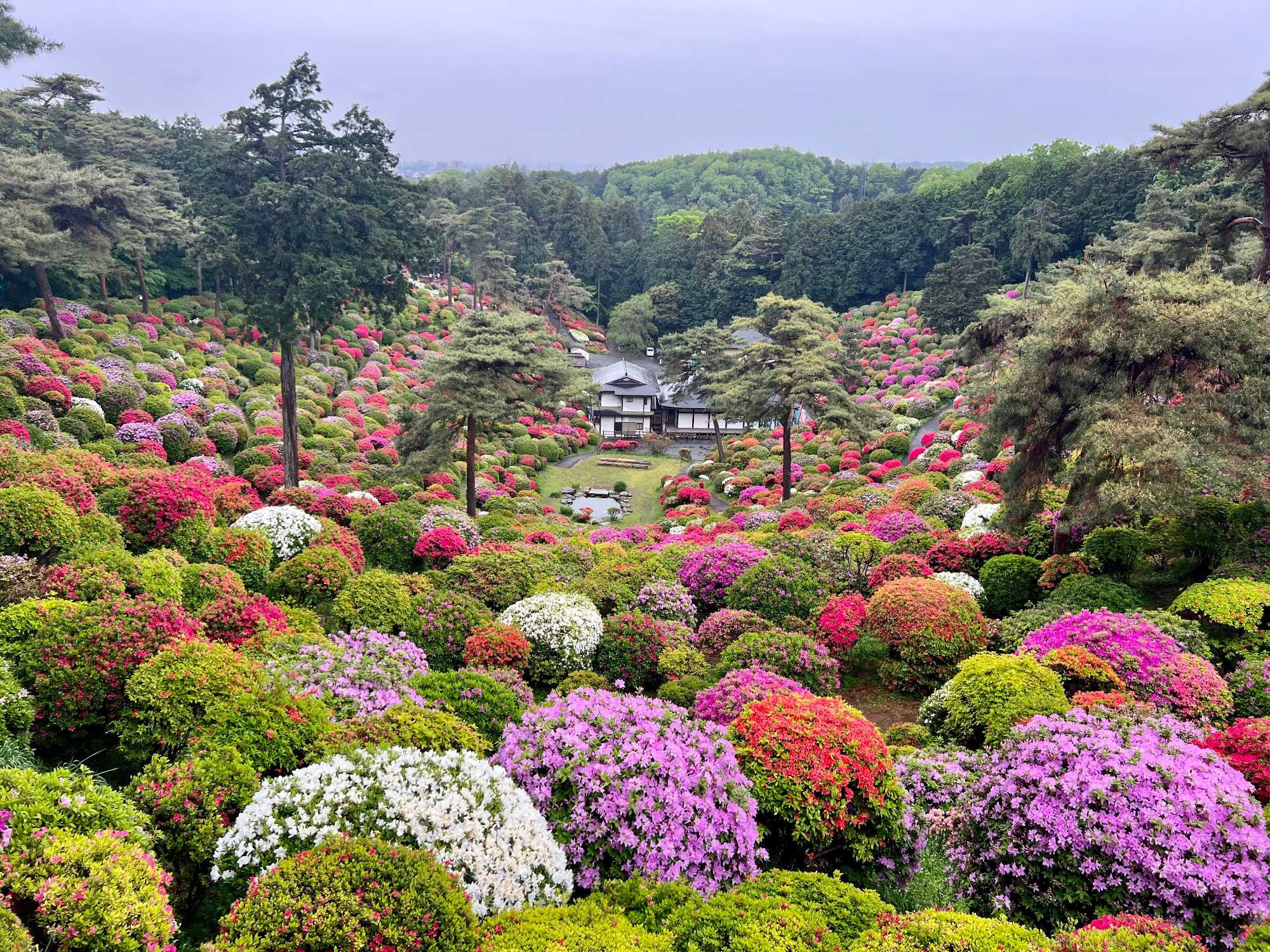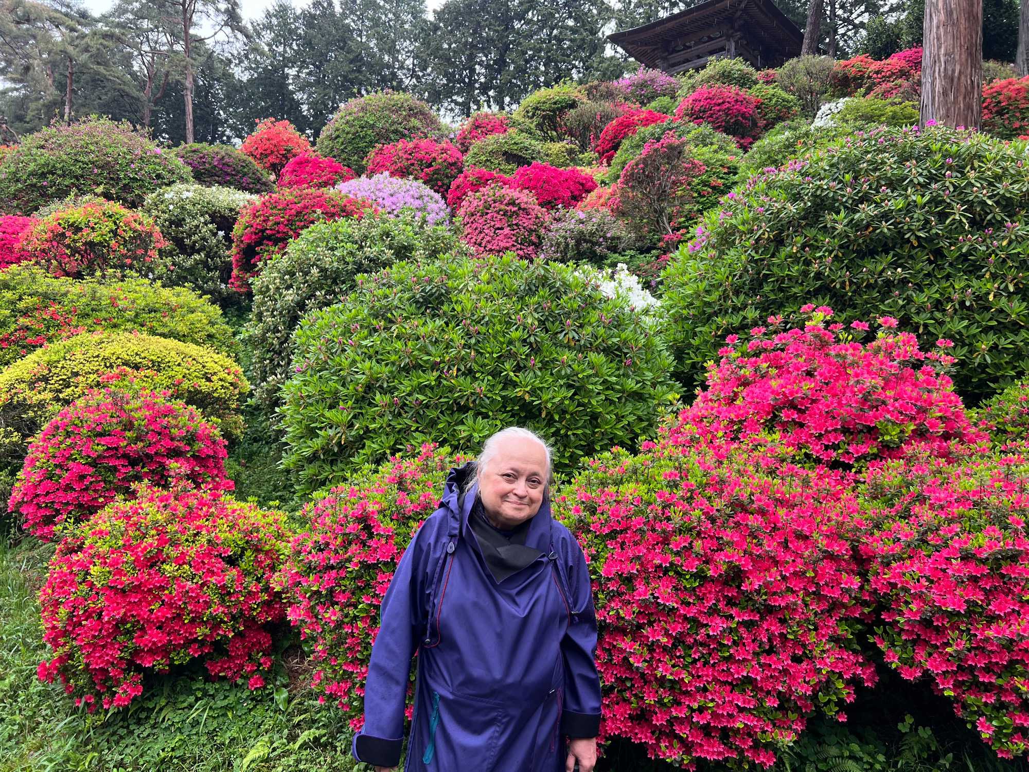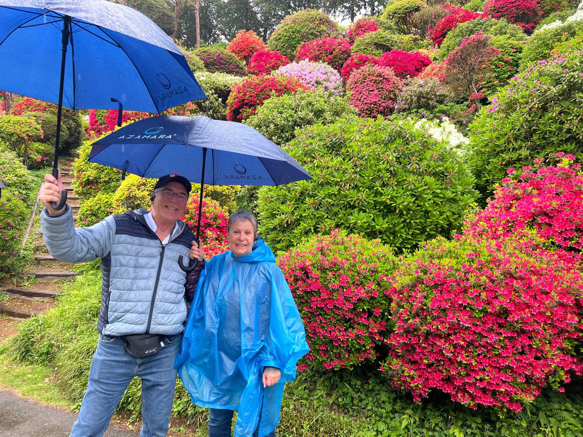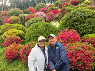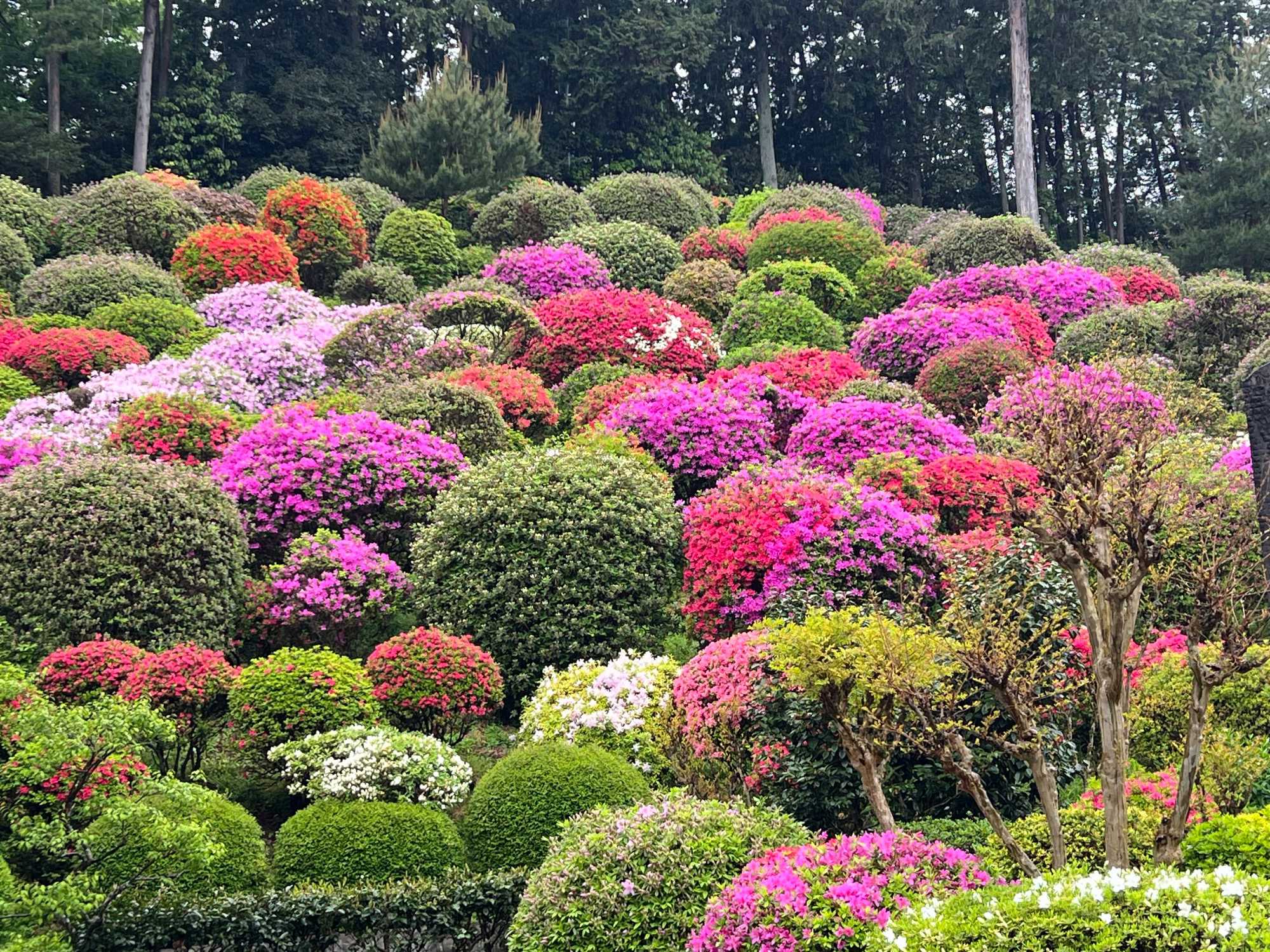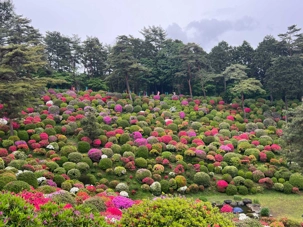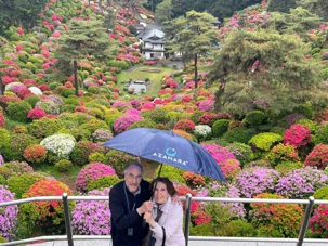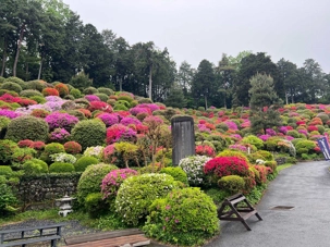 Puis nous prenons la route vers Oume pour la visite du temple bouddhiste Shiofune Kannon-ji. Nous avons une pluie légère qui nous accompagnera tout l’après-midi, mais rien de méchant. Mais bon, nous avons bien profité du soleil jusqu’à maintenant. Nous sommes tous prêts pour la visite de ce jardin qui se trouve à environ 1 heure de route de Tokyo. Nous arrivons à Oume et nous sommes presque les seuls touristes étrangers qui viennent aujourd’hui visiter ce site magnifique. Le site, vieux de 1 300 ans, est réputé pour ses myriades d’azalées et rhododendrons multicolores qui fleurissent en masse de la mi-avril au début mai. Ce n’est donc pas un hasard si nous sommes ici à cette période de l’année. Beau travail de planification de la part de Mme Drouin! Nous en profitons pour prendre plusieurs photos car nous en avons plein la vue avec ces 17 000 azalées. De nombreux sentiers descendants et ascendants traversent les buissons et permettent de s'immerger totalement dans les lieux, ainsi que de faire le plein de parfums et de couleurs pour l'année. Les arbustes sur les flancs de la vallée se parent de magnifiques couleurs vives, du rose au rouge en passant par le violet et le blanc. Les boules d’azalées sont gigantesques et couvre la colline qui, au sommet, nous présente la statue de la déesse Kannon. Elle est immense et elle surplombe tout le cratère rempli de fleurs. Nous n’avons qu’une seule phrase en tête, « comme c’est beau » et on le répète à chaque détour en parcourant la colline. Nous ne nous lassons pas de contempler et d’admirer toutes ces couleurs d’azalées. Nous quittons à regret ce beau jardin pour retourner en ville. Le mot choisi pour représenter ce jardin est : kaléidoscope, étant donné la multitude de couleurs qui nous entourent.