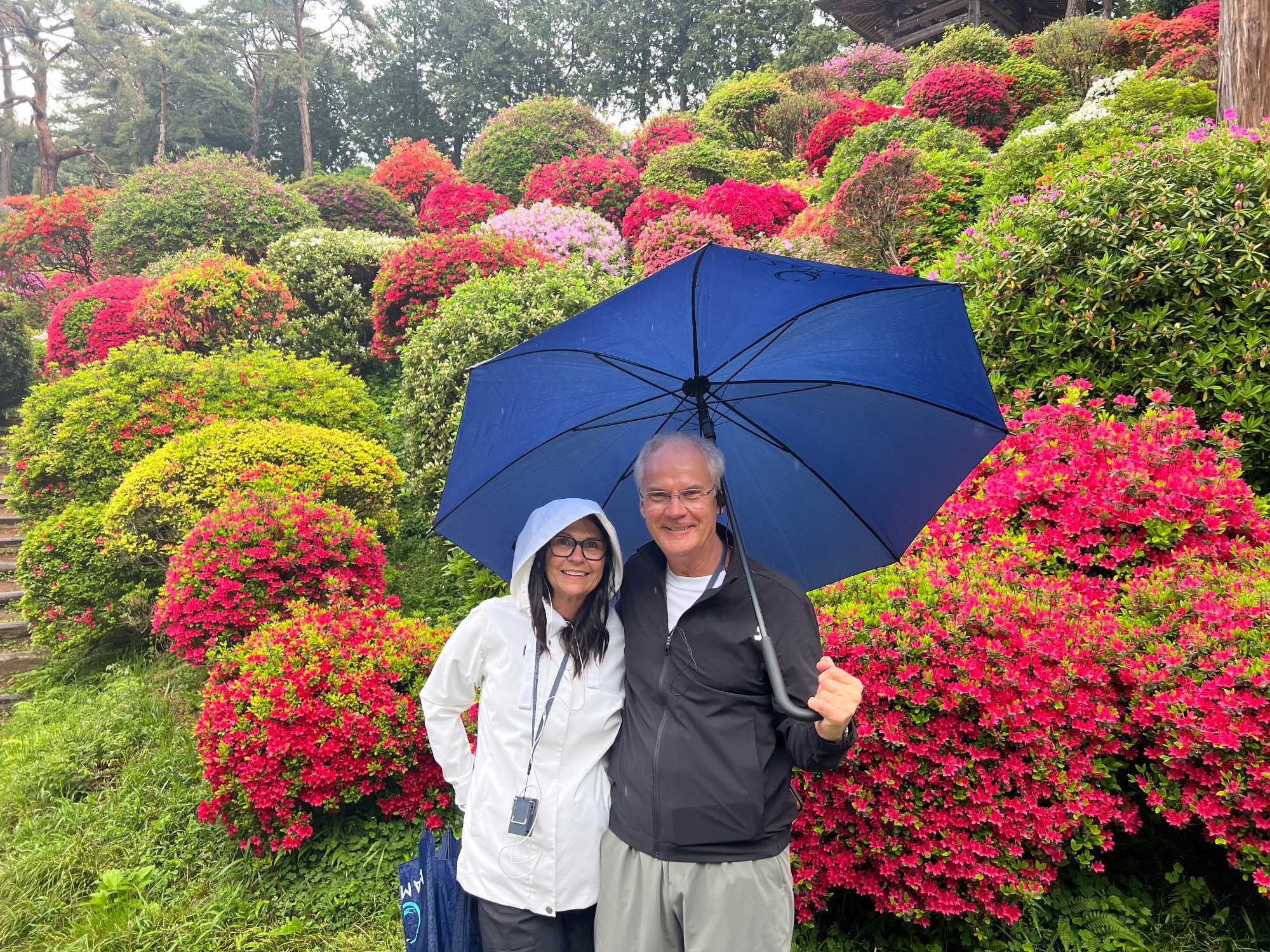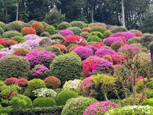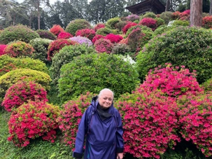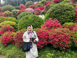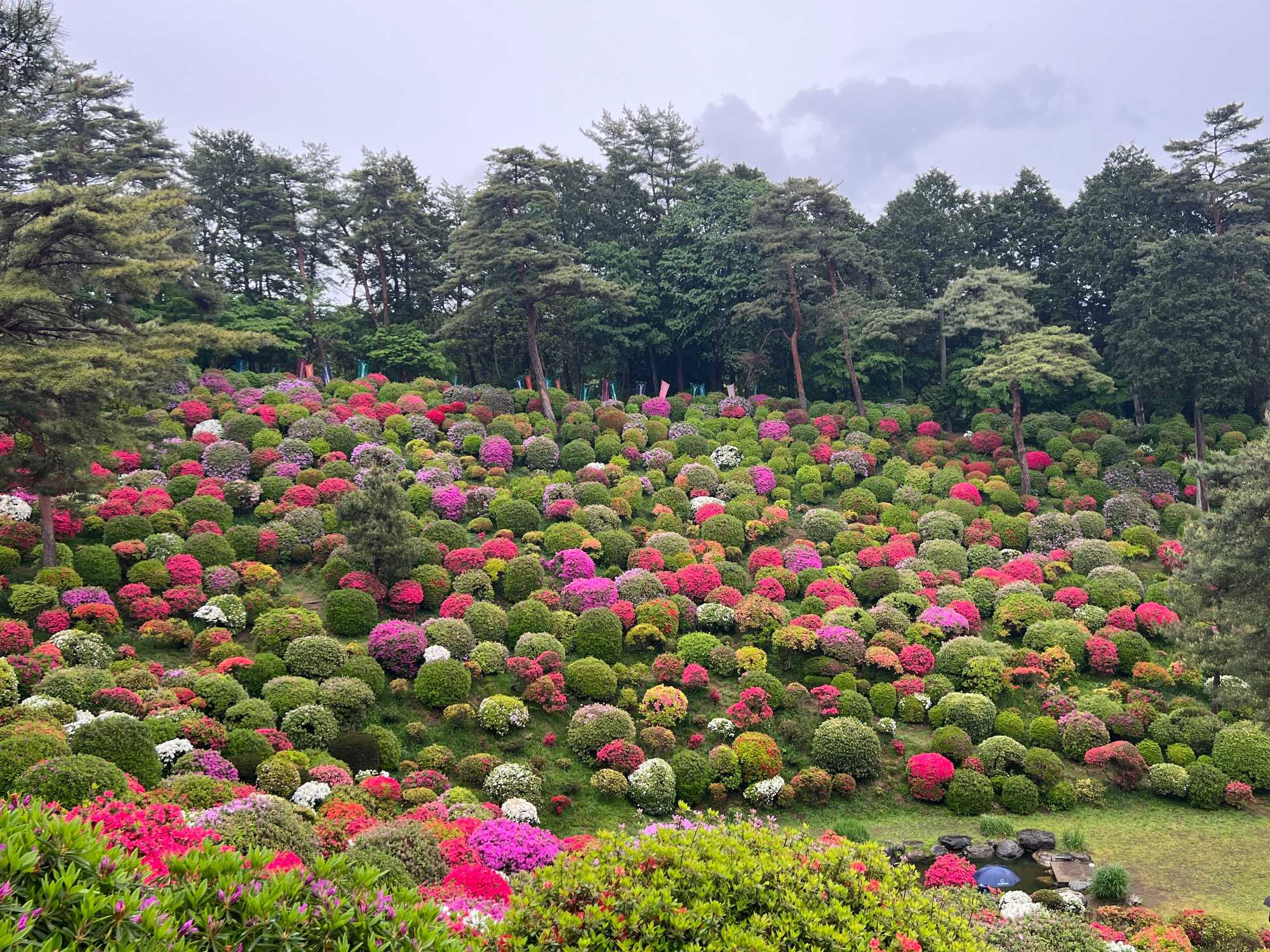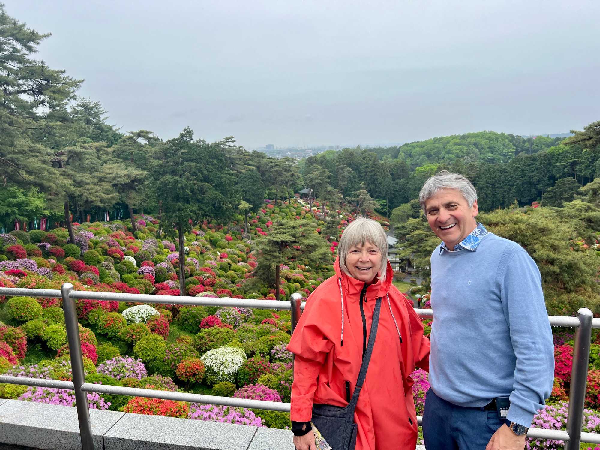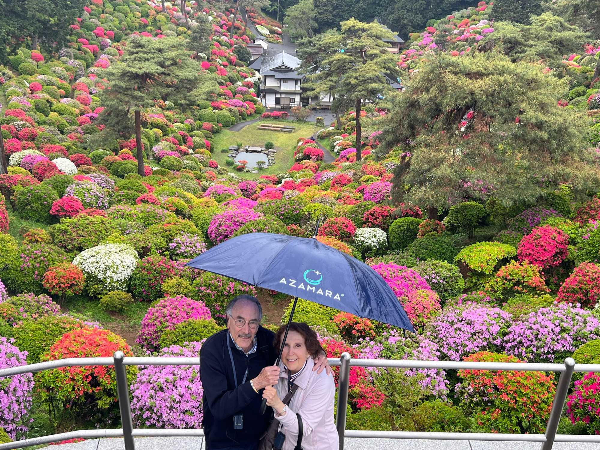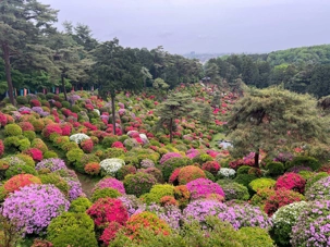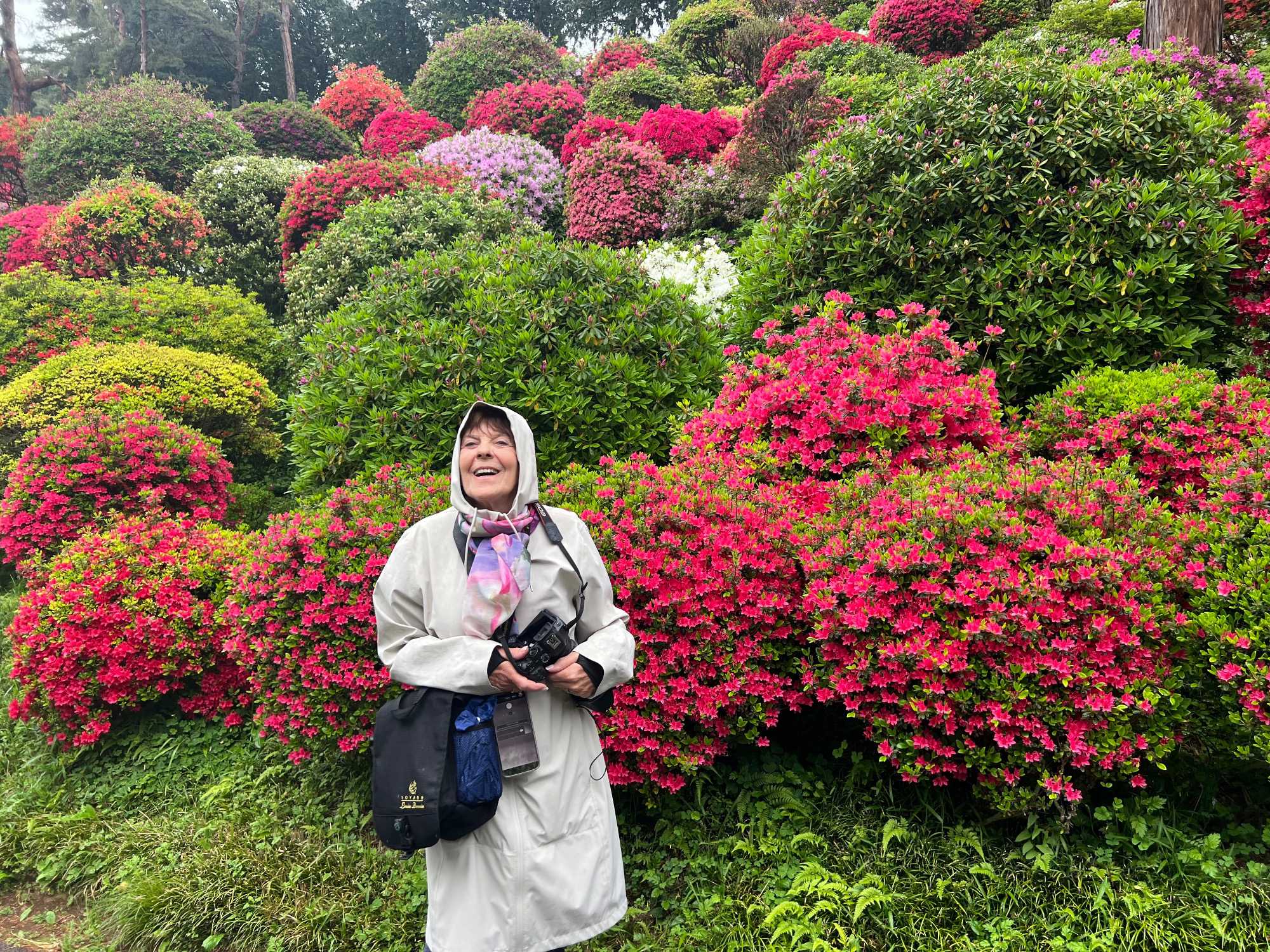 Puis nous prenons la route vers Oume pour la visite du temple bouddhiste Shiofune Kannon-ji. Nous avons une pluie légère qui nous accompagnera tout l’après-midi, mais rien de méchant. Mais bon, nous avons bien profité du soleil jusqu’à maintenant. Nous sommes tous prêts pour la visite de ce jardin qui se trouve à environ 1 heure de route de Tokyo. Nous arrivons à Oume et nous sommes presque les seuls touristes étrangers qui viennent aujourd’hui visiter ce site magnifique. Le site, vieux de 1 300 ans, est réputé pour ses myriades d’azalées et rhododendrons multicolores qui fleurissent en masse de la mi-avril au début mai. Ce n’est donc pas un hasard si nous sommes ici à cette période de l’année. Beau travail de planification de la part de Mme Drouin! Nous en profitons pour prendre plusieurs photos car nous en avons plein la vue avec ces 17 000 azalées. De nombreux sentiers descendants et ascendants traversent les buissons et permettent de s'immerger totalement dans les lieux, ainsi que de faire le plein de parfums et de couleurs pour l'année. Les arbustes sur les flancs de la vallée se parent de magnifiques couleurs vives, du rose au rouge en passant par le violet et le blanc. Les boules d’azalées sont gigantesques et couvre la colline qui, au sommet, nous présente la statue de la déesse Kannon. Elle est immense et elle surplombe tout le cratère rempli de fleurs. Nous n’avons qu’une seule phrase en tête, « comme c’est beau » et on le répète à chaque détour en parcourant la colline. Nous ne nous lassons pas de contempler et d’admirer toutes ces couleurs d’azalées. Nous quittons à regret ce beau jardin pour retourner en ville. Le mot choisi pour représenter ce jardin est : kaléidoscope, étant donné la multitude de couleurs qui nous entourent.