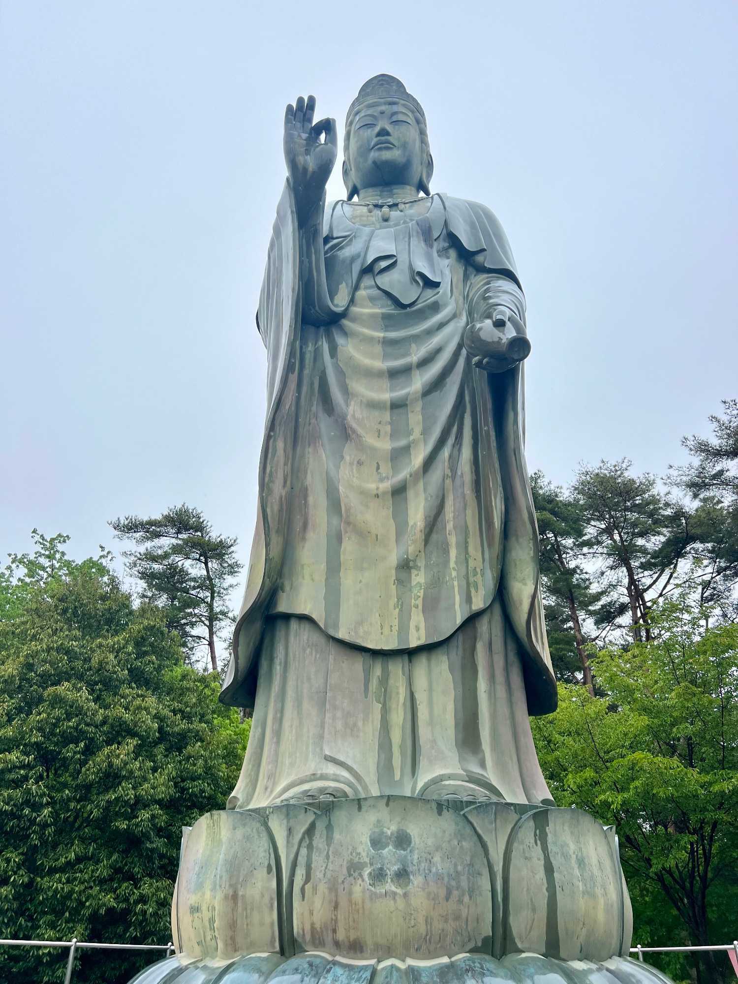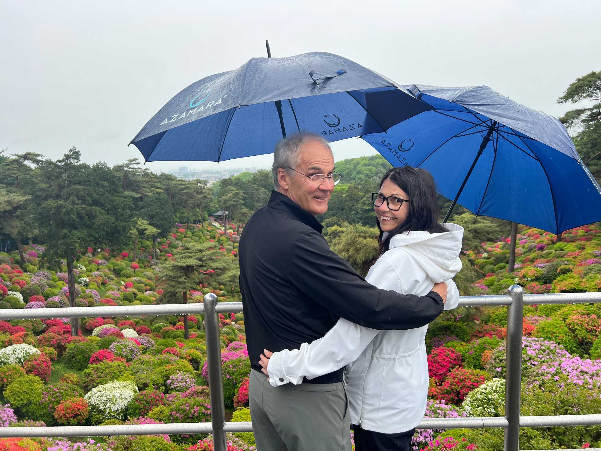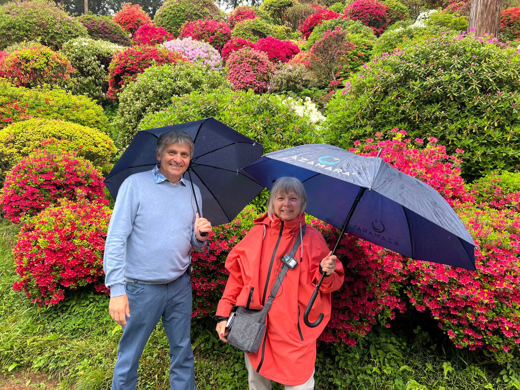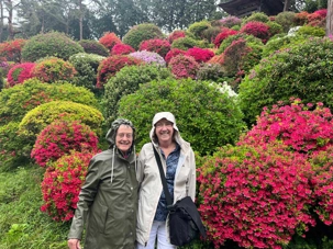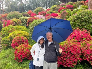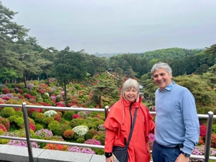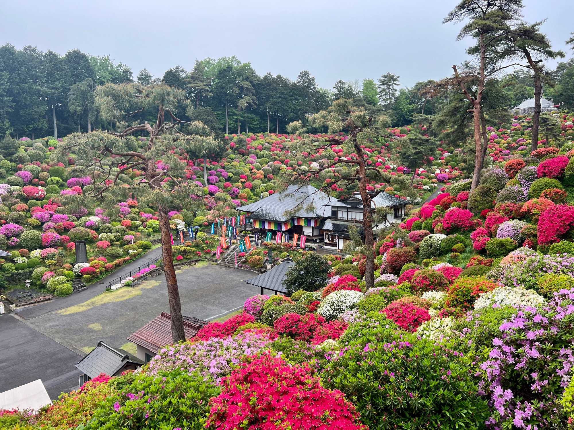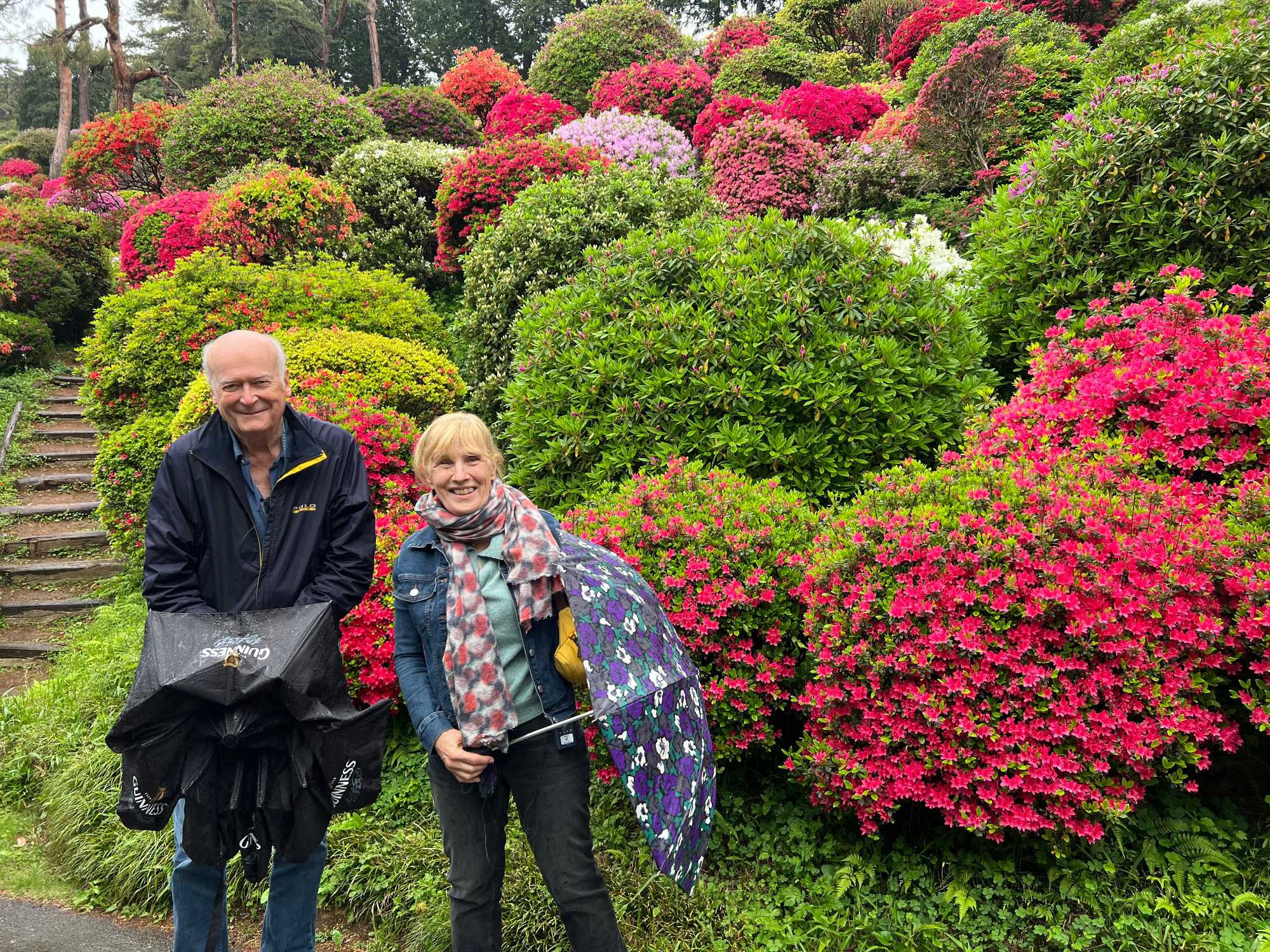 Puis nous prenons la route vers Oume pour la visite du temple bouddhiste Shiofune Kannon-ji. Nous avons une pluie légère qui nous accompagnera tout l’après-midi, mais rien de méchant. Mais bon, nous avons bien profité du soleil jusqu’à maintenant. Nous sommes tous prêts pour la visite de ce jardin qui se trouve à environ 1 heure de route de Tokyo. Nous arrivons à Oume et nous sommes presque les seuls touristes étrangers qui viennent aujourd’hui visiter ce site magnifique. Le site, vieux de 1 300 ans, est réputé pour ses myriades d’azalées et rhododendrons multicolores qui fleurissent en masse de la mi-avril au début mai. Ce n’est donc pas un hasard si nous sommes ici à cette période de l’année. Beau travail de planification de la part de Mme Drouin! Nous en profitons pour prendre plusieurs photos car nous en avons plein la vue avec ces 17 000 azalées. De nombreux sentiers descendants et ascendants traversent les buissons et permettent de s'immerger totalement dans les lieux, ainsi que de faire le plein de parfums et de couleurs pour l'année. Les arbustes sur les flancs de la vallée se parent de magnifiques couleurs vives, du rose au rouge en passant par le violet et le blanc. Les boules d’azalées sont gigantesques et couvre la colline qui, au sommet, nous présente la statue de la déesse Kannon. Elle est immense et elle surplombe tout le cratère rempli de fleurs. Nous n’avons qu’une seule phrase en tête, « comme c’est beau » et on le répète à chaque détour en parcourant la colline. Nous ne nous lassons pas de contempler et d’admirer toutes ces couleurs d’azalées. Nous quittons à regret ce beau jardin pour retourner en ville. Le mot choisi pour représenter ce jardin est : kaléidoscope, étant donné la multitude de couleurs qui nous entourent.