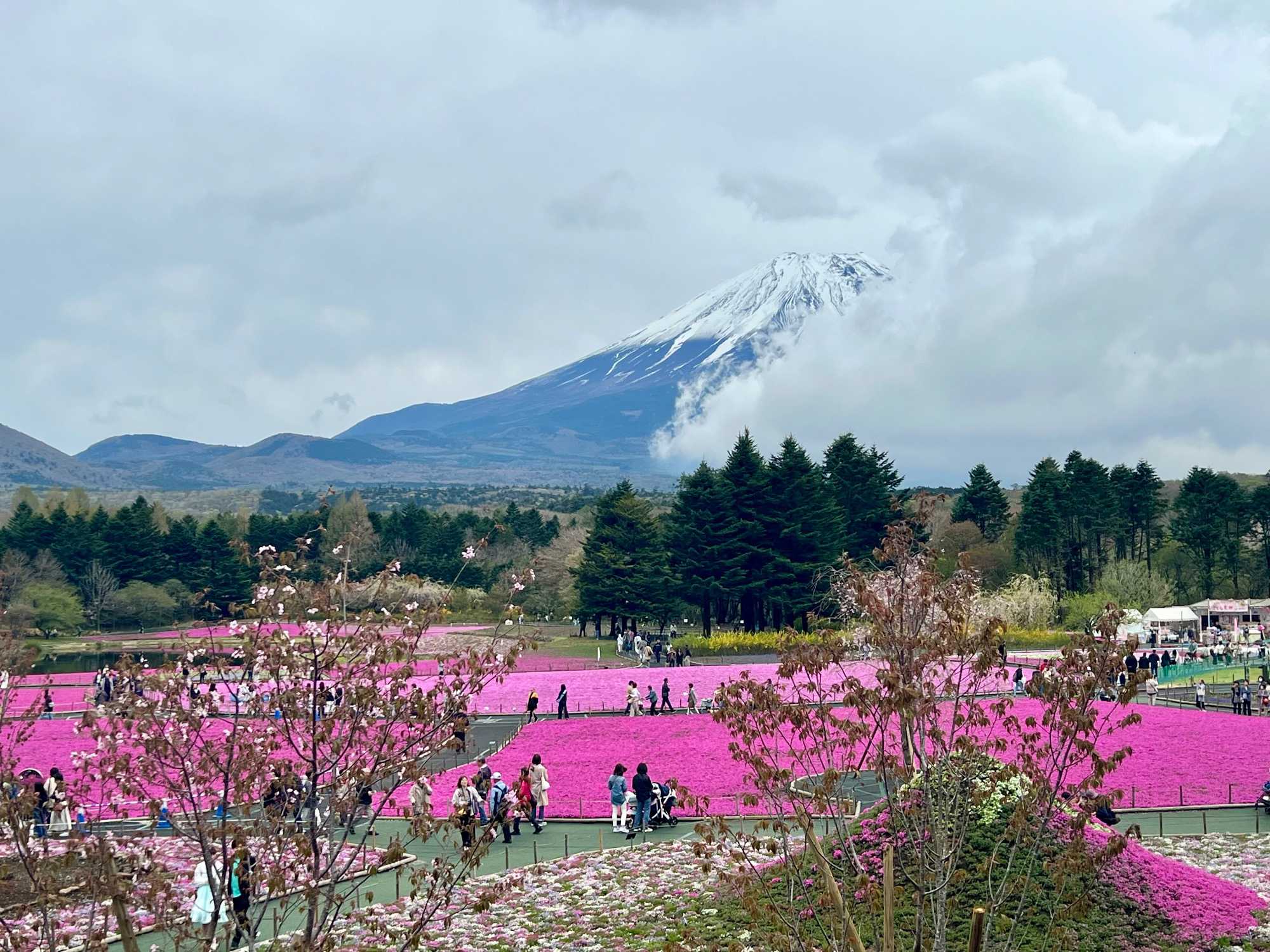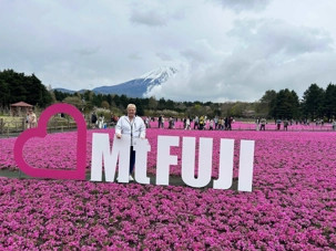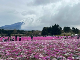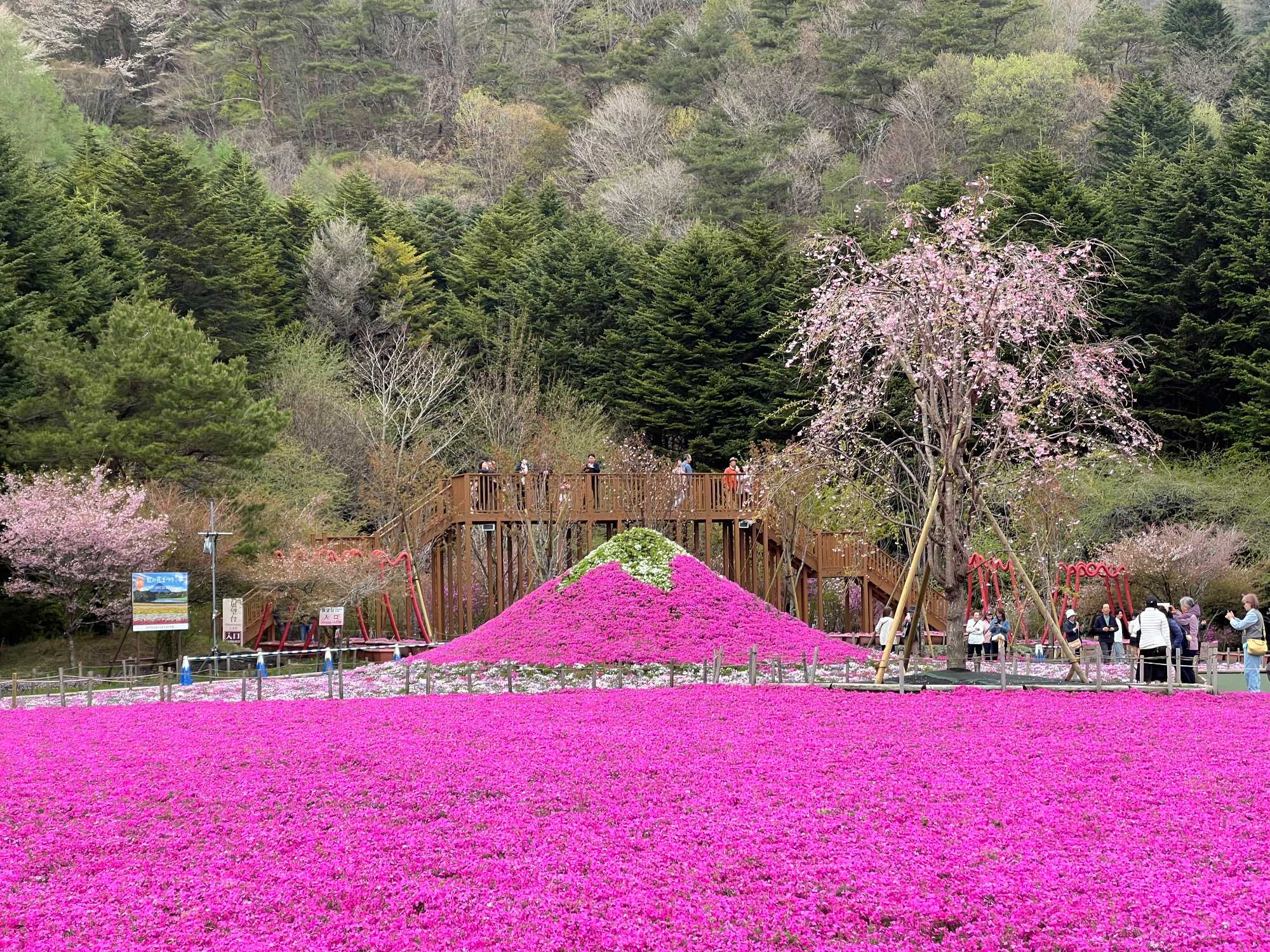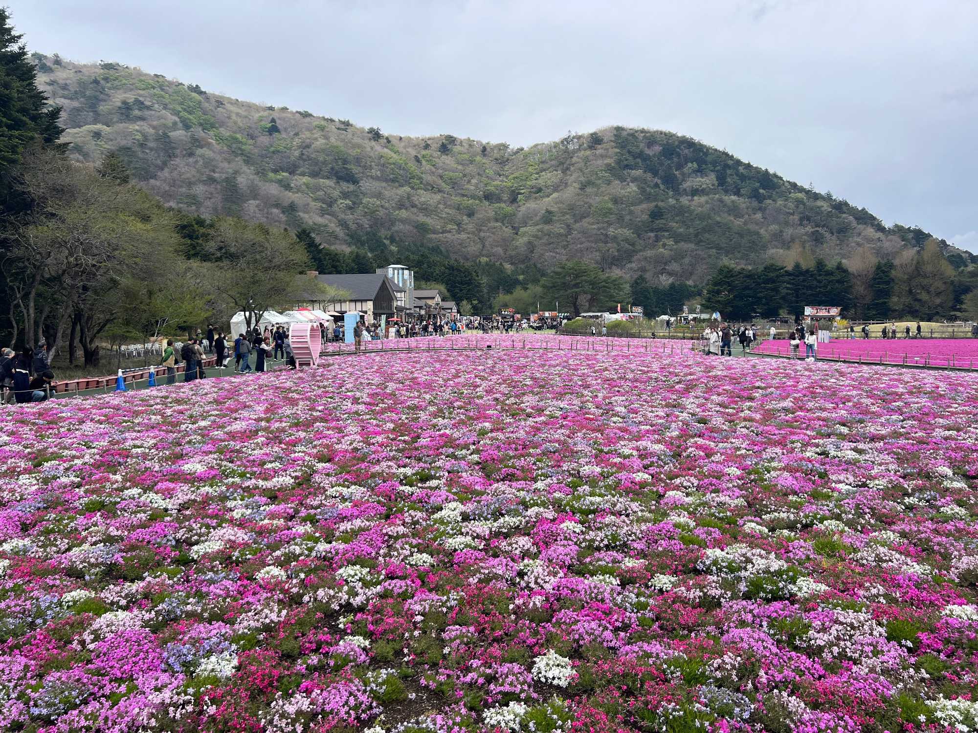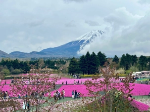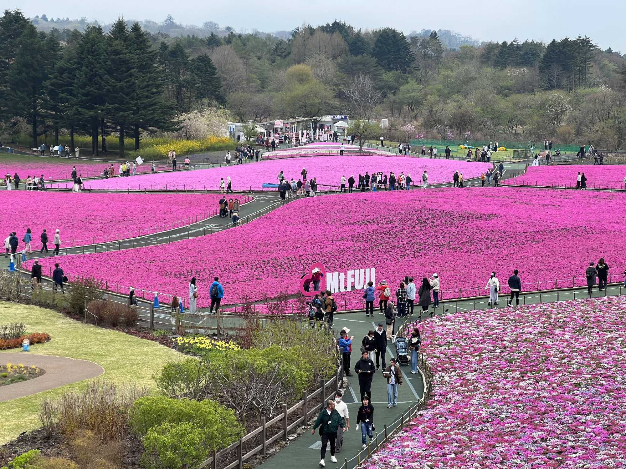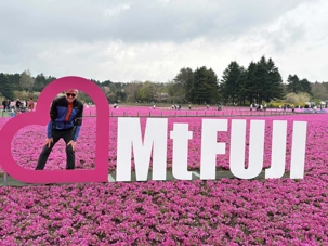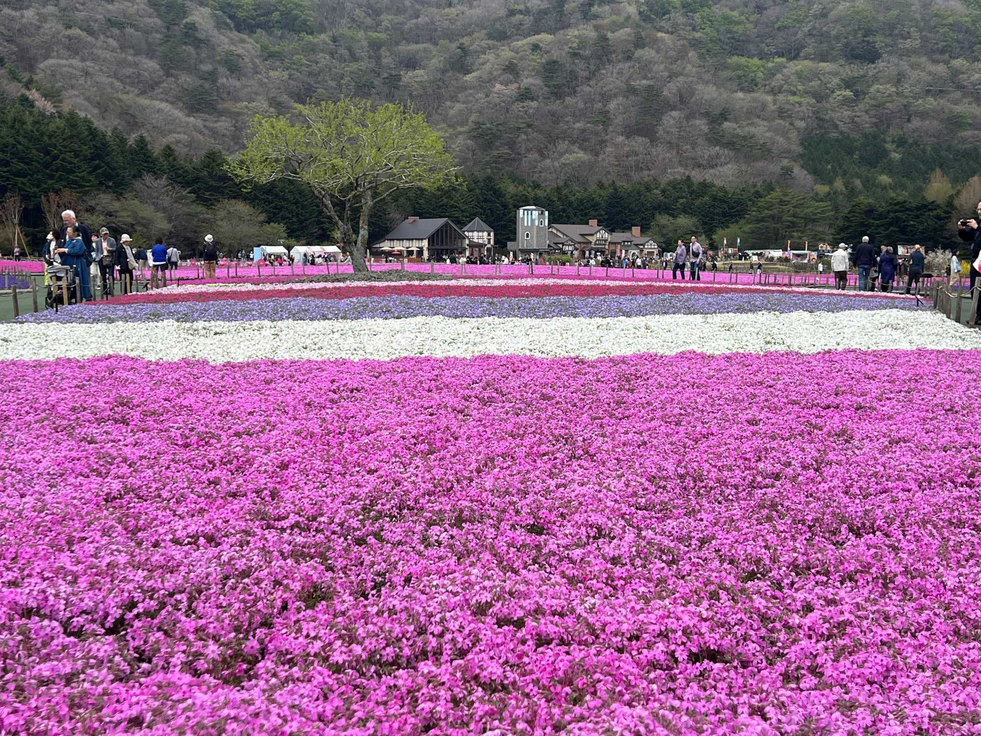 La route pour se rendre au parc où a lieu le "Fuji Shibazakura Festival" est superbe. Nous sommes entourés de montagnes et la végétation est dense. À notre arrivée au parc, on admire plus de 800 000 shiba-sakura (phlox) de plusieurs couleurs. Et le summum de tout ça, c’est que pendant quelques minutes, le mont Fuji se fait voir et nous avons l’occasion de prendre quelques photos avec ce mont en toile de fond. WOW! Quel magnifique spectacle! Nous sommes vraiment chanceux. On se dit alors que l’heure et demie passée à patienter dans le bus à été un bienfait finalement. Pour les fleurs, encore une fois notre programme est bien planifié et nous permet d’être au bon endroit au bon moment. Fuji Shibazakura Matsuri est un festival de fleurs situé à proximité du lac Motosu qui entoure le mont Fuji. Au coeur d’un parc de 2,4 hectares, ces milliers de fleurs s’épanouissent à partir de la mi-avril, sous les yeux émerveillés des promeneurs. Tandis que le lac Kawaguchiko est réputé en automne pour ses vues du mont Fuji avec les fameux érables japonais rougissants, le plus secret lac Motosu habille chaque printemps ses alentours d’un immense parterre de fleurs, allant du rose au violet en passant par le blanc.