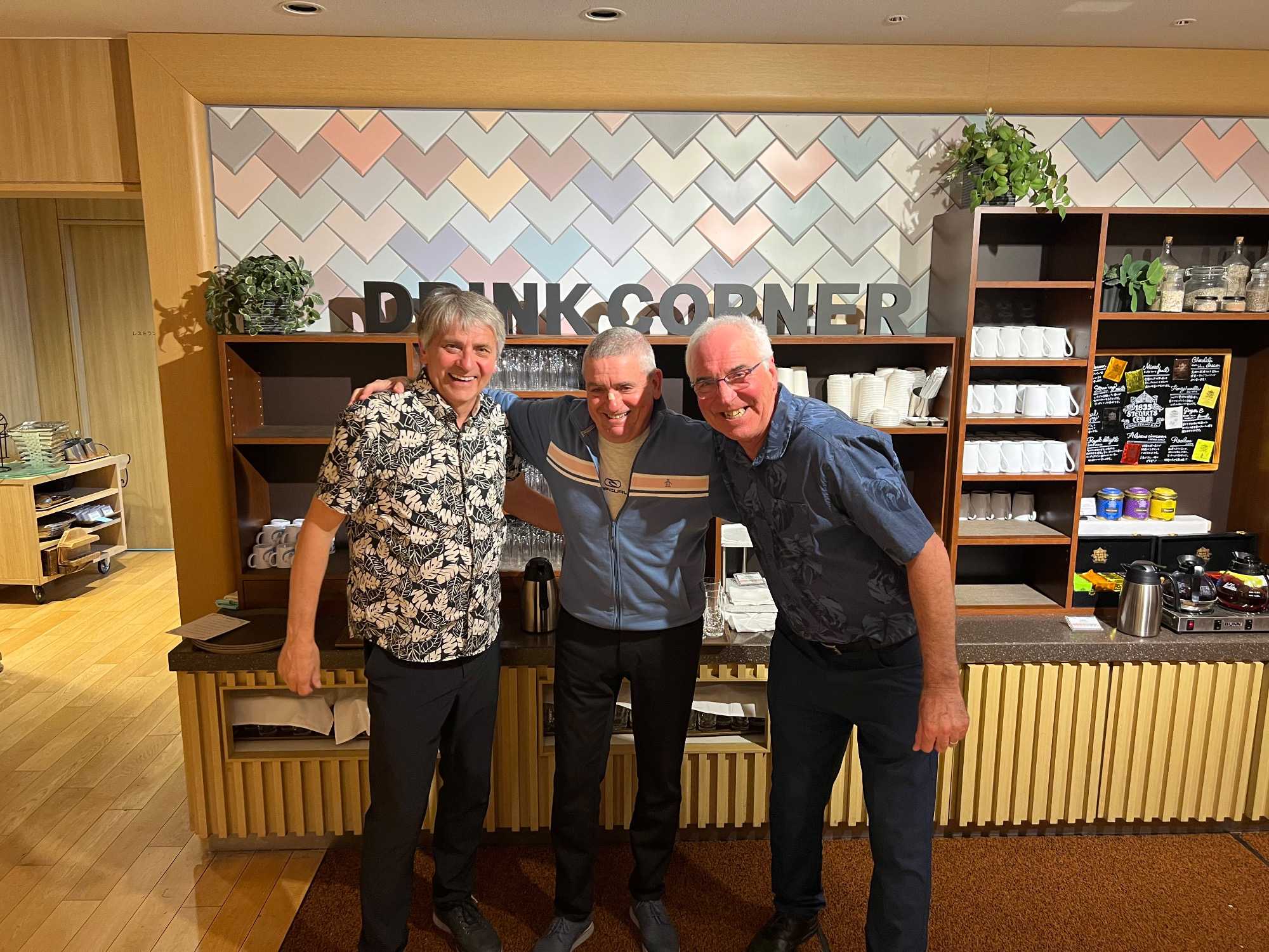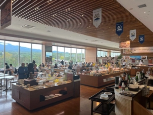 On ajuste notre itinéraire en fonction de ce délai non prévu et nous allons dîner un peu plus tôt, pour avoir l’après-midi au jardin. Nous prenons notre repas sous forme de buffet dans un restaurant d’hôtel. On y trouve du choix pour tous les goûts. D’où nous sommes assis, nous avons nos premières vues sur le Mont Fuji. Hourra! Nous sommes très excités car ce mont, emblème du Japon, n’est pas facilement visible: il joue souvent à cache-cache avec les nuages!