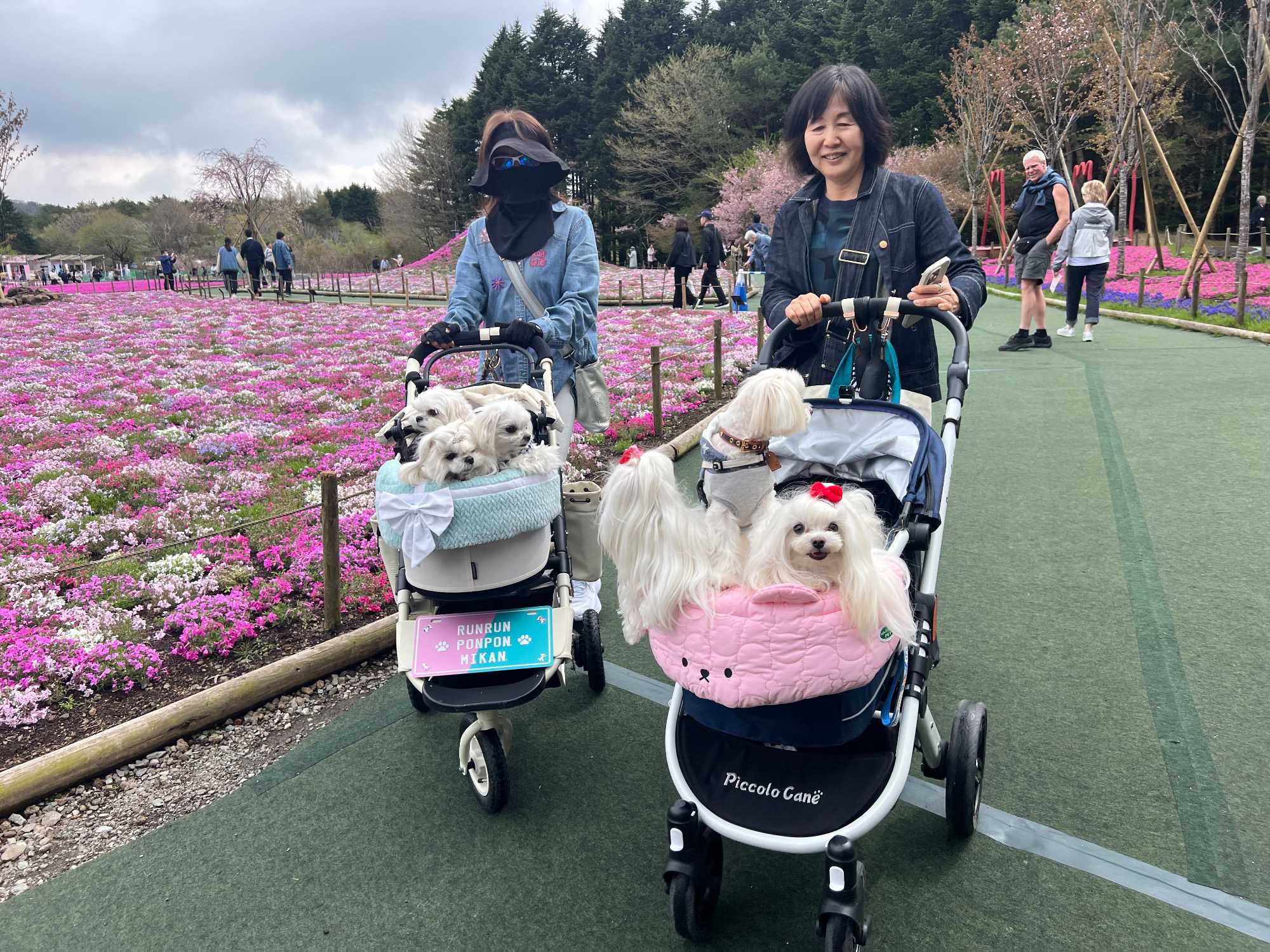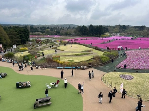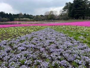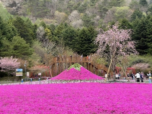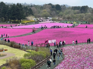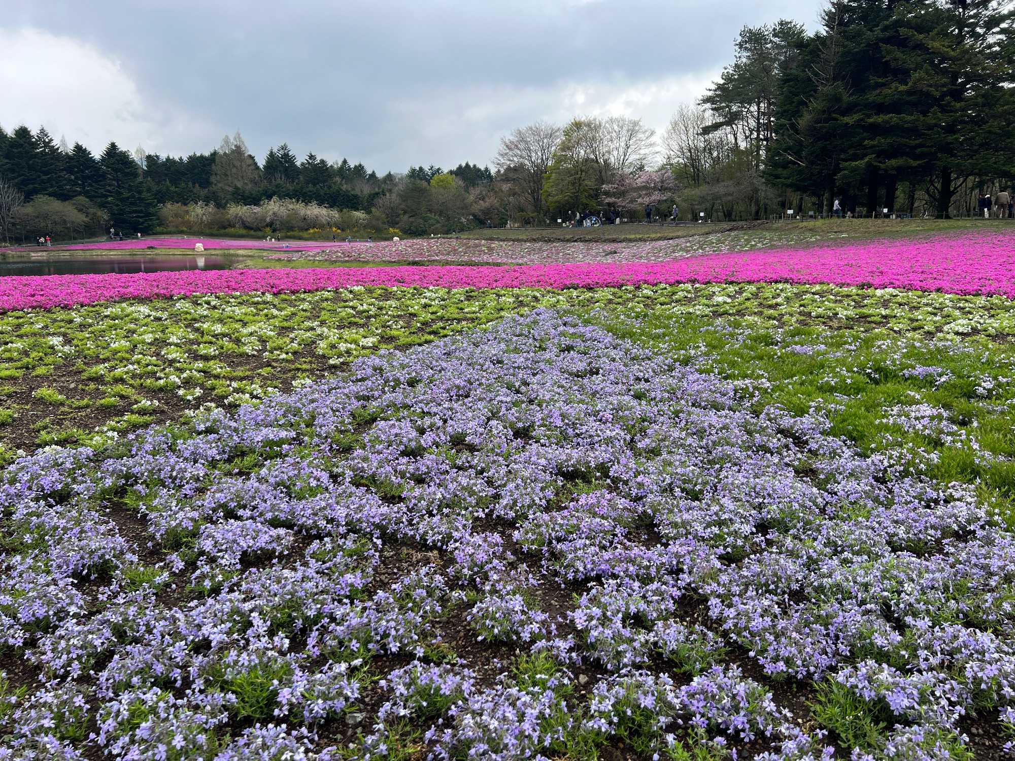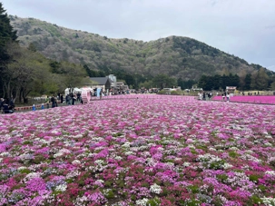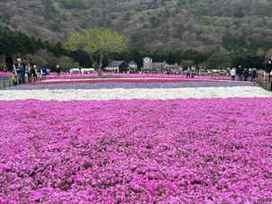 De son nom scientifique phlox subulata, cette plante vivace est aussi appelée "mousse phlox" ou encore "cerisier-pelouse" (traduction littérale de shiba-sakura), pour son caractère rampant et ses couleurs chatoyantes. La floraison des shiba-sakura intervient juste après celle des cerisiers, de la mi-avril à la fin mai, ce qui permet aux visiteurs tardifs d'assister à une sorte de deuxième hanami (activité de regarder les fleurs, on se souvient?). Outre les différences espèces de cerisiers-pelouse, on peut aussi admirer des tulipes, des anémones et des muscaris (jacinthe à grappes de couleur bleu-violet) qui viennent agréablement compléter le tableau. Ainsi, ce festival s’avère avant tout un excellent spot à photographes. Nous nous plaisons encore une fois à immortaliser cette montagne célèbre avec toutes ses fleurs au sol. Le tapis de plusieurs teintes de rose est juste exceptionnel encore une fois et l'on s'y promène avec grand plaisir. On regarde aussi les japonais venus découvrir ces jardins. Quel peuple attachant et adorable!