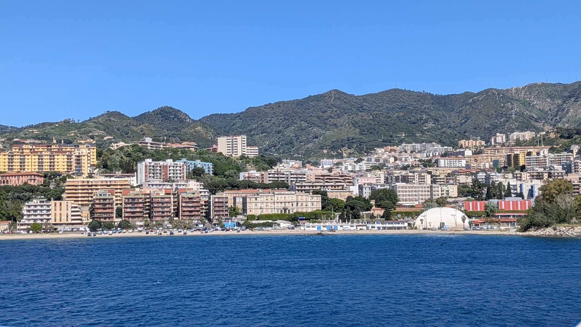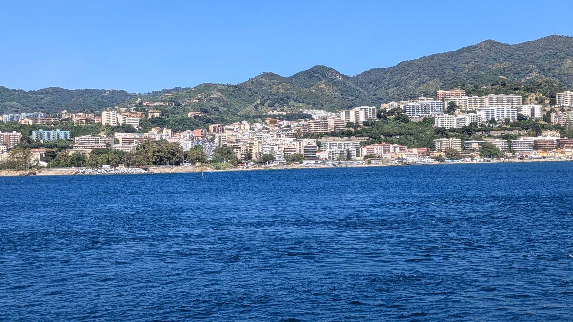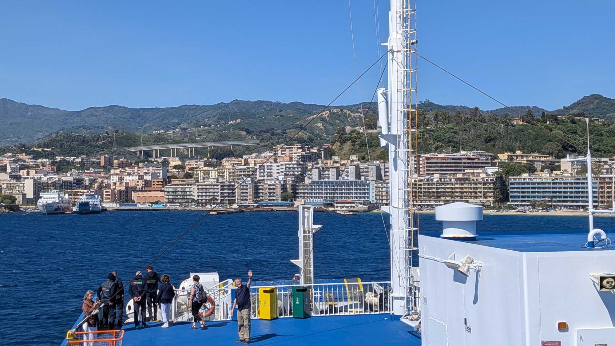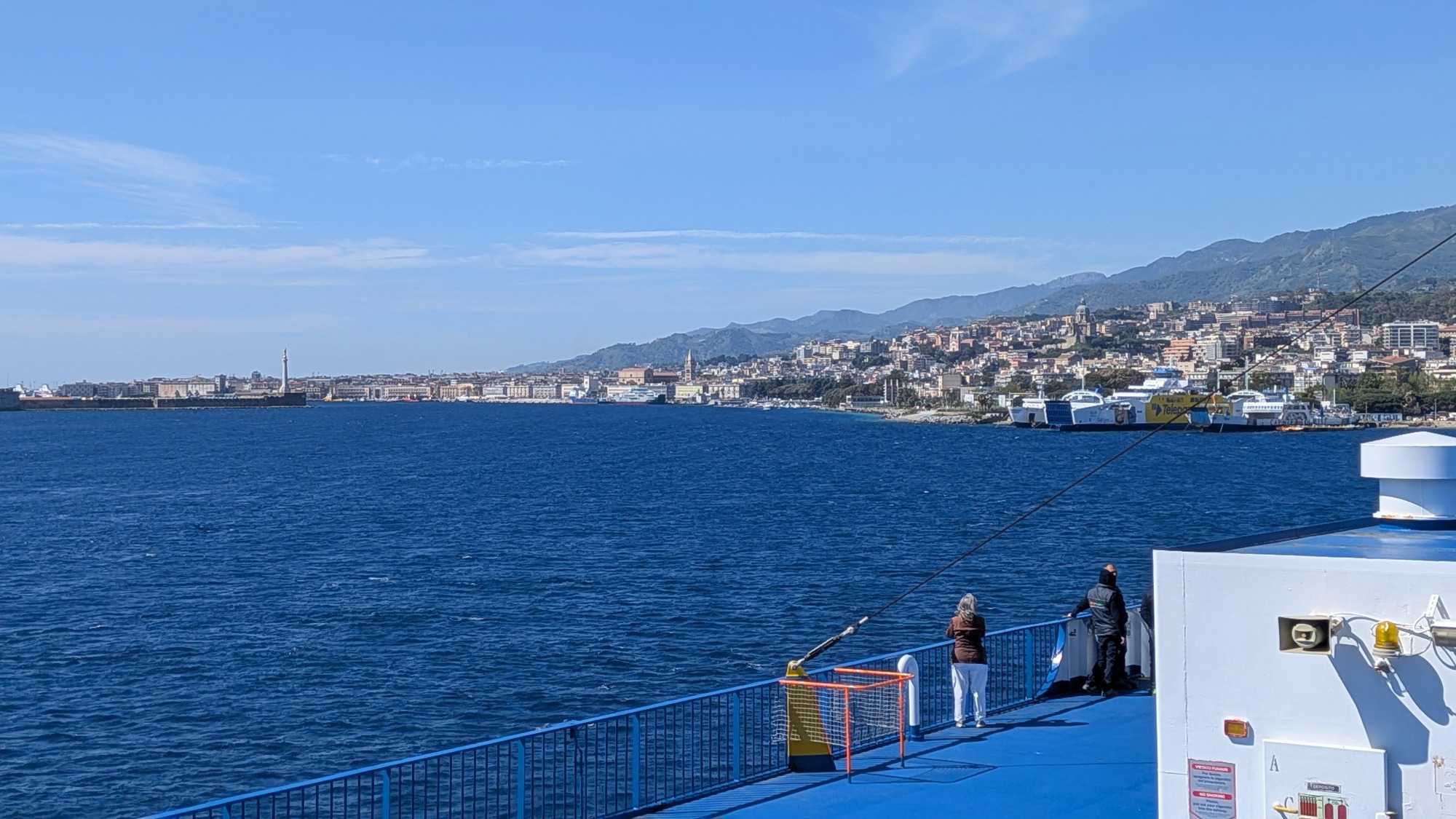 On continue sur la route qui longe la mer Tyrrhénienne est parsemée de plantations d'oliviers et d'orangers. Ainsi on arrive à Villa San Giovanni. On prend un bateau pour traverser le Détroit de Messine vers la Sicile.