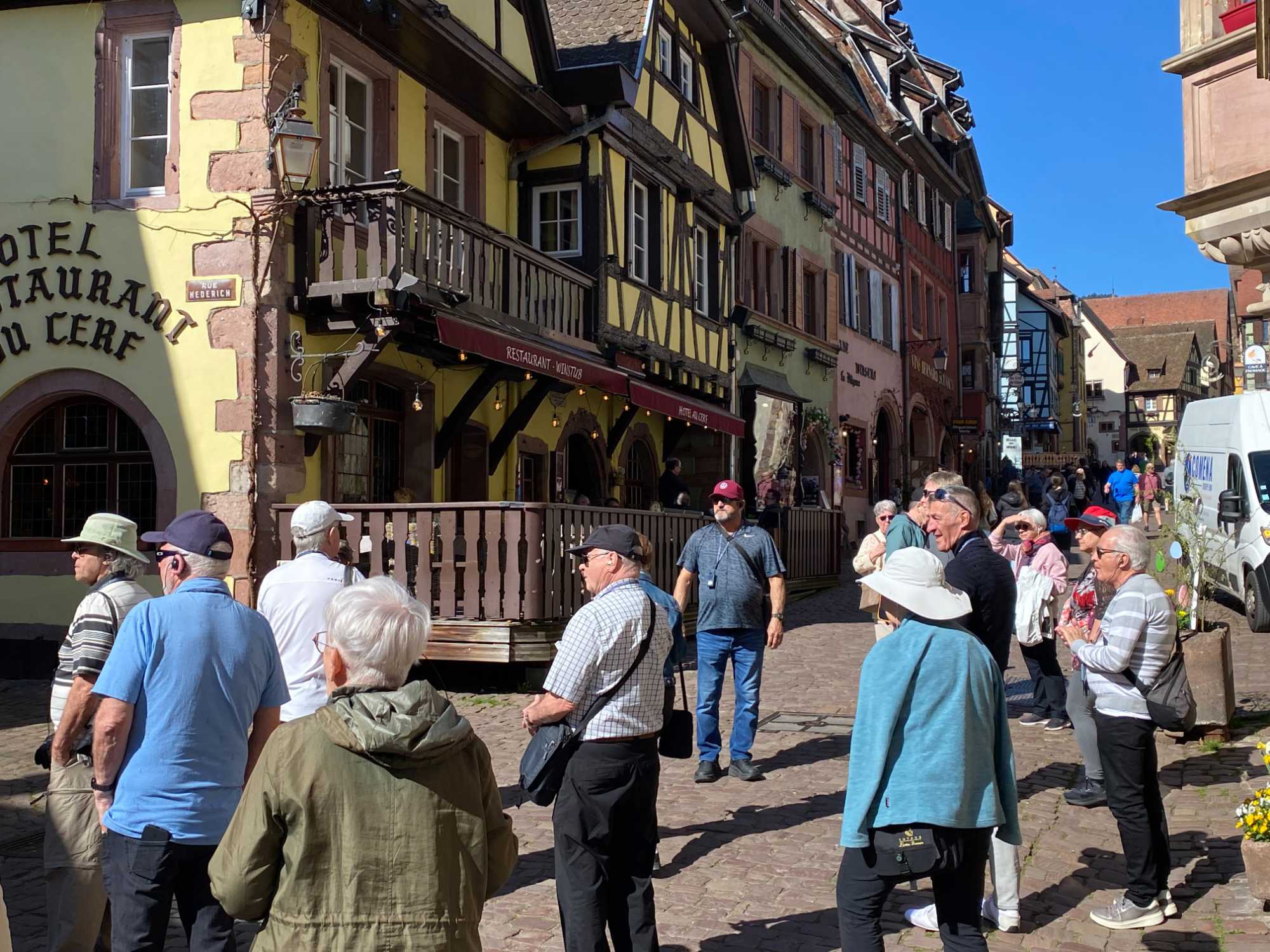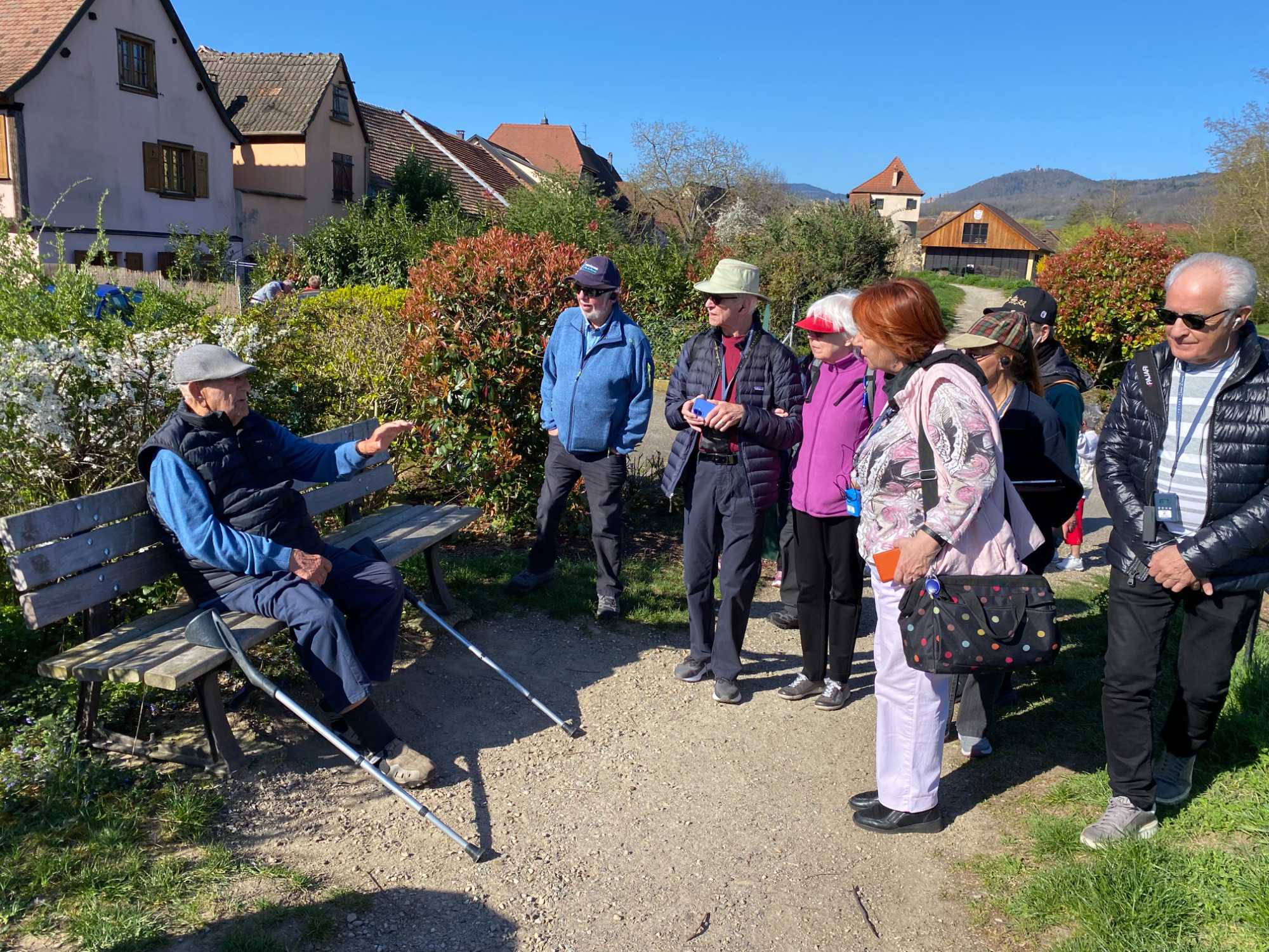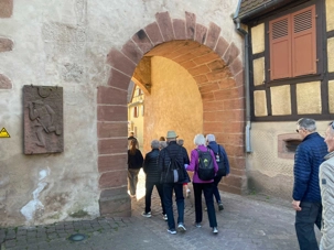 Le groupe étant très ponctuel depuis le début du voyage, Claude nous offre un petit bonus ce matin: une balade dans le charmant village de Bergheim. “Heim” signifie foyer, et “Berg” montagnes — un nom bien choisi pour ce coin paisible niché au cœur du vignoble alsacien. Classé parmi les plus beaux villages de France, Bergheim nous accueille avec ses remparts bien conservés et ses ruelles fleuries. On prend le temps de marcher tranquillement à travers le village encore calme, puis de longer les remparts entourés de vignes. Un beau moment pour s’imprégner de l’ambiance du lieu, respirer l’air frais et admirer les paysages.