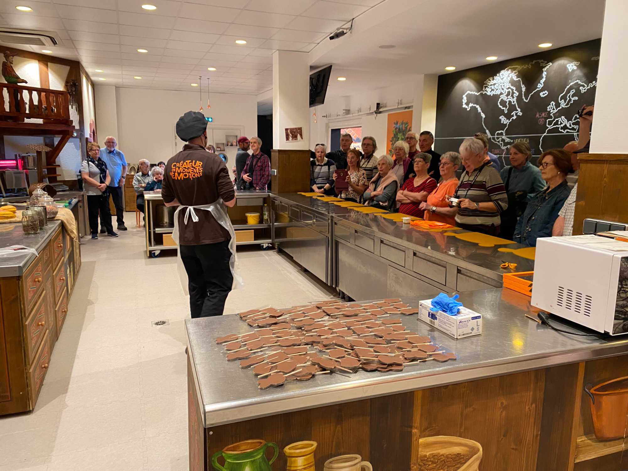 Après dîner, Claude nous propose une petite surprise gourmande: un arrêt à la chocolaterie Daniel Stoffel. On a la chance d’avoir une présentation très interactive d’un chef chocolatier. Celui-ci nous explique tout le processus de fabrication du chocolat, depuis l’origine des fèves — principalement cultivées dans les pays situés sous les tropiques du Cancer — jusqu’à la création des délicieuses pièces que l’on retrouve en boutique. On a même la chance de goûter à différents types de chocolat… un vrai régal! Impossible de repartir les mains vides: chacun quitte avec quelques douceurs à savourer (ou à offrir!).