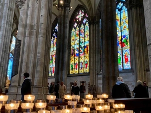 Vers 16h, le groupe débute une excursion à pied le long de la promenade riveraine du Rhin. Nous rencontrons nos deux guides locales francophones: Angela et Elvira. Pour faciliter les déplacements dans le centre historique, le groupe est divisé en deux sous-groupes, chacun accompagné par une guide et un accompagnateur. Nous découvrons rapidement l’ampleur de l’histoire de Cologne. Plus de 80% de la ville a été détruite pendant les bombardements de la Seconde Guerre mondiale. Les historiens estiment que plus de 1,5 million de bombes ont été larguées sur la ville. Encore aujourd’hui, il arrive qu’on retrouve des bombes non explosées, ce qui oblige parfois l’évacuation de certains quartiers pour les désamorcer. La visite permet aussi de remonter bien plus loin dans le temps. On observe plusieurs vestiges de l’époque romaine, dont un système de canalisations profondes de plus de 9 mètres, qui servaient de refuge pendant les bombardements. On apprend que le niveau du sol actuel se trouve à environ six mètres au-dessus du sol de l’époque romaine. Lors de travaux majeurs, les archéologues découvrent encore des murs, des maisons et des fermes antiques.