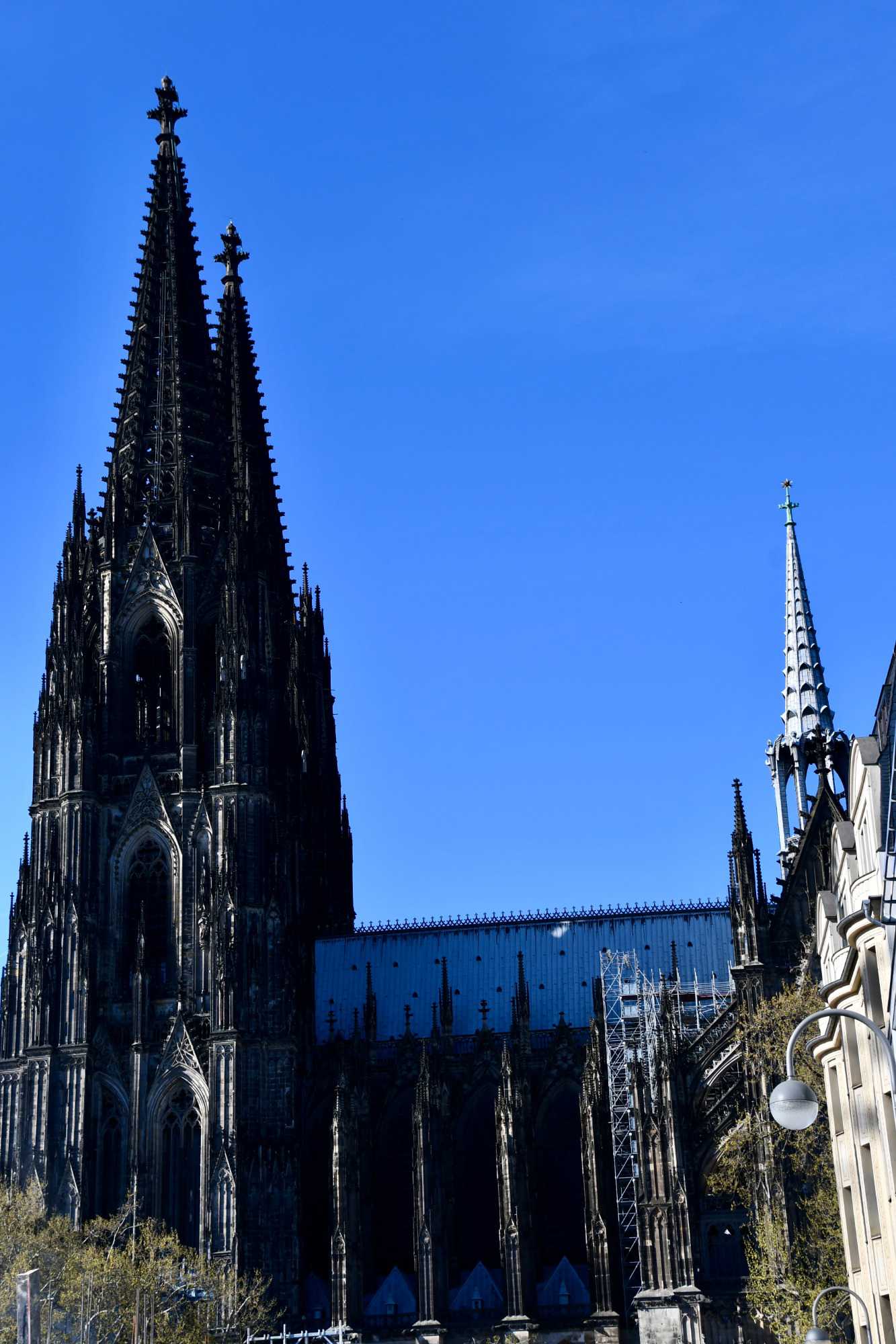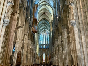 Un temps fort de la visite est sans aucun doute la découverte de la cathédrale de Cologne. Ce chef-d’œuvre de style gothique, dédié à Saint Pierre, est l’un des monuments les plus visités d’Allemagne. Sa construction débute en 1248, mais les travaux sont interrompus au XVIe siècle, notamment par manque de financement. Les travaux reprennent officiellement en 1842, relancés par le roi de Prusse Frédéric-Guillaume IV, après avoir retrouvé les plans d’origine. La cathédrale est finalement achevée en 1880, soit 632 ans après le début de sa construction. Avec ses 157 mètres de hauteur, elle fut pendant quelques années le bâtiment le plus haut du monde (de 1880 à 1884)! Elle a été construite avec 50 types de pierres, dont de la pierre volcanique extraite de la région. Malgré les 14 bombes qui l’ont frappée pendant la guerre, elle a miraculeusement survécu, conservant son apparence d’origine, même si plusieurs vitraux et toitures ont dû être restaurés. Un véritable symbole de résilience pour la ville!