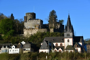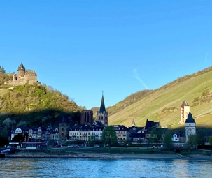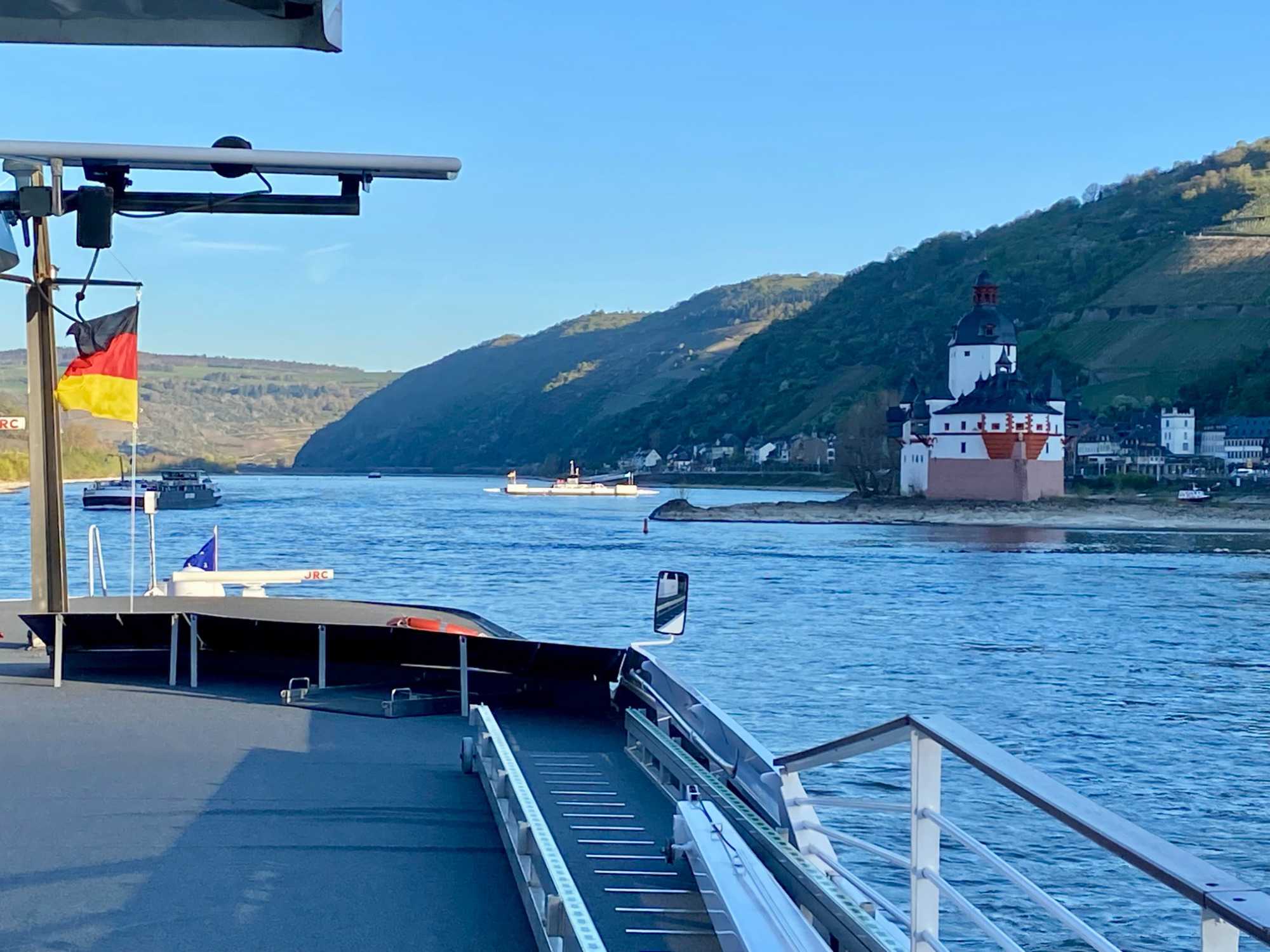 À 7h, le bateau largue les amarres et nous amorçons notre départ vers le Rhin romantique, la plus belle partie de la croisière. Certains l’observent depuis leur cabine, d’autres depuis le salon, et quelques-uns depuis le pont supérieur, car malgré le resplendissant soleil, un petit vent du nord domine et impose une certaine fraîcheur pour admirer les paysages de cette portion majestueuse du fleuve. Tout au long de la navigation, une narration est transmise par les hauts-parleurs et nous donne des explications sur chacun des châteaux et forteresses accrochés aux coteaux que nous pouvons admirer de chaque côté du Rhin. On peut se balader allègrement, à notre guise, ou s’asseoir confortablement sur une chaise et prendre de magnifiques photos tout en parcourant l’histoire… sous ce splendide soleil et ce ciel bleu. On est vraiment chanceux! Nous pénétrons lentement dans les gorges du Rhin, bordées de chaque côté de collines garnies de vignes. Cette vallée fluviale romantique s’étend de Rüdesheim à Coblence. Prenez le temps de regarder les photos, c’est tout un voyage à travers le temps! Absolument magnifique, au grand plaisir de tous. On entend beaucoup de superlatifs de la part des voyageurs! Plusieurs heures de plaisir pour nos yeux, à sillonner les méandres de ce fleuve et à se laisser surprendre par toutes ces variétés architecturales… sans oublier la fameuse roche de Loreley, qui culmine à 113 m, et sa statue emblématique.