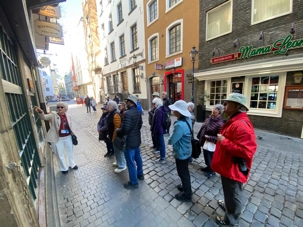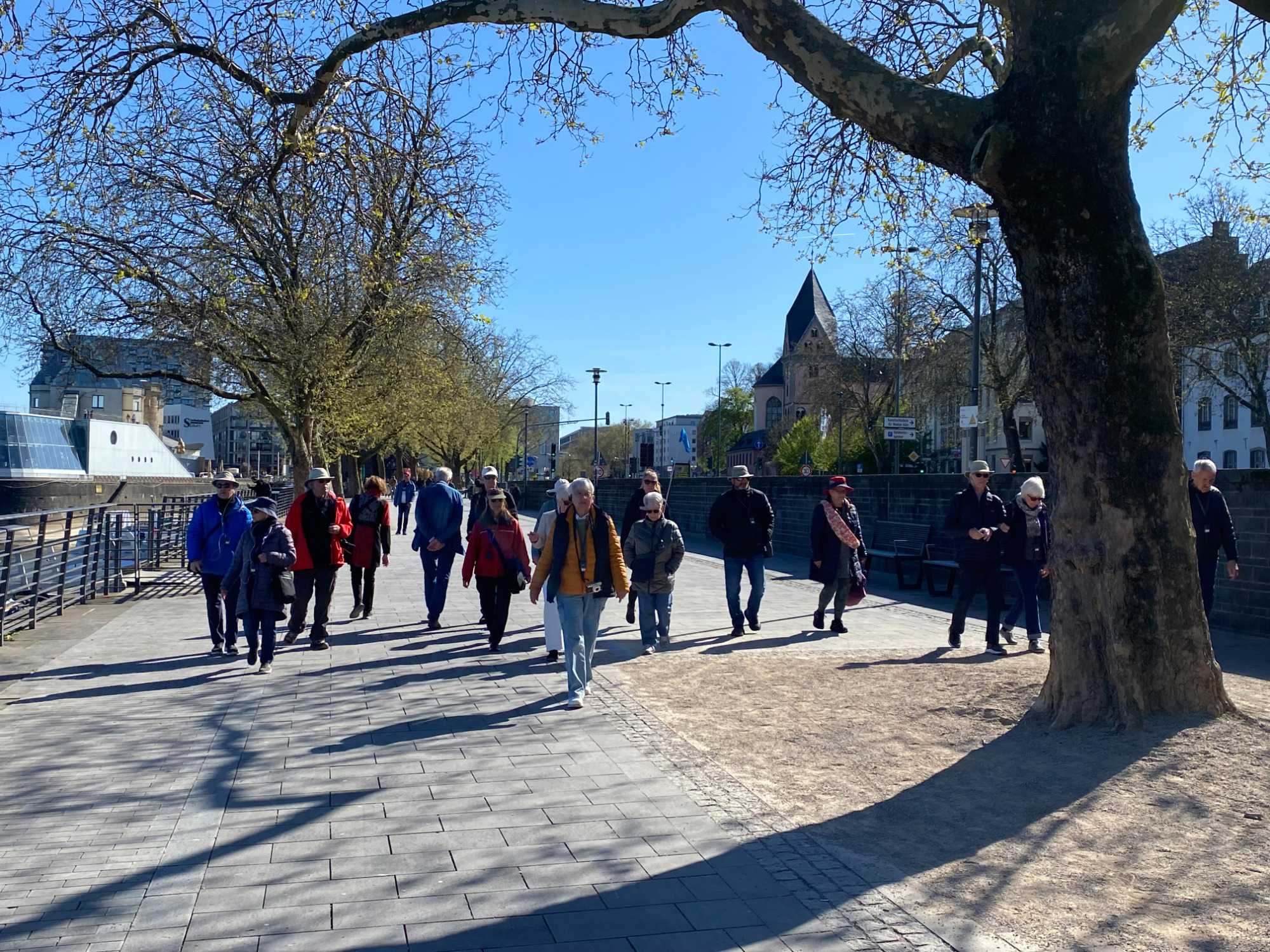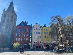 Le groupe explore ensuite la vieille ville, avec ses ruelles étroites bordées de terrasses animées, profitant des premières journées printanières. Plusieurs places historiques portent encore les noms de leurs anciens marchés: le marché du poisson, le marché du beurre ou encore la ruelle du sel. La visite est ponctuée de faits intéressants sur l’identité de la ville. Cologne abrite environ 50 000 étudiants universitaires, et possède des écoles réputées, notamment dans les domaines de la musique et du sport. L’armoirie de la ville représente les trois rois mages, onze larmes, ainsi que Sainte Ursule, considérée comme la patronne de Cologne. C’est également ici, en 1709, que fut fondée la Maison Farina, reconnue comme la première parfumerie d’Europe. Le groupe fait un petit arrêt pour aller sentir cette célèbre “eau de Cologne”!