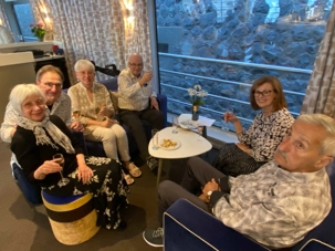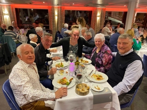 De retour au bateau, tout le monde se prépare pour la soirée gala. Vers 19h30, le groupe se retrouve au salon pour l’apéro en compagnie de tous les passagers et des membres de l’équipage. L’ambiance est festive! Le souper qui suit est un véritable festin gastronomique en cinq services: un velouté de chou-fleur en entrée, suivi d’un foie gras de canard, puis d’une assiette composée de caille et légumes. Pour clôturer le tout, un fromage et nul autre que la célèbre bombe Alaska, le dessert emblématique des croisières, présentée avec une petite parade des serveurs et des chefs sous les applaudissements. Nos papilles se régalent une fois de plus!