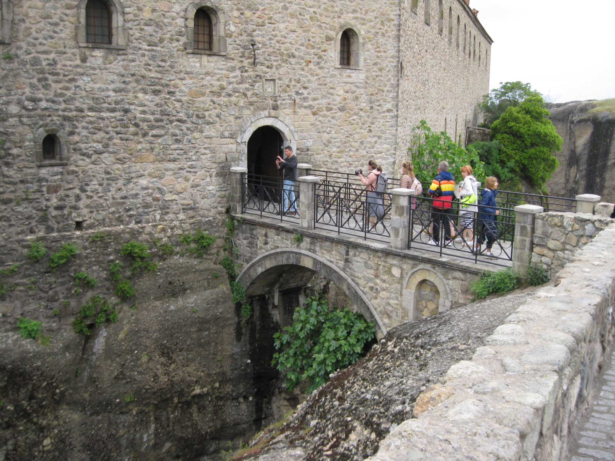 Nous avons visite le monastère Saint-Stephanos,accessible par un escalier de 140 marches,le rocher sur lequel il se dresse est séparé de la montagne par un profond ravin qu‘ enjambe une passerelle. naturellement , nous avons utilisé la passerelle Le monastère aurait été fondé en 1191. On y retrouve 2 églises .L’église principale renferme un reliquaire contenant la tête de St-Charalambos, qui est censé apporter la guérison surtout des maladies infectieuses alors que la petite église est décorée de très belles fresques ,de bois doré et de vieilles icônes. Le monastère fut en partie détruit lors de la deuxième guerre mondiale , depuis 1961, il est occupé par des moniales qui opèrent un atelier d’icônes.