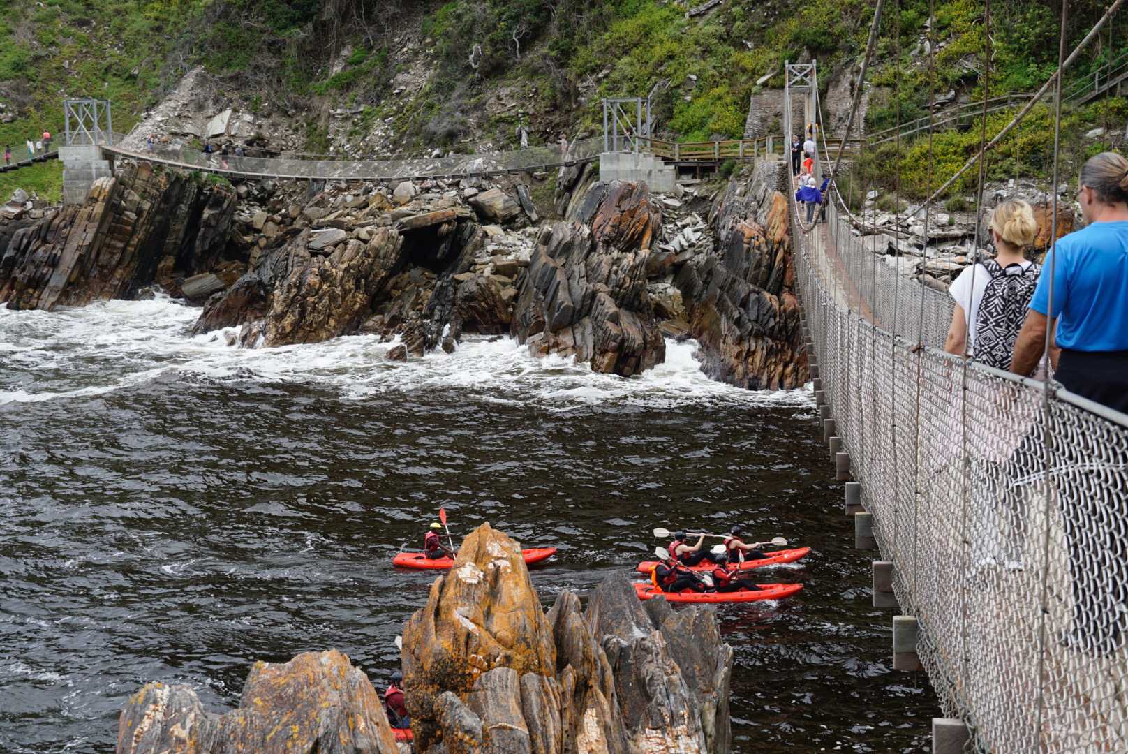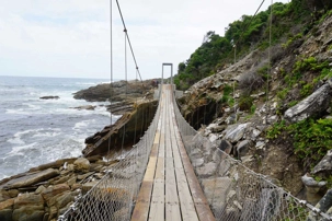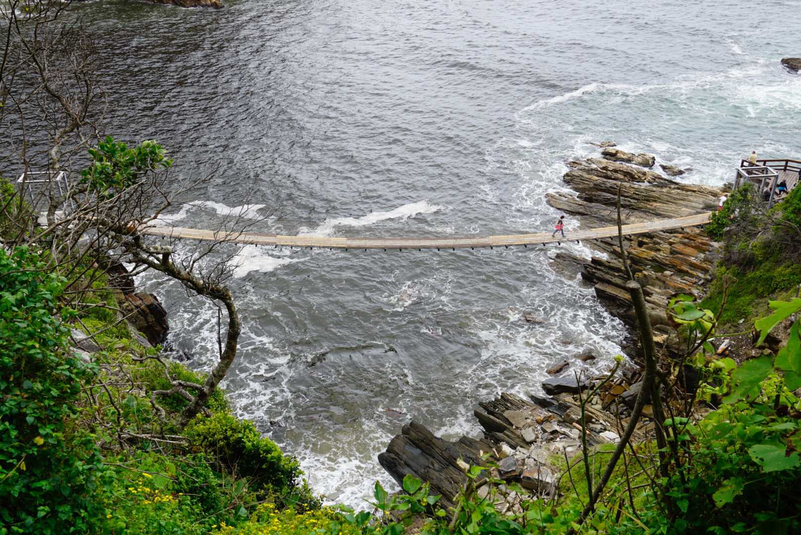 Le pont est à une hauteur de 216 mètres. Tout un saut et nous en avons vu deux sauter. Juste se rendre à l’endroit de départ du saut était déjà à mon avis assez périlleux pour moi je dois vous dire. Cela se faisait avec une tyrolienne sous le pont qui était si haut. Bien évident que personne de mon groupe ne voulait sauter… Nous continuons notre route et nous arrivons rapidement au parc national. Nous avons eu plus de 1h45 pour faire la jolie marche vers les ponts suspendus. Cela fait du bien le matin de marcher sur le bord de la mer et il faisait finalement 21 degrés. Nous étions très bien sur les très beaux sentiers aménagés sans trop de vent.